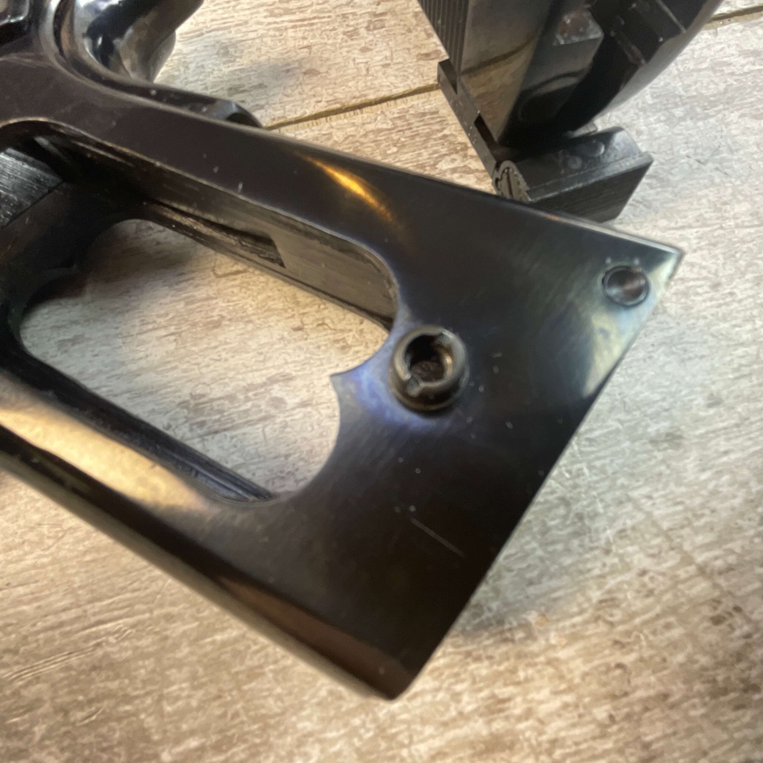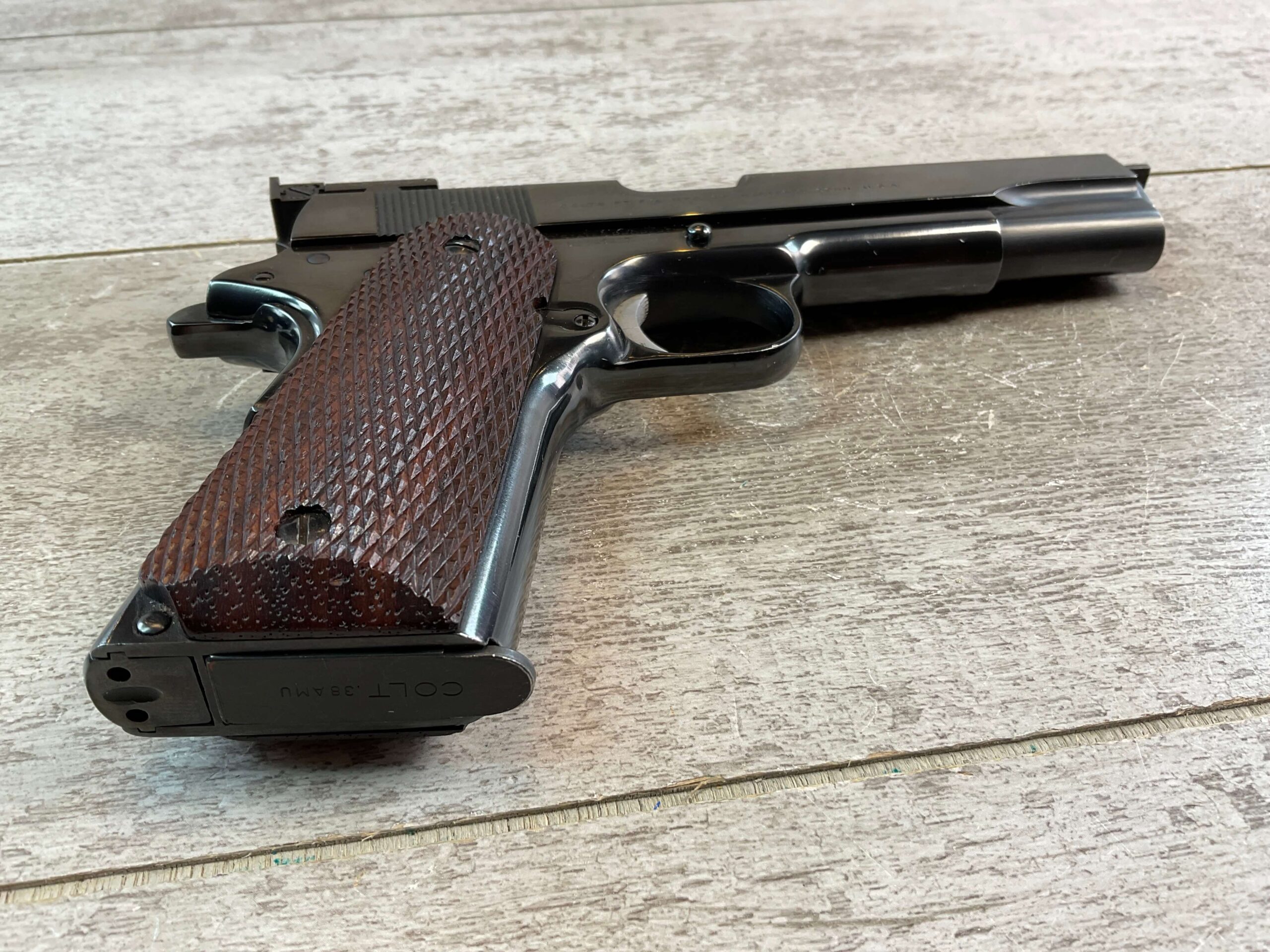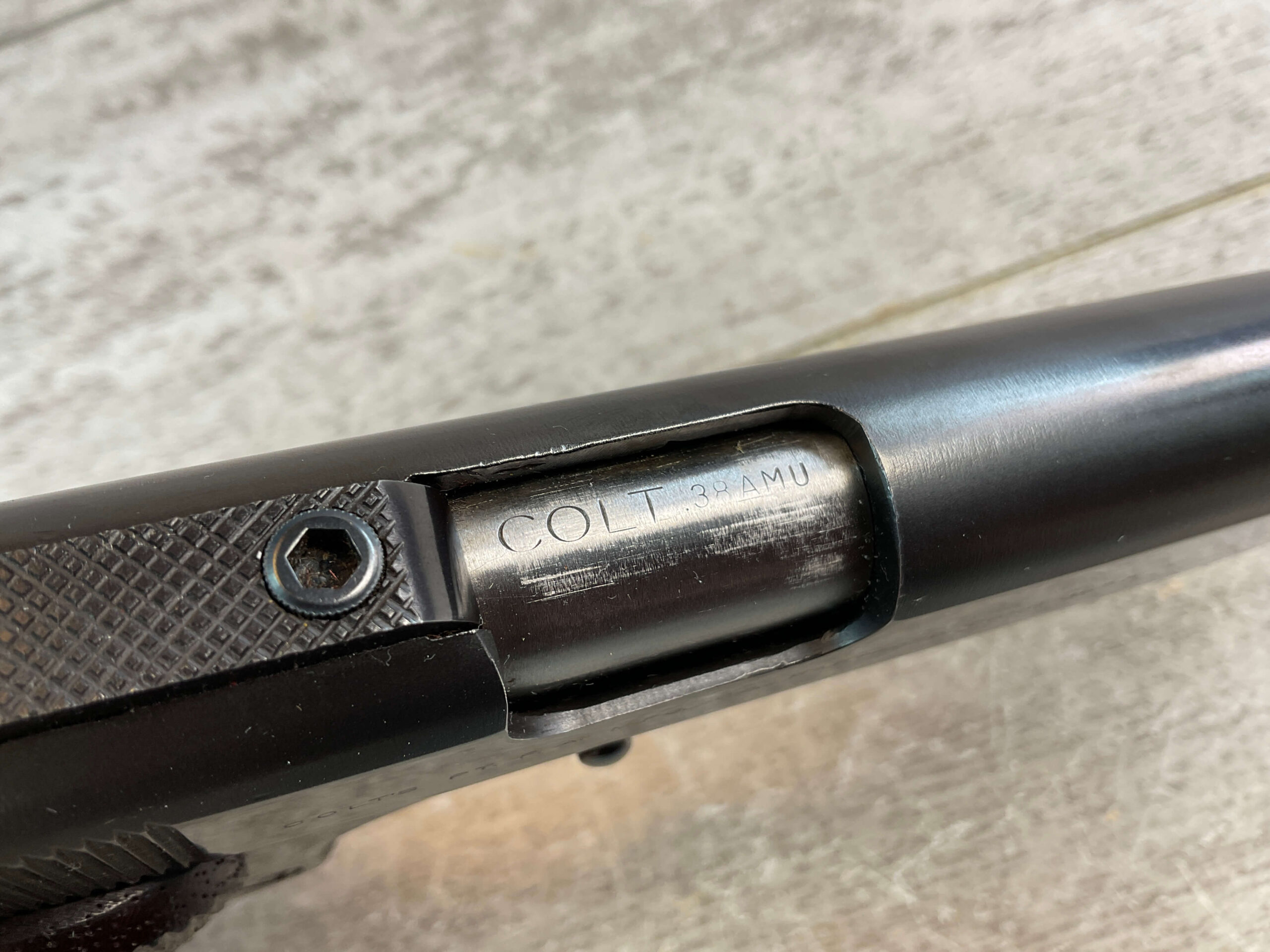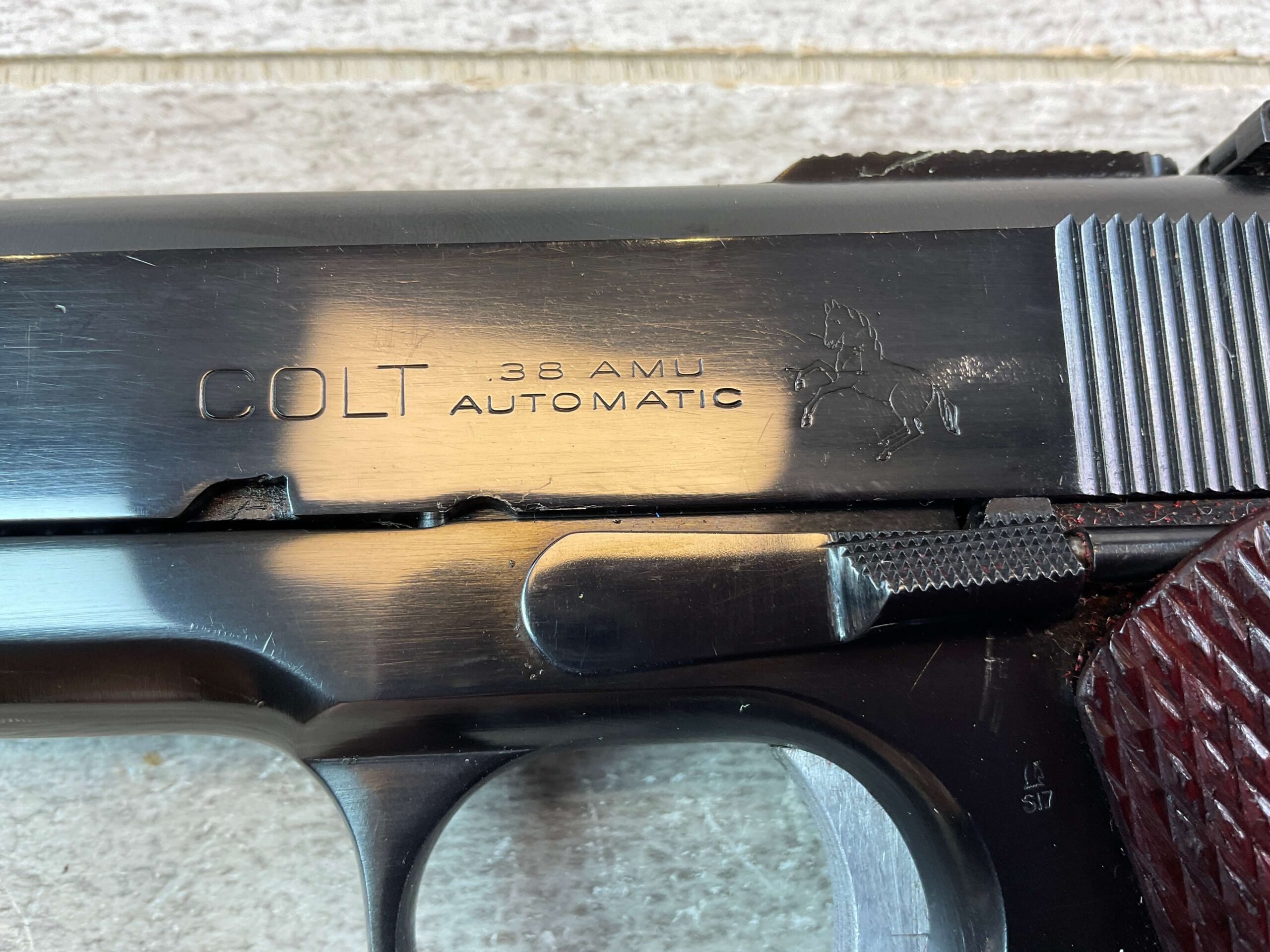COLT 1911 .38 AMU SEMI AUTO PISTOL, 1918 MFR, JAMES EARL JONES COLLECTION #548427, 5″ BARREL, EXC BORE & RIFLING, .38 AMU CALIBER (AMU STANDS FOR ARMY MARKSMANSHIP UNIT), FRAME MADE IN 1918, EXC WALNUT CHECKERED GRIPS, BO MAR ADJ REAR SIGHT, MADE FROM A .38 AMU CONVERSION KIT, EXTENDED FRONT SIGHT, 1 – COLT 38 AMU MARKED MAGAZINE, CONDITION AS SHOWN IN PICTURES (REFURB BLUE), VERY NICE!! FROM THE JAMES EARL JONES “FAVORITES” COLLECTION W/ CERTIFICATE OF AUTHENTICITY.