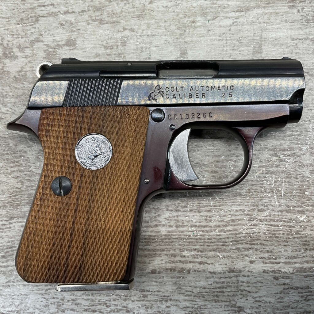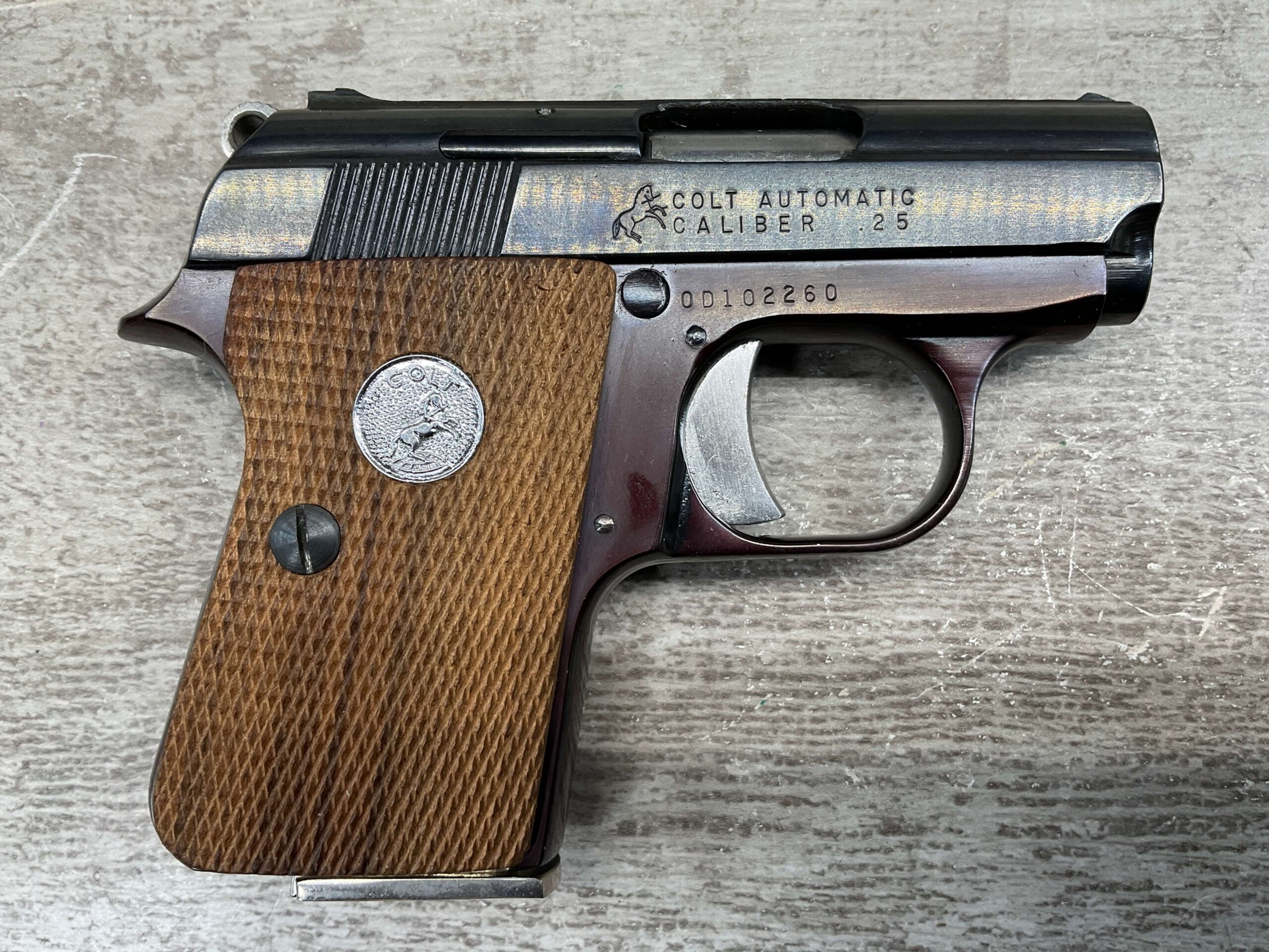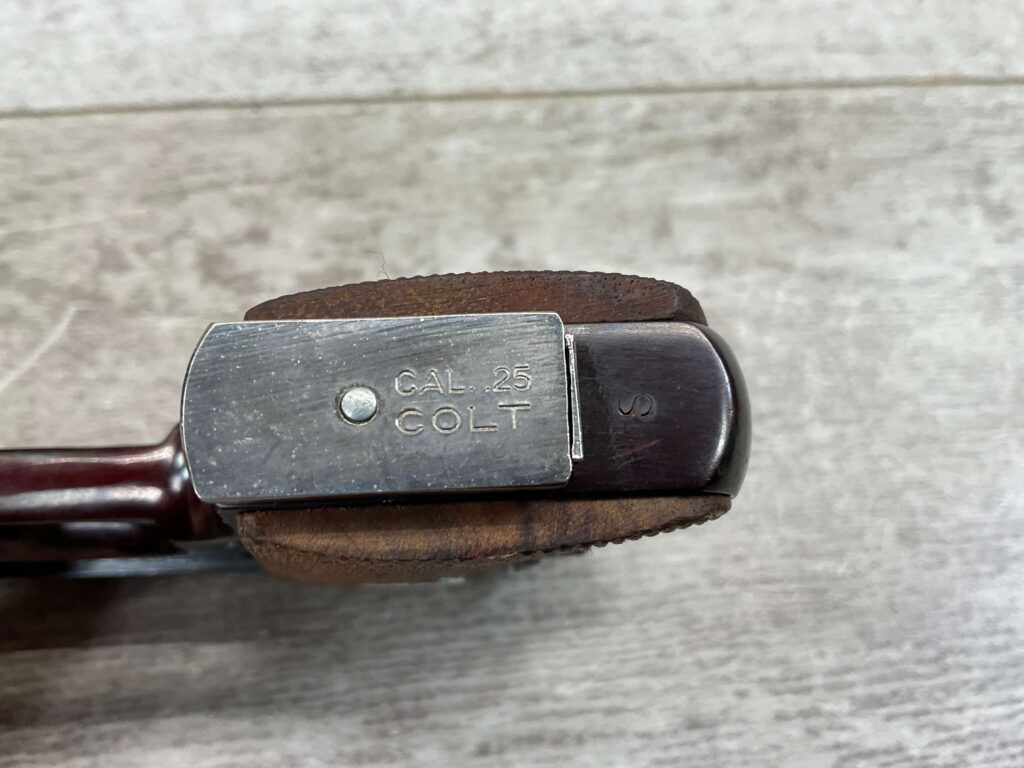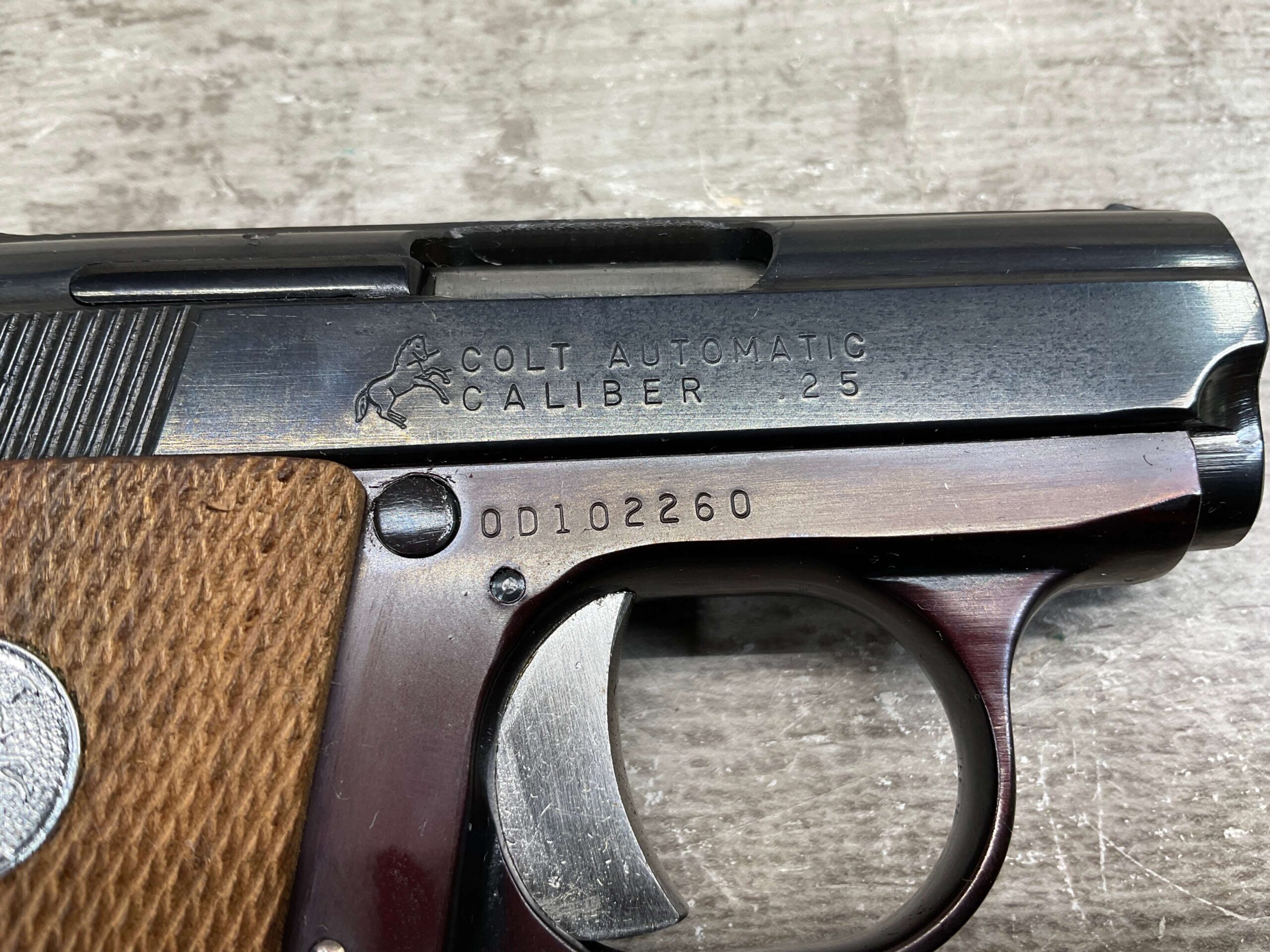 RIGHT SLIDE MARKED “COLT AUTOMATIC” OVER “CALIBER .25” WITH COLT LOGO NEXT TO LETTERS, NEAR RIGHT SIDE TRIGGER MARKED “0D102260”, LEFT SLIDE OF PISTOL MARKED “COLT’S PT. F.A. MFG. CO.” OVER “HARTFORD. CT. U.S.A.” WITH COLT LOGO NEXT TO LETTERS, BOTTOM OF MAG MARKED “CAL. .25 / COLT”, EXCELLENT MINT BORE AND RIFLING, EXCELLENT ORIGINAL BLUE, 98%+