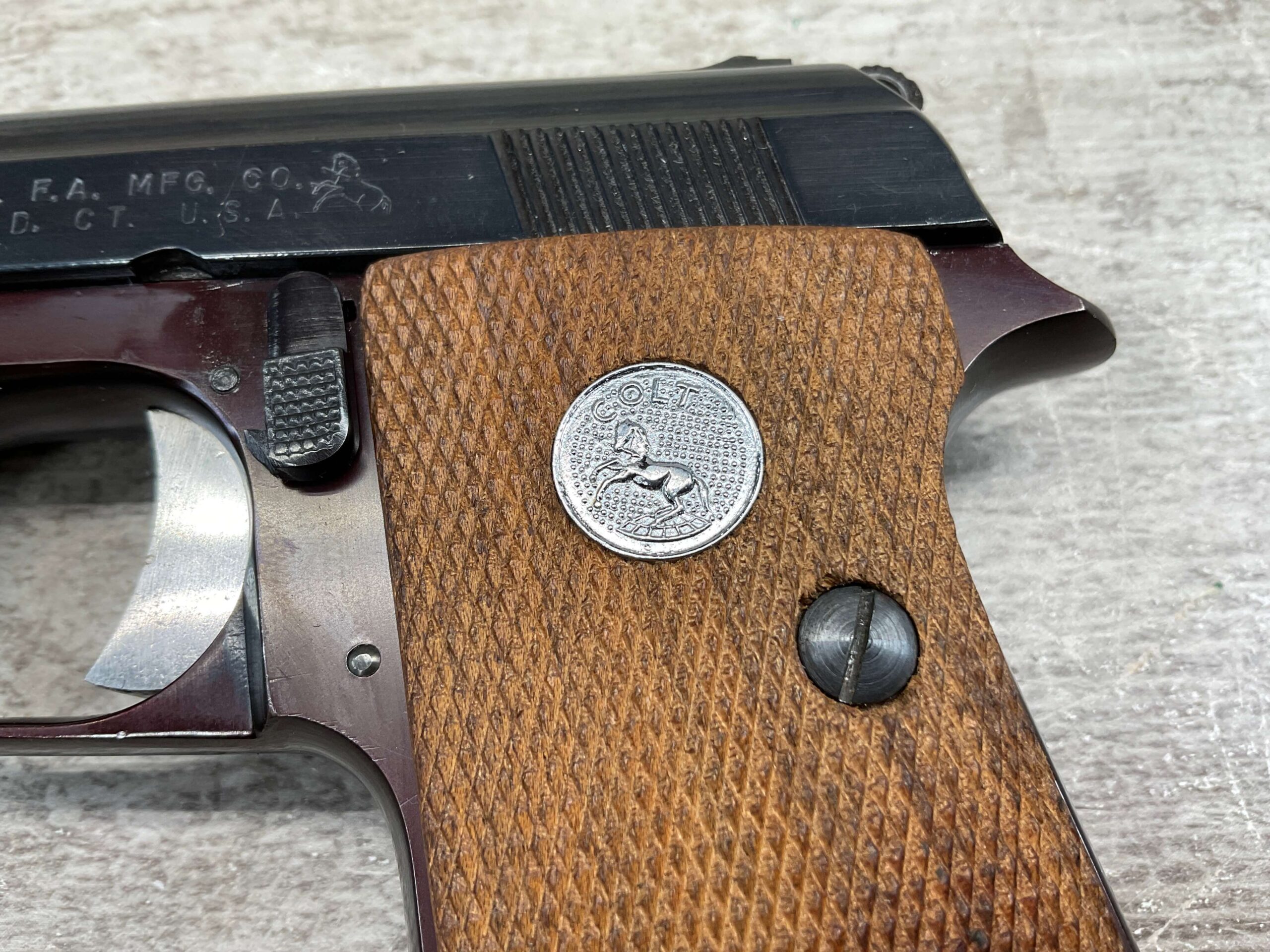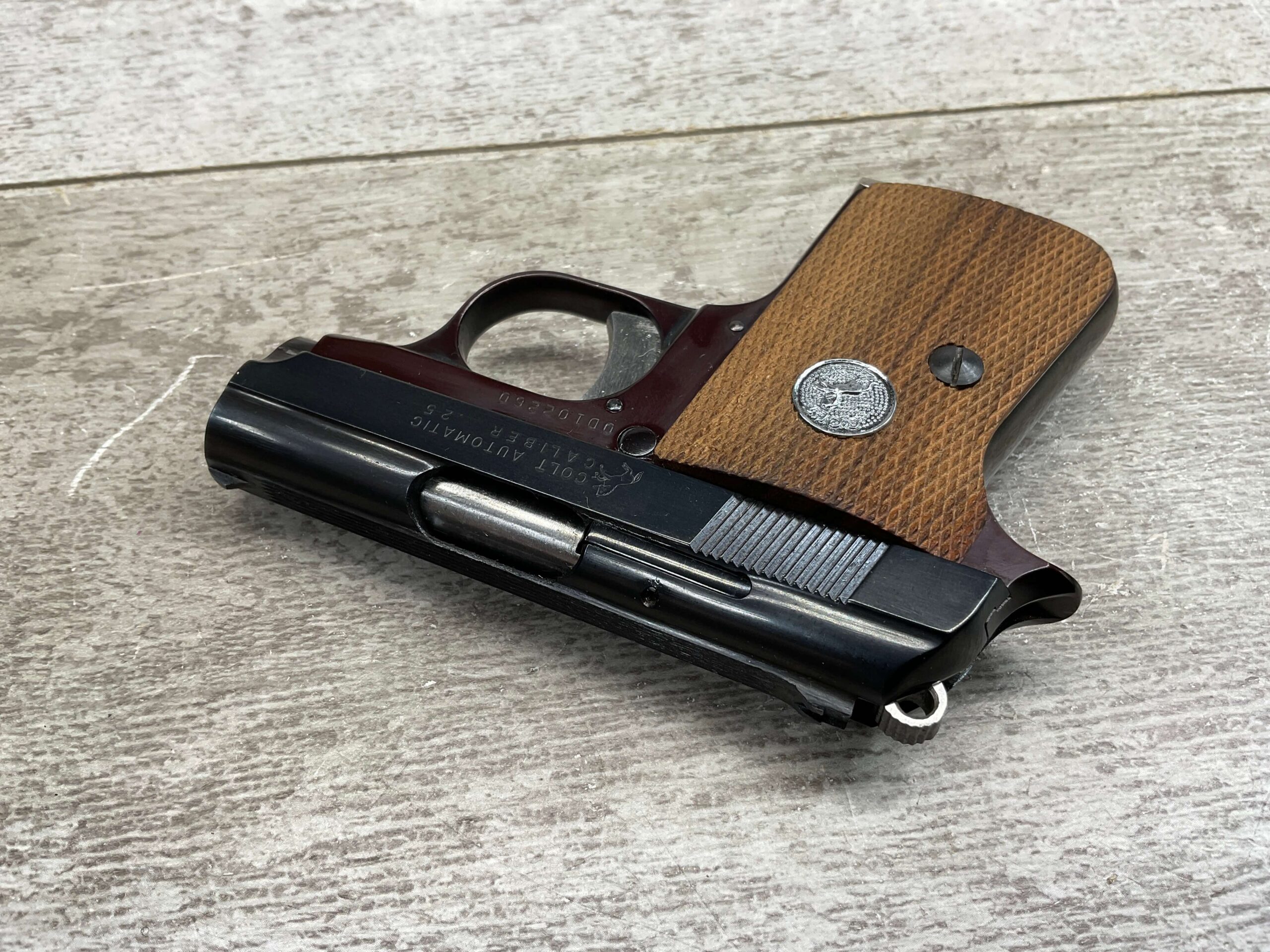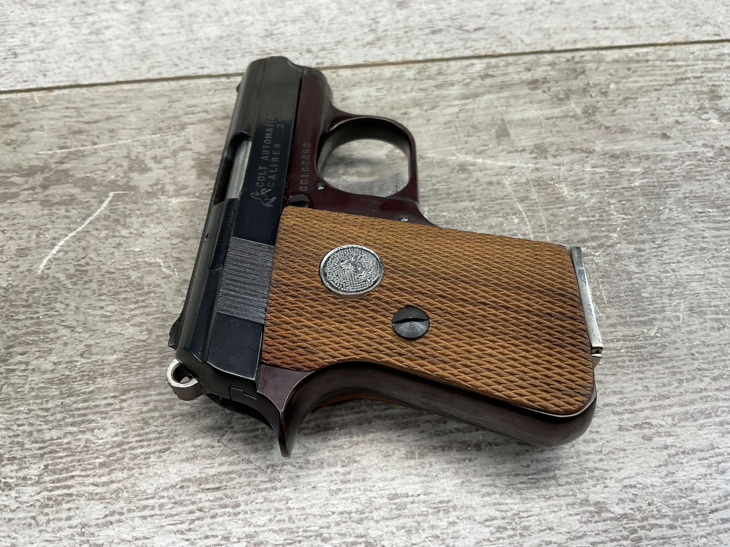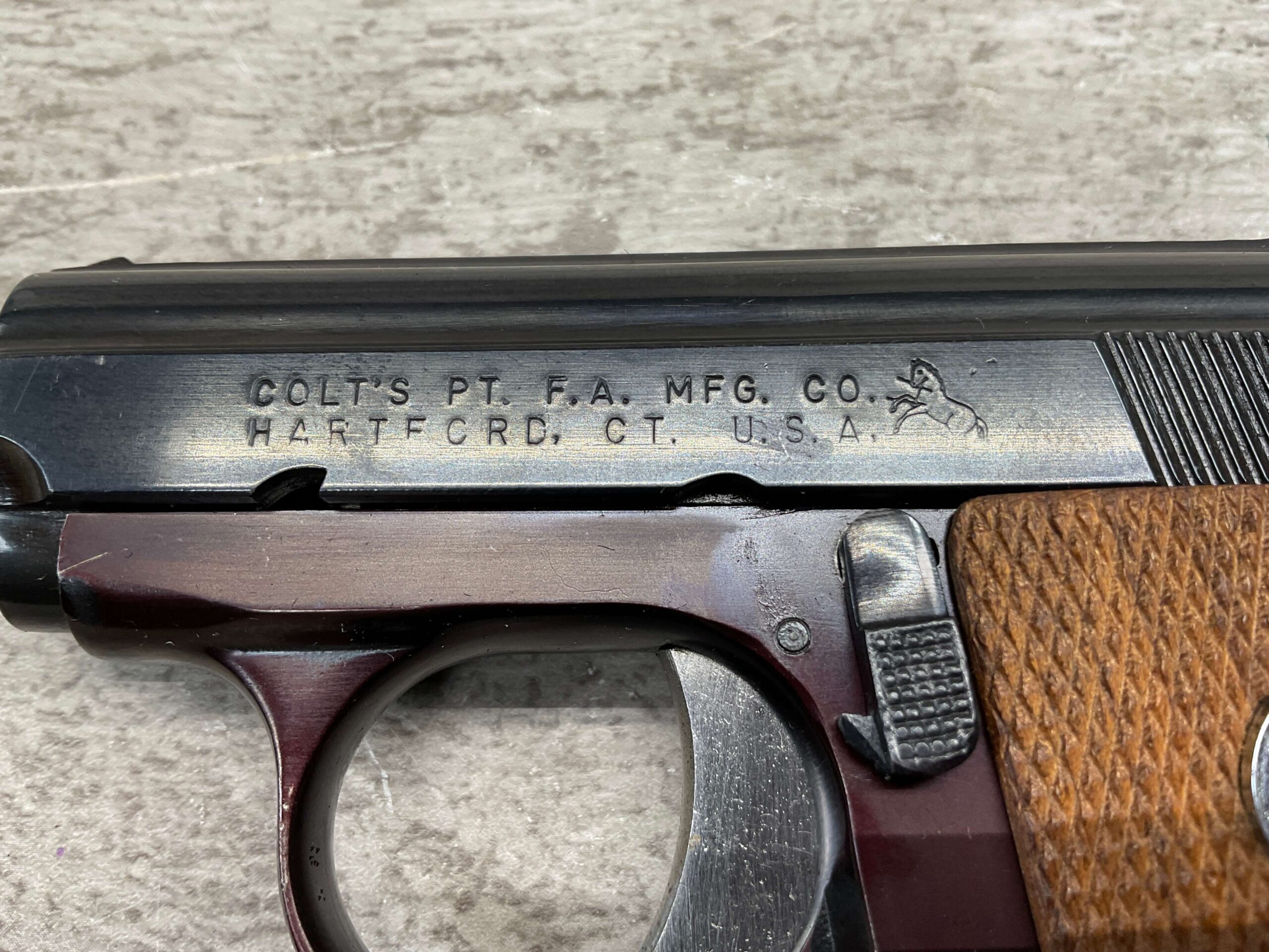 RIGHT SLIDE MARKED “COLT AUTOMATIC” OVER “CALIBER .25” WITH COLT LOGO NEXT TO LETTERS, NEAR RIGHT SIDE TRIGGER MARKED “0D102260”, LEFT SLIDE OF PISTOL MARKED “COLT’S PT. F.A. MFG. CO.” OVER “HARTFORD. CT. U.S.A.” WITH COLT LOGO NEXT TO LETTERS, BOTTOM OF MAG MARKED “CAL. .25 / COLT”, EXCELLENT MINT BORE AND RIFLING, EXCELLENT ORIGINAL BLUE, 98%+