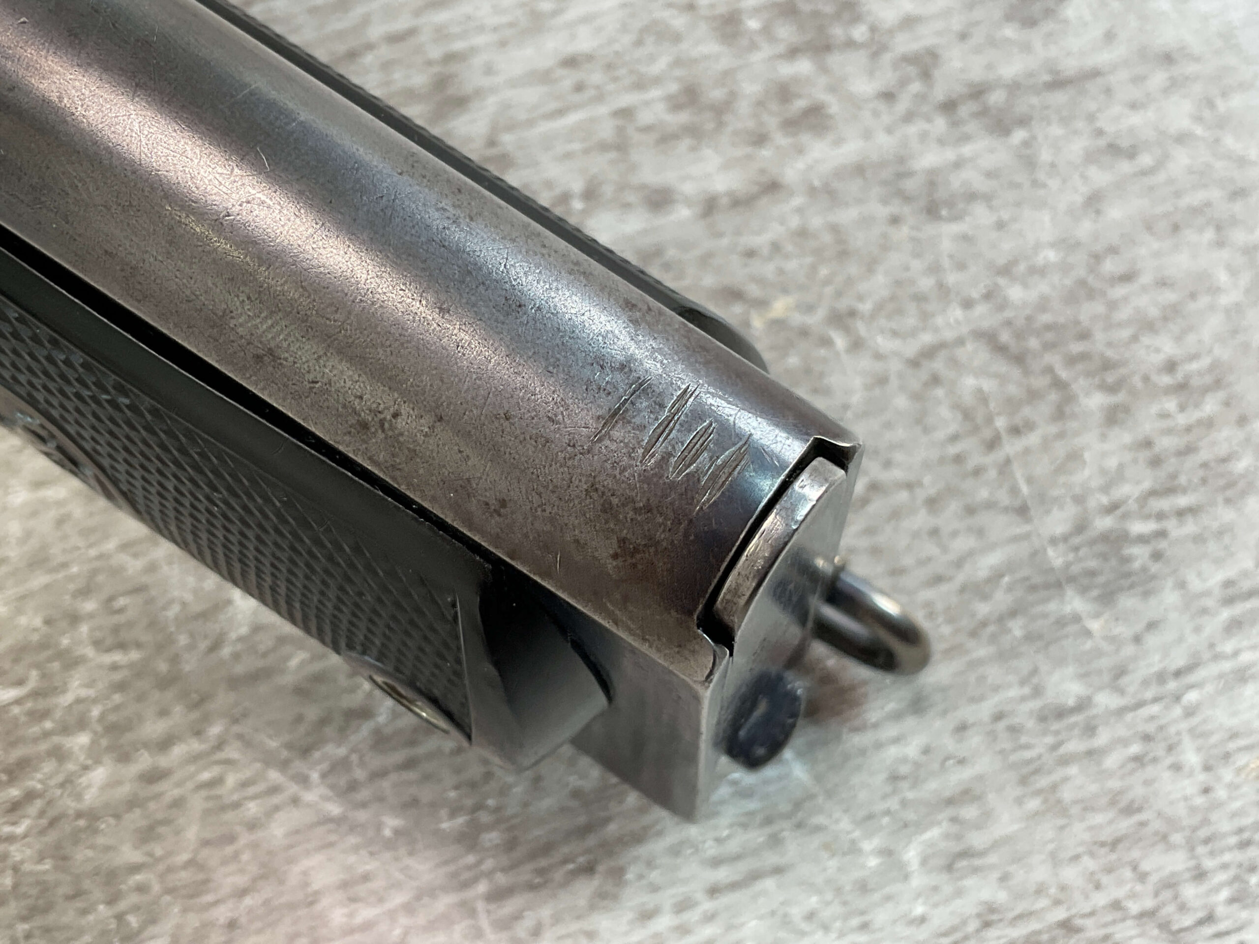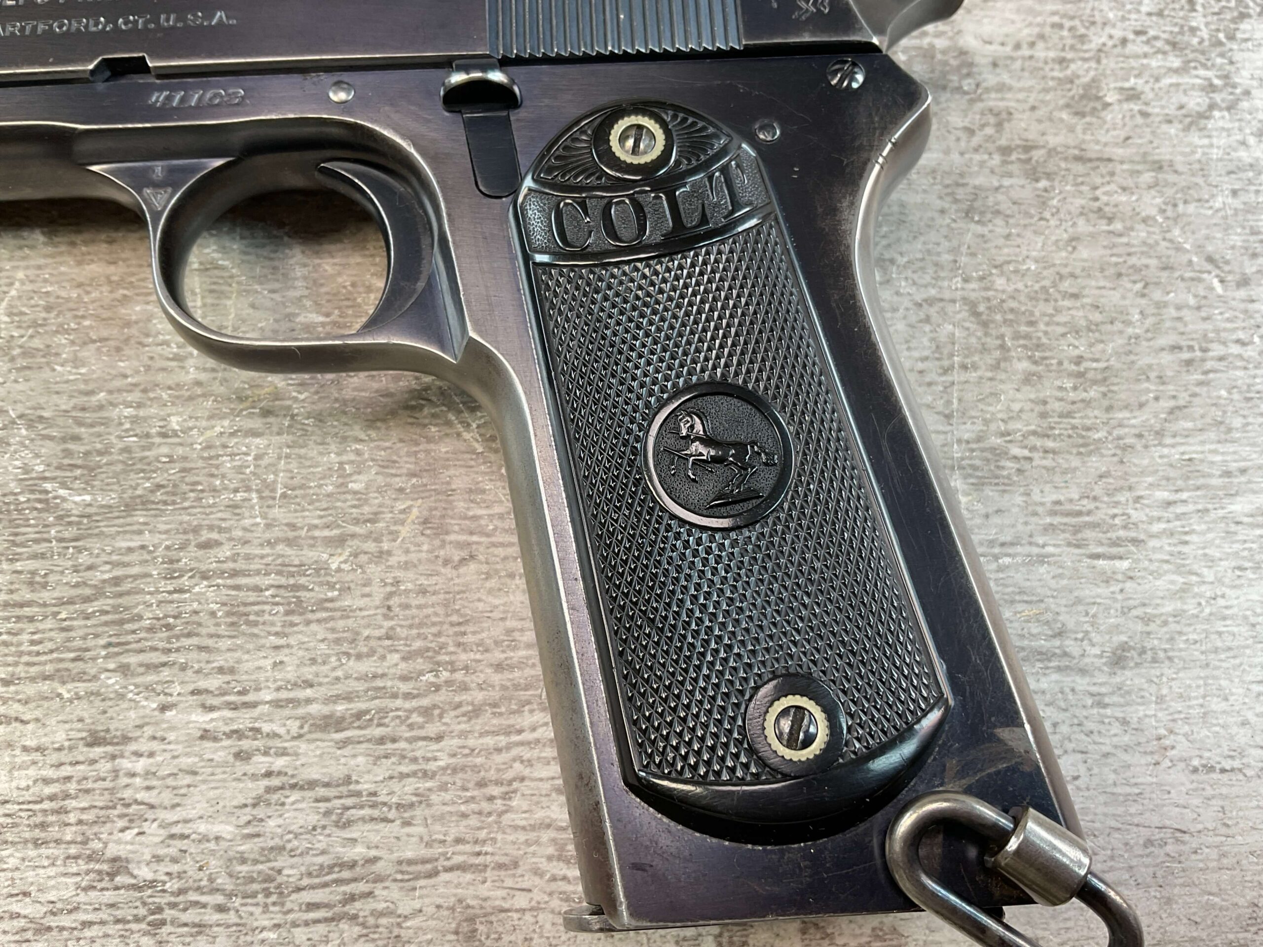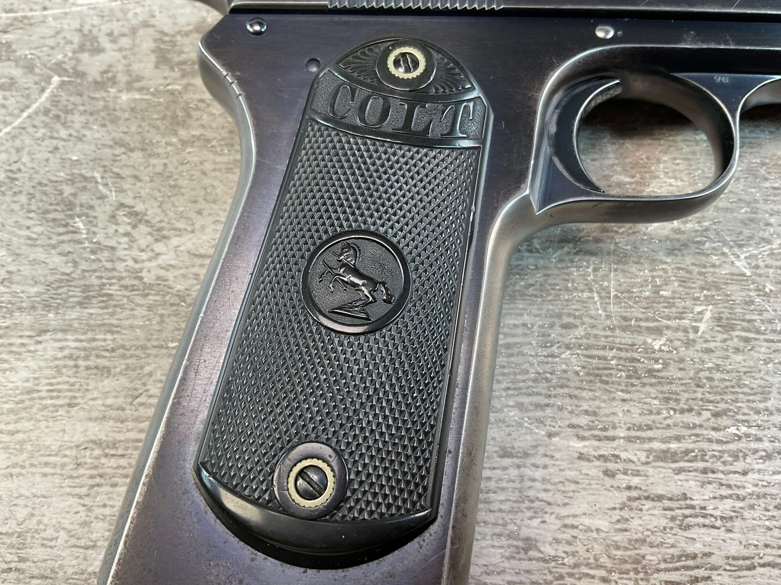 COLT MODEL 1902 MILITARY 38 RIMLESS SEMI AUTO PISTOL, JAMES EARL JONES COLLECTION #41163, 6″ BARREL, GOOD BORE & RIFLING W/ LIGHT FROSTING, 90%+ ORIGINAL BLUE FINISH, FINSH LOSS ON FRONT & REAR GRIP STRAP & HIGH EDGE WEAR, VG-EXC ORGINAL GRIPS, CONDITION AS SHOWN IN PICTURES, FROM THE JAMES EARL JONES “FAVORITES” COLLECTION W/ CERTIFICATE OF AUTHENTICITY.