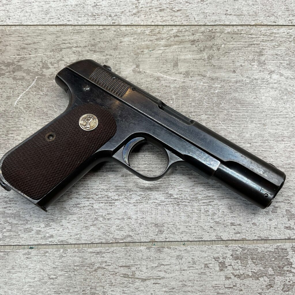 COLT MODEL 1903 HAMMERLESS .32 ACP SEMI AUTO PISTOL, 1904 MFR #12418, 90+% BLUE W/LIGHT HIGH EDGE WEAR & SPECKLING IN AREAS, VG/EXC BRIGHT BORE & EXC STRONG RIFLING, 3.75″ BBL, VG-EXC CHECKERED WALNUT GRIPS W/MEDALLION, 1 FACTORY MAGAZINE UNMARKED, EXC OVERALL & HARD TO FIND IN THIS CONDITION!!