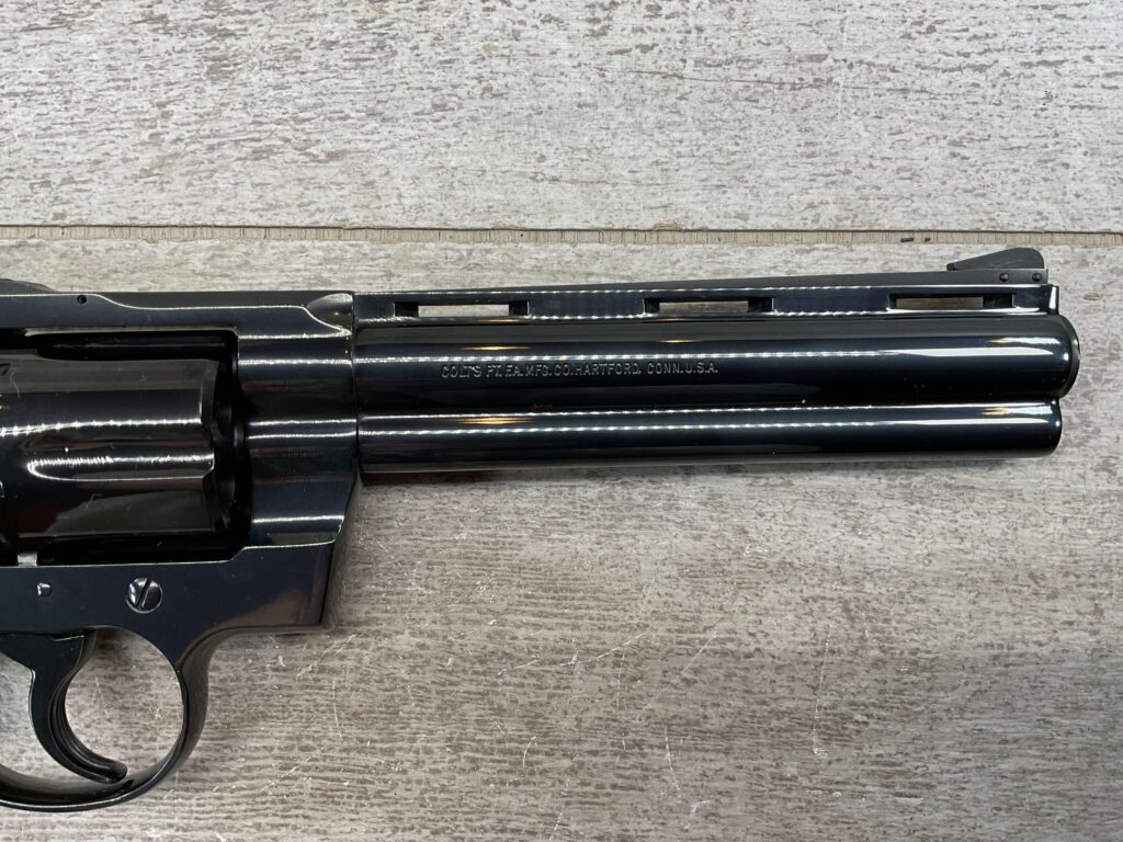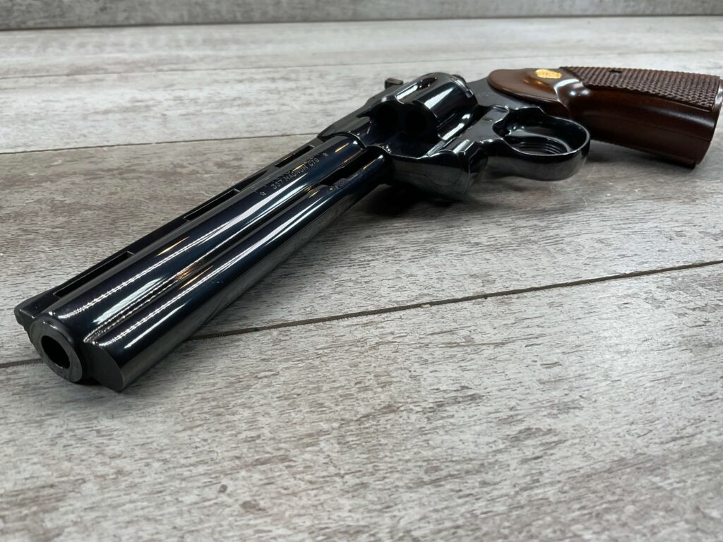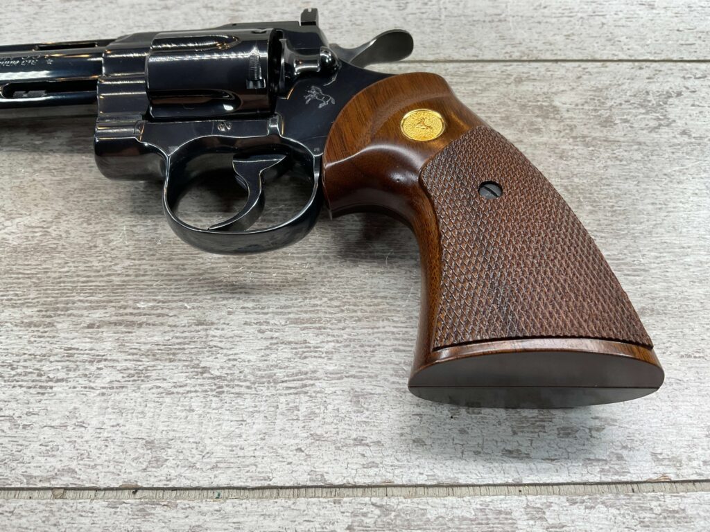 COLT PYTHON 357 MAG BLUED REVOLVER, LIKE NEW W/BOX #V32991, 1978 MFR, 6″ BBL, 99%+ BLUE, 99%+ CHECKERED GRIPS, IF FIRED IT WAS VERY LITTLE, BOX IS TATHERED BUT ALL THERE, GREAT INVESTMENT PIECE!!