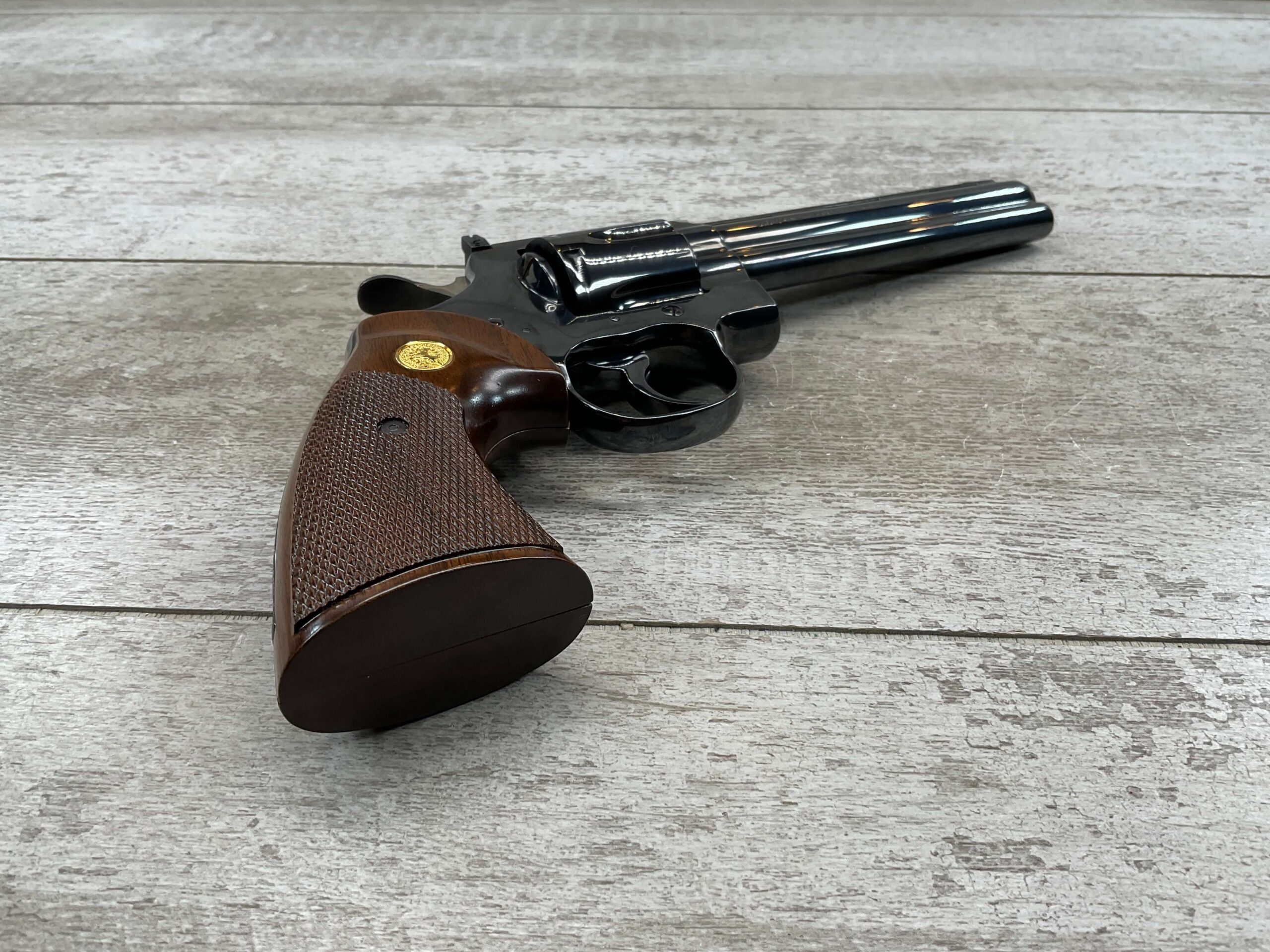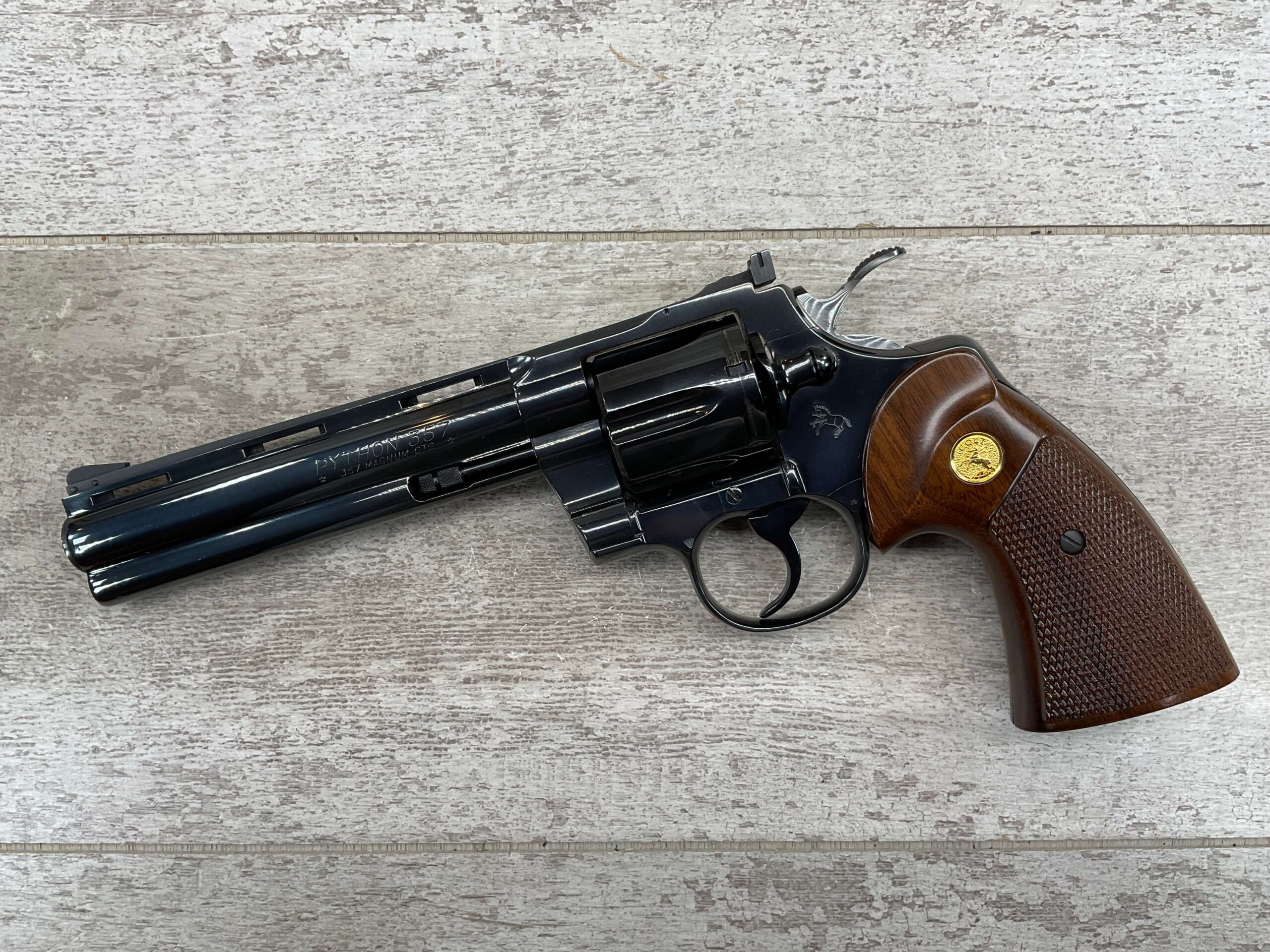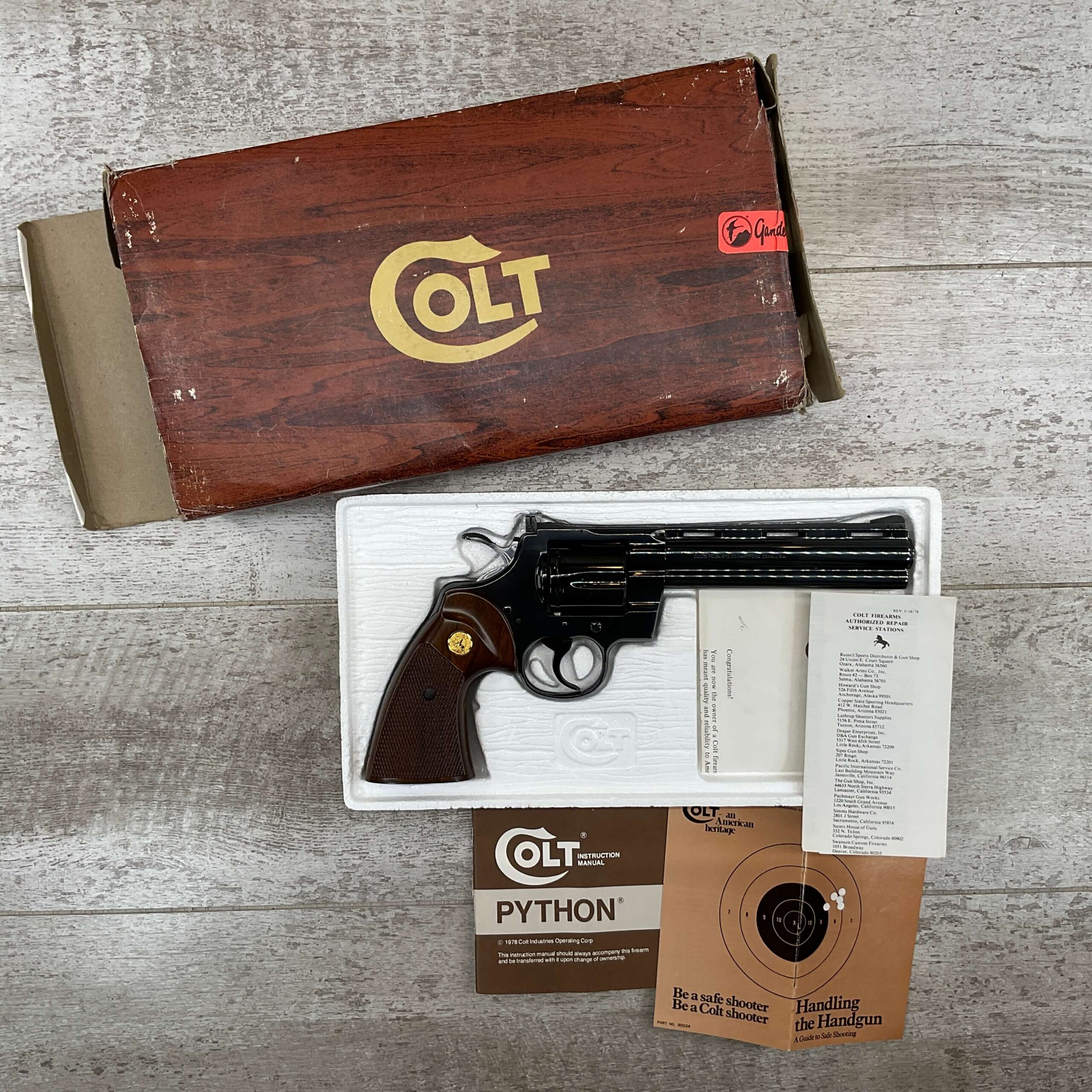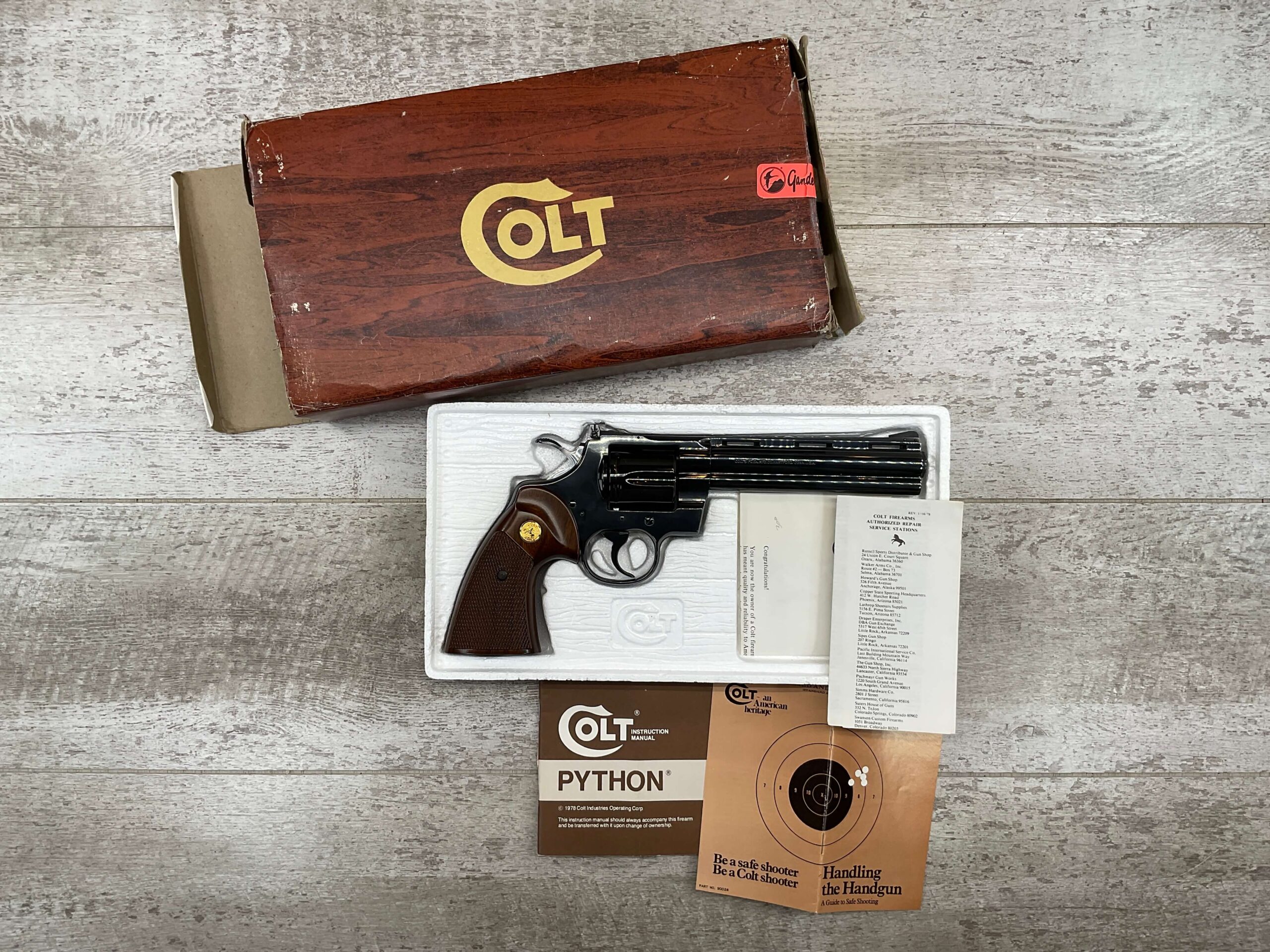 COLT PYTHON 357 MAG BLUED REVOLVER, LIKE NEW W/BOX #V32991, 1978 MFR, 6″ BBL, 99%+ BLUE, 99%+ CHECKERED GRIPS, IF FIRED IT WAS VERY LITTLE, BOX IS TATHERED BUT ALL THERE, GREAT INVESTMENT PIECE!!