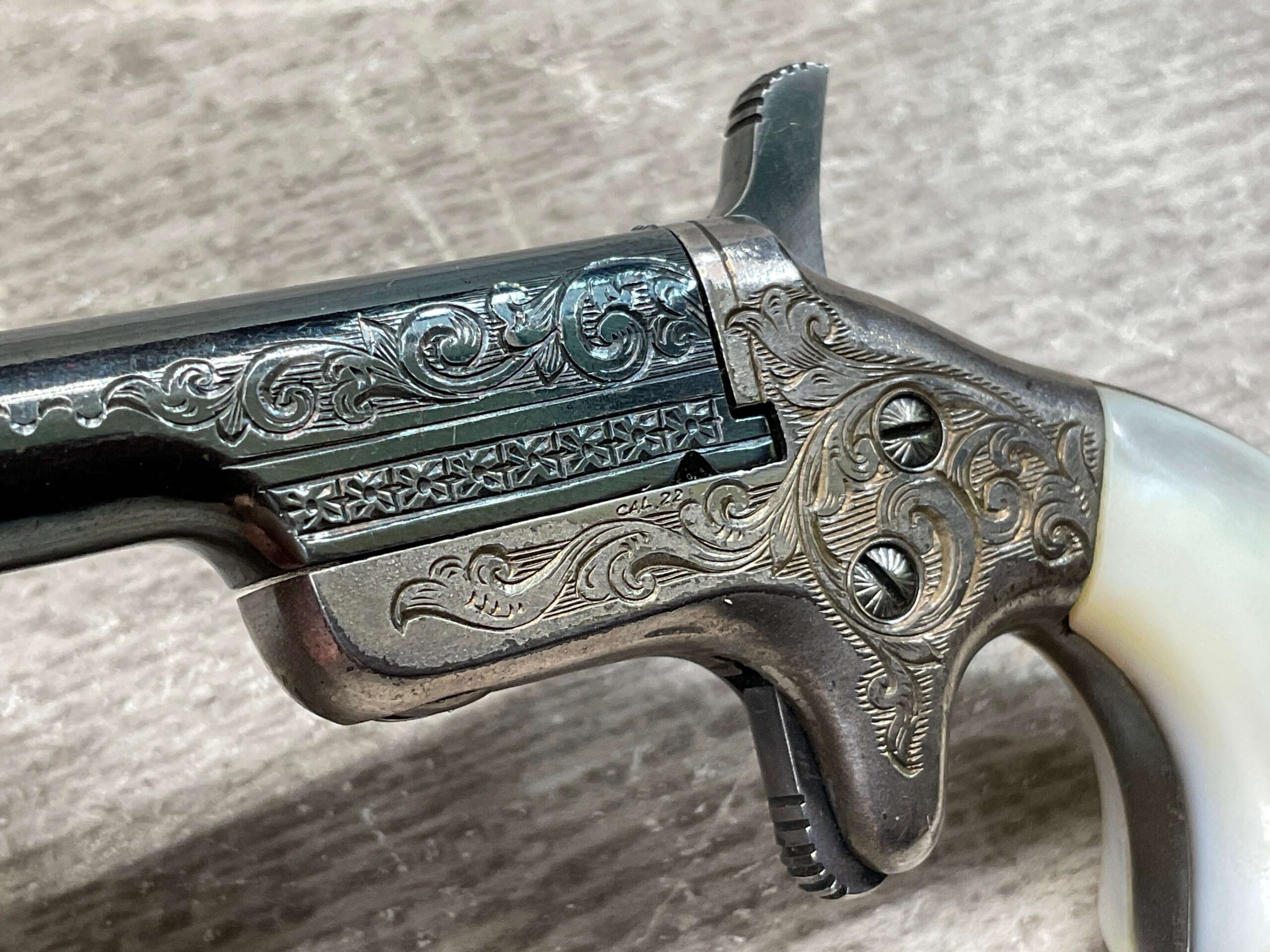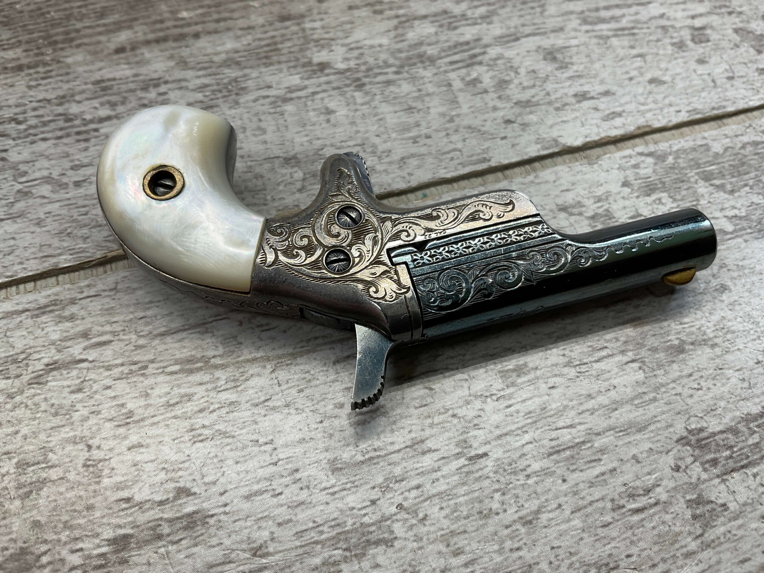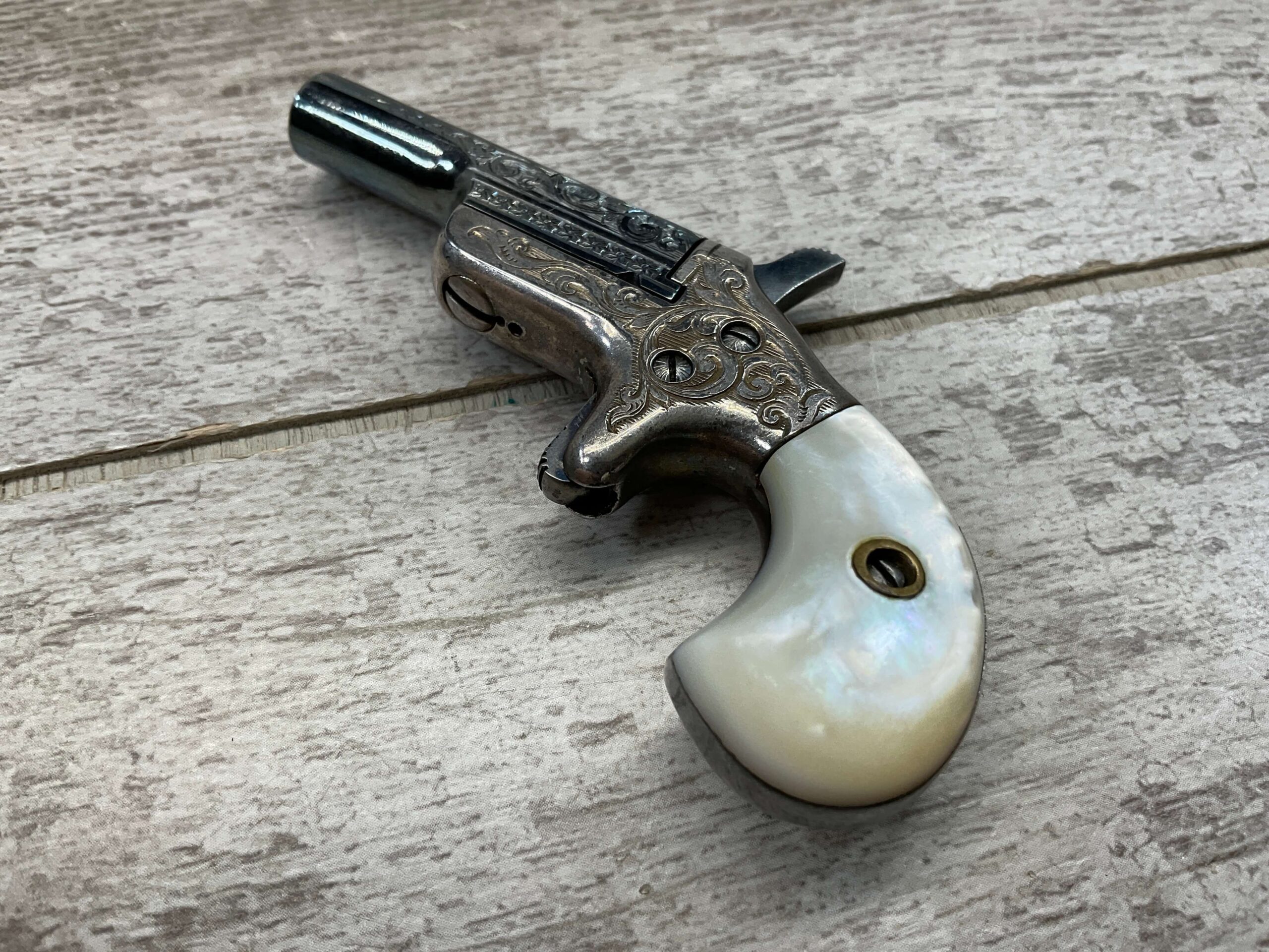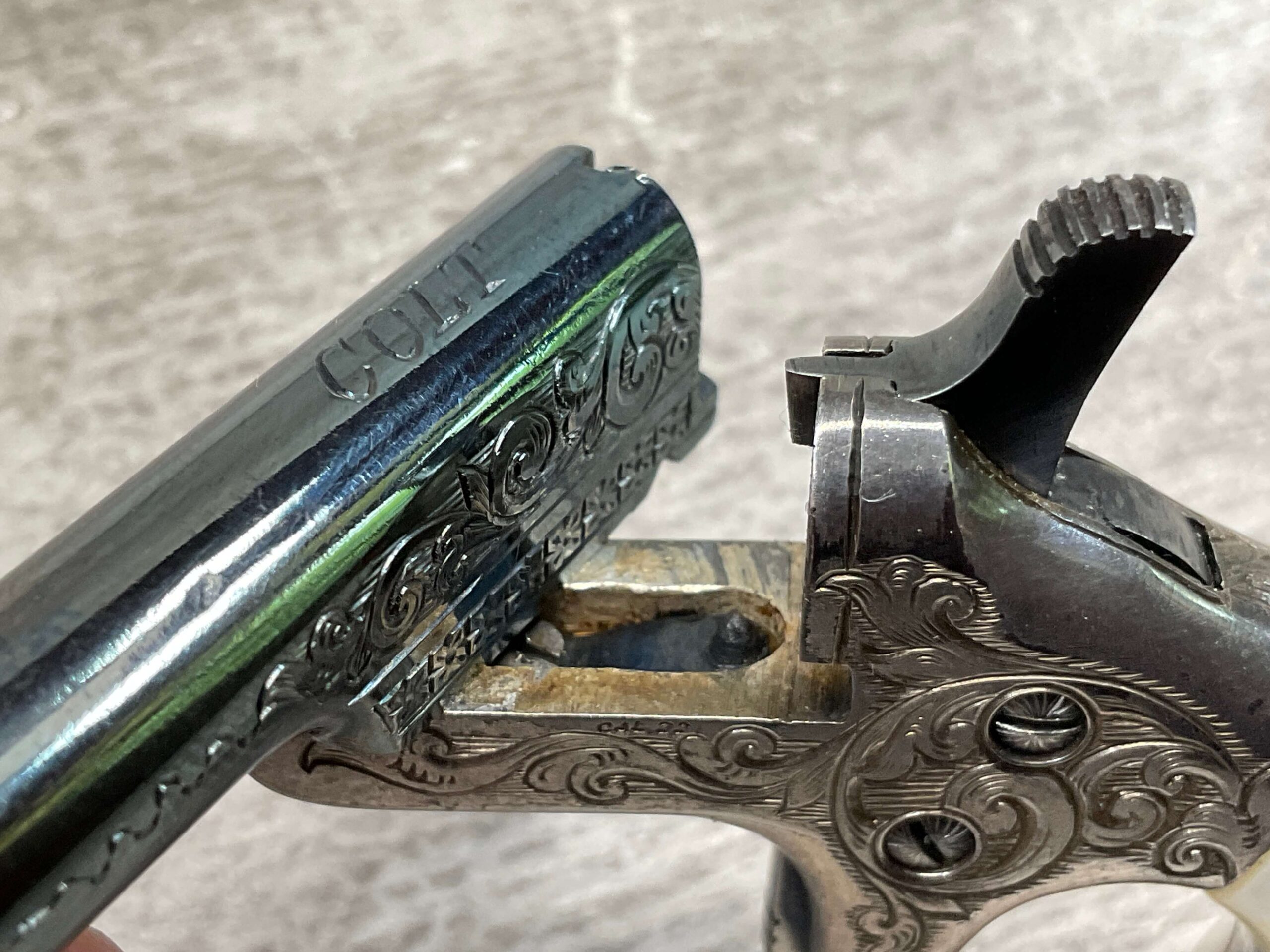 COLT SALESMAN SAMPLE .22 SHORT MINIATURE PISTOL, C&R FFL #NSN, ENGRAVED NICKLE RECEIVER, EXC ENGRAVED BLUE BARREL, PEARL GRIPS, VERY NICE PIECE!! CONDITION AS SHOWN IN PICTURES