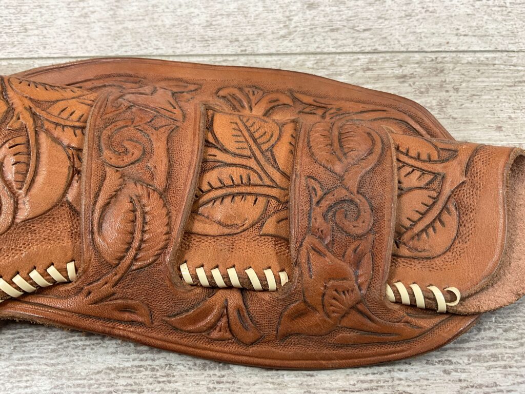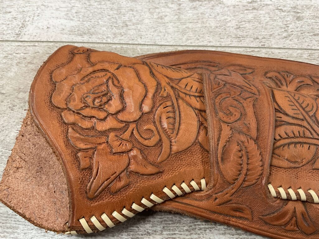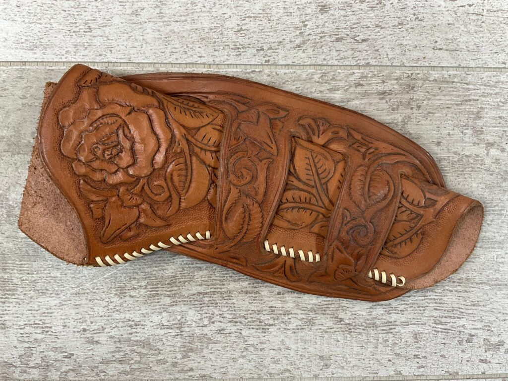 SKU#543 COLT/S&W/ETC. MED. FRAME 6″ D.A. REVOLVER EXC. BROWN LEATHER COWBOY HOLSTER W/FANCY TOOLED LEATHER FACE