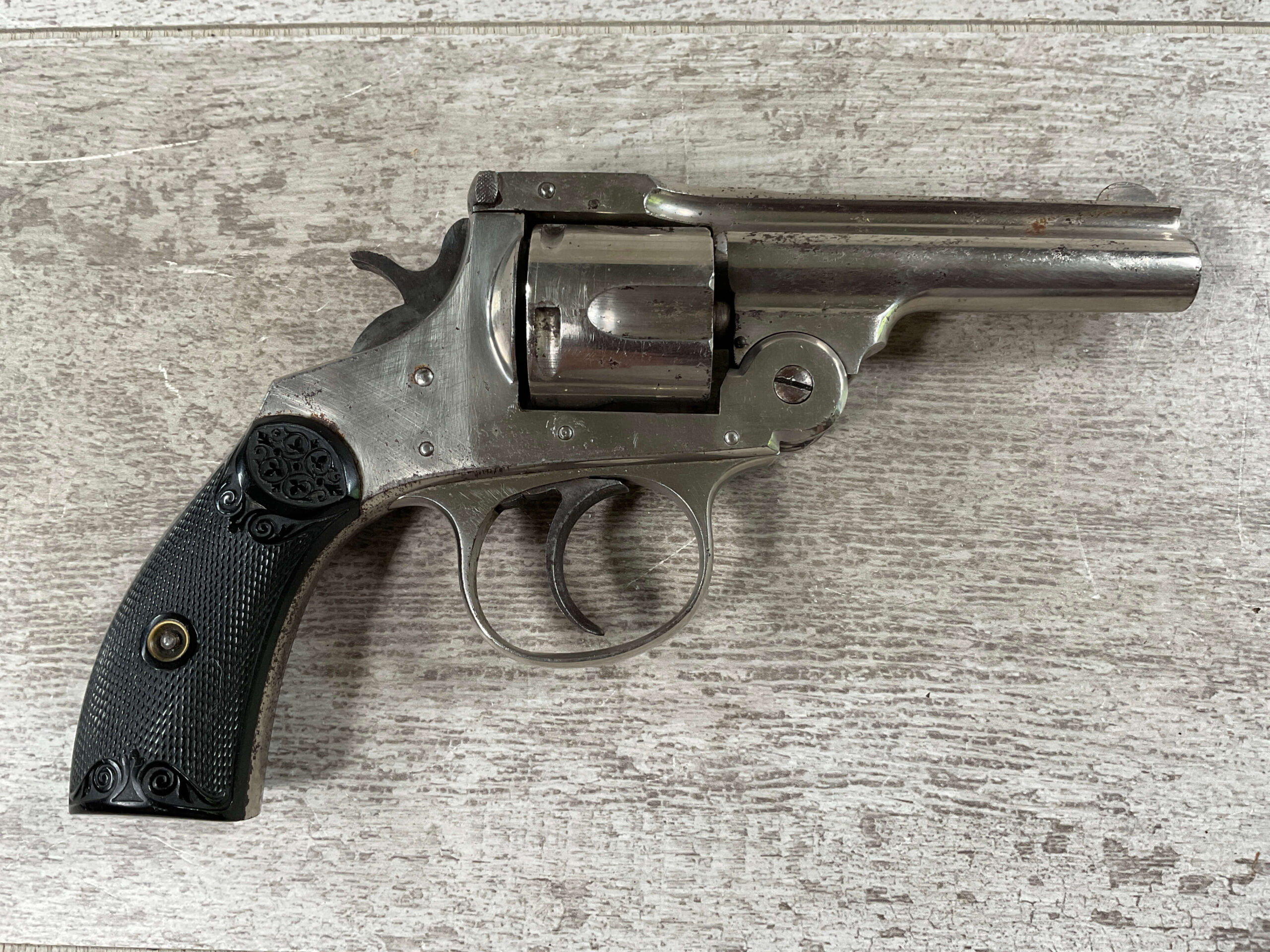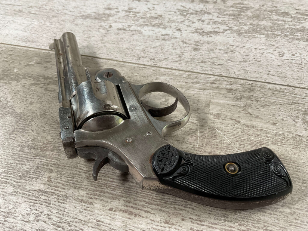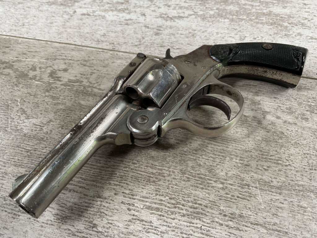 COLUMBIAN F.A. MFG CO .32 CAL TOP BREAK REVOLVER #21809, 5 SHOT, 3 1/2″ BBL, “COLUMBIAN F. A. M’F’G Co. PHILA. PA. U.S.A. PAT DEC. 11 1894” MARKED ON TOP OF THE BARREL, VG BLACK PLASTIC GRIPS, DARK PITTED BORE W/VG RIFLING, NICKEL PLATED W/85+% NICKEL REMAINING, SOME SCATTERED RUST SPOTS, NICE LITTLE REVOLVER