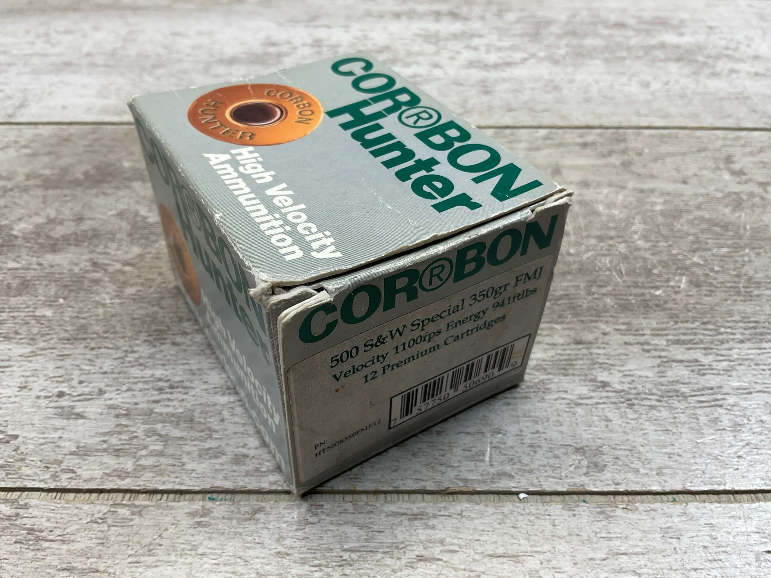 COR-BON HUNTER 500 S&W SPECIAL, 350 GR. FMJ AMMO, QTY 10, VINTAGE, HEADSTAMP “COR-BON / 500 SPECIAL”, BOX IS IN GOOD CONDITION WITH SOME LIGHT WEAR ON CORNERS AND EDGES, BUT OTHERWISE FUNCTIONS.
