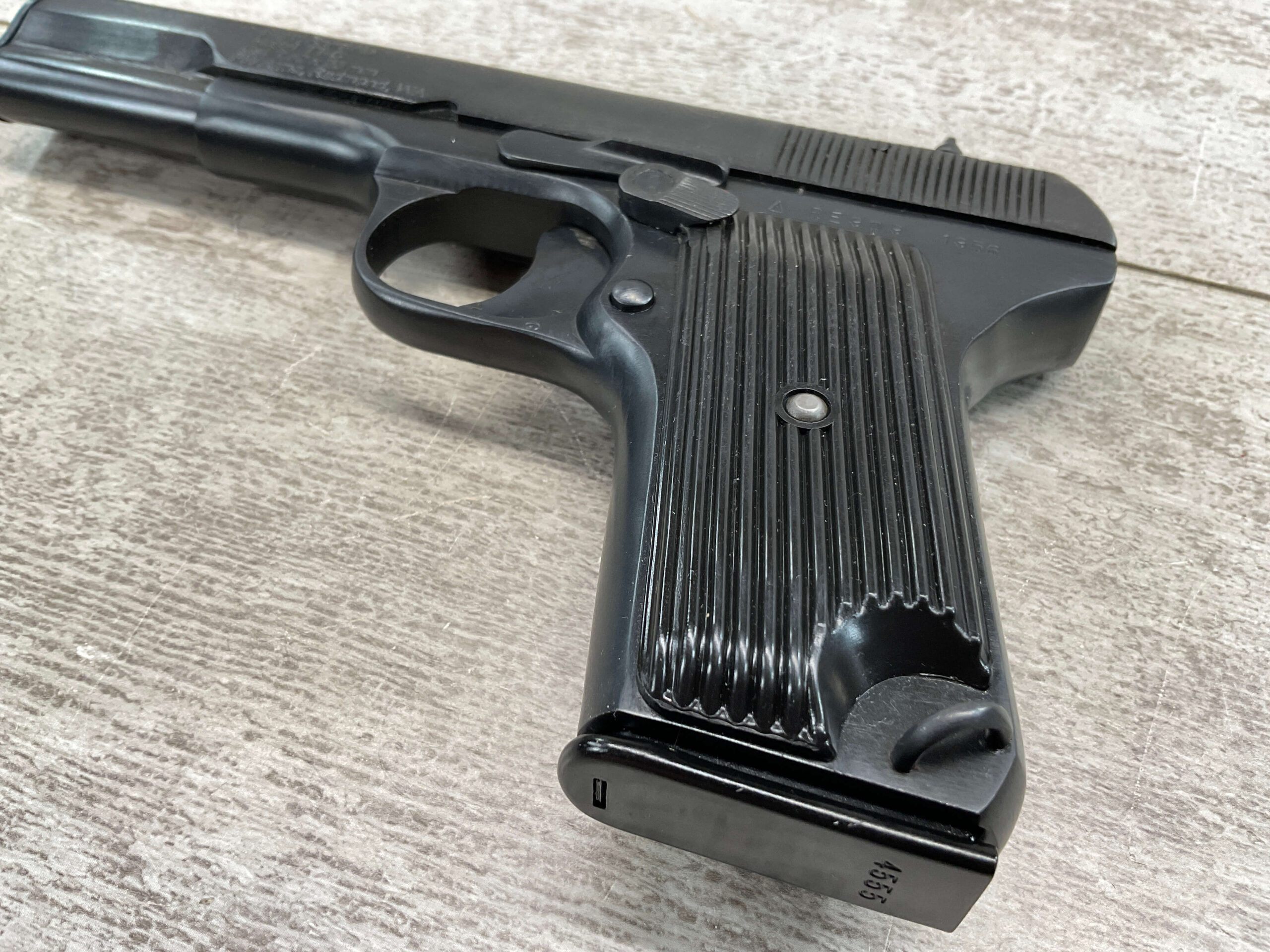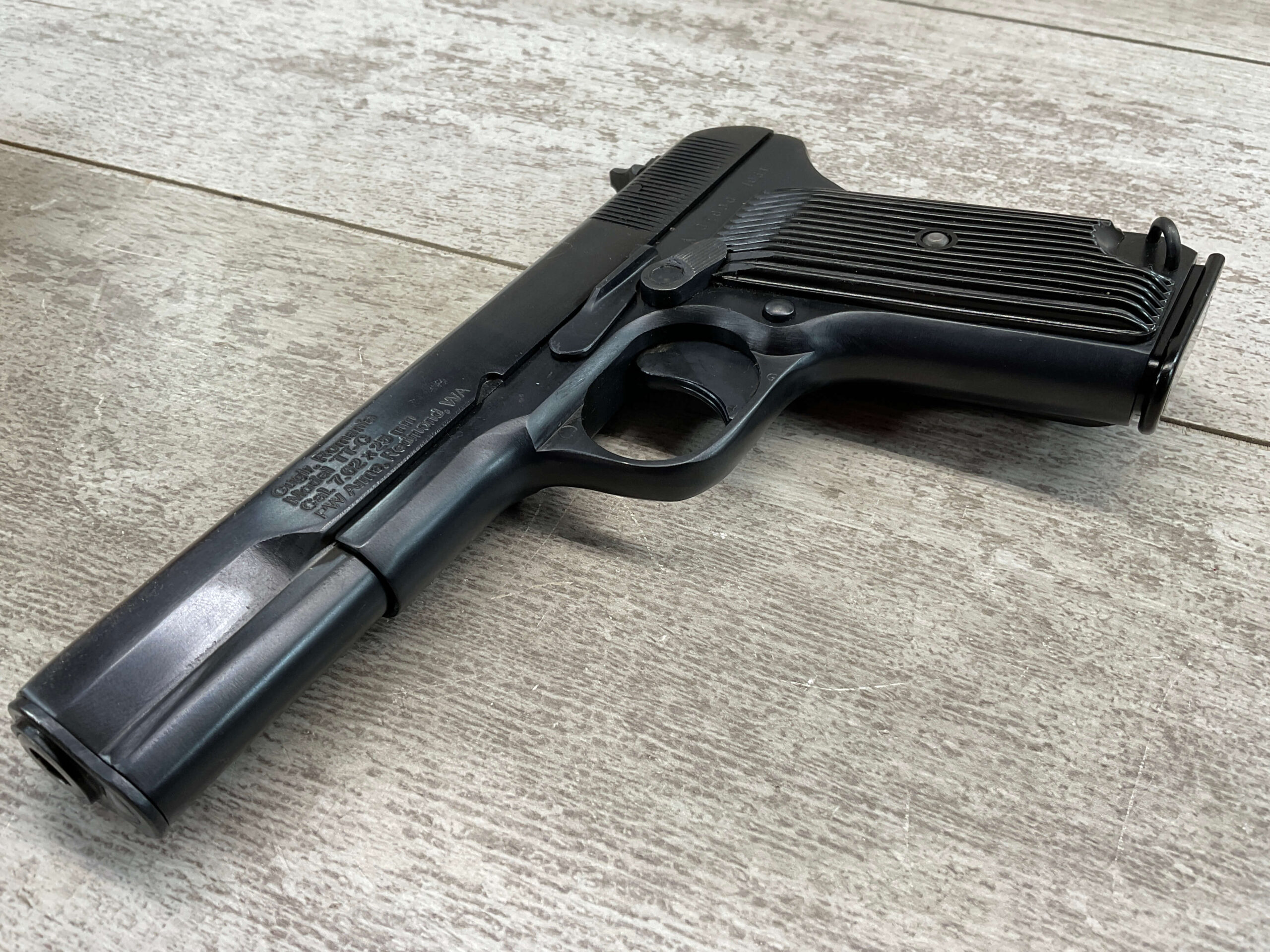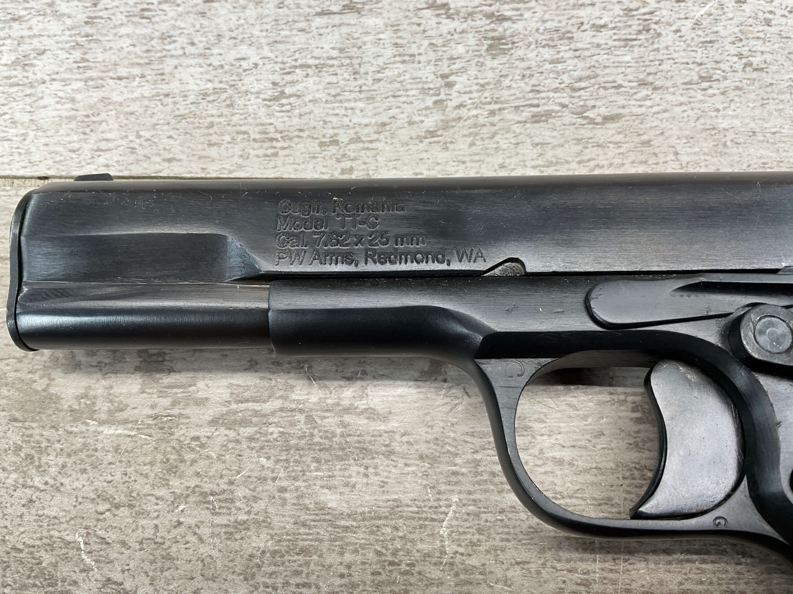 CUGIR ROMANIAN TOKAREV 7.62X25mm MODEL TTC PISTOL #BE 909, MADE IN ROMANIAN MILITARY ARMS FACTORY AT CUGIR, 4.5″ BARREL, DARK BORE W/PITTING THROUGHOUT & STRONG RIFLING, STRONG SMOOTH ACTION, NARROW REAR SLIDE SERRATIONS, RUBBER GRIPS, NON-ORIGINAL SWIVEL THUMB SAFETY, PW ARMS IMPORT MARKED, LANYARD RING, ONE MAGAZINE, APPEARS UNISSUED/UNFIRED (EXCEPT FOR THE BARREL)