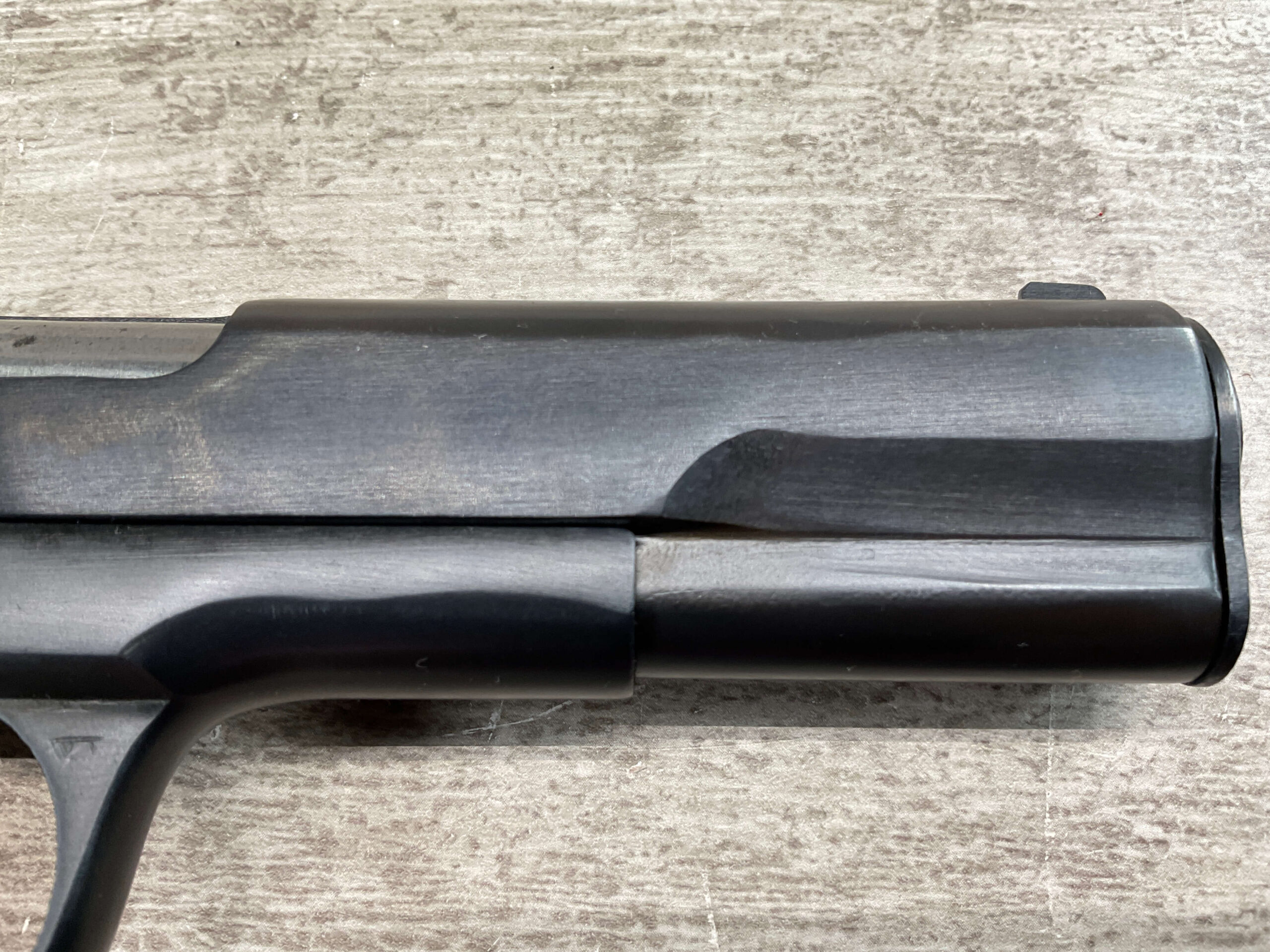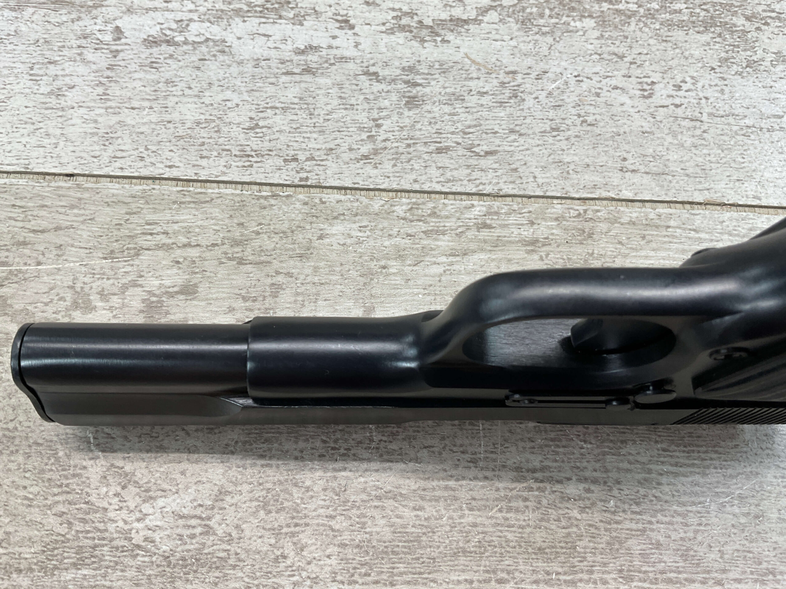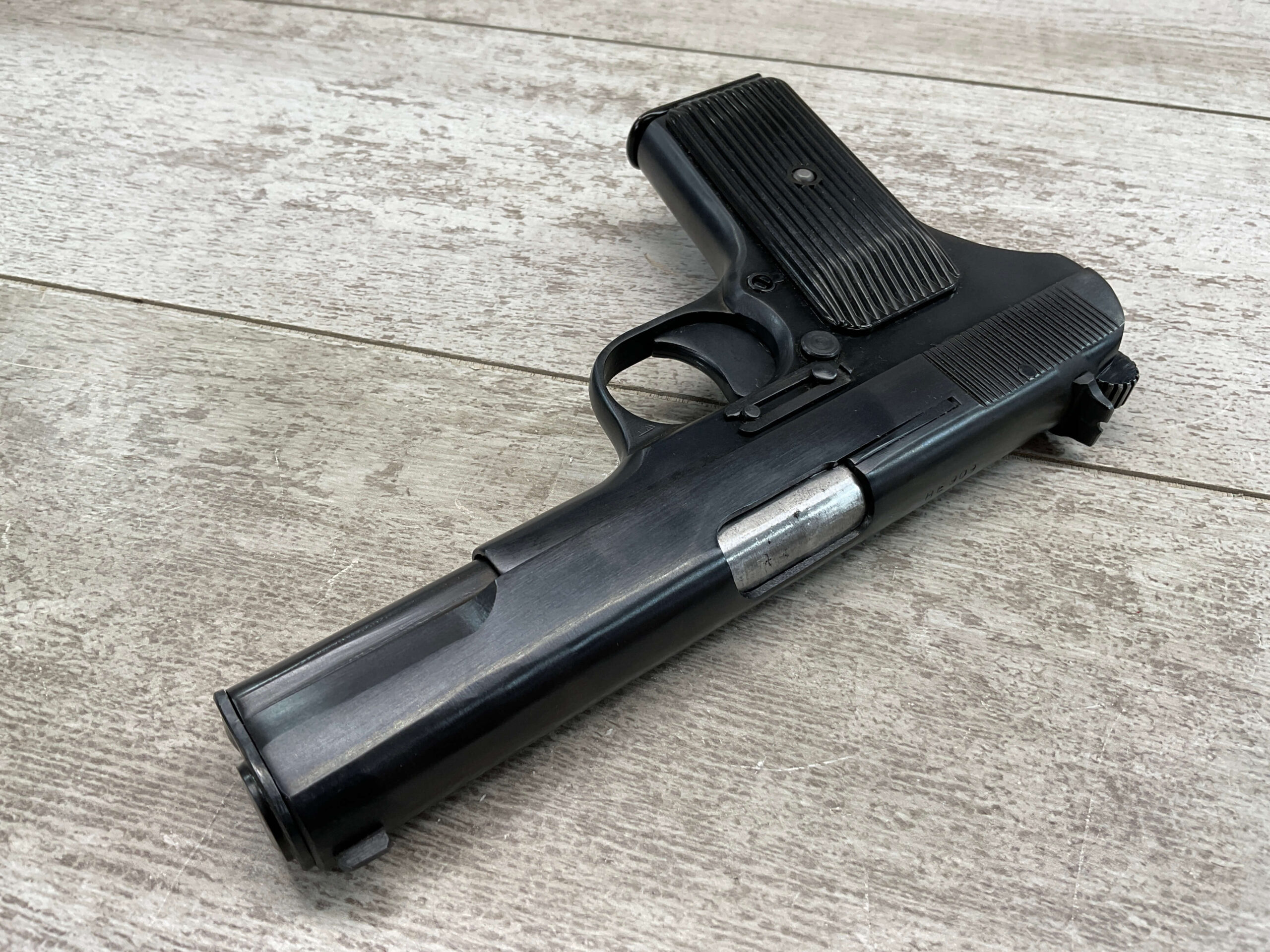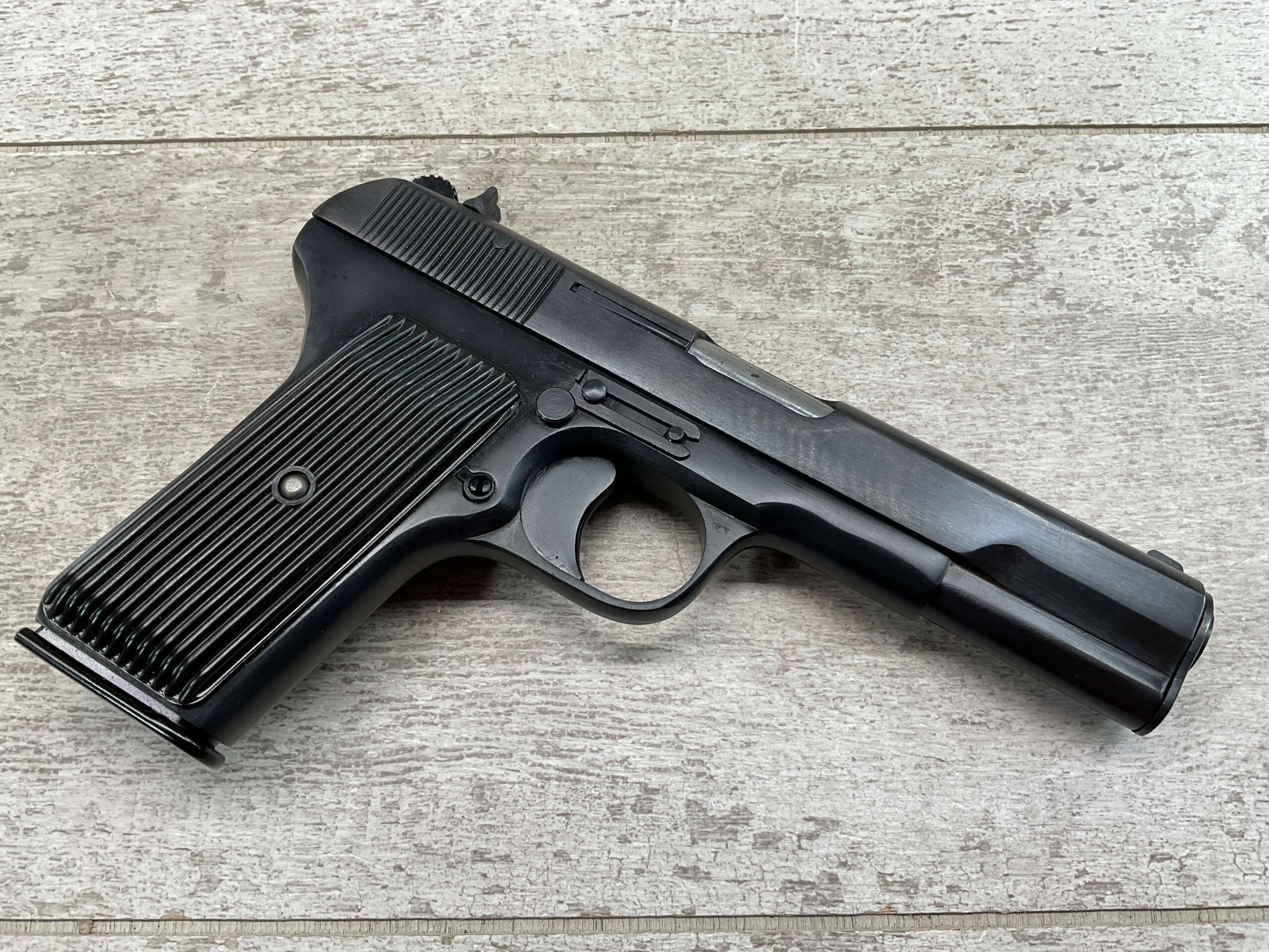 CUGIR ROMANIAN TOKAREV 7.62X25mm MODEL TTC PISTOL #BE 909, MADE IN ROMANIAN MILITARY ARMS FACTORY AT CUGIR, 4.5″ BARREL, DARK BORE W/PITTING THROUGHOUT & STRONG RIFLING, STRONG SMOOTH ACTION, NARROW REAR SLIDE SERRATIONS, RUBBER GRIPS, NON-ORIGINAL SWIVEL THUMB SAFETY, PW ARMS IMPORT MARKED, LANYARD RING, ONE MAGAZINE, APPEARS UNISSUED/UNFIRED (EXCEPT FOR THE BARREL)