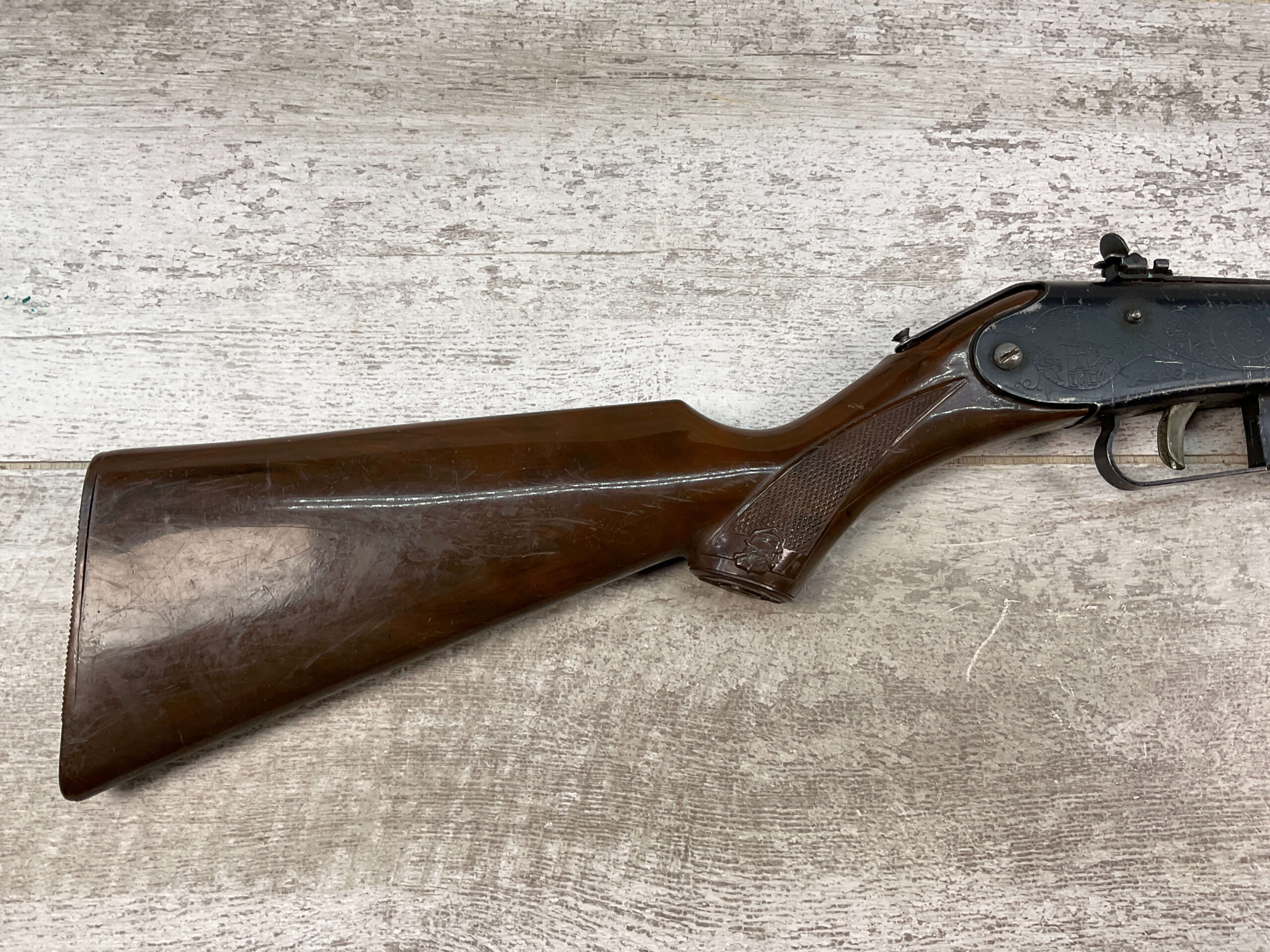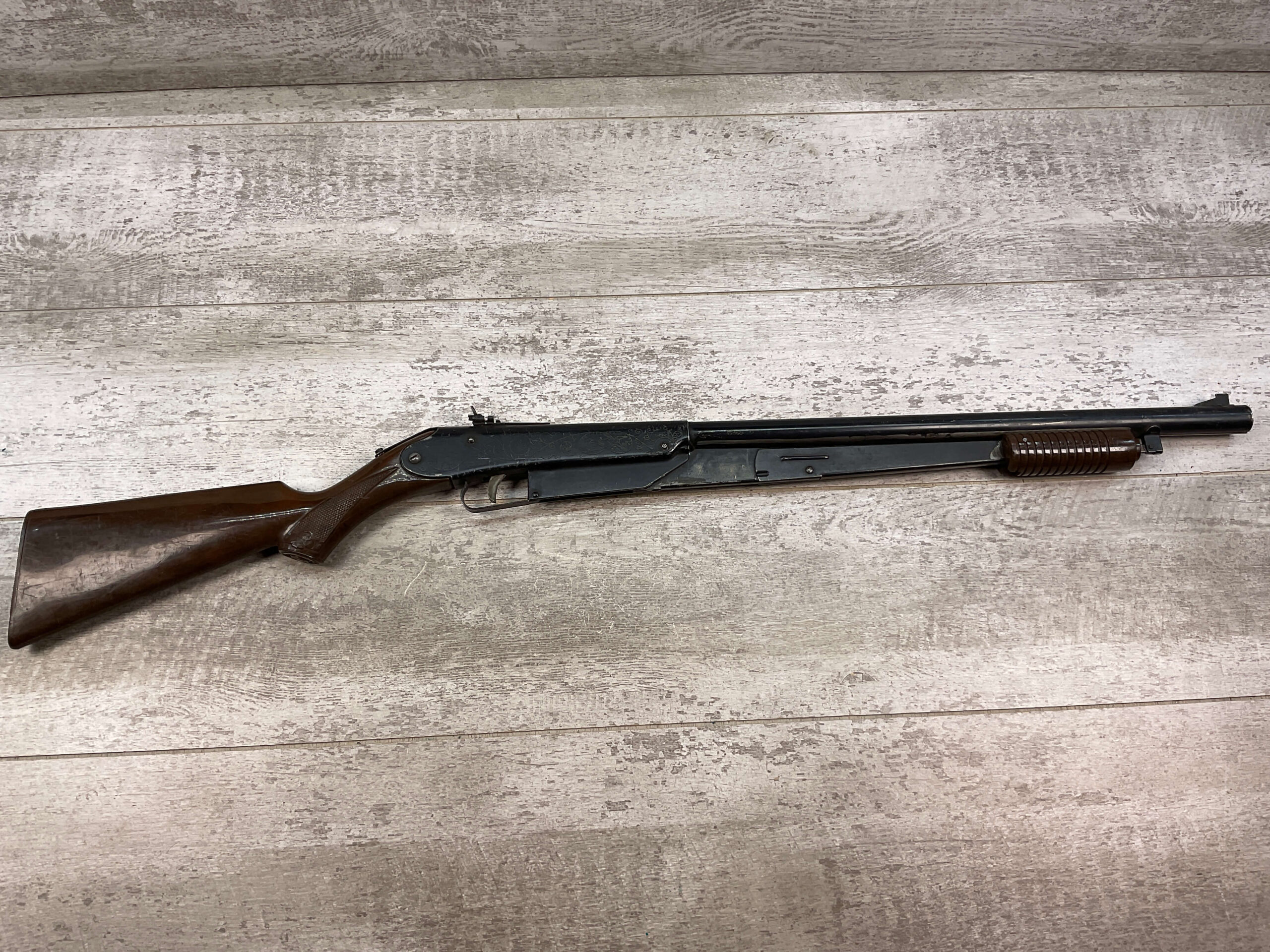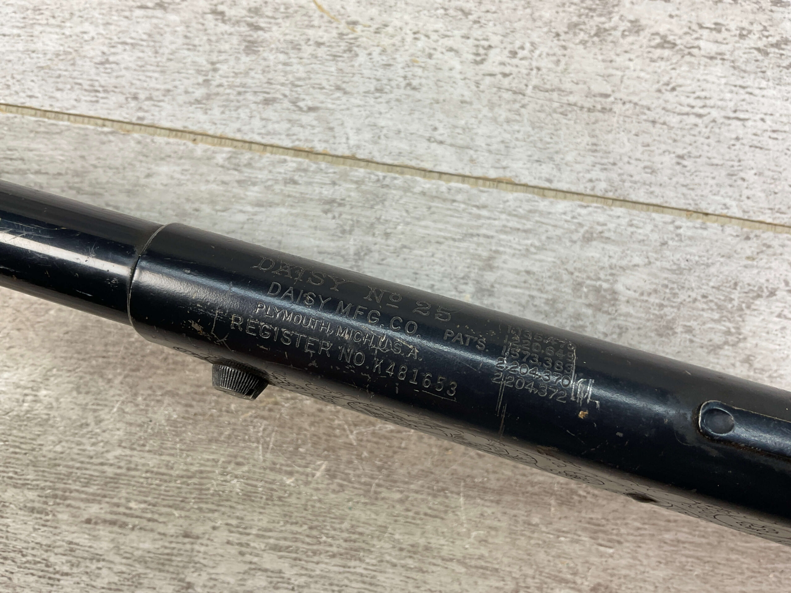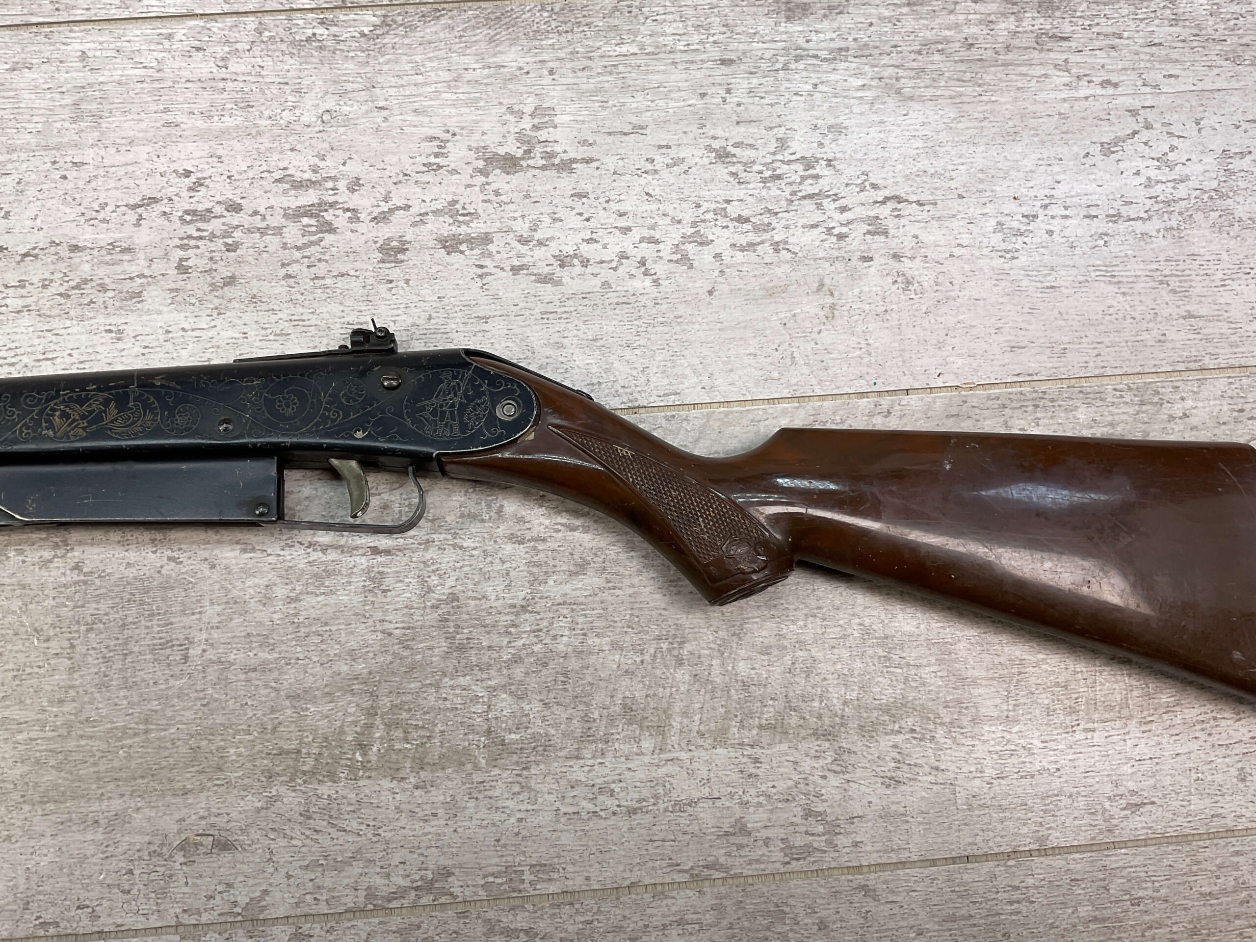 DAISY MODEL NO. 25 ENGRAVED AIR RIFLE, VINTAGE, IN DECENT CONDITION WITH EVIDENT WEAR AND DISCOLORATION, ESPECIALLY ON BARREL, BUT STILL A COOL VINTAGE BB GUN!