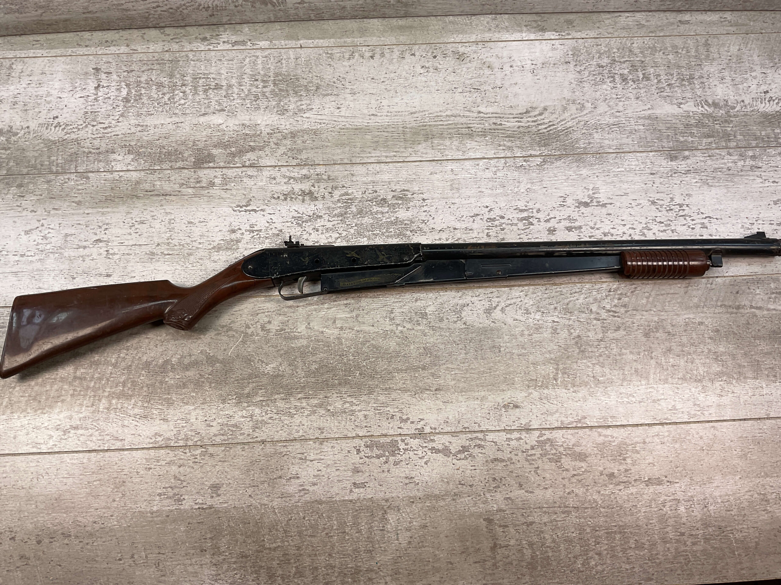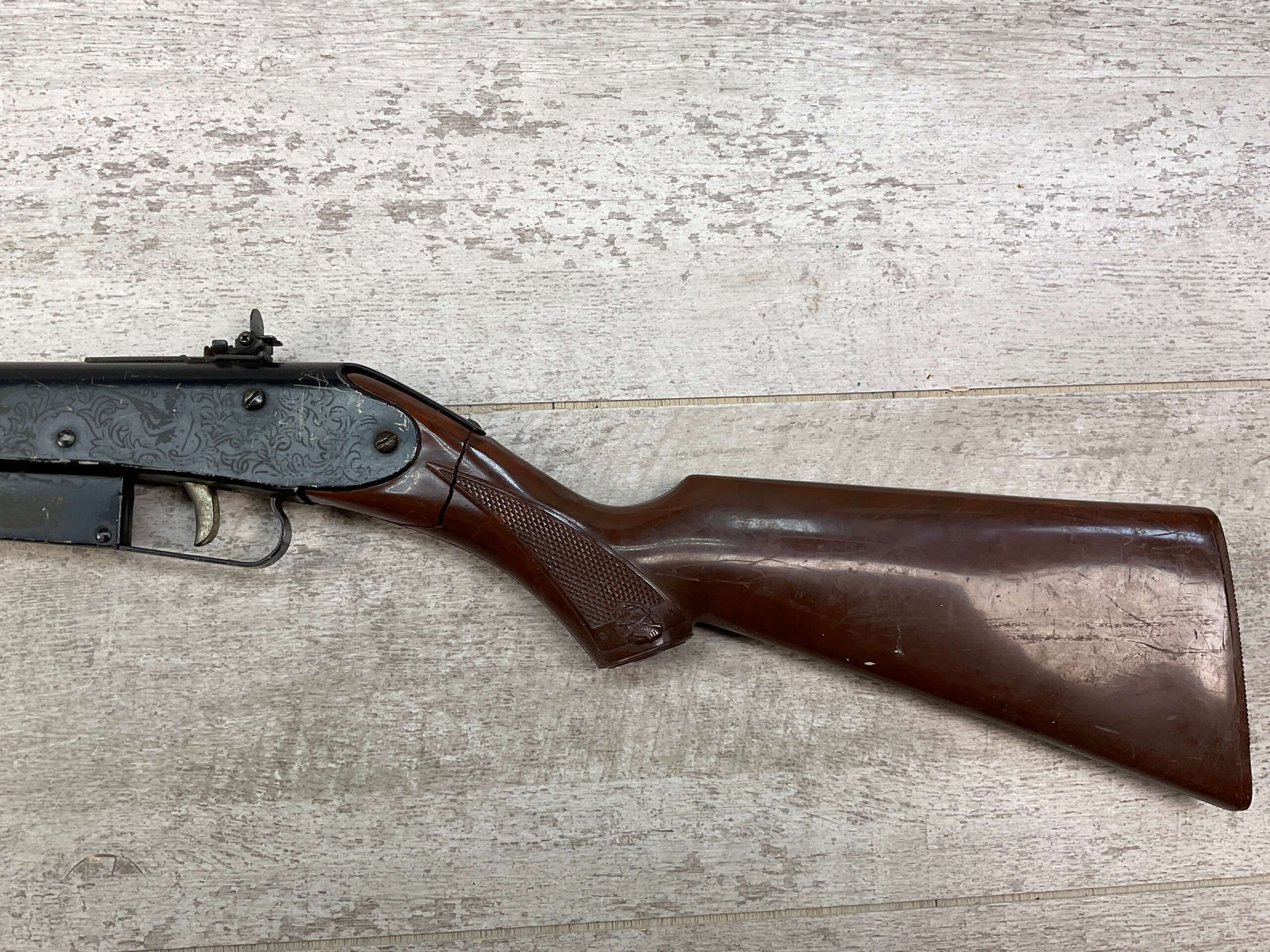 DAISY MODEL NO. 25 ENGRAVED PUMP AIR RIFLE, VINTAGE, IN DECENT CONDITION WITH EVIDENT WEAR AND DISCOLORATION, ESPECIALLY ON BARREL, BUT STILL A COOL VINTAGE BB GUN! HAS A CRACKED PLASTIC STOCK WITH CRACK NEAR TRIGGER GUARD AND CRACK ON TOP OF BARREL. THIS IS GOING TO BE A PARTS GUN.