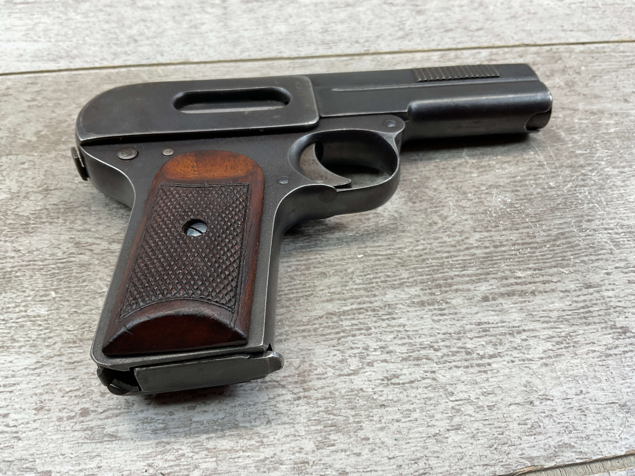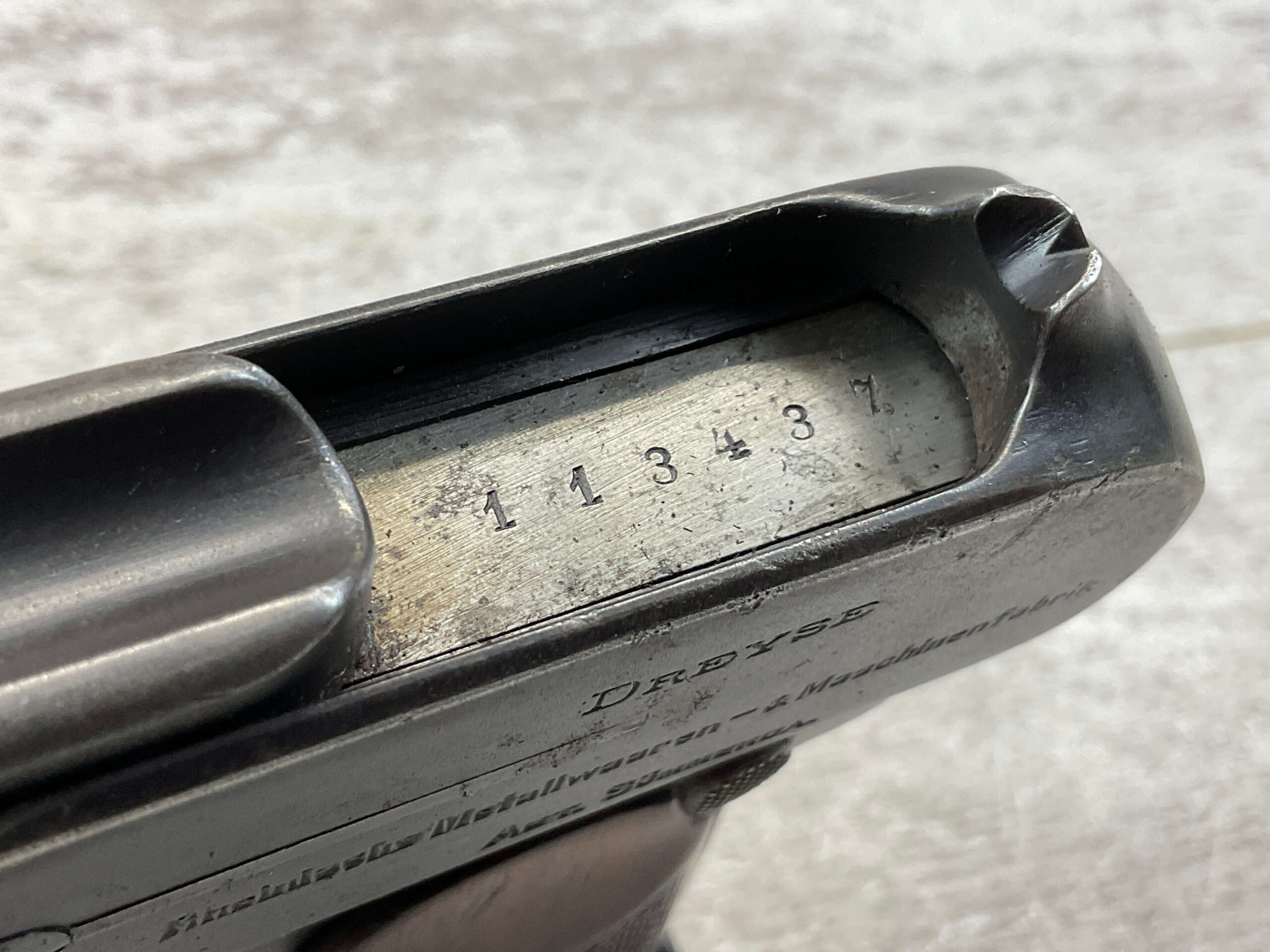 DREYSE M1907 SEMI AUTO PISTOL RIG #113437, 7.65MM/32ACP, EXC ORIGINAL DULL BLUING, MINOR HIGH EDGE WEAR/HOLSTER WEAR, WALNUT CHECKERED GRIPS, DARK BORE W/FROSTING THROUGHOUT, BLADE FRONT SIGHT, NOTCH REAR SIGHT, LANYARD LOOP, EXC MECHANICALLY, VG-EXC BLACK HOLSTER W/SPARE MAGAZINE, HOLSTER SHOWS AGE BUT IS STILL IN VERY GOOD CONDITION & MARKED “KERNKLAGER & CO/1938/BERLIN/EAGLE”, GREAT RIG