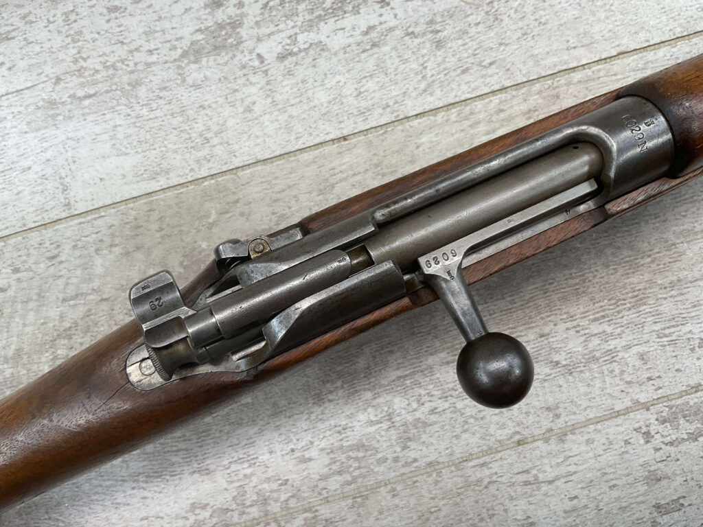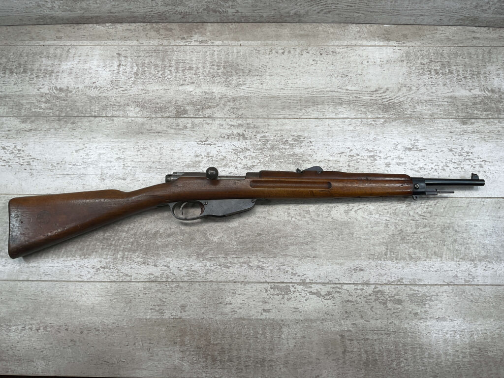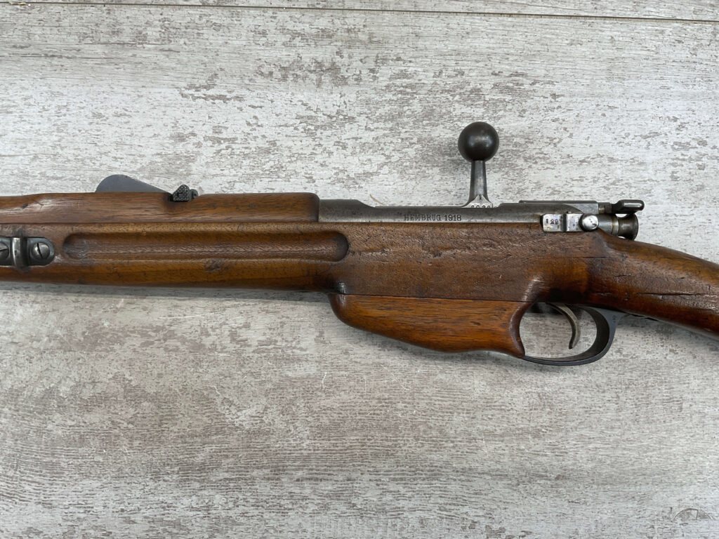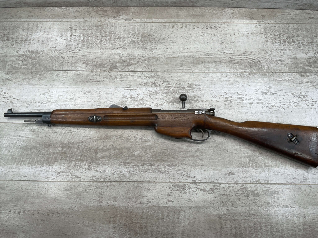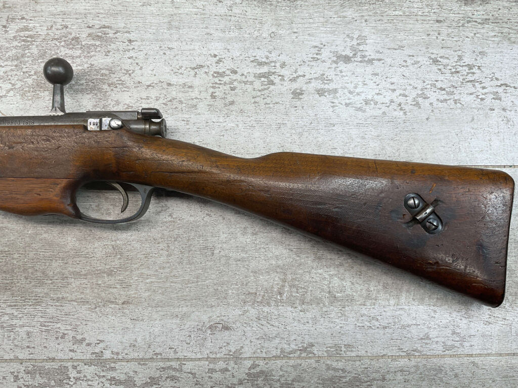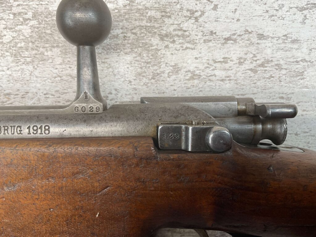 DUTCH #4 BICYCLE MODEL 1895 HEMBRUG CAVALRY CARBINE, RARE, #6029N, 1918 MFR, ALL MATCHING, EXC STOCK W/TYPICAL DINGS/NICKS, RECEIVER IS “IN THE WHITE”, VG-EXC BRIGHT BORE W/LIGHT FROSTING IN THE GROOVES AND EXC RIFLING, ORIGINAL CLEANING ROD, NO IMPORT MARKS, PROPER PROOF MARKS THROUGHOUT, 85+% OVERALL AND RARE IN THIS CONDITION!