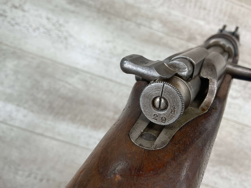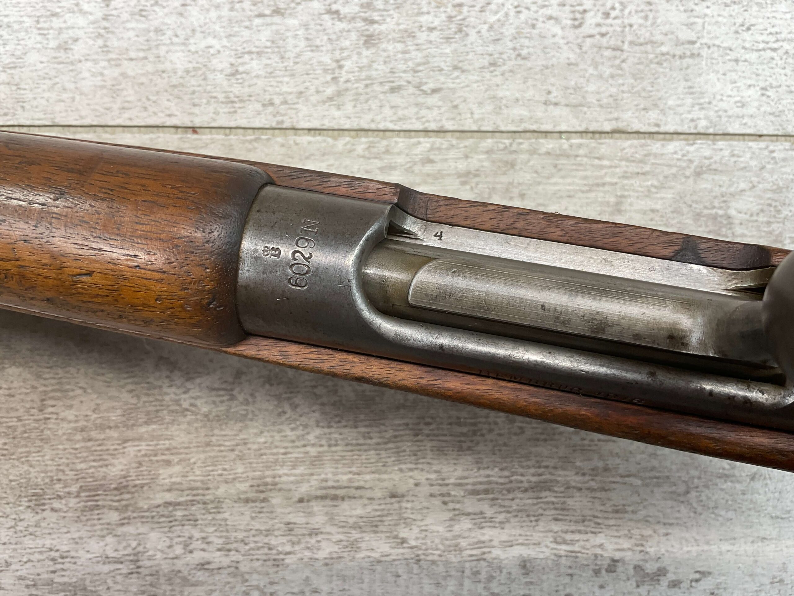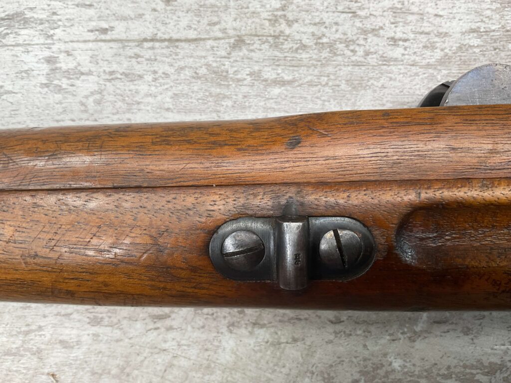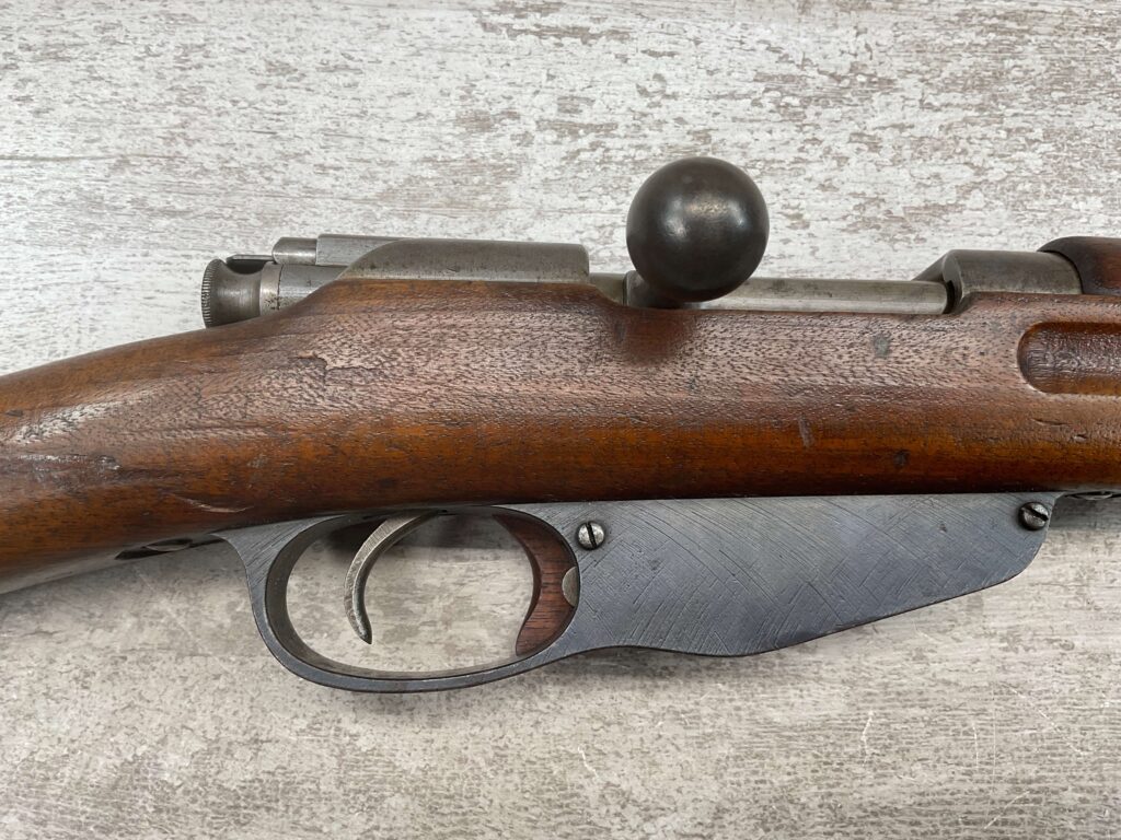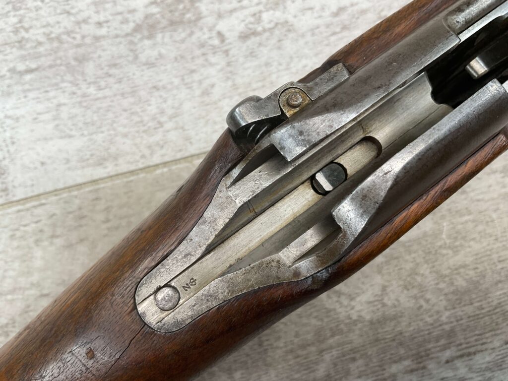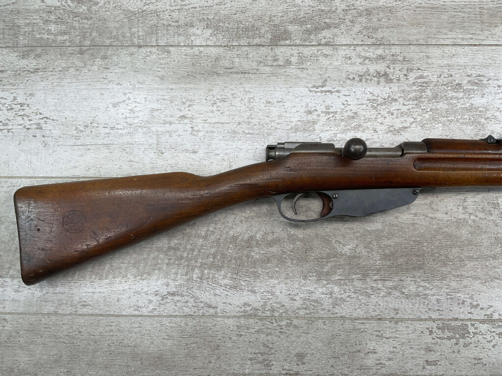 DUTCH #4 BICYCLE MODEL 1895 HEMBRUG CAVALRY CARBINE, RARE, #6029N, 1918 MFR, ALL MATCHING, EXC STOCK W/TYPICAL DINGS/NICKS, RECEIVER IS “IN THE WHITE”, VG-EXC BRIGHT BORE W/LIGHT FROSTING IN THE GROOVES AND EXC RIFLING, ORIGINAL CLEANING ROD, NO IMPORT MARKS, PROPER PROOF MARKS THROUGHOUT, 85+% OVERALL AND RARE IN THIS CONDITION!