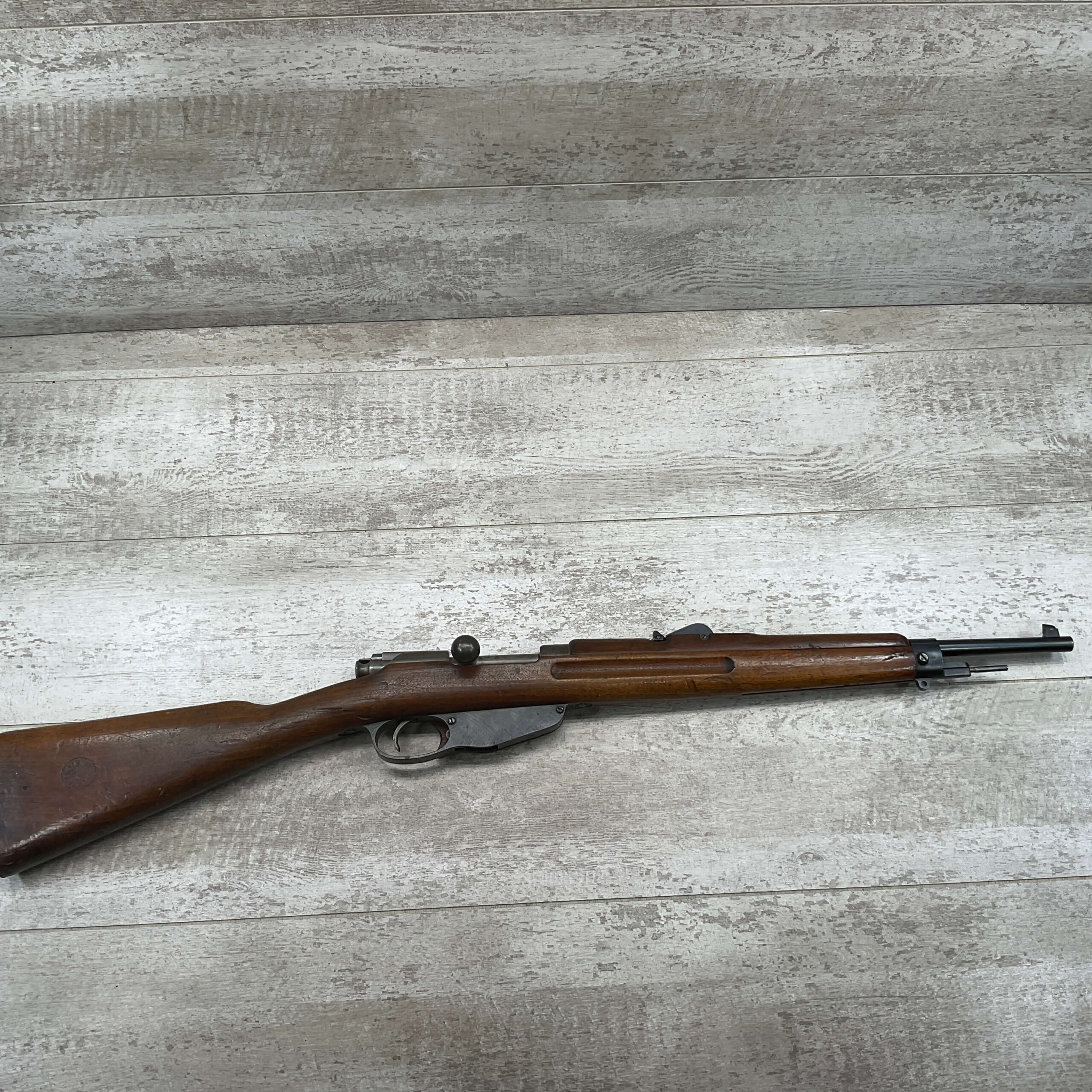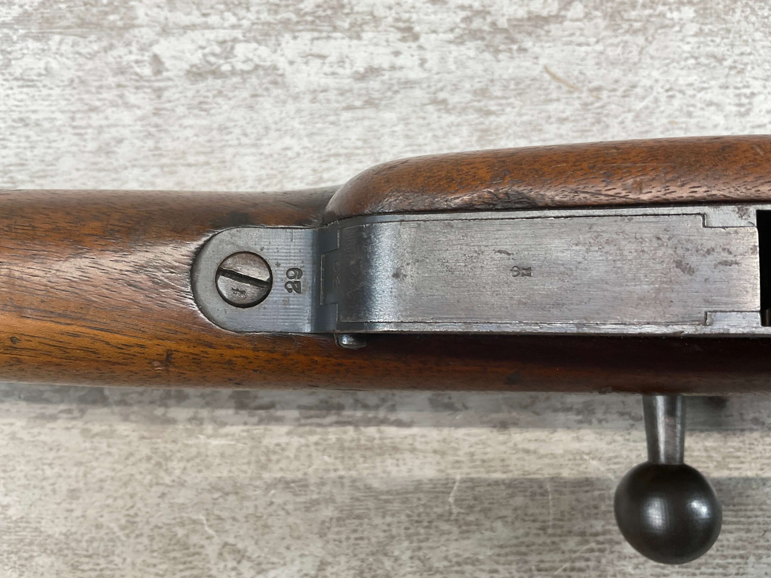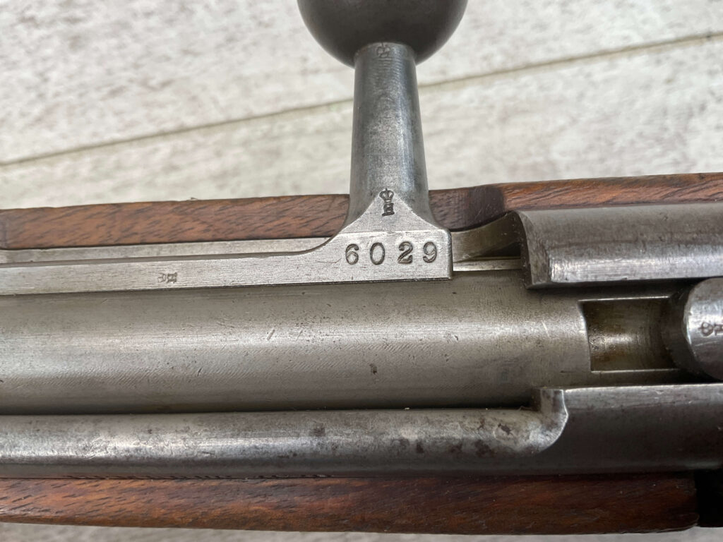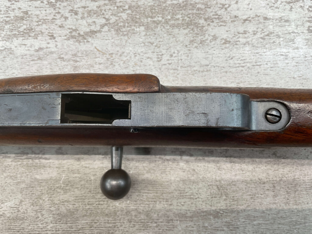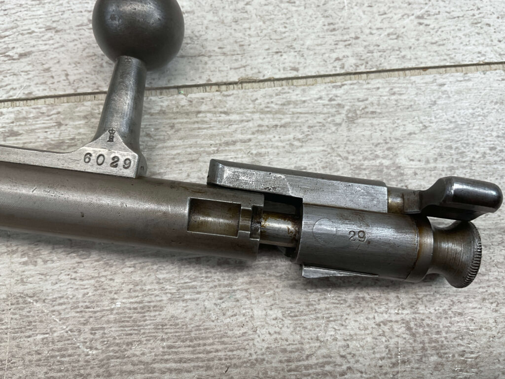 DUTCH #4 BICYCLE MODEL 1895 HEMBRUG CAVALRY CARBINE, RARE, #6029N, 1918 MFR, ALL MATCHING, EXC STOCK W/TYPICAL DINGS/NICKS, RECEIVER IS “IN THE WHITE”, VG-EXC BRIGHT BORE W/LIGHT FROSTING IN THE GROOVES AND EXC RIFLING, ORIGINAL CLEANING ROD, NO IMPORT MARKS, PROPER PROOF MARKS THROUGHOUT, 85+% OVERALL AND RARE IN THIS CONDITION!