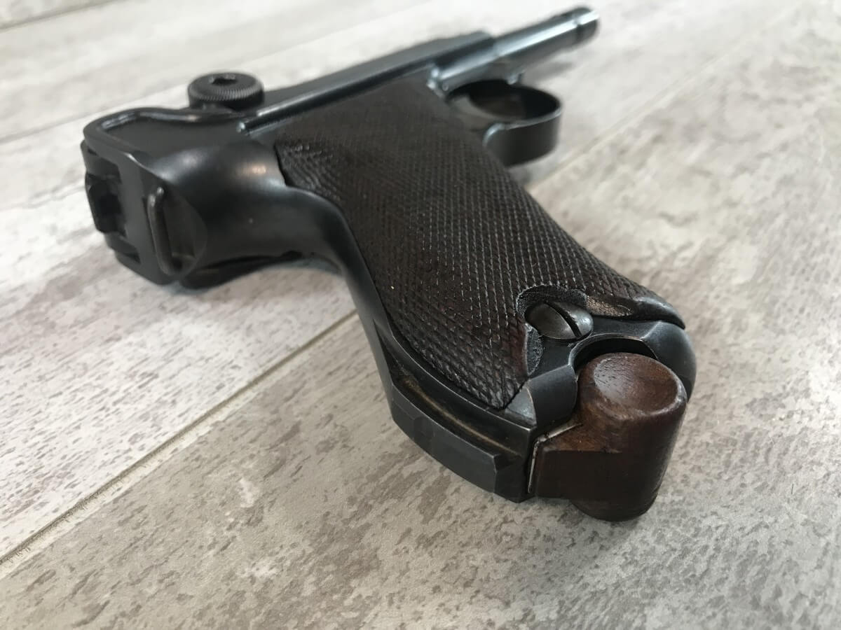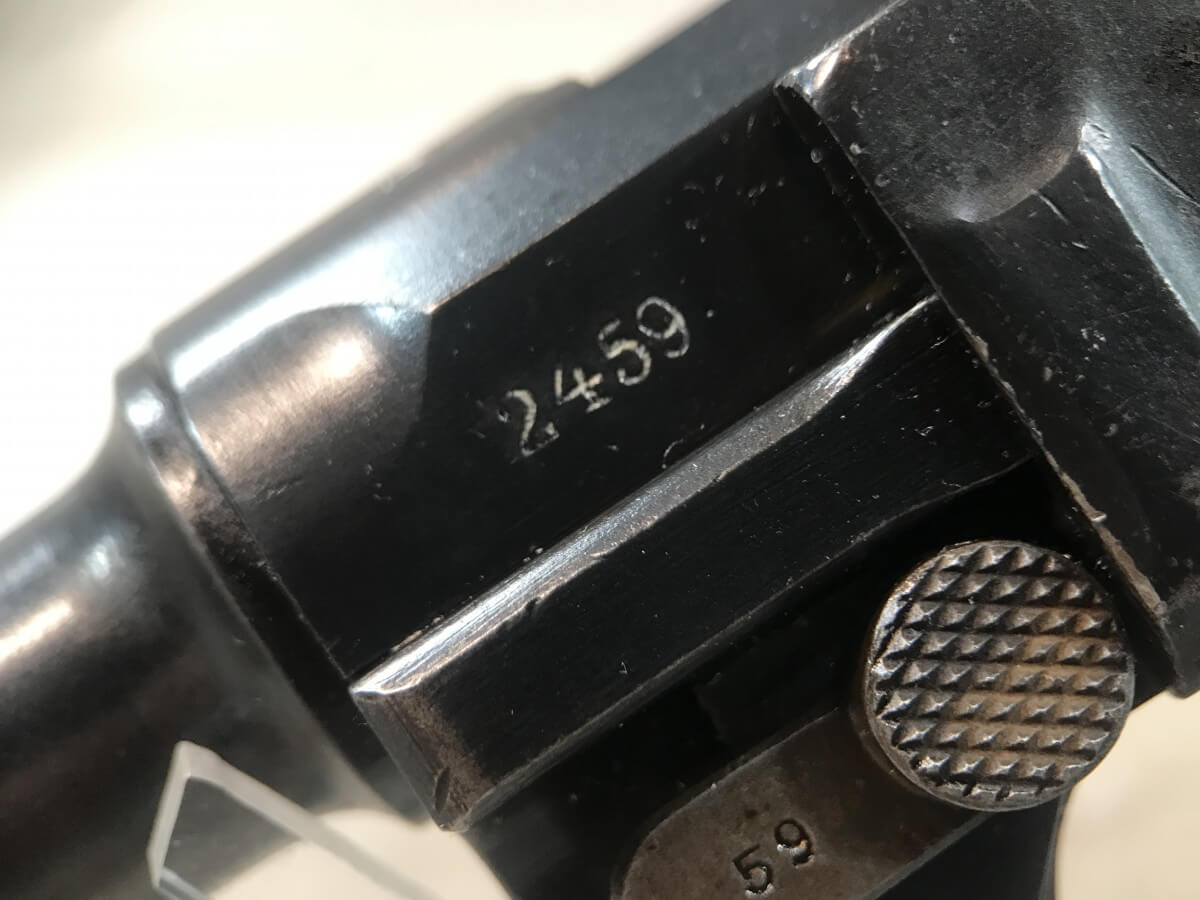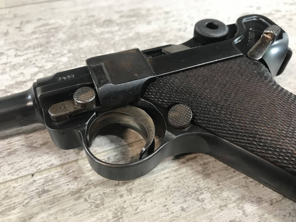 SKU#149 DWM 1916 LUGER P08 4″ 9MM #2459, WWI TROPHY, EVERYTHING MATCHING, EXC BRIGHT BORE, EXC MATCHING CHECKERED GRIPS W/SAFETY CHIP ON LEFT GRIP, “7227” MARKED WOOD BASED MAG, ORIGINAL FINISH, 90+% STRAW, 95+% OVERALL