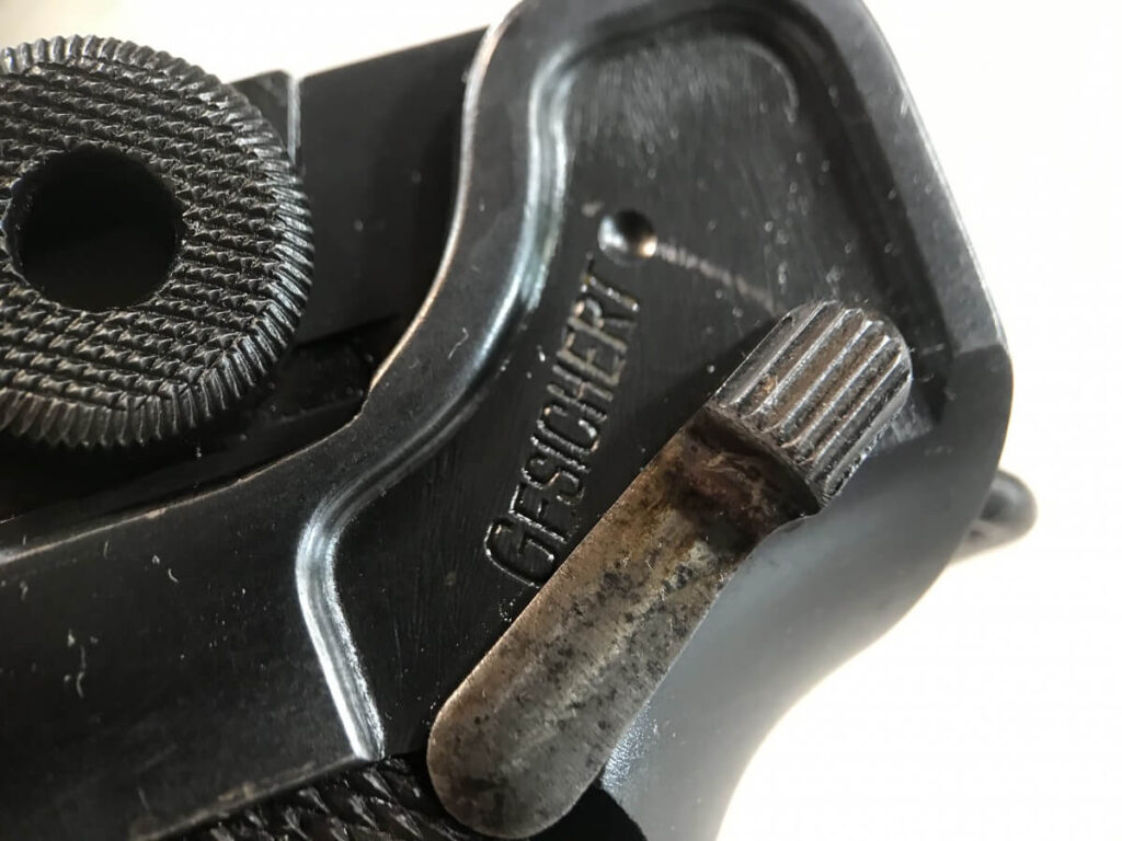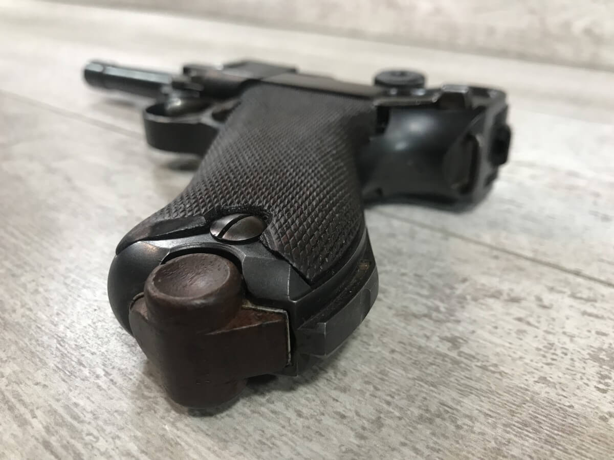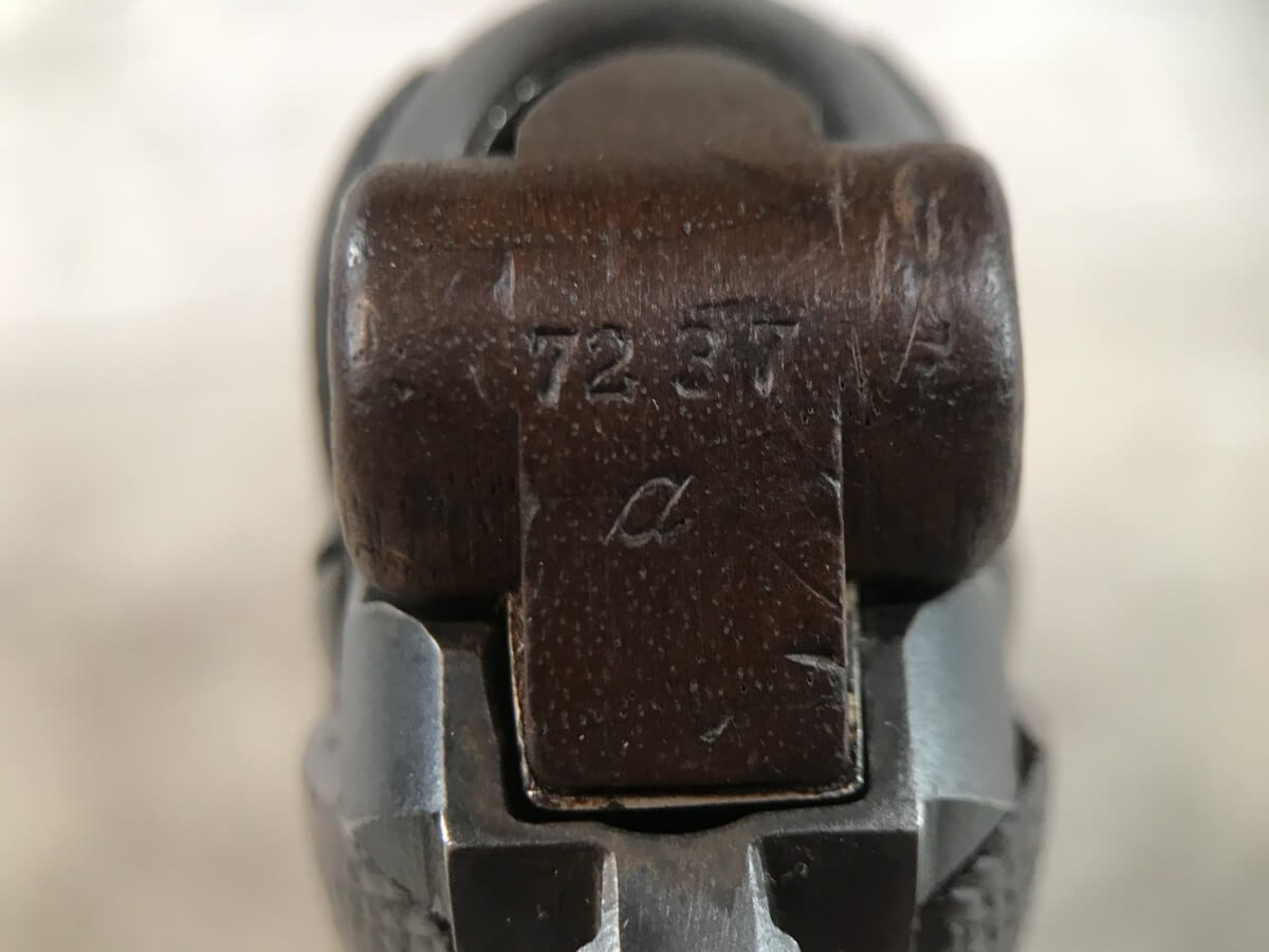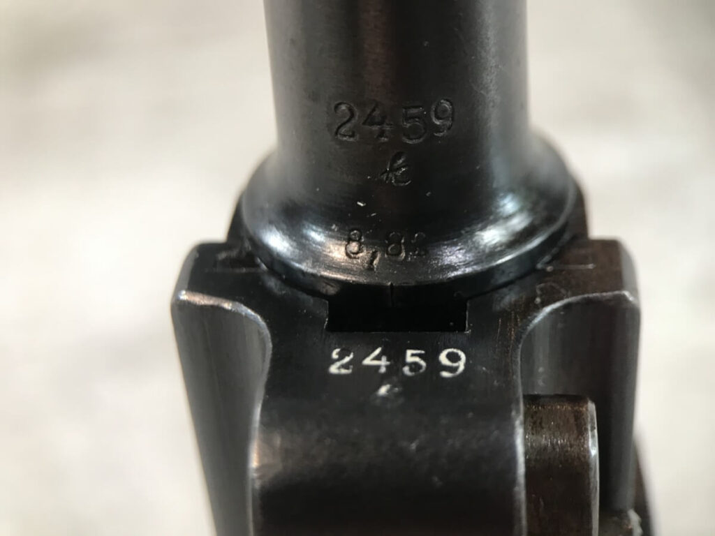 SKU#149 DWM 1916 LUGER P08 4″ 9MM #2459, WWI TROPHY, EVERYTHING MATCHING, EXC BRIGHT BORE, EXC MATCHING CHECKERED GRIPS W/SAFETY CHIP ON LEFT GRIP, “7227” MARKED WOOD BASED MAG, ORIGINAL FINISH, 90+% STRAW, 95+% OVERALL