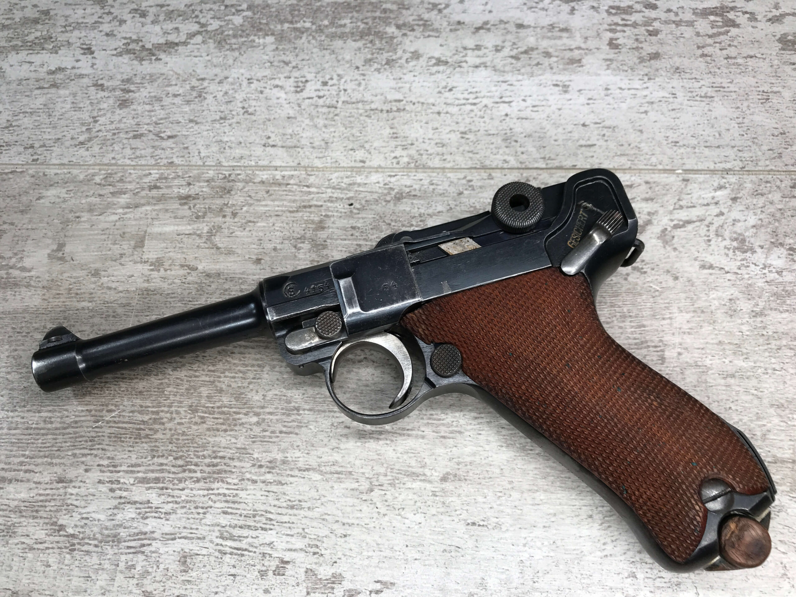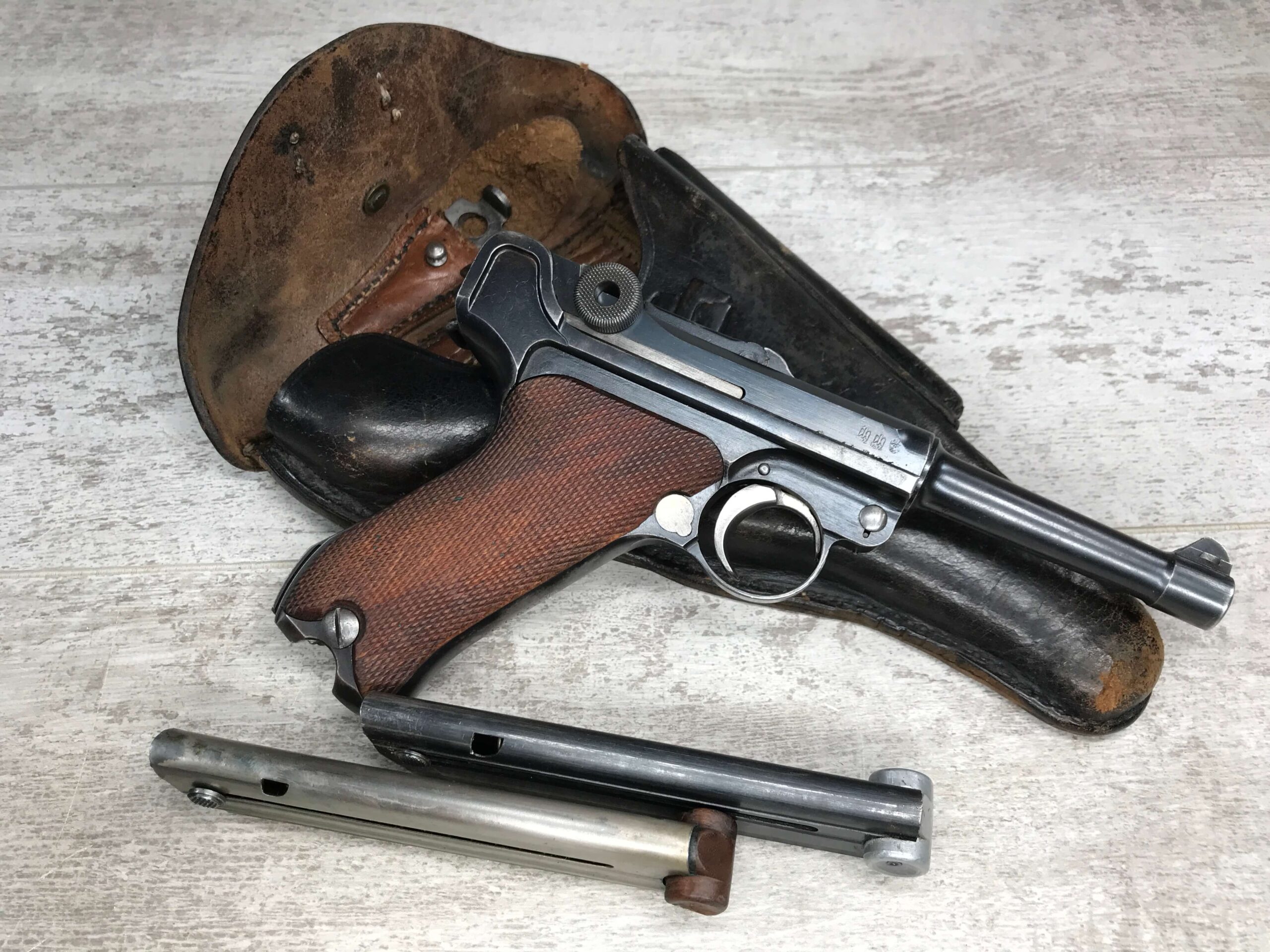 SKU#050 DWM 1921 LUGER P08 POLICE #4154a, MATCHING W/POLICE HOLSTER, TOOL & EXTRA MAG #5441, WaA6 & DOVE PROOF, REICHSWEHR PROPERTY DATED 1920, GRIP STRAP PROPERTY MARK “Ma.500.” & “500.” ON FRAME BACK, LARGE CIRCLE-S ON SLIDE LEFT, EXC. BORE, SEAR SAFETY, 95%