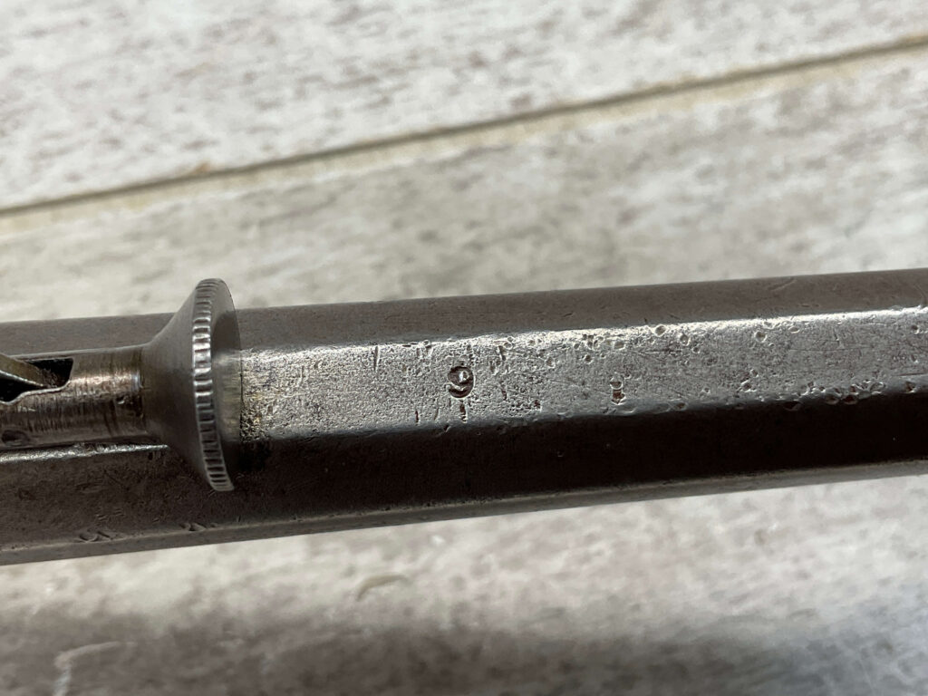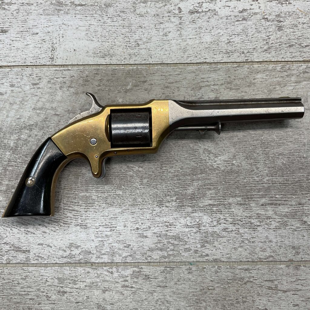 E.A. PRESCOTT BELT MODEL .32RF REVOLVER, CIVIL WAR ERA, ANTIQUE #6, 5″ OCTAGON BARREL, BRASS FRAME, STEEL GRAY CYLINDER & BARREL W/ LIGHT PITTING IN AREAS, “E.A. PRESCOTT WORCESTER MASS. / PAT OCT.2, 1860” ON LEFT SIDE OF BARREL, MATCHING SMOOTH WALNUT GRIPS W/ LIGHT HANDLING MARKS & A SMALL PIECE MISSING ON BACK OF RIGHT GRIP, MECHANICALLY SOUND, BORE IS DARKER W/ LIGHT FROSTING & VG RIFLING, NOT A REPRODUCTION, OVERALL CONDITION AS SEEN IN PHOTOS!!