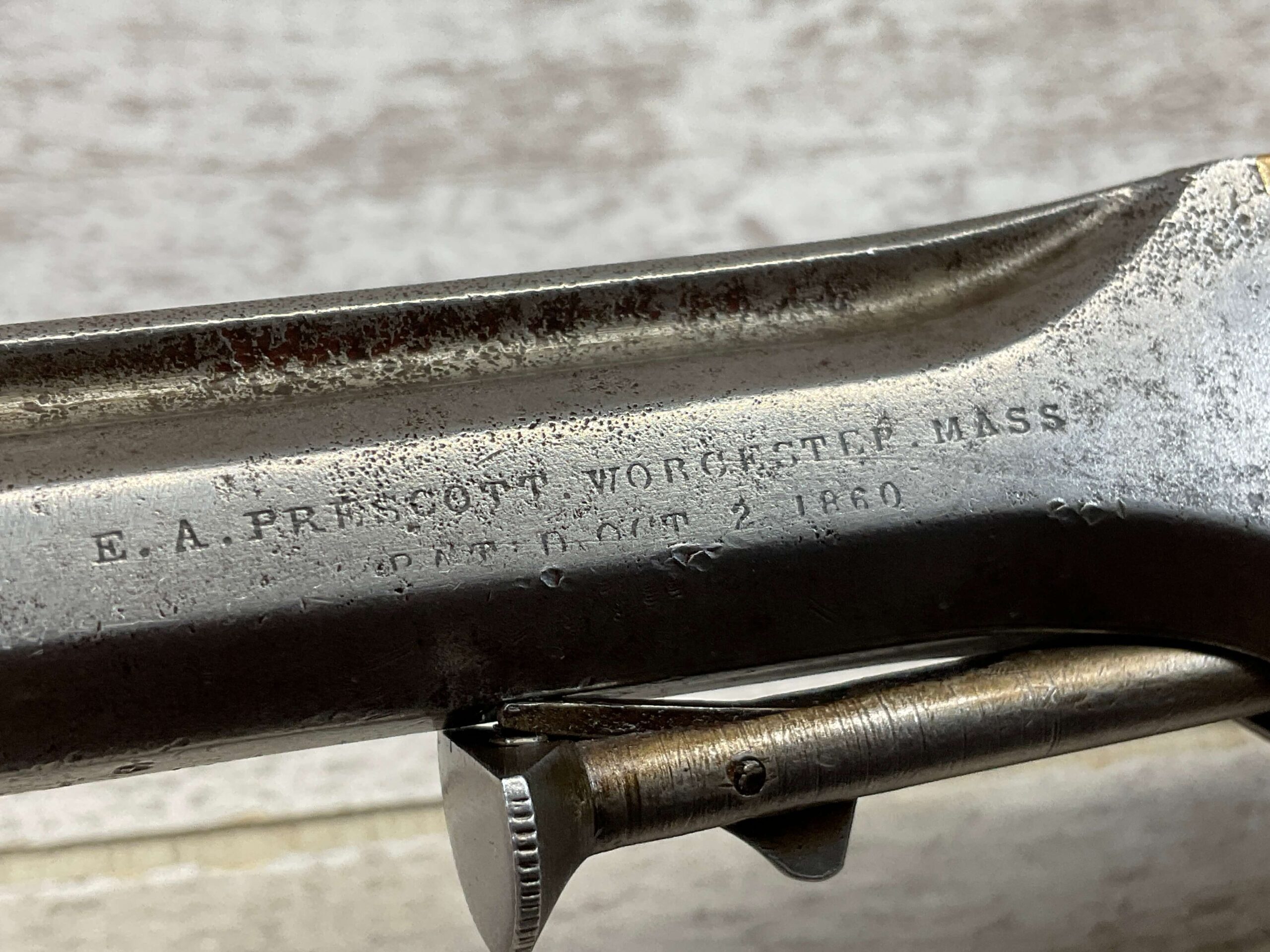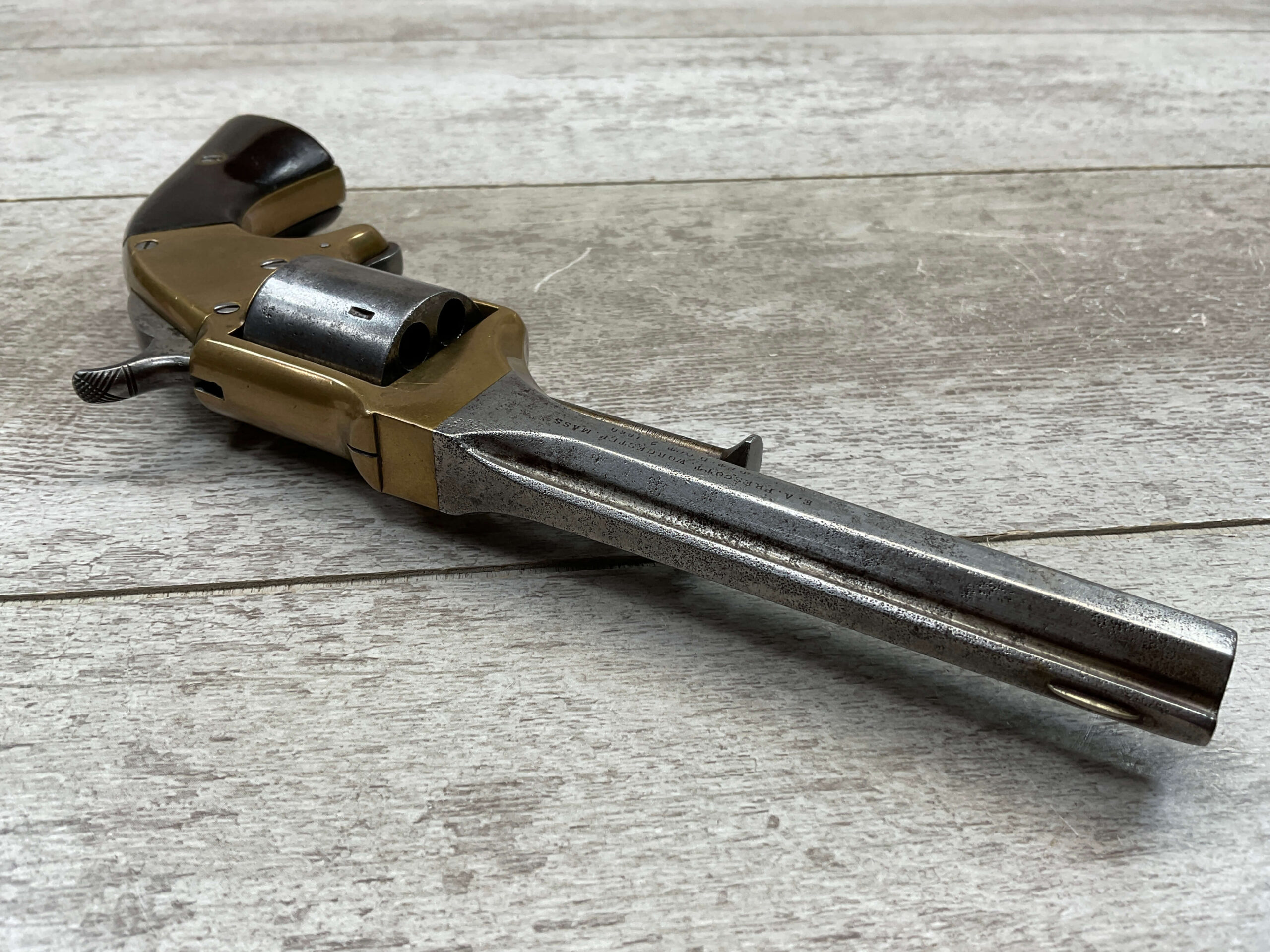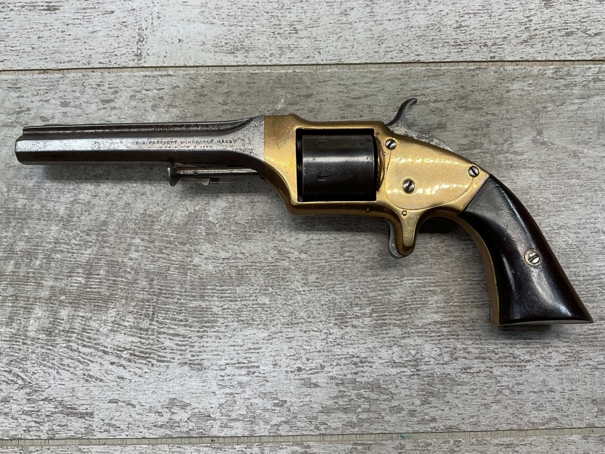 E.A. PRESCOTT BELT MODEL .32RF REVOLVER, CIVIL WAR ERA, ANTIQUE #6, 5″ OCTAGON BARREL, BRASS FRAME, STEEL GRAY CYLINDER & BARREL W/ LIGHT PITTING IN AREAS, “E.A. PRESCOTT WORCESTER MASS. / PAT OCT.2, 1860” ON LEFT SIDE OF BARREL, MATCHING SMOOTH WALNUT GRIPS W/ LIGHT HANDLING MARKS & A SMALL PIECE MISSING ON BACK OF RIGHT GRIP, MECHANICALLY SOUND, BORE IS DARKER W/ LIGHT FROSTING & VG RIFLING, NOT A REPRODUCTION, OVERALL CONDITION AS SEEN IN PHOTOS!!
