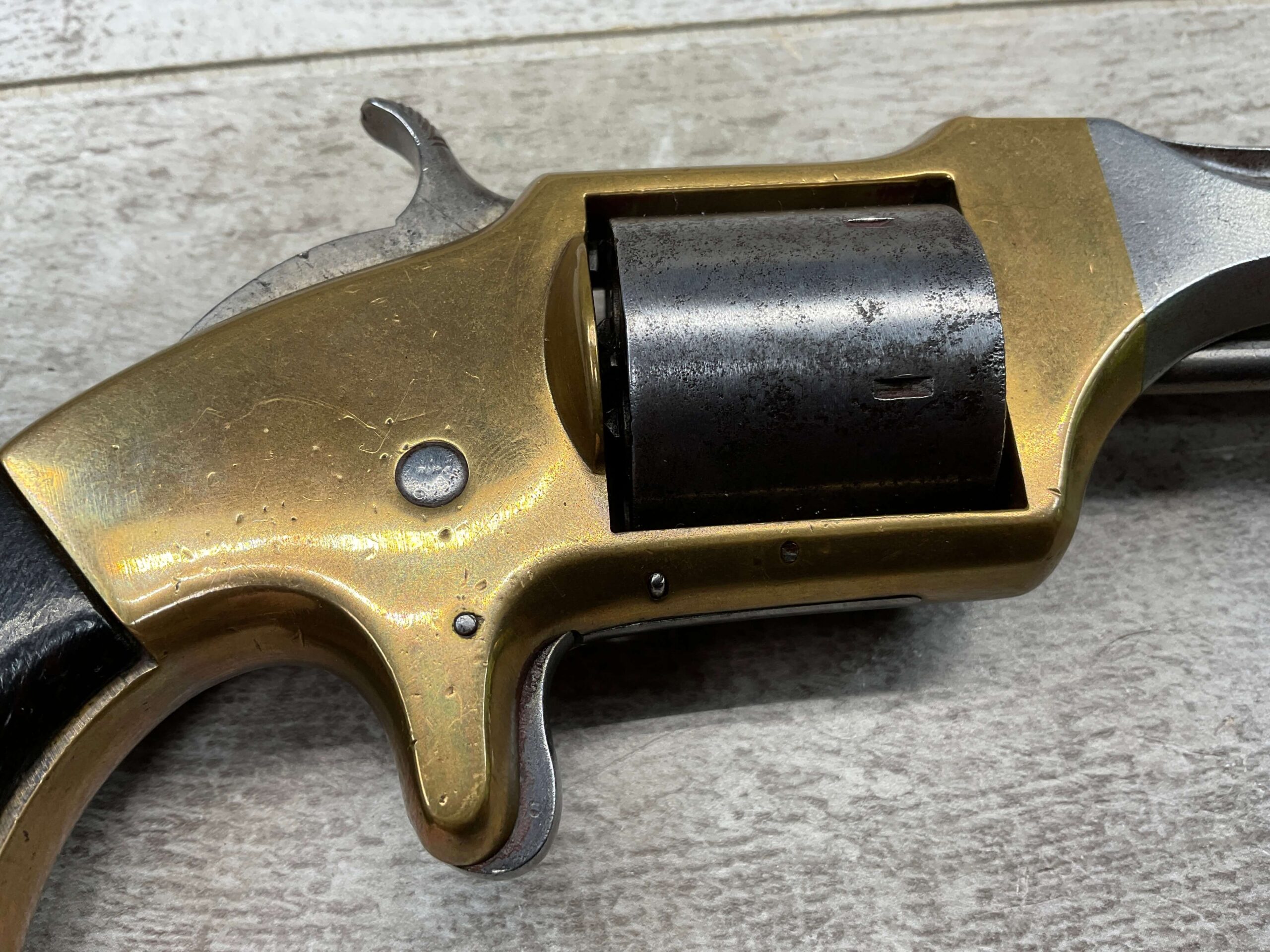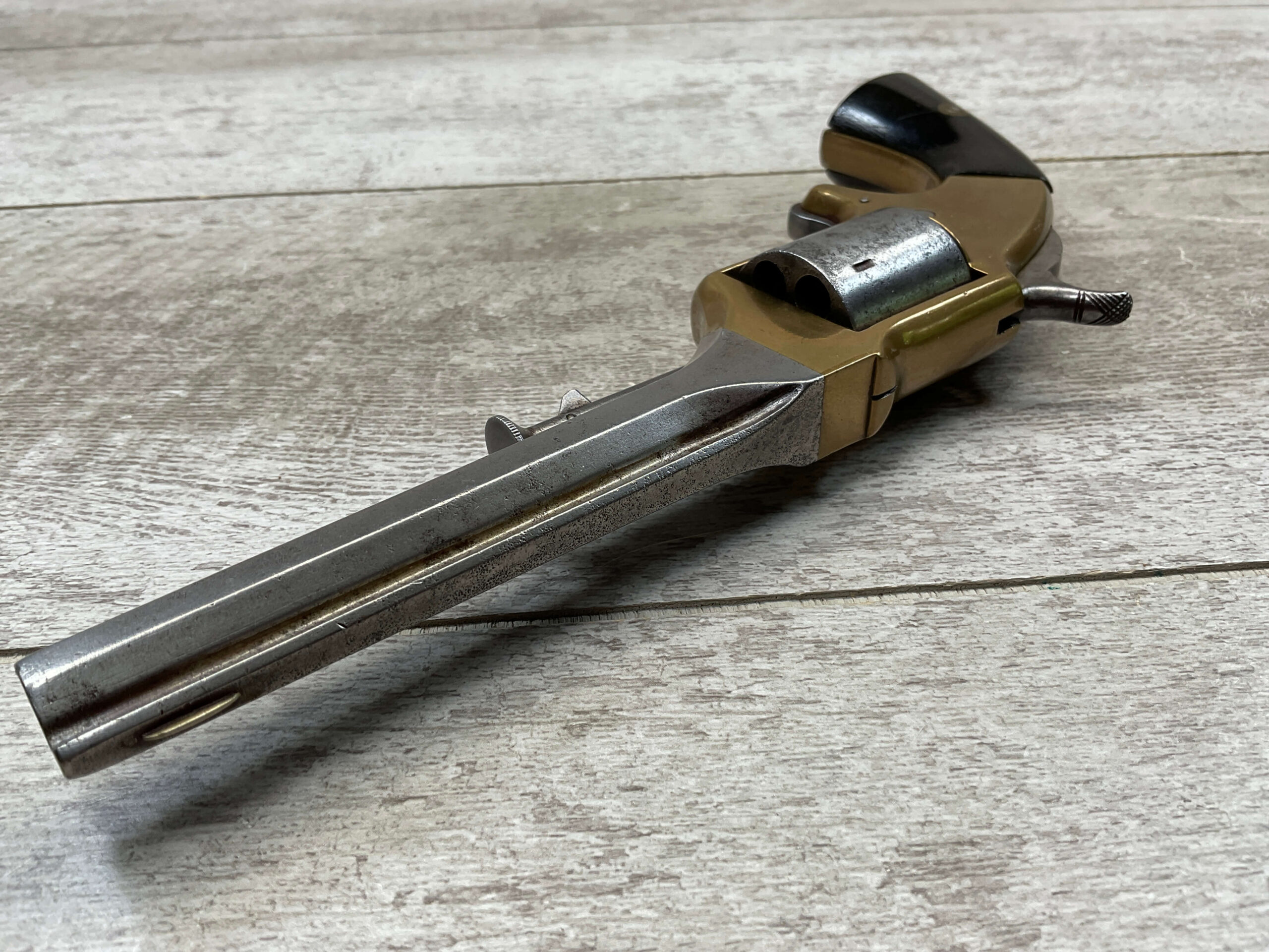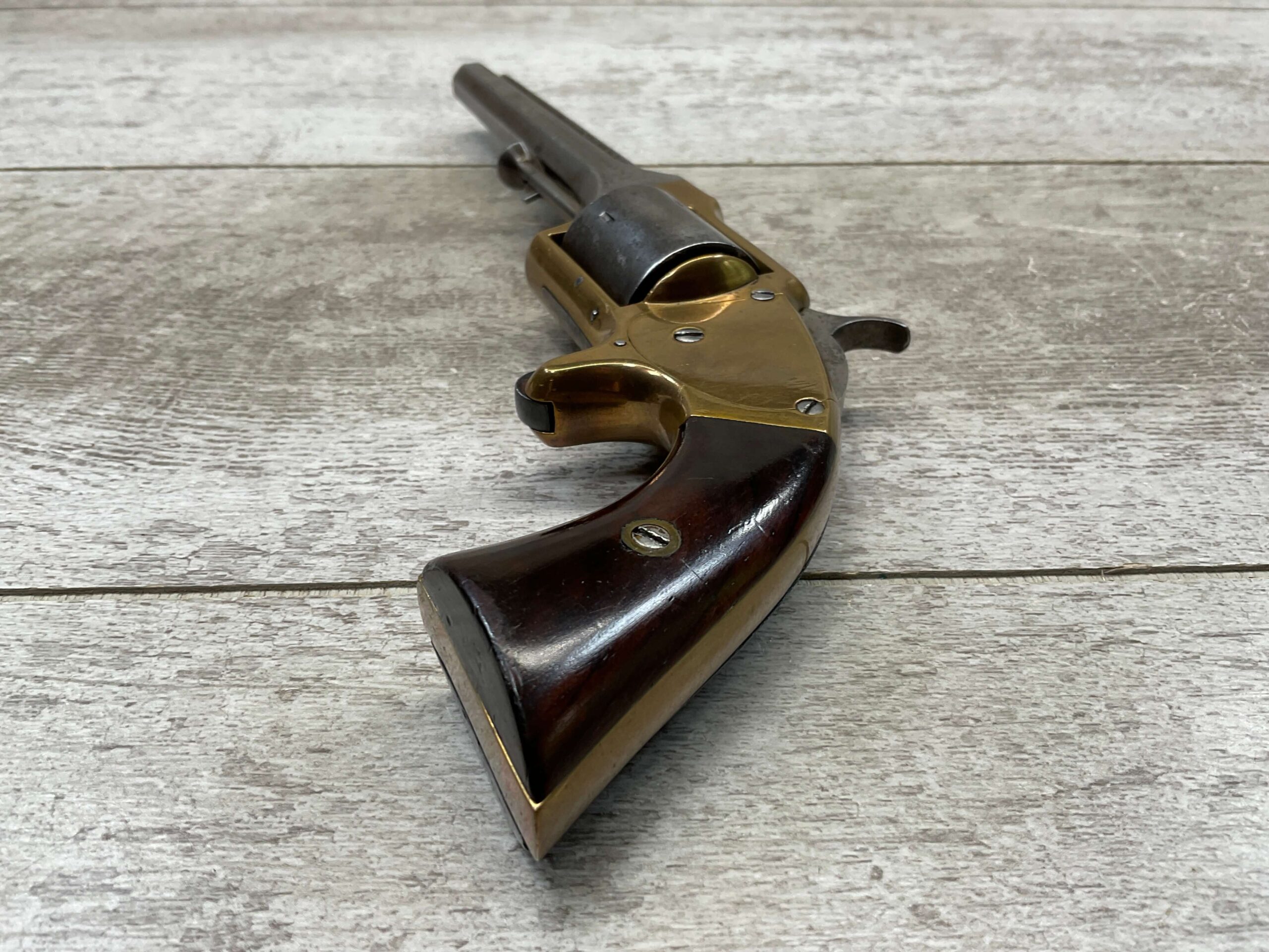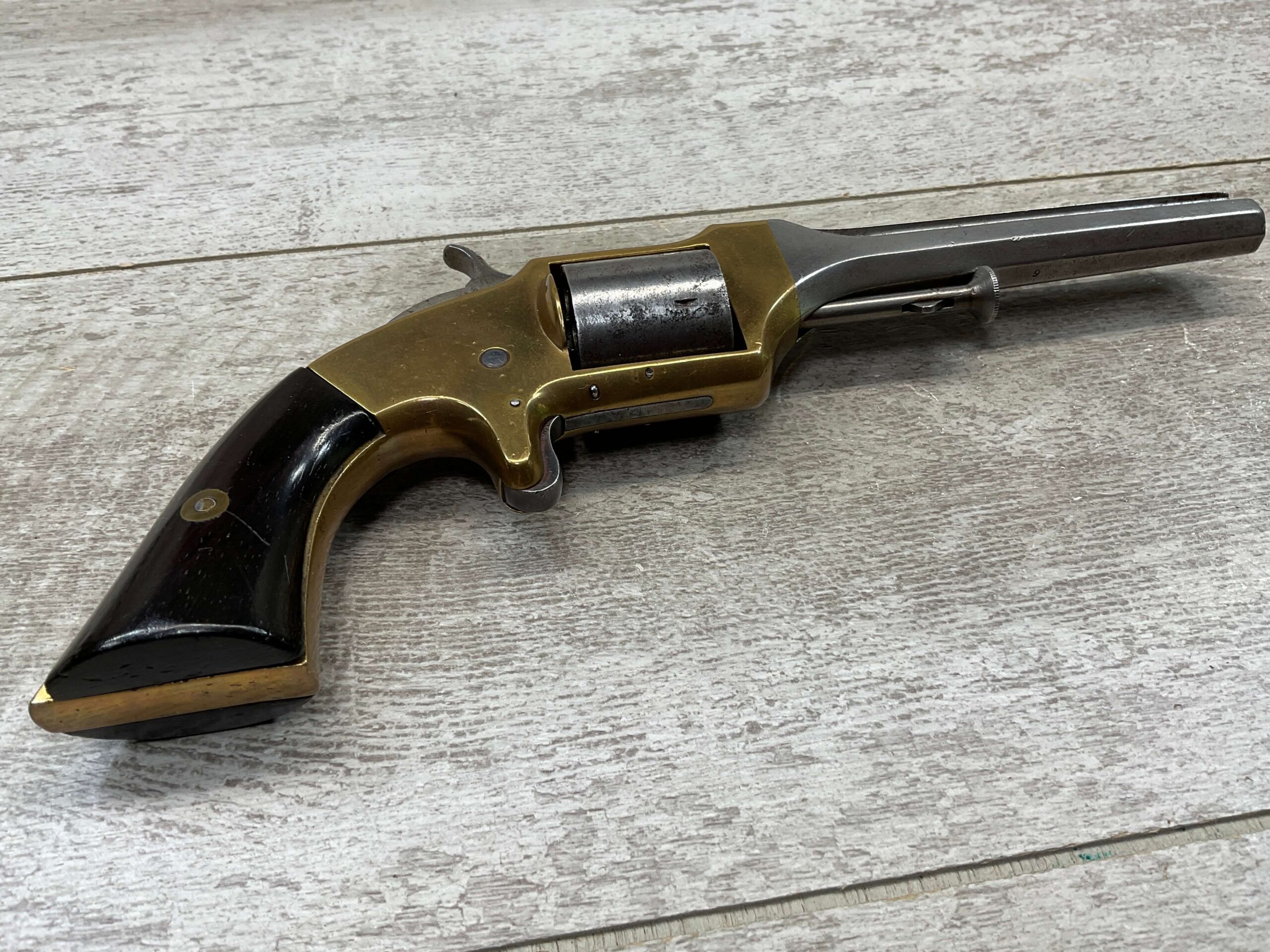 E.A. PRESCOTT BELT MODEL .32RF REVOLVER, CIVIL WAR ERA, ANTIQUE #6, 5″ OCTAGON BARREL, BRASS FRAME, STEEL GRAY CYLINDER & BARREL W/ LIGHT PITTING IN AREAS, “E.A. PRESCOTT WORCESTER MASS. / PAT OCT.2, 1860” ON LEFT SIDE OF BARREL, MATCHING SMOOTH WALNUT GRIPS W/ LIGHT HANDLING MARKS & A SMALL PIECE MISSING ON BACK OF RIGHT GRIP, MECHANICALLY SOUND, BORE IS DARKER W/ LIGHT FROSTING & VG RIFLING, NOT A REPRODUCTION, OVERALL CONDITION AS SEEN IN PHOTOS!!