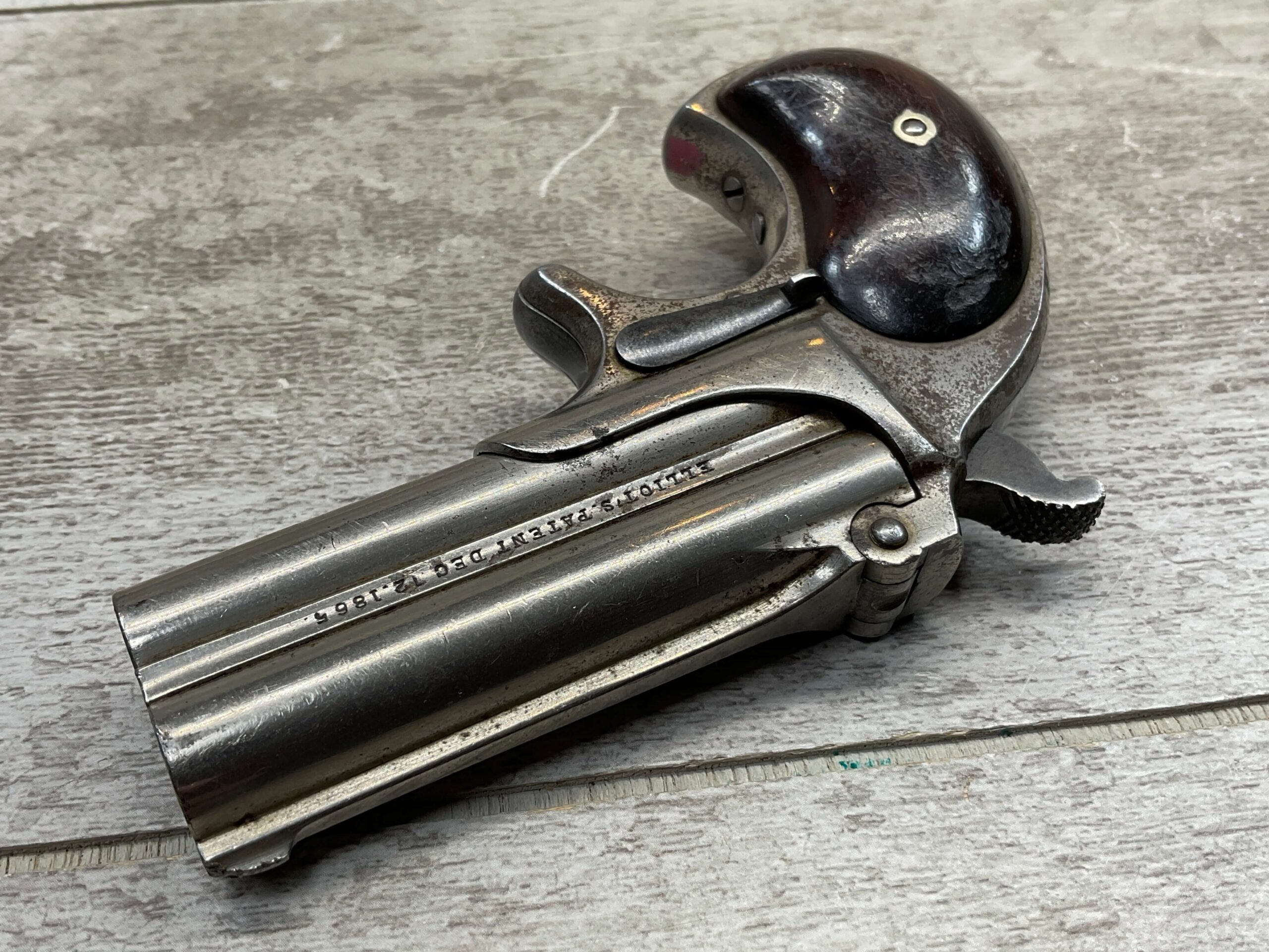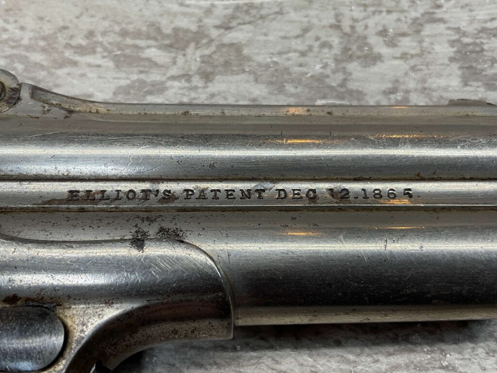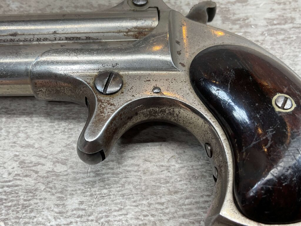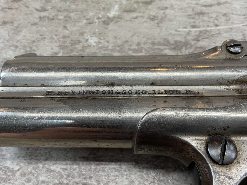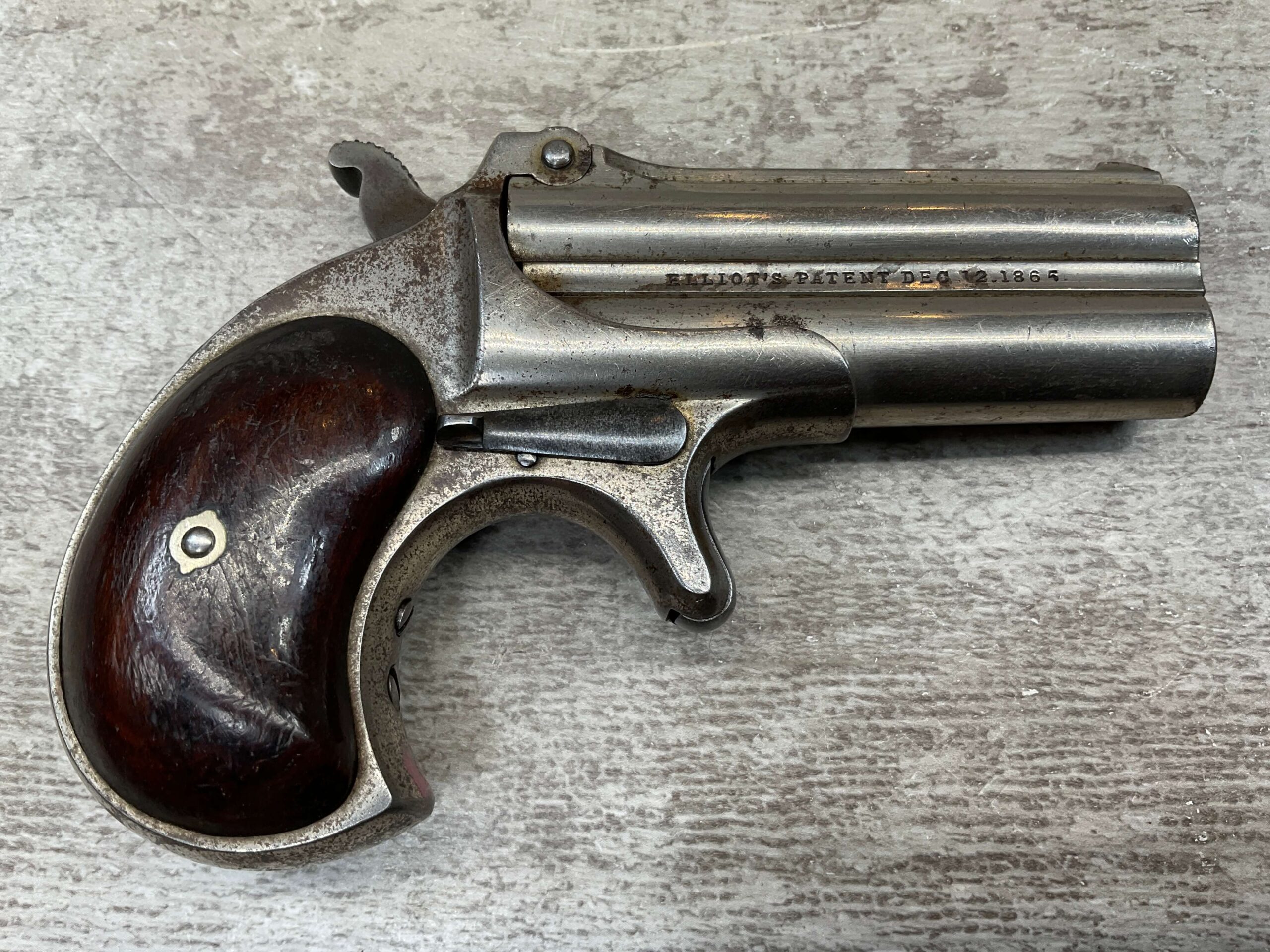 ELLIOT REMINGTON TYPE 1 NO 1 .41RF O/U DERRINGER, ANTIQUE #694, 3″ DOUBLE BARREL, 80% ORIGINAL NICKEL PLATING, EXC SMOOTH WALNUT GRIPS (UNMARKED), DARKER BORE W/ LIGHT FROSTING IN AREAS & VG RIFLING, “ELLIOT’S PATENT DEC 12. 1865” ON RIGHT SIDE OF BARREL, “E. REMINGTON&SONS.ILION.N.Y.” ON LEFT SIDE, SPUR TRIGGER, MATCHING NUMBERS ON UNDERSIDE OF BARREL & THE RIGHT SIDE OF THE FRAME UNDER THE GRIP, LESS THAN 2000 OF THIS EARLY VARIANT ARE BELIEVED TO HAVE BEEN MADE, BLADE FRONT & NOTCHED REAR SIGHTS, NOT A REPRODUCTION, OVERALL CONDITION AS SEEN IN PHOTOS!!