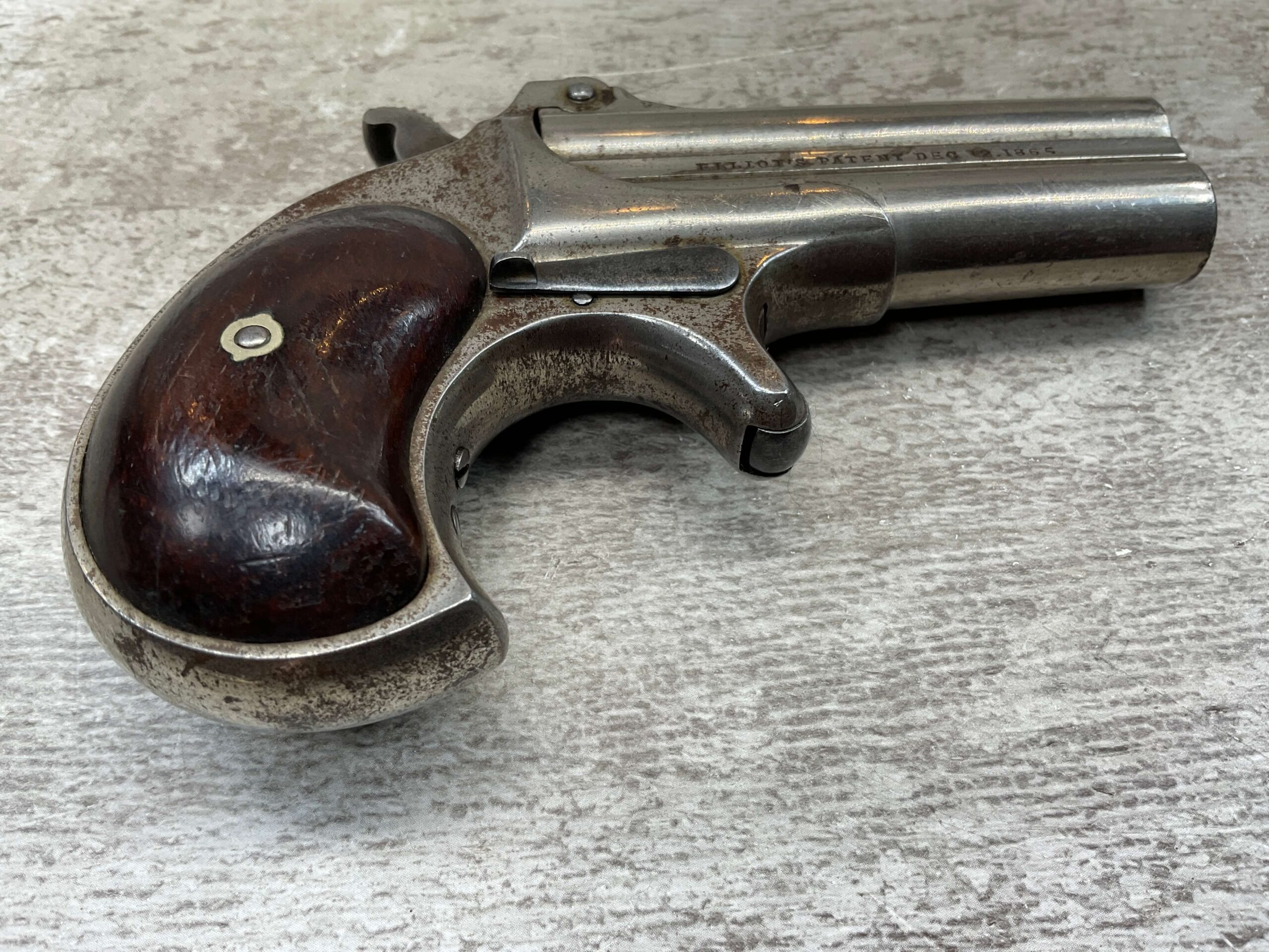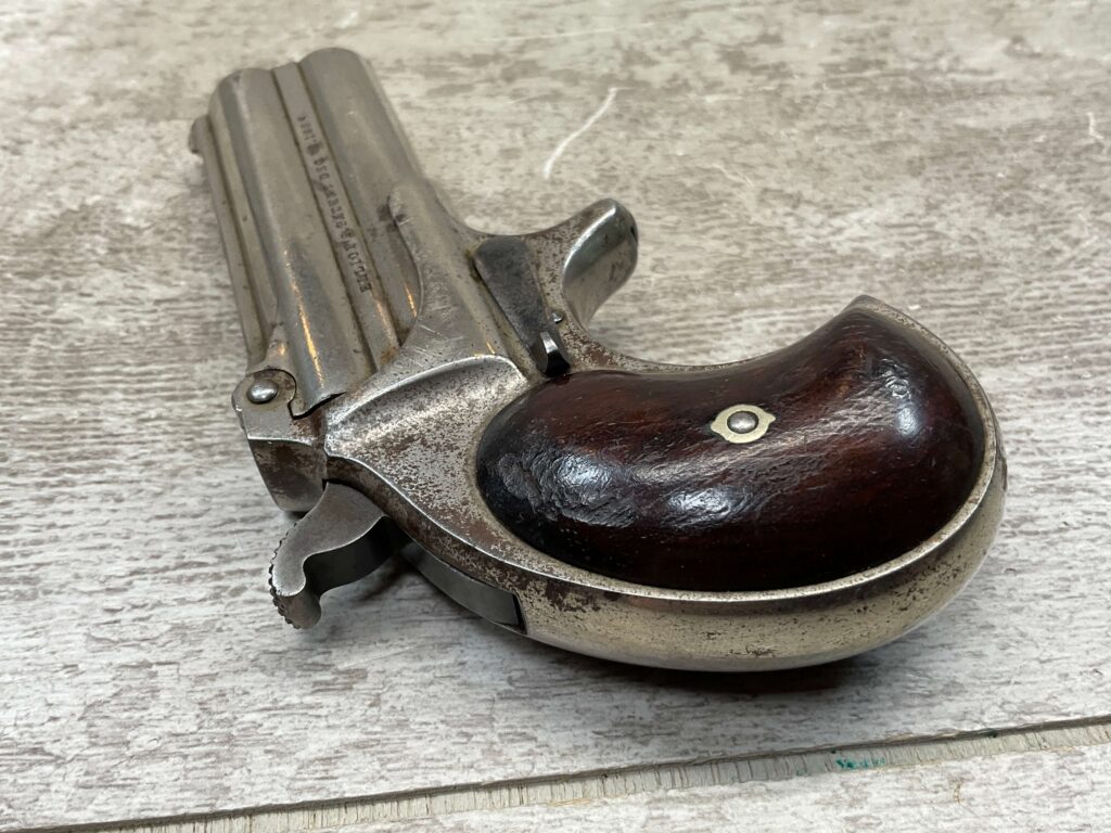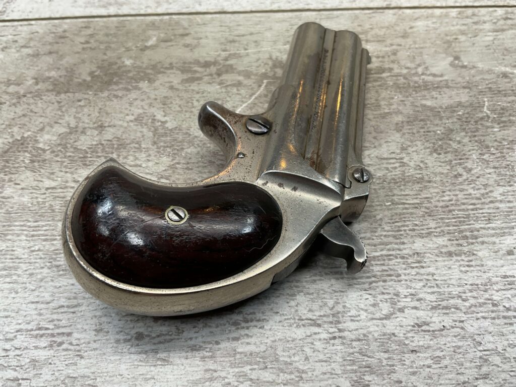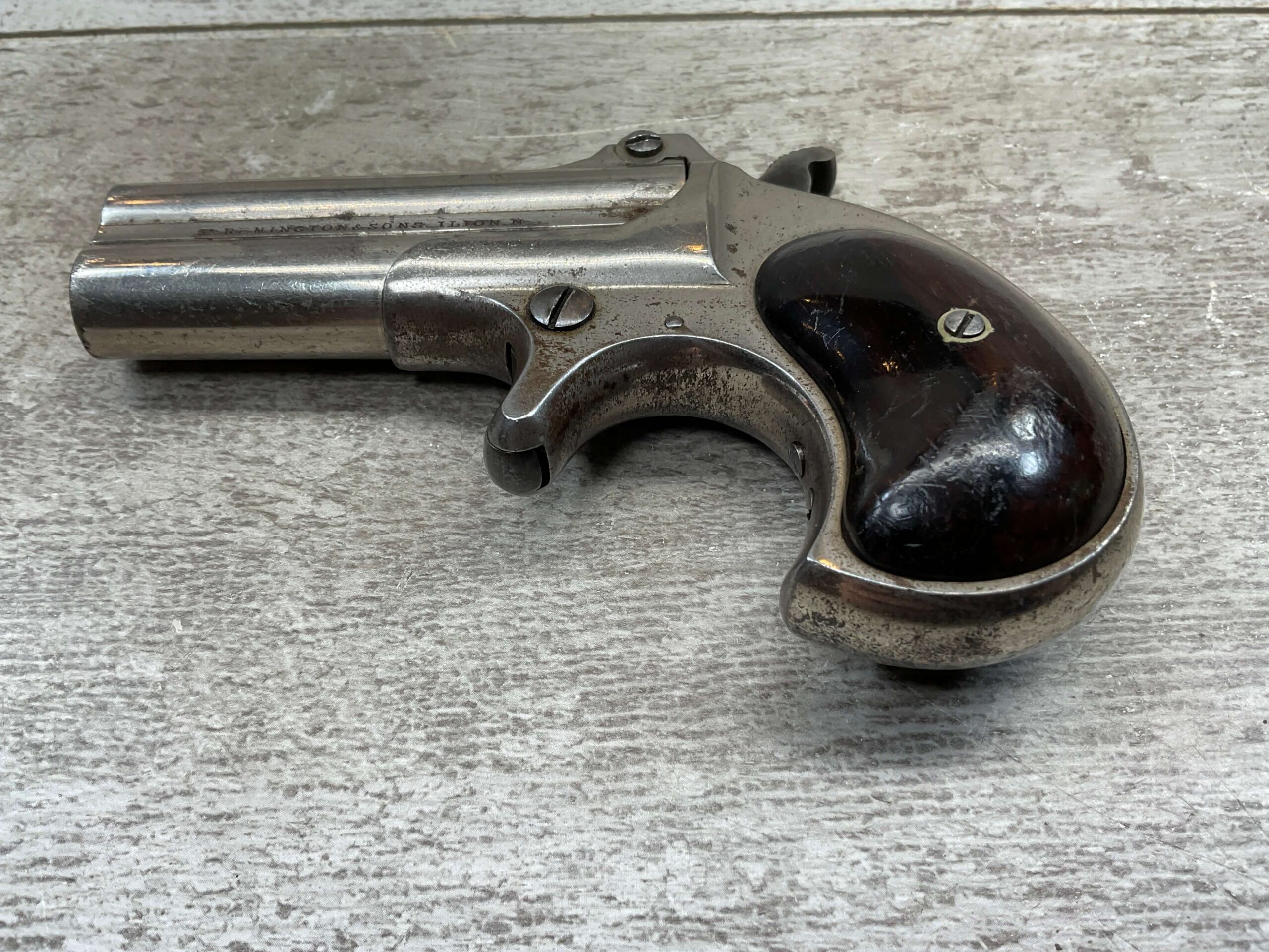 ELLIOT REMINGTON TYPE 1 NO 1 .41RF O/U DERRINGER, ANTIQUE #694, 3″ DOUBLE BARREL, 80% ORIGINAL NICKEL PLATING, EXC SMOOTH WALNUT GRIPS (UNMARKED), DARKER BORE W/ LIGHT FROSTING IN AREAS & VG RIFLING, “ELLIOT’S PATENT DEC 12. 1865” ON RIGHT SIDE OF BARREL, “E. REMINGTON&SONS.ILION.N.Y.” ON LEFT SIDE, SPUR TRIGGER, MATCHING NUMBERS ON UNDERSIDE OF BARREL & THE RIGHT SIDE OF THE FRAME UNDER THE GRIP, LESS THAN 2000 OF THIS EARLY VARIANT ARE BELIEVED TO HAVE BEEN MADE, BLADE FRONT & NOTCHED REAR SIGHTS, NOT A REPRODUCTION, OVERALL CONDITION AS SEEN IN PHOTOS!!