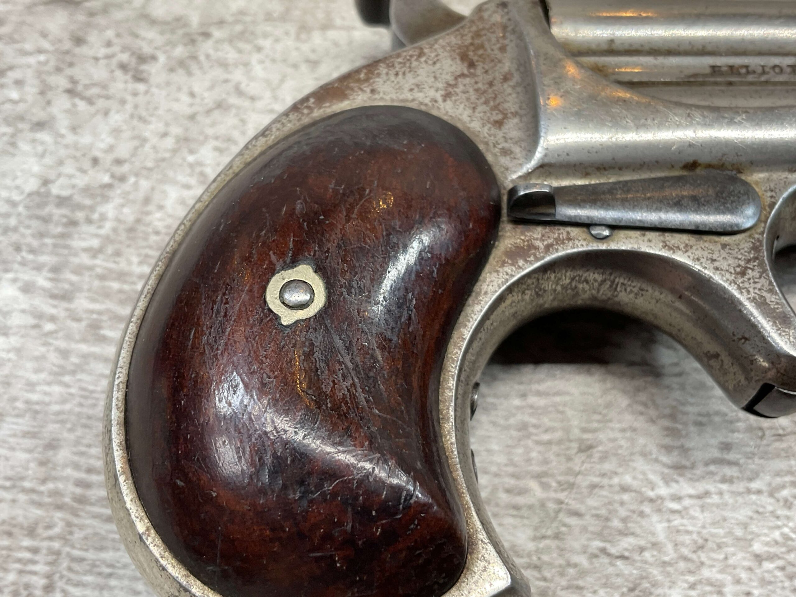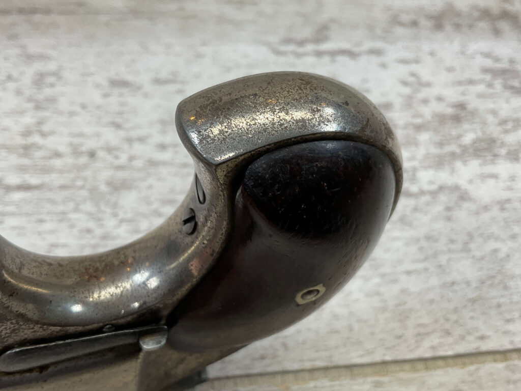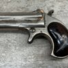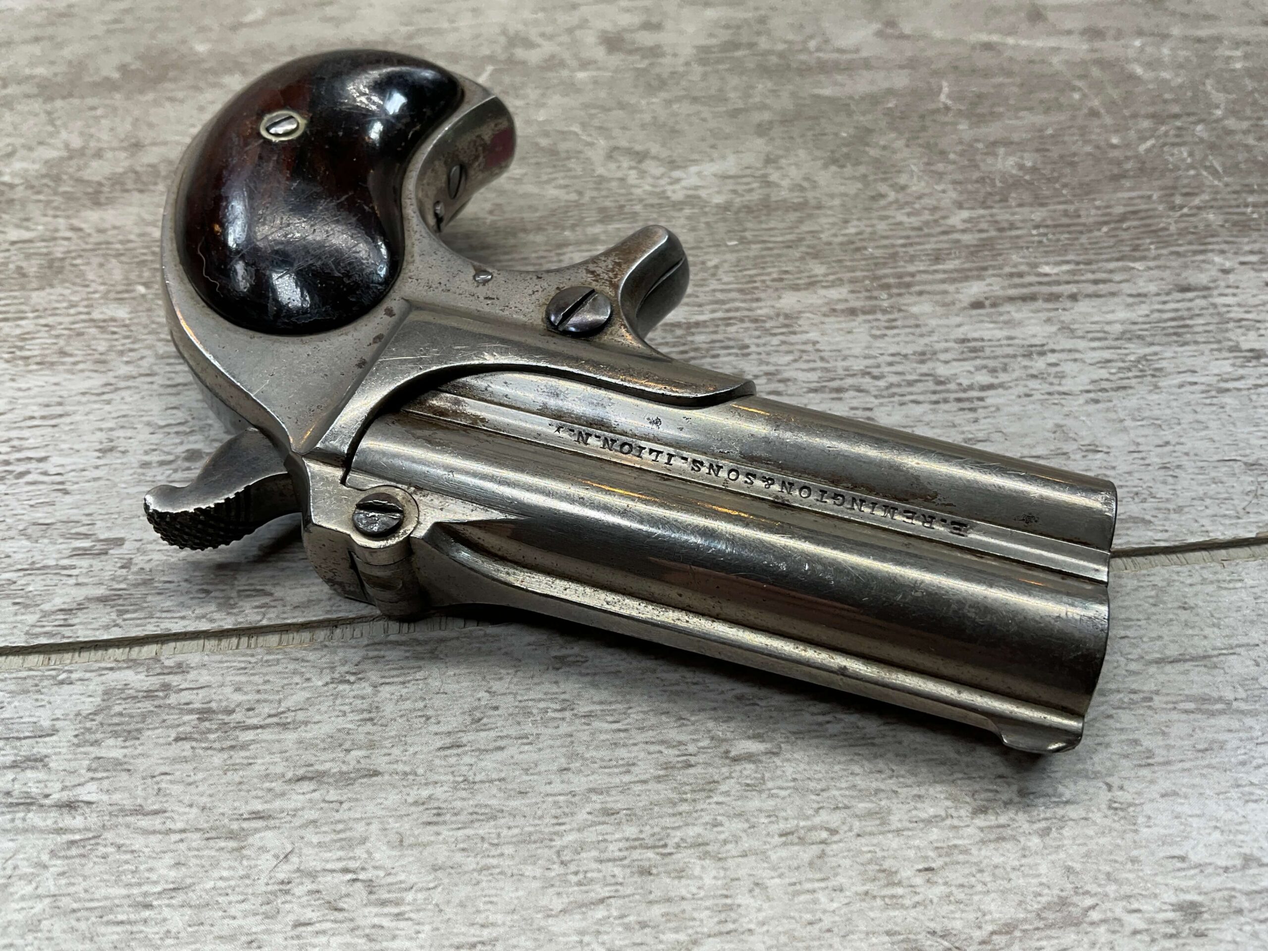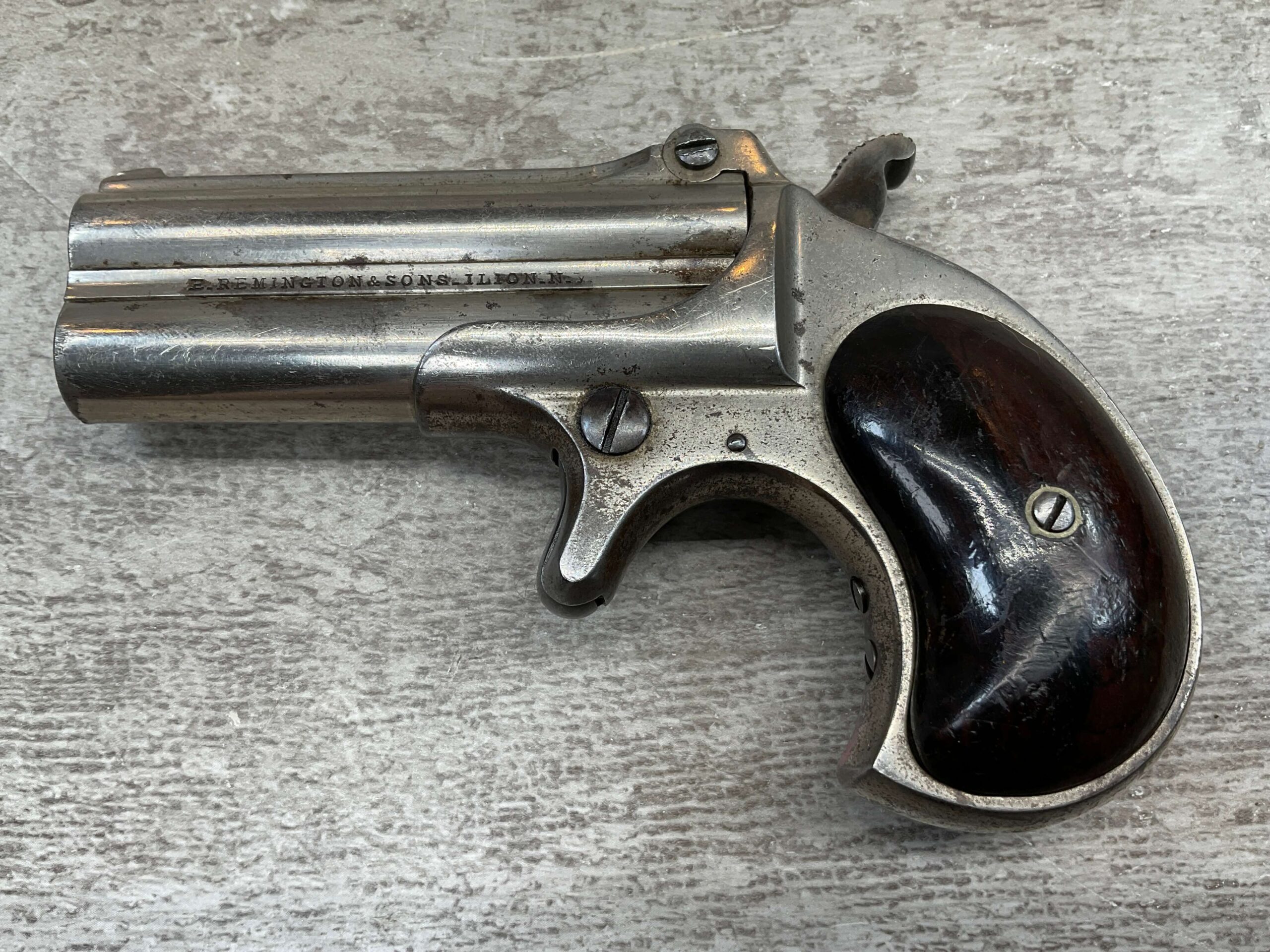 ELLIOT REMINGTON TYPE 1 NO 1 .41RF O/U DERRINGER, ANTIQUE #694, 3″ DOUBLE BARREL, 80% ORIGINAL NICKEL PLATING, EXC SMOOTH WALNUT GRIPS (UNMARKED), DARKER BORE W/ LIGHT FROSTING IN AREAS & VG RIFLING, “ELLIOT’S PATENT DEC 12. 1865” ON RIGHT SIDE OF BARREL, “E. REMINGTON&SONS.ILION.N.Y.” ON LEFT SIDE, SPUR TRIGGER, MATCHING NUMBERS ON UNDERSIDE OF BARREL & THE RIGHT SIDE OF THE FRAME UNDER THE GRIP, LESS THAN 2000 OF THIS EARLY VARIANT ARE BELIEVED TO HAVE BEEN MADE, BLADE FRONT & NOTCHED REAR SIGHTS, NOT A REPRODUCTION, OVERALL CONDITION AS SEEN IN PHOTOS!!