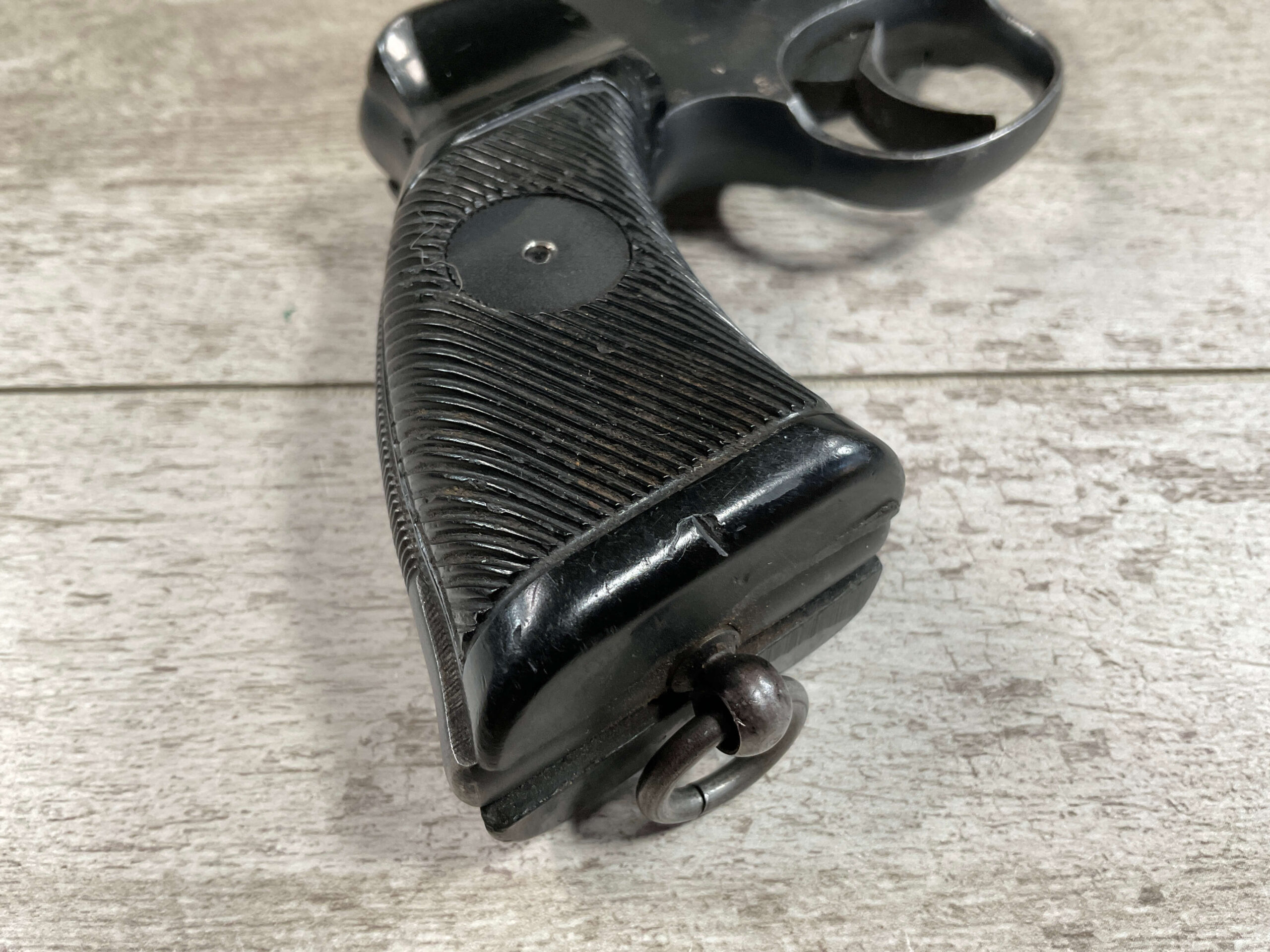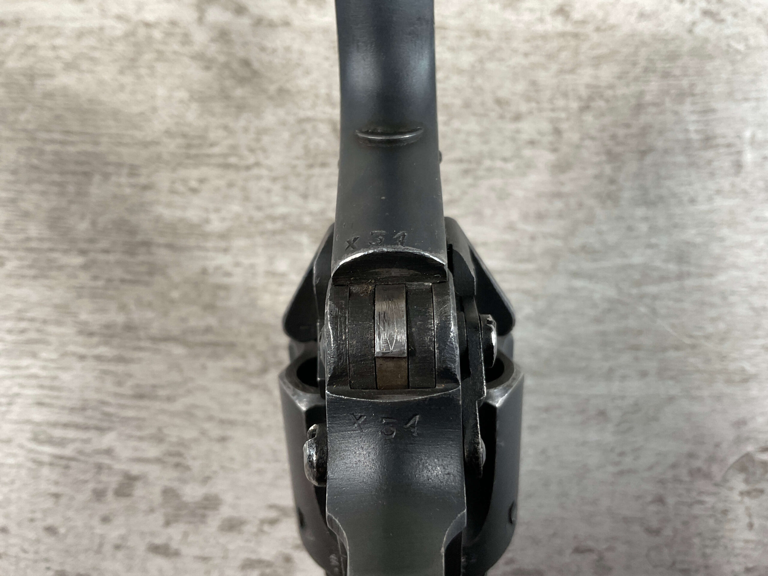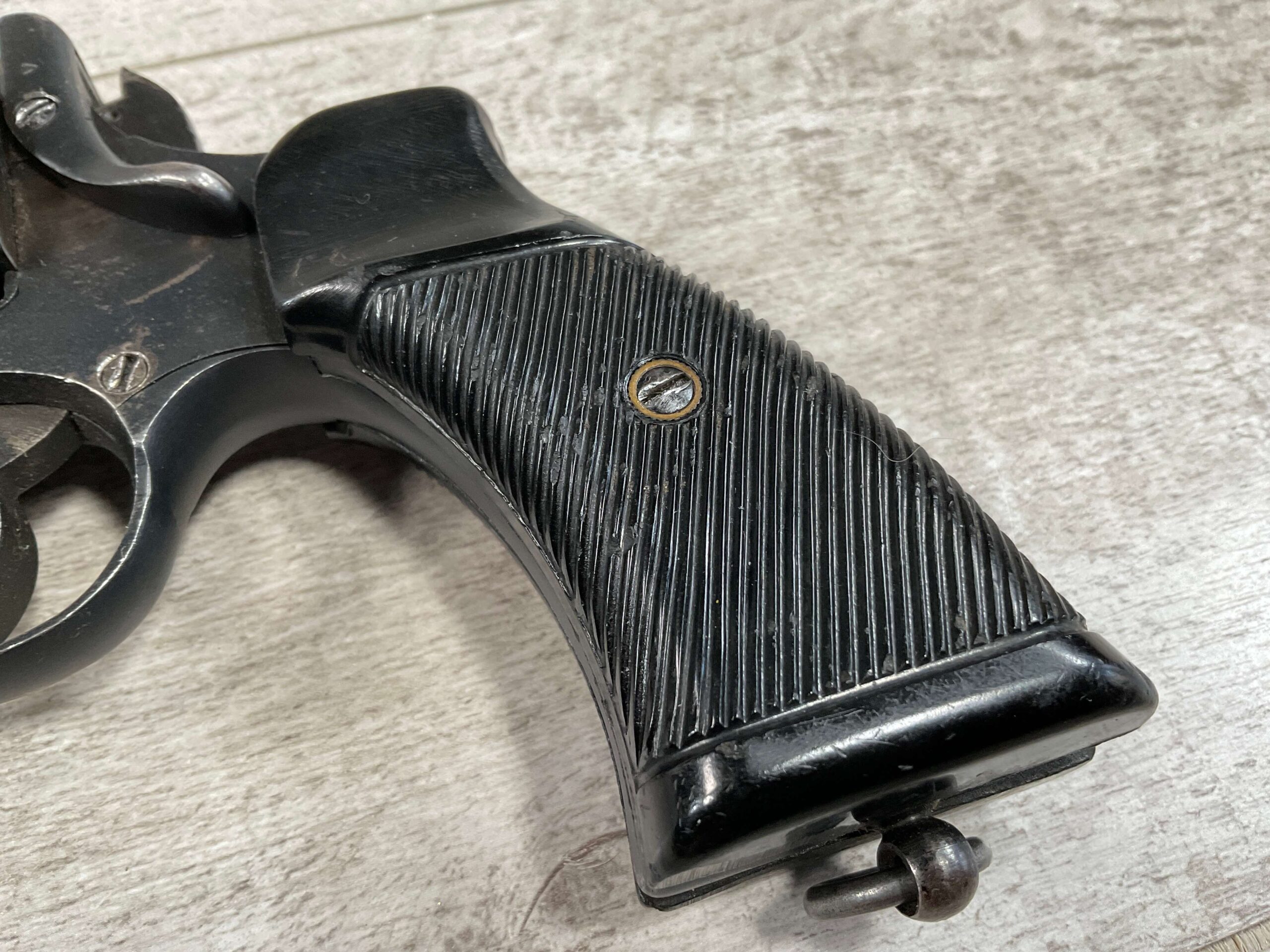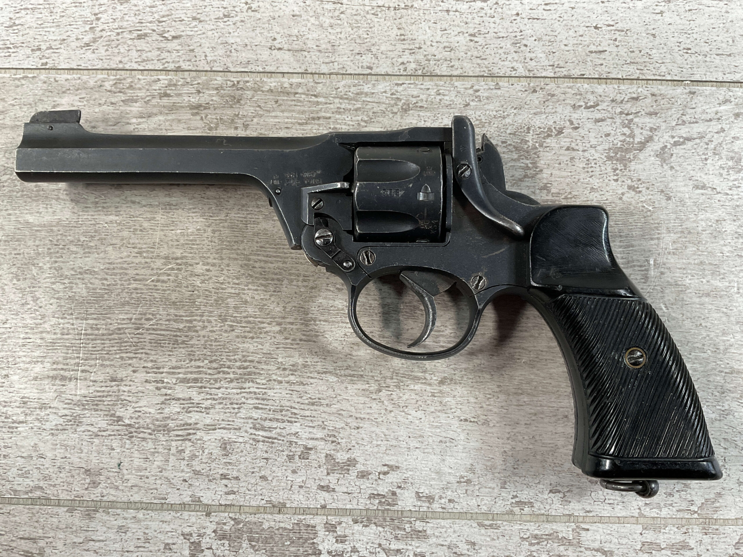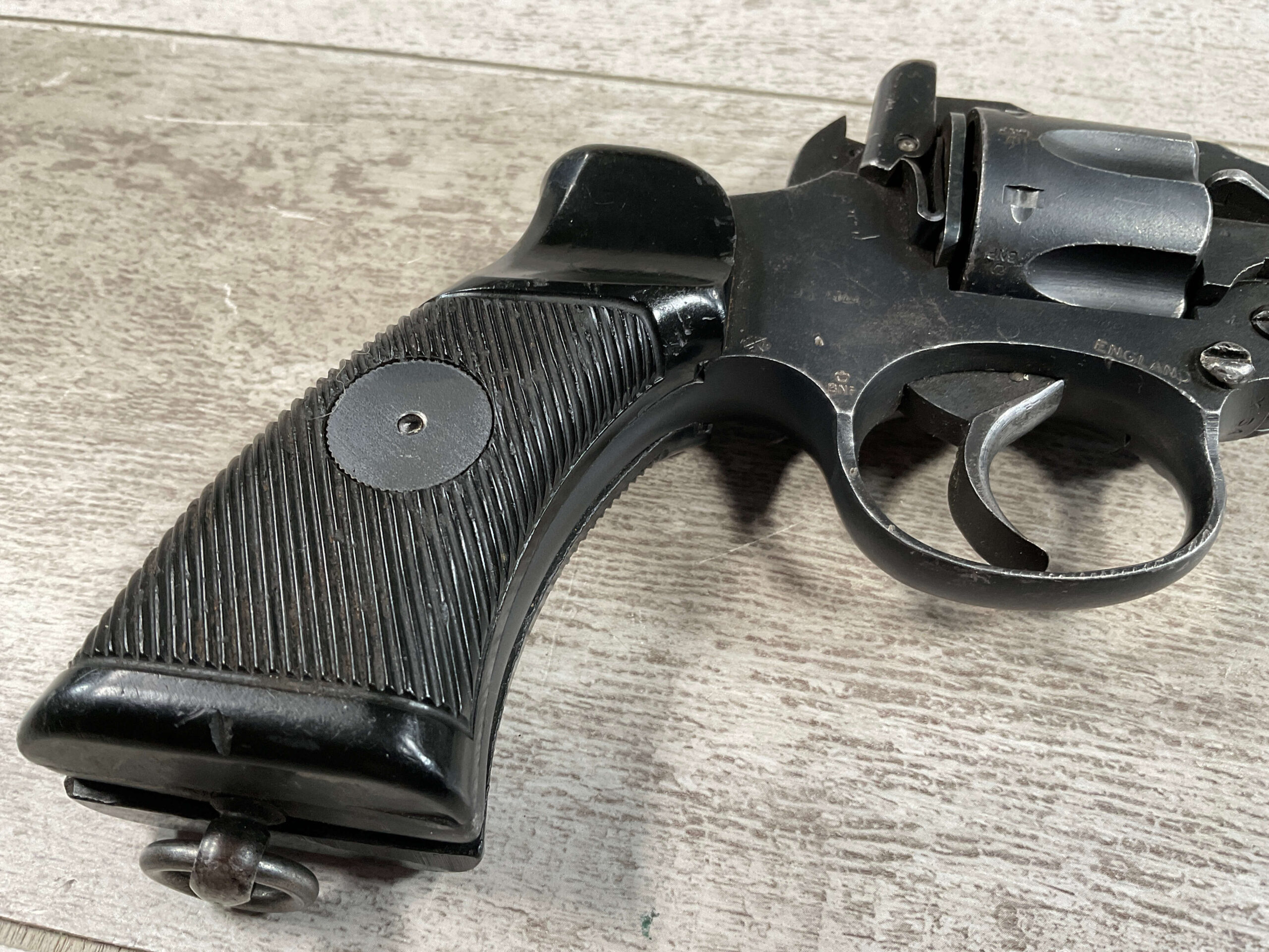 ENFIELD NO2 MK1 TANK CREW .38 S&W DA REVOLVER #X34, 90+% BLUE, MATCHING BARREL/FRAME & CYLINDER! EXC BRIGHT BORE W/EXC RIFLING, PLASTIC GRIPS MISSING LOGO DISC ON RIGHT GRIP, LANYARD LOOP PRESENT, 90+% OVERALL