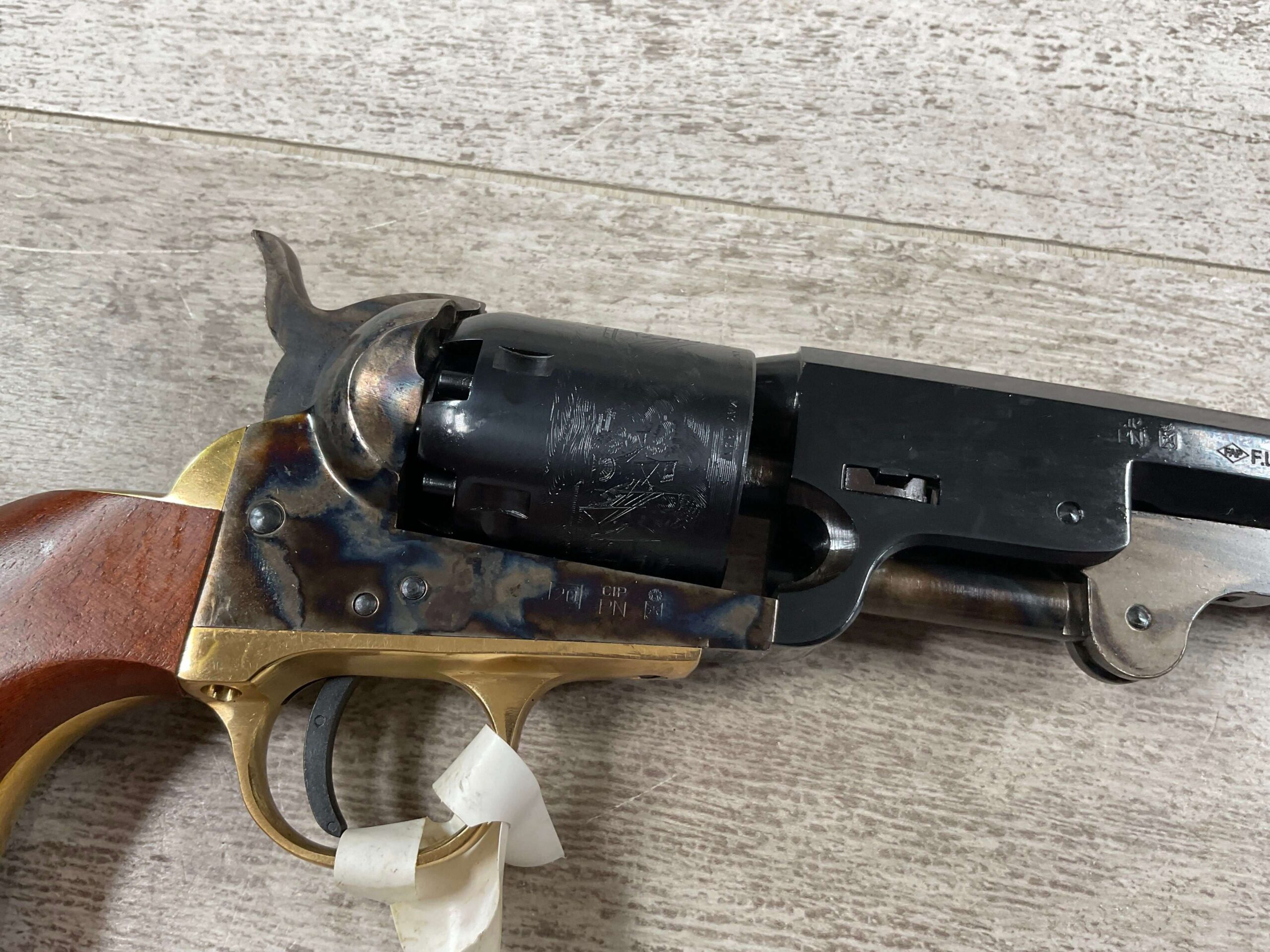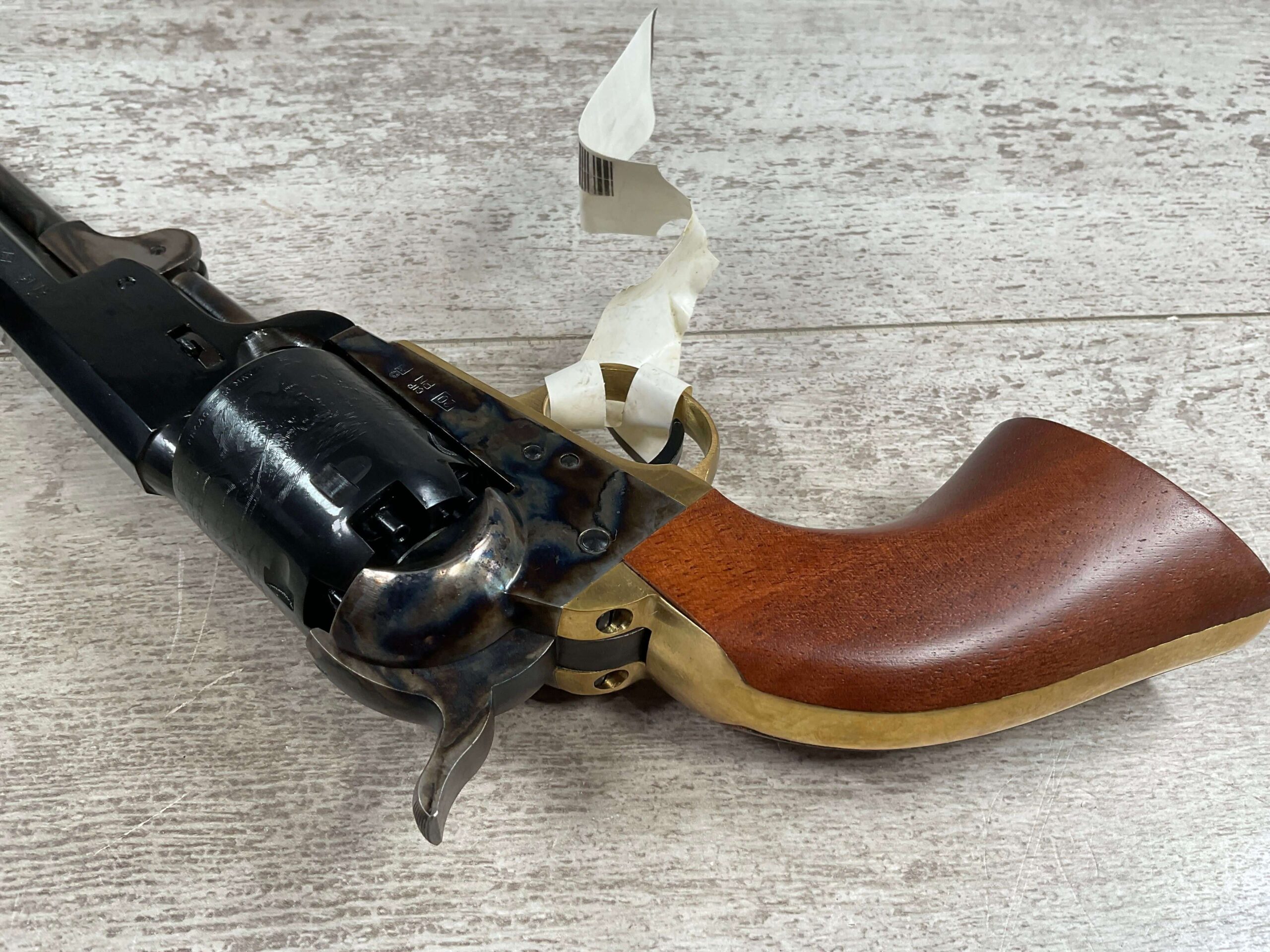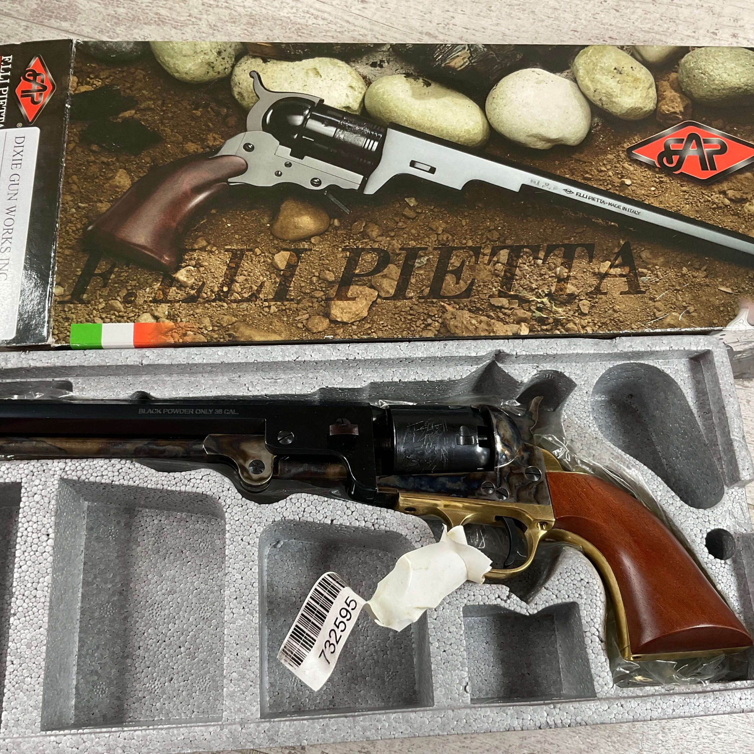 F.LLI PIETTA .36 CAL 1851 NAVY YANK CASE HARDENED BLACK POWDER REVOLVER #732595, 7.5″ BLUED OCTAGON BARREL, REAR SIGHT IN HAMMER, BLADE FRONT SIGHT, EXC SMOOTH WALNUT GRIPS, BRASS BACKSTRAP & TRIGGER GUARD, COLOR CASE HARDENED FRAME/PLUNGER & HAMMER, NO CYLINDER WEAR, CYLINDER HAS ENGRAVING, EXC OVERALL, 98+% **IN ORIGINAL PACKAGING W/TAGS, NEVER FIRED**