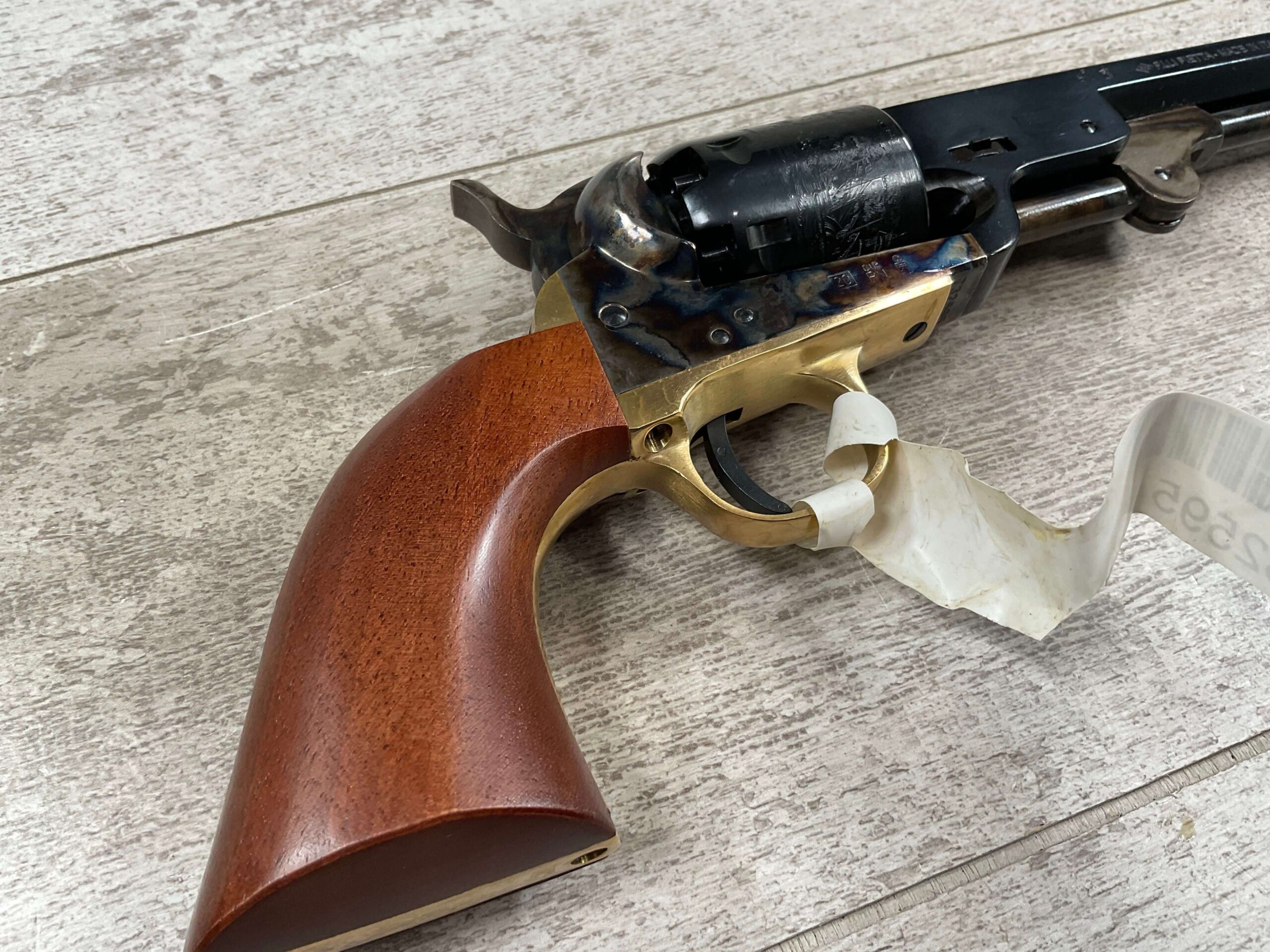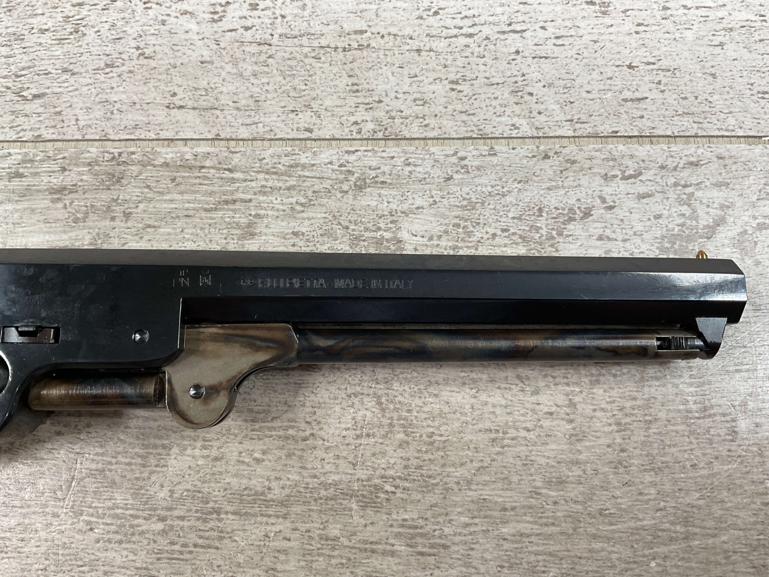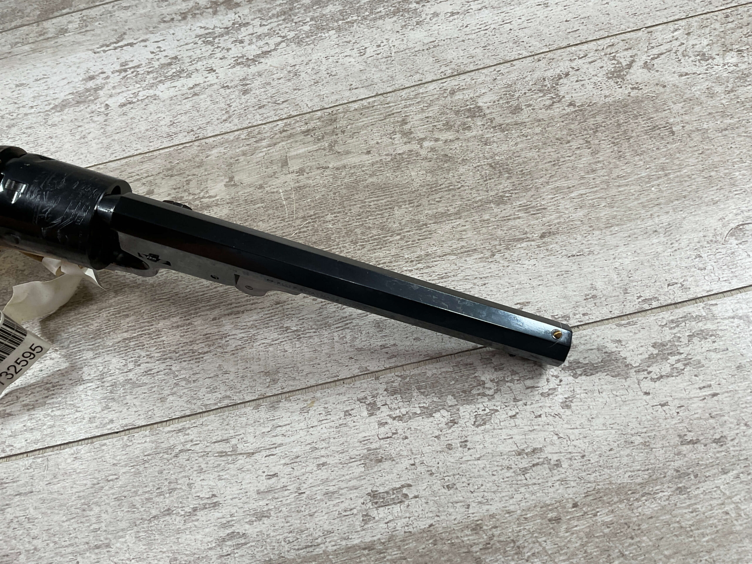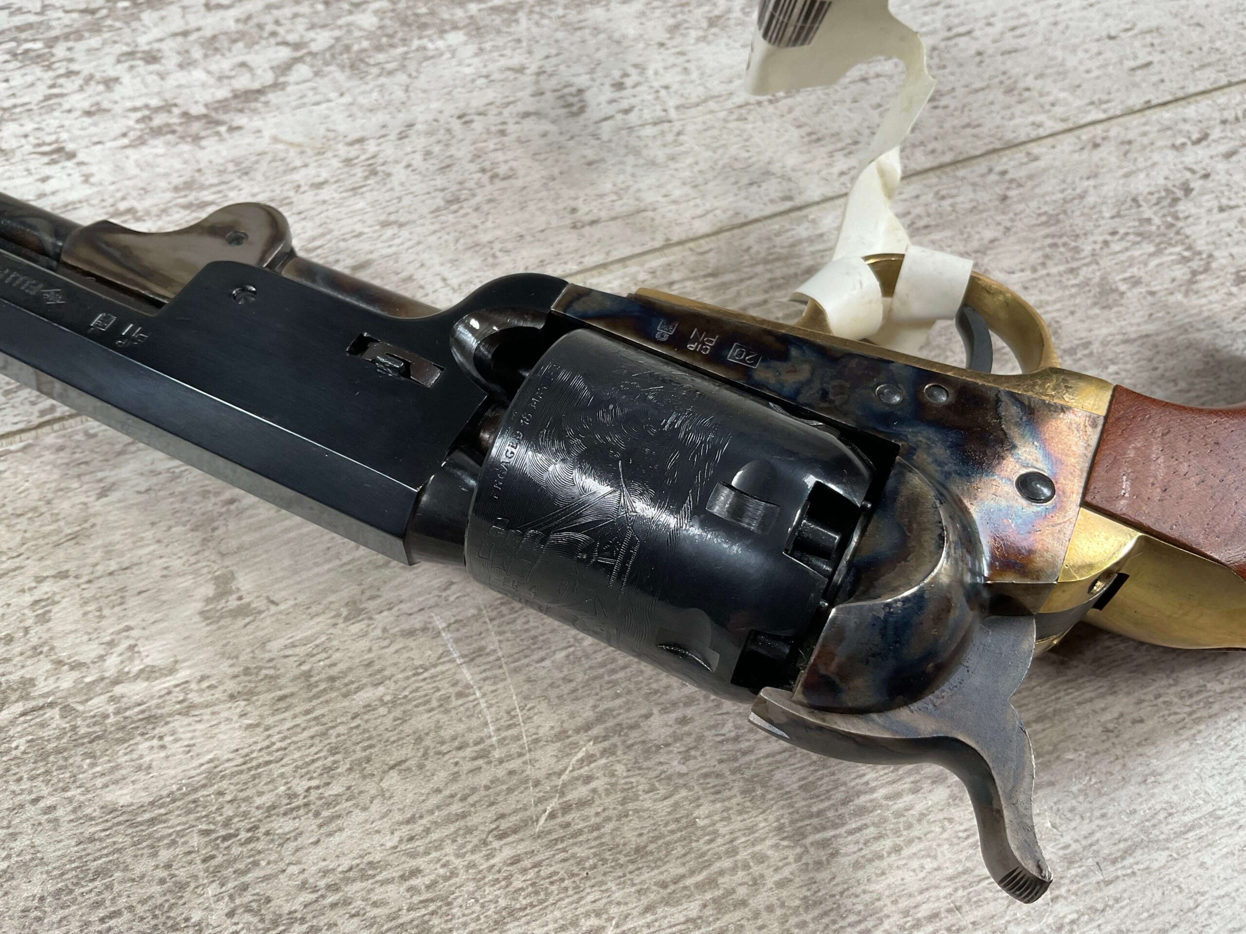 F.LLI PIETTA .36 CAL 1851 NAVY YANK CASE HARDENED BLACK POWDER REVOLVER #732595, 7.5″ BLUED OCTAGON BARREL, REAR SIGHT IN HAMMER, BLADE FRONT SIGHT, EXC SMOOTH WALNUT GRIPS, BRASS BACKSTRAP & TRIGGER GUARD, COLOR CASE HARDENED FRAME/PLUNGER & HAMMER, NO CYLINDER WEAR, CYLINDER HAS ENGRAVING, EXC OVERALL, 98+% **IN ORIGINAL PACKAGING W/TAGS, NEVER FIRED**