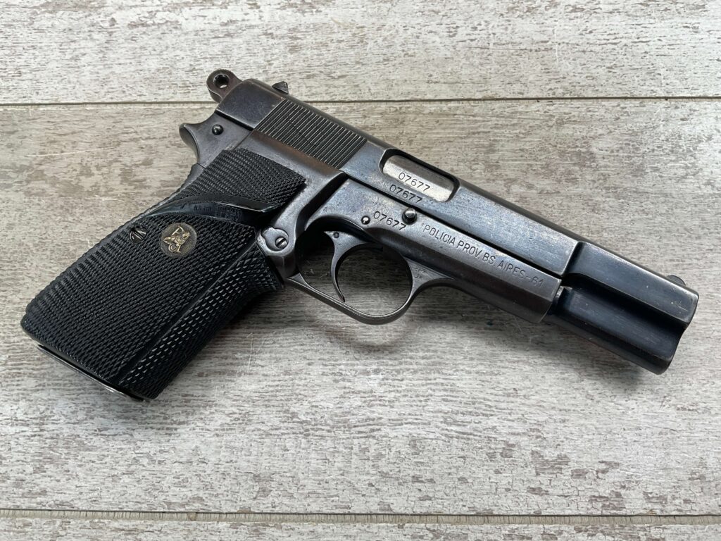FN BELGIUM BROWNING HI POWER 9MM SEMI-AUTO PISTOL, #07677, LEFT SIDE OF SLIDE IS MARKED “FABRIQUE NATIONALE D’ARMES DE GUERRE/HERSTAL-BELGIQUE/BROWNING’S PATENT DEPOSE”. POST-WAR SHIPPED TO ARGENTINA 1960 -1961 USED BY THE BUENOS AIRES POLICE, RIGHT FRAME STAMPED WITH “POLICIA PROV. BS. AIRES-61”, TOP OF THE SLIDE IS STAMPED WITH THE ARGENTINE CONTRACT MARK, SLIDE AND FRAME SHOW HIGH EDGE WEAR, VERY LIGHT DARK SPOTS & LIGHT THINNING OF THE BLUE FINISH 85%+, FIXED SIGHTS, W/BLUED HAMMER, RUBBER SIGNATURE SERIES WRAP AROUND CHECKERED GRIP, NON MATCHING NUMBERED “07054” 13 RND MAG, LIGHT WEAR & SLIDE MARKS, EXC BRIGHT BORE & RIFLING, GREAT ADDITION FOR THE HI POWER COLLECTOR!!