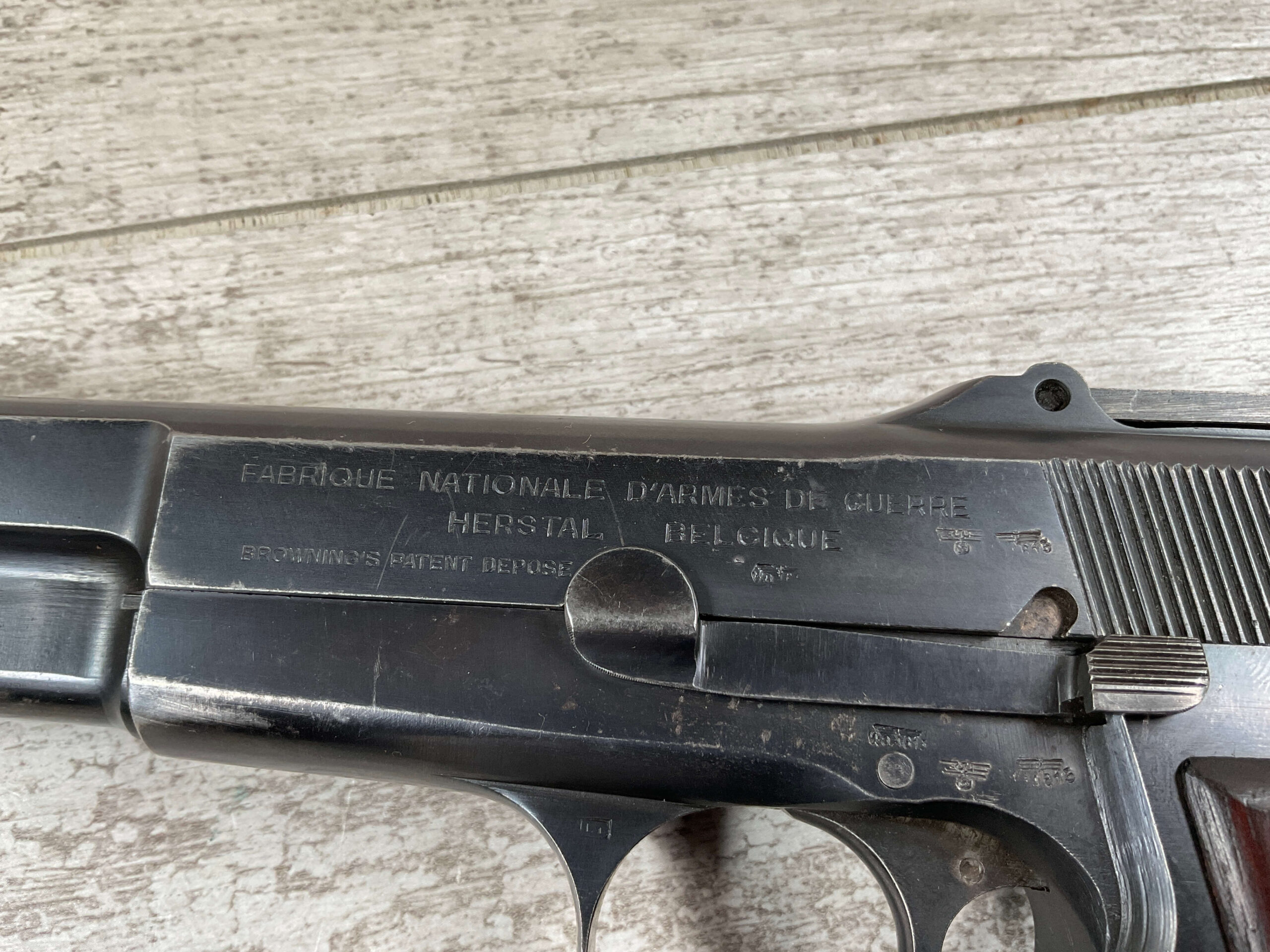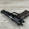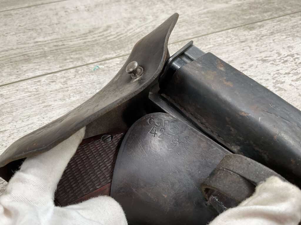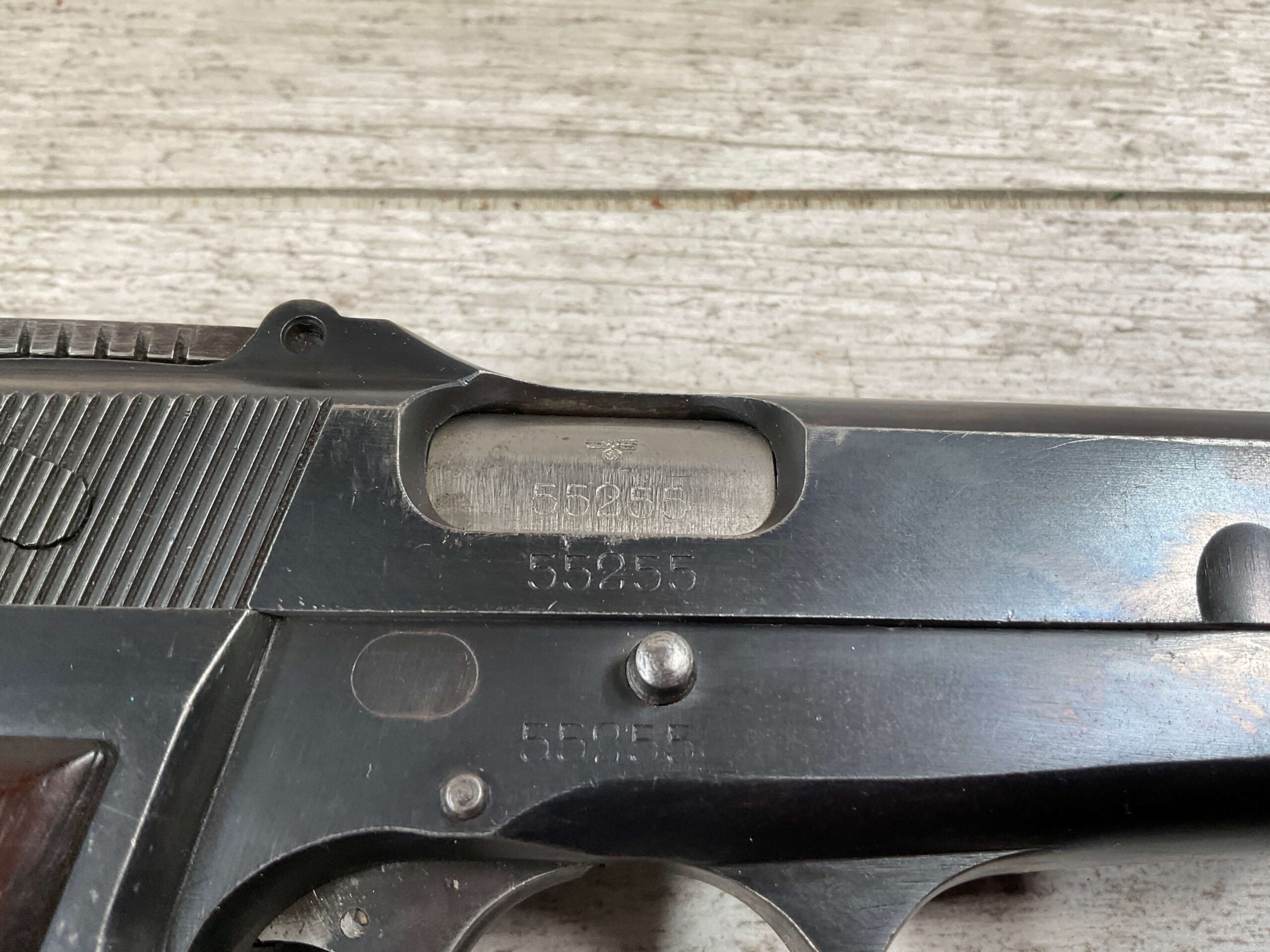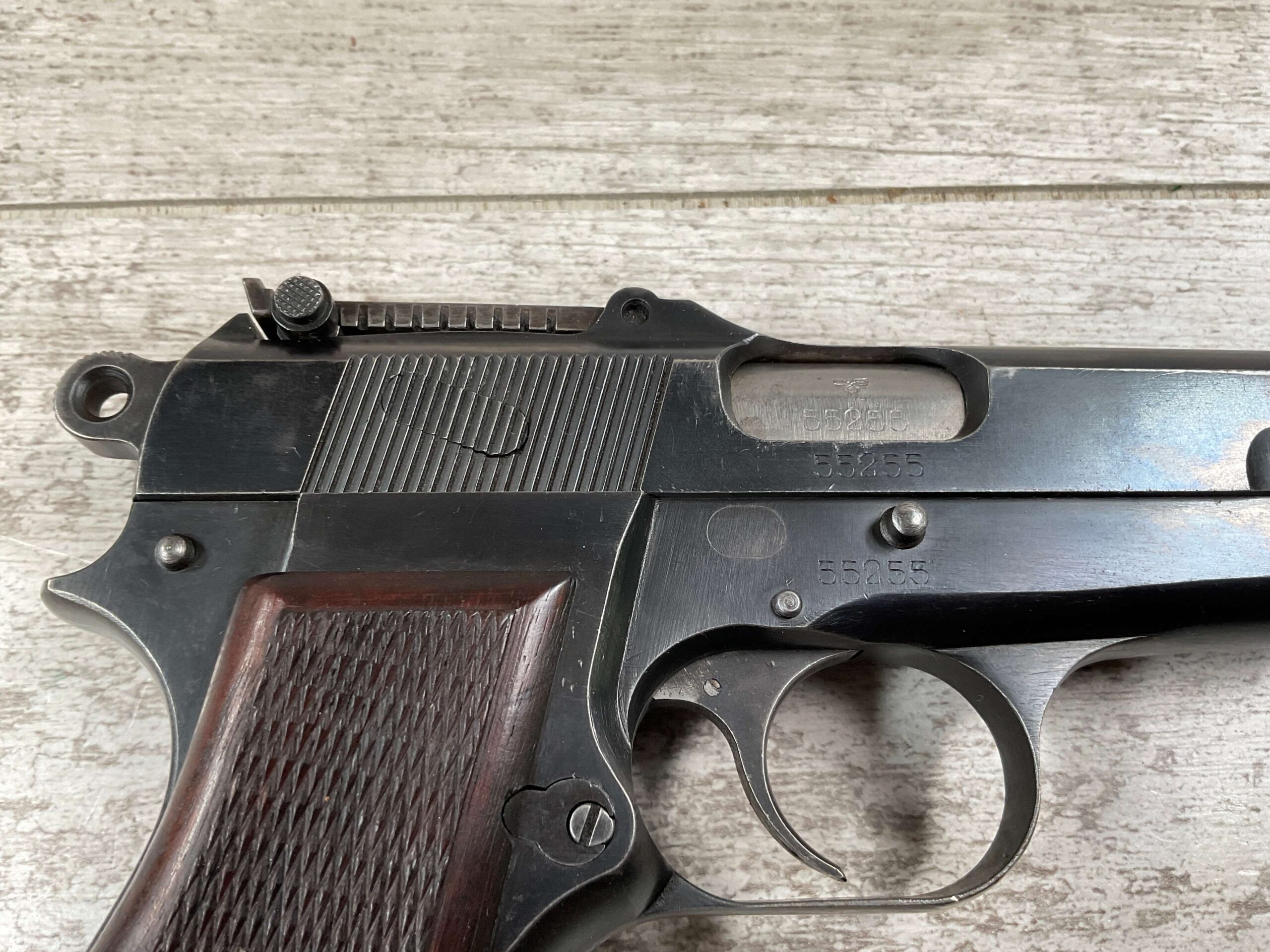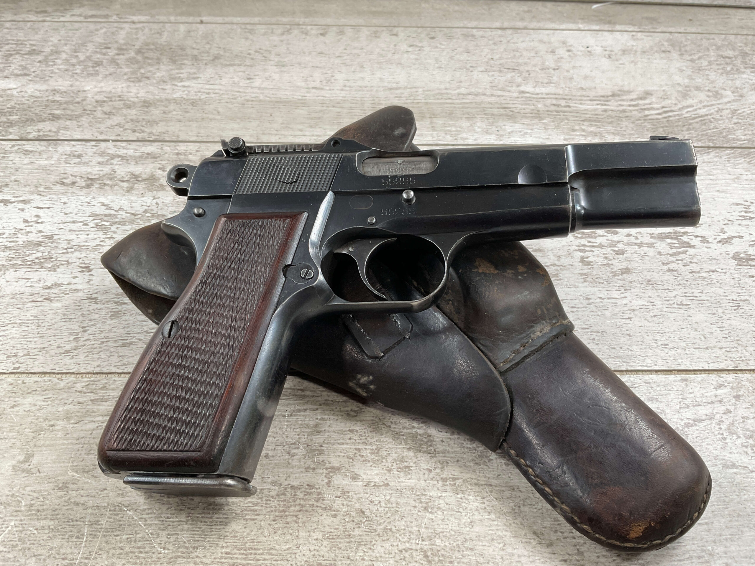 FN BROWNING HI POWER 9MM NAZI MARKED PISTOL RIG #55255, 9MM, 90% BLUE W/ HIGH EDGE WEAR, FRONT GRIP STRAP AND TRIGGER GUARD SHOW THINNING, VG CHECKERED WOODEN GRIPS (RED INSIDE), 4 5/8″ BARREL, TANGENT REAR SIGHT, WaA613 PROOF MARKED SLIDE & FRAME & BARREL (BBL ALSO HAS WaA613), ALL MATCHING, BRIGHT BORE W/GOOD RIFLING & PITTING THROUGHOUT, 2 PERIOD CORRECT MAGAZINE (NO MARKINGS), MAGAZINE SAFETY, EXC DARK BROWN/BLACK HOLSTER “CGN/42” & “EAGLE GLOBE/WaA920” UNDER FRONT CLOSURE FLAP, STITCHING IS VG, VG-EXC OVERALL 90+%