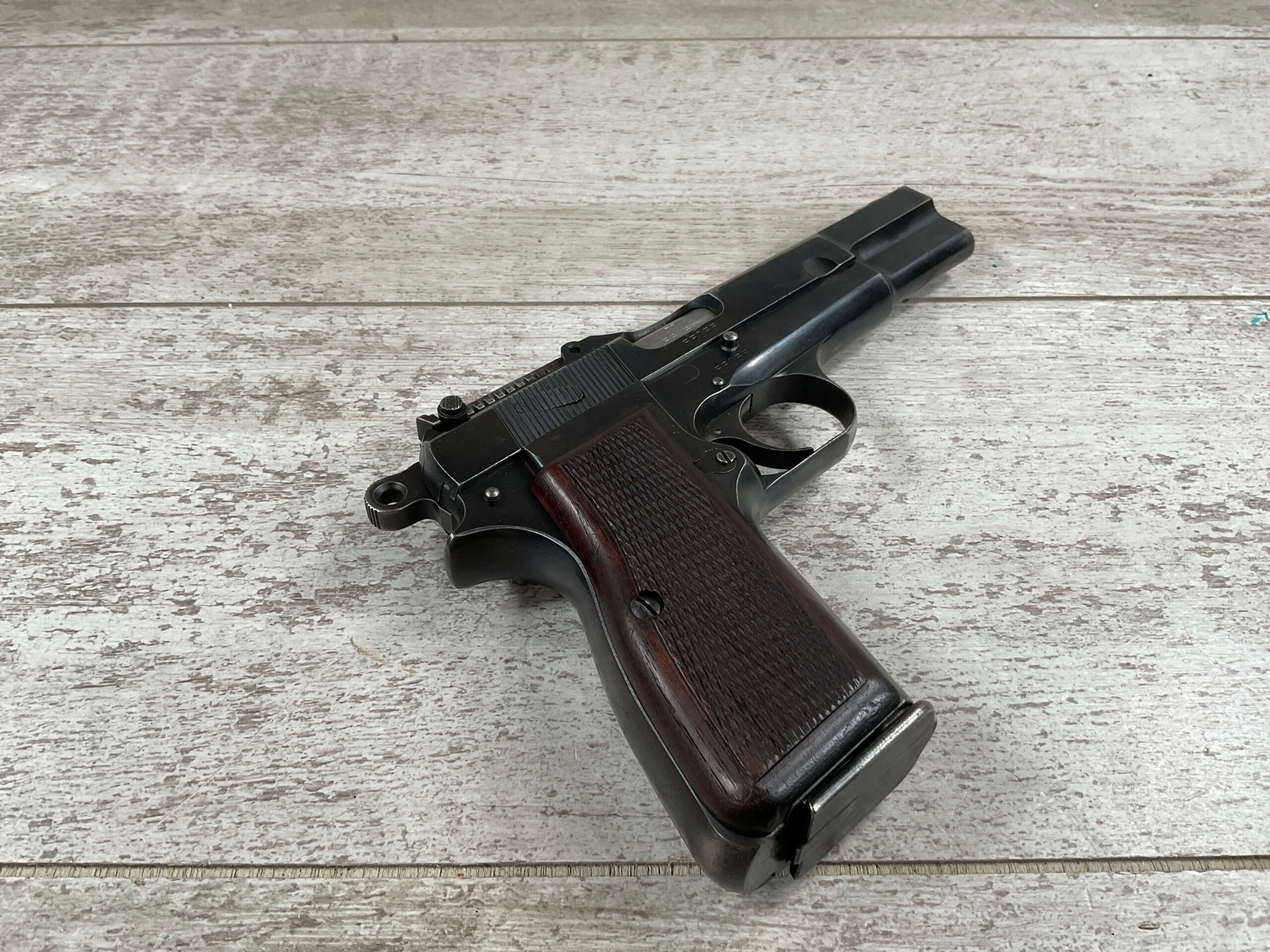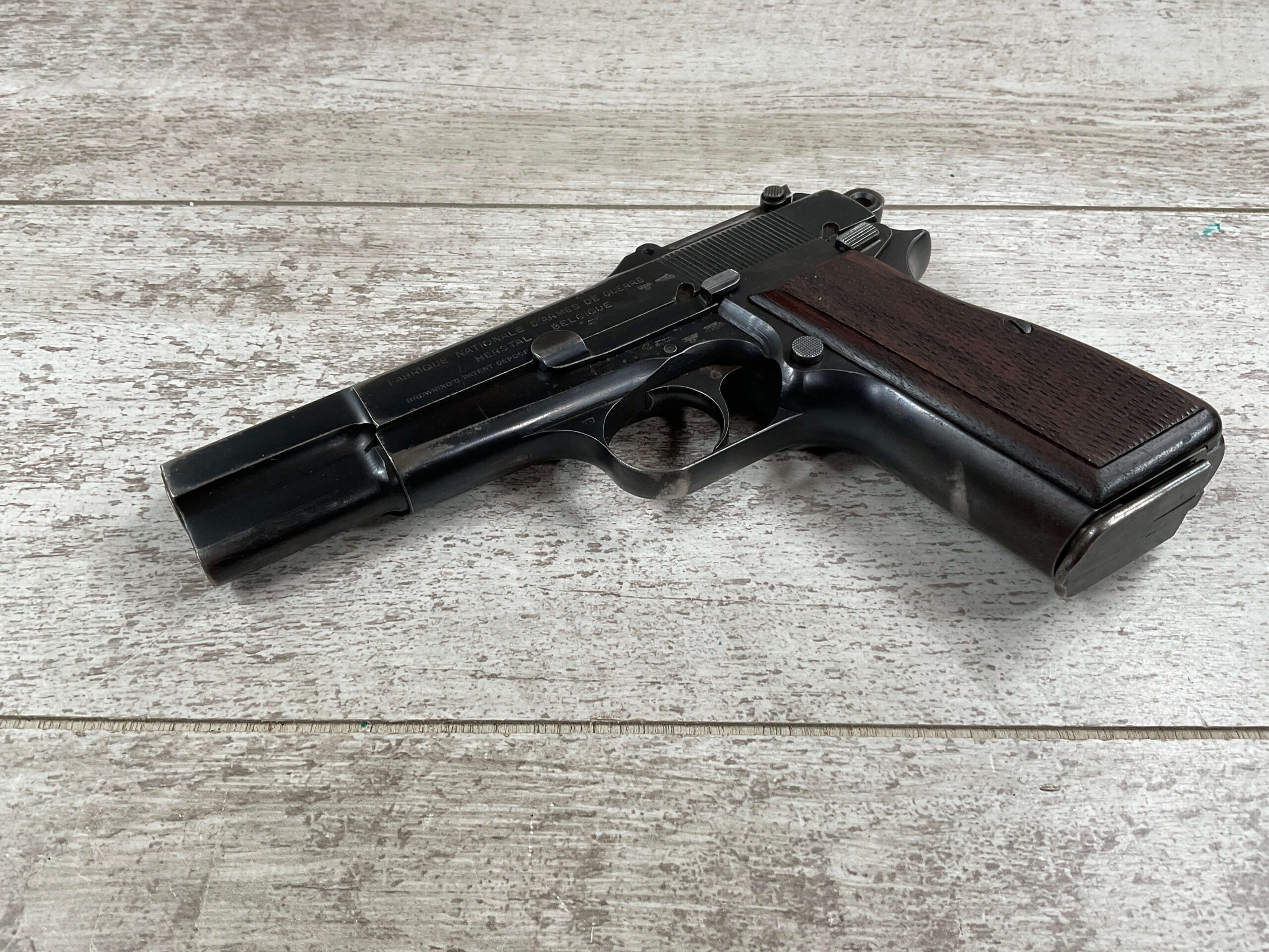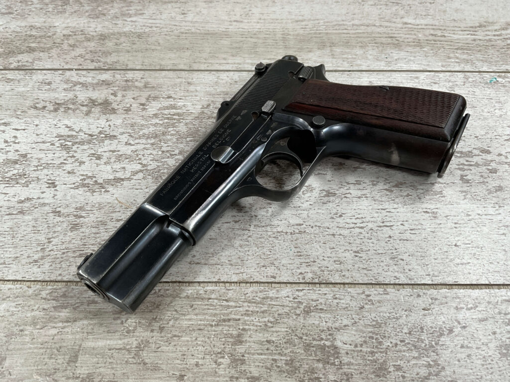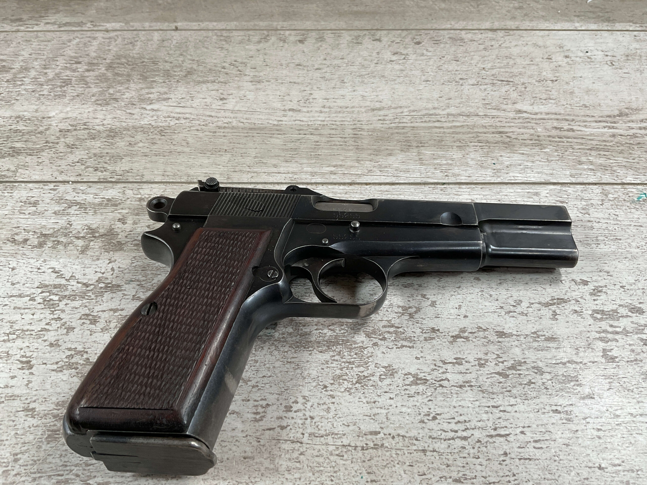 FN BROWNING HI POWER 9MM NAZI MARKED PISTOL RIG #55255, 9MM, 90% BLUE W/ HIGH EDGE WEAR, FRONT GRIP STRAP AND TRIGGER GUARD SHOW THINNING, VG CHECKERED WOODEN GRIPS (RED INSIDE), 4 5/8″ BARREL, TANGENT REAR SIGHT, WaA613 PROOF MARKED SLIDE & FRAME & BARREL (BBL ALSO HAS WaA613), ALL MATCHING, BRIGHT BORE W/GOOD RIFLING & PITTING THROUGHOUT, 2 PERIOD CORRECT MAGAZINE (NO MARKINGS), MAGAZINE SAFETY, EXC DARK BROWN/BLACK HOLSTER “CGN/42” & “EAGLE GLOBE/WaA920” UNDER FRONT CLOSURE FLAP, STITCHING IS VG, VG-EXC OVERALL 90+%