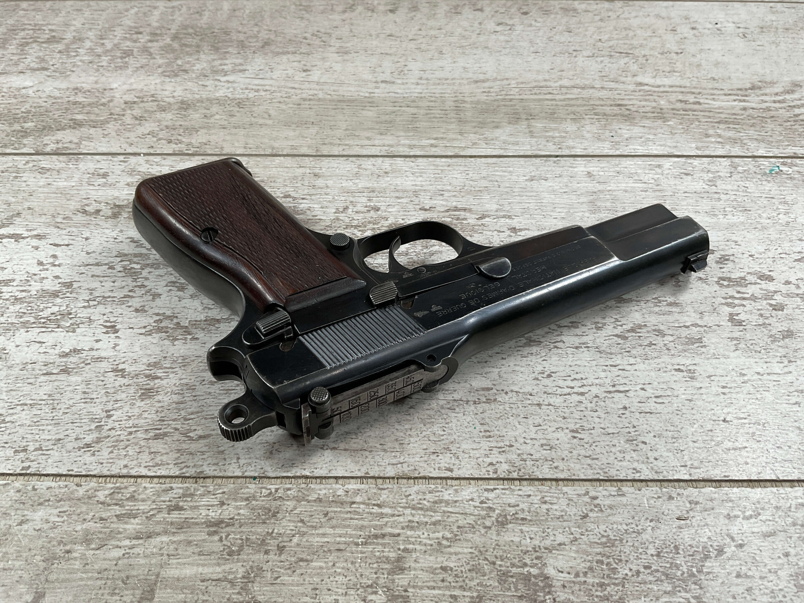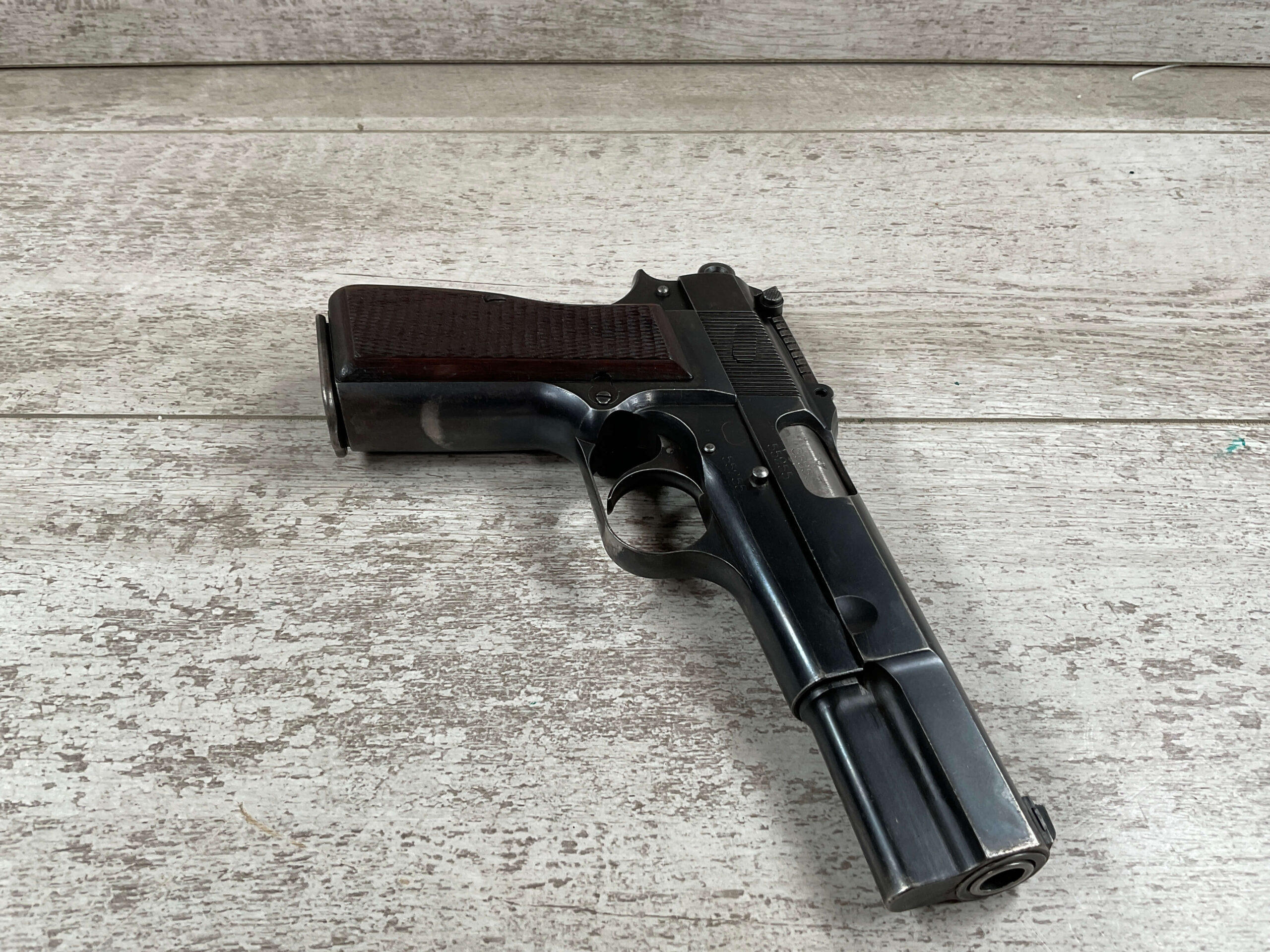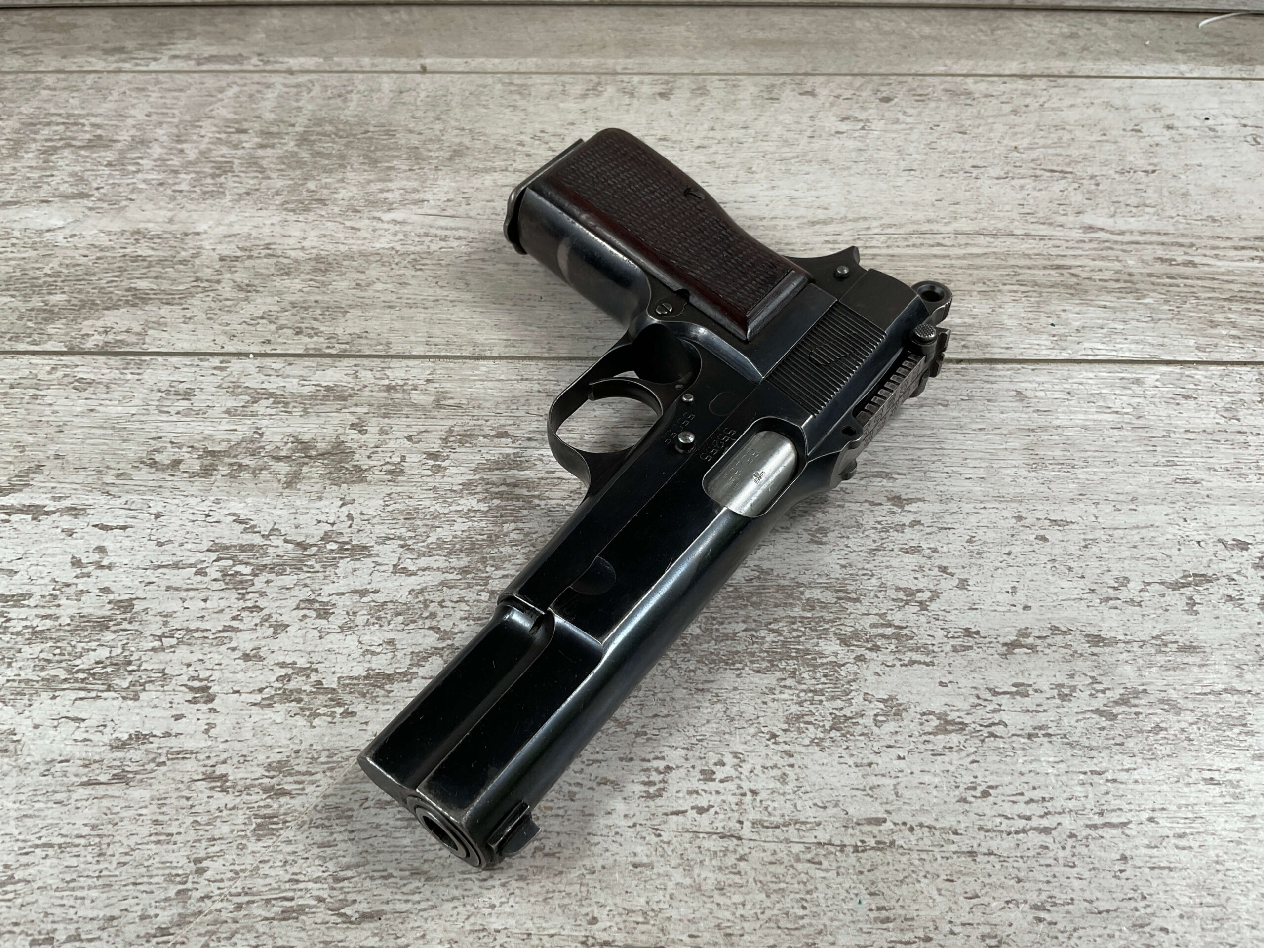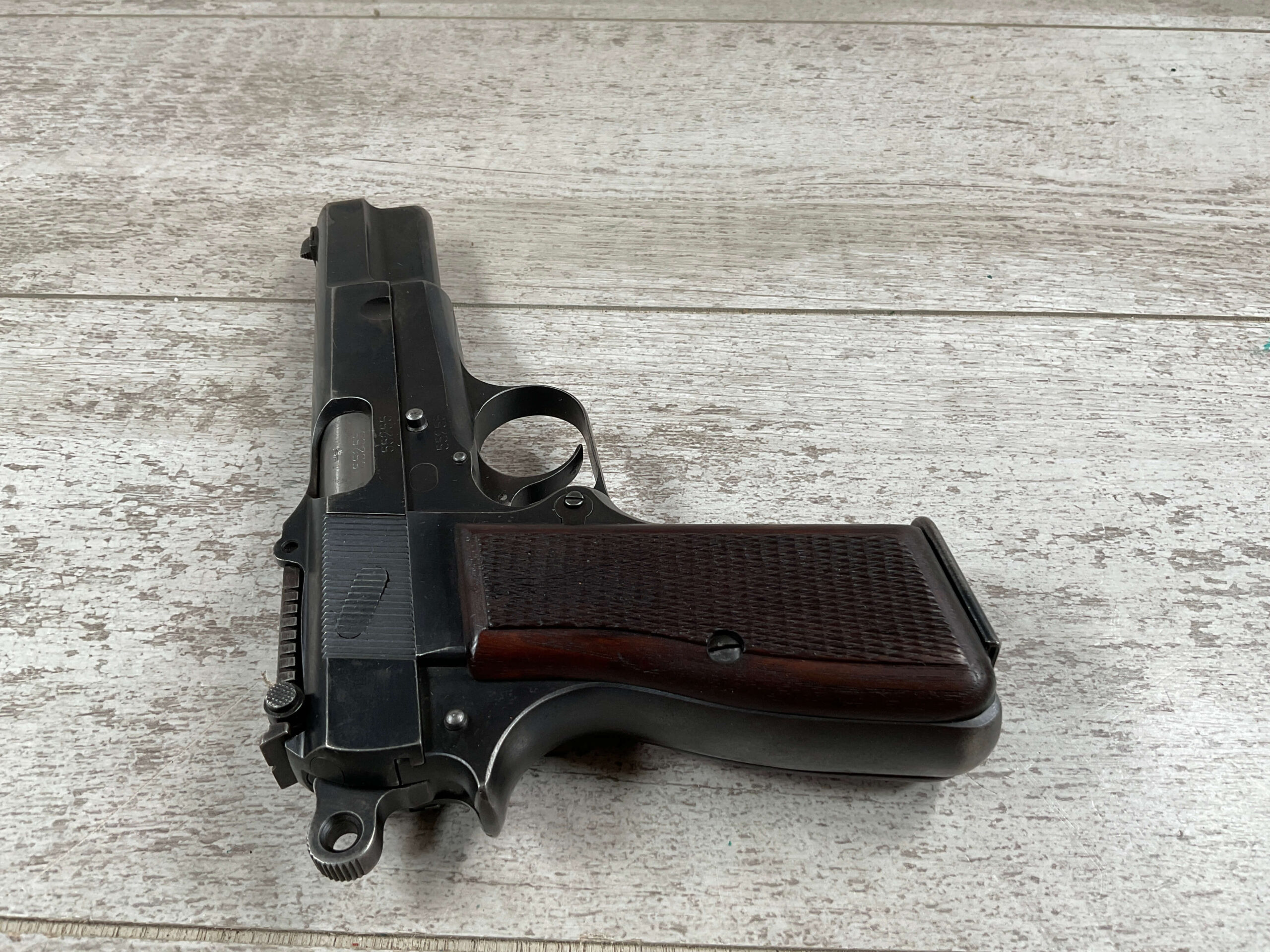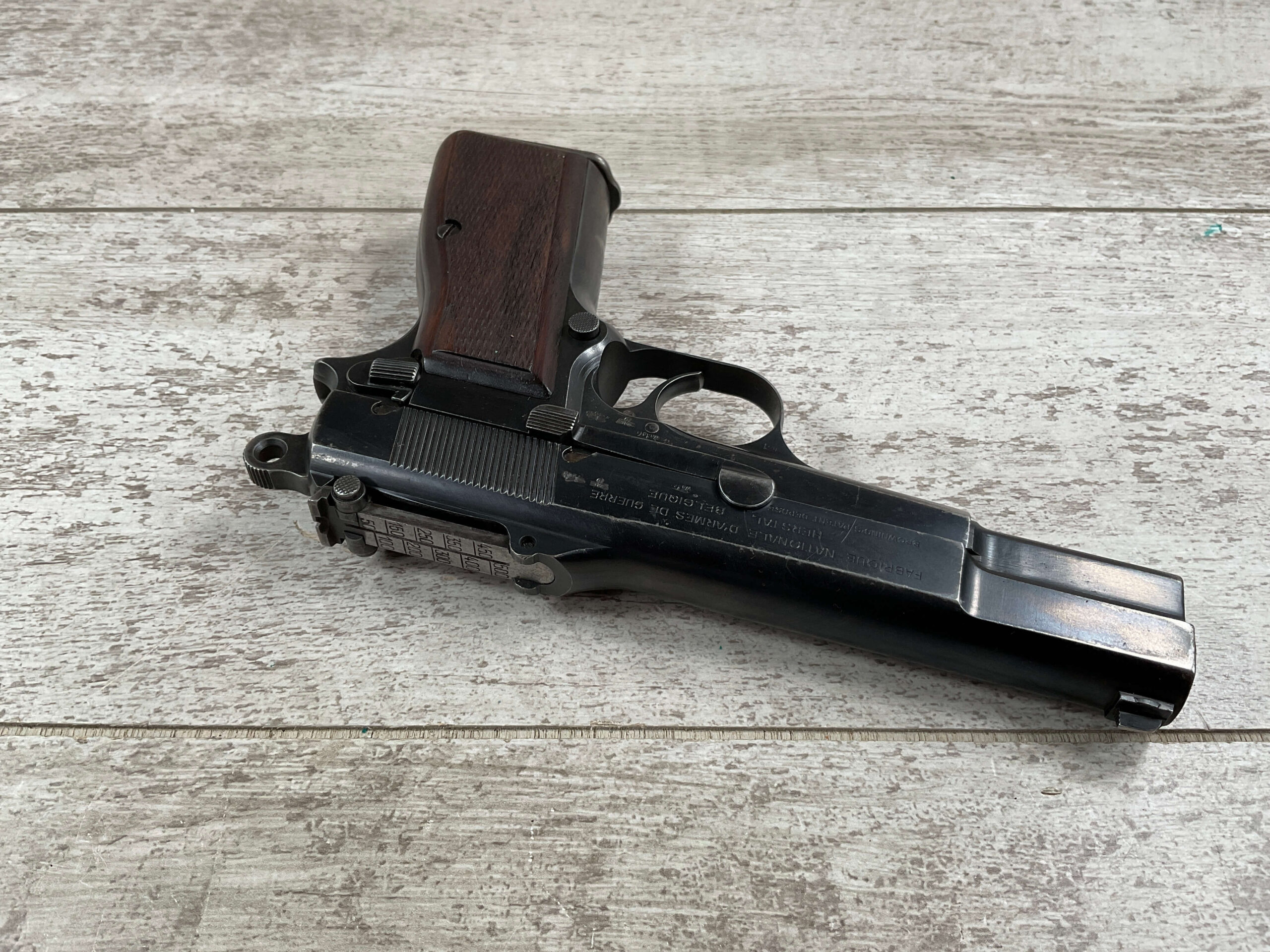 FN BROWNING HI POWER 9MM NAZI MARKED PISTOL RIG #55255, 9MM, 90% BLUE W/ HIGH EDGE WEAR, FRONT GRIP STRAP AND TRIGGER GUARD SHOW THINNING, VG CHECKERED WOODEN GRIPS (RED INSIDE), 4 5/8″ BARREL, TANGENT REAR SIGHT, WaA613 PROOF MARKED SLIDE & FRAME & BARREL (BBL ALSO HAS WaA613), ALL MATCHING, BRIGHT BORE W/GOOD RIFLING & PITTING THROUGHOUT, 2 PERIOD CORRECT MAGAZINE (NO MARKINGS), MAGAZINE SAFETY, EXC DARK BROWN/BLACK HOLSTER “CGN/42” & “EAGLE GLOBE/WaA920” UNDER FRONT CLOSURE FLAP, STITCHING IS VG, VG-EXC OVERALL 90+%
