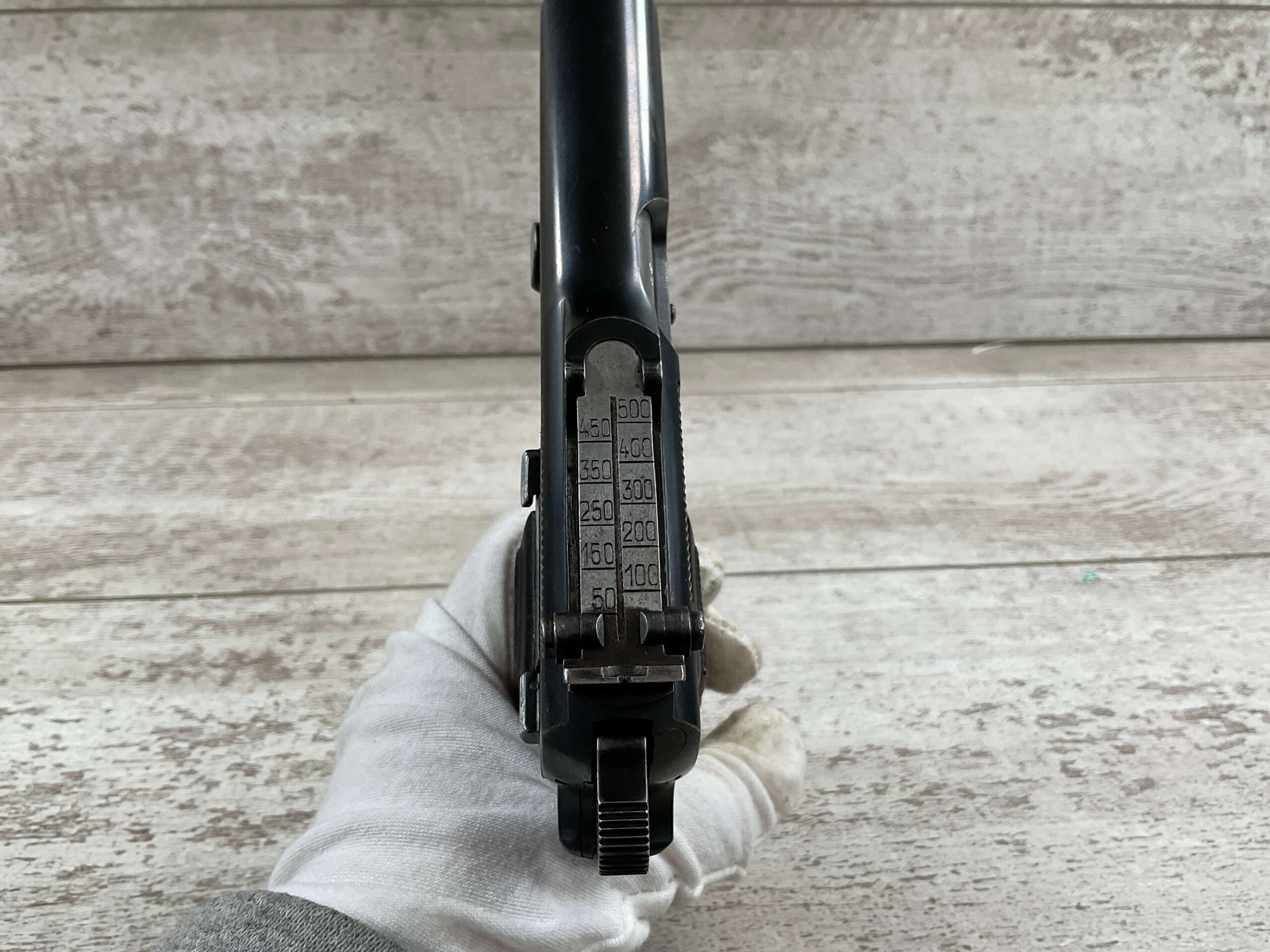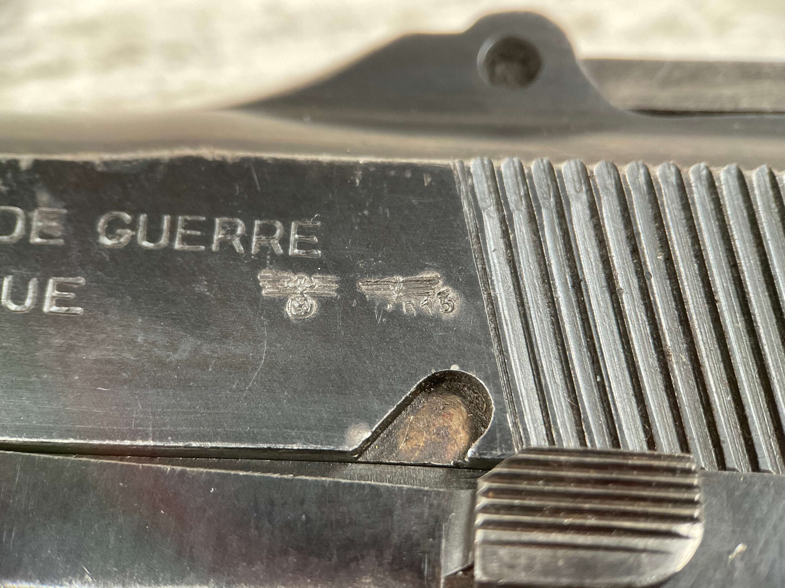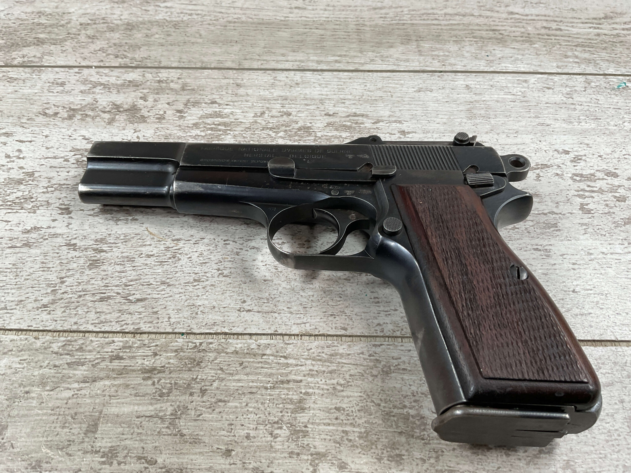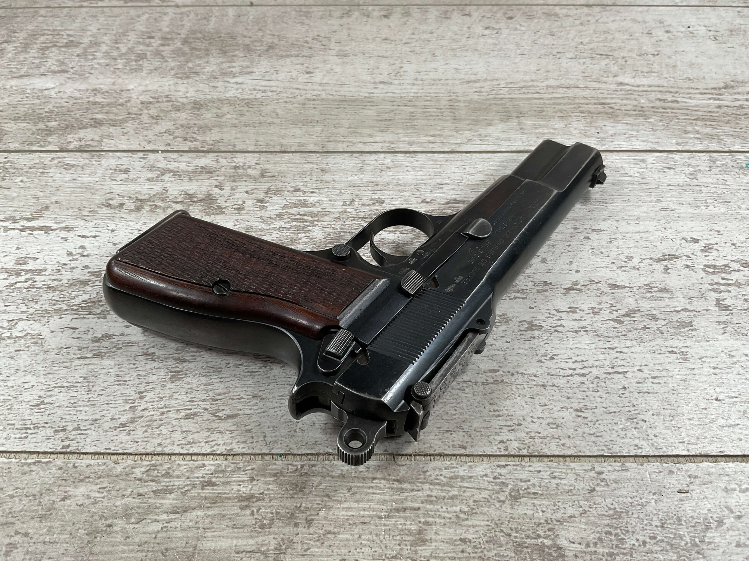 FN BROWNING HI POWER 9MM NAZI MARKED PISTOL RIG #55255, 9MM, 90% BLUE W/ HIGH EDGE WEAR, FRONT GRIP STRAP AND TRIGGER GUARD SHOW THINNING, VG CHECKERED WOODEN GRIPS (RED INSIDE), 4 5/8″ BARREL, TANGENT REAR SIGHT, WaA613 PROOF MARKED SLIDE & FRAME & BARREL (BBL ALSO HAS WaA613), ALL MATCHING, BRIGHT BORE W/GOOD RIFLING & PITTING THROUGHOUT, 2 PERIOD CORRECT MAGAZINE (NO MARKINGS), MAGAZINE SAFETY, EXC DARK BROWN/BLACK HOLSTER “CGN/42” & “EAGLE GLOBE/WaA920” UNDER FRONT CLOSURE FLAP, STITCHING IS VG, VG-EXC OVERALL 90+%