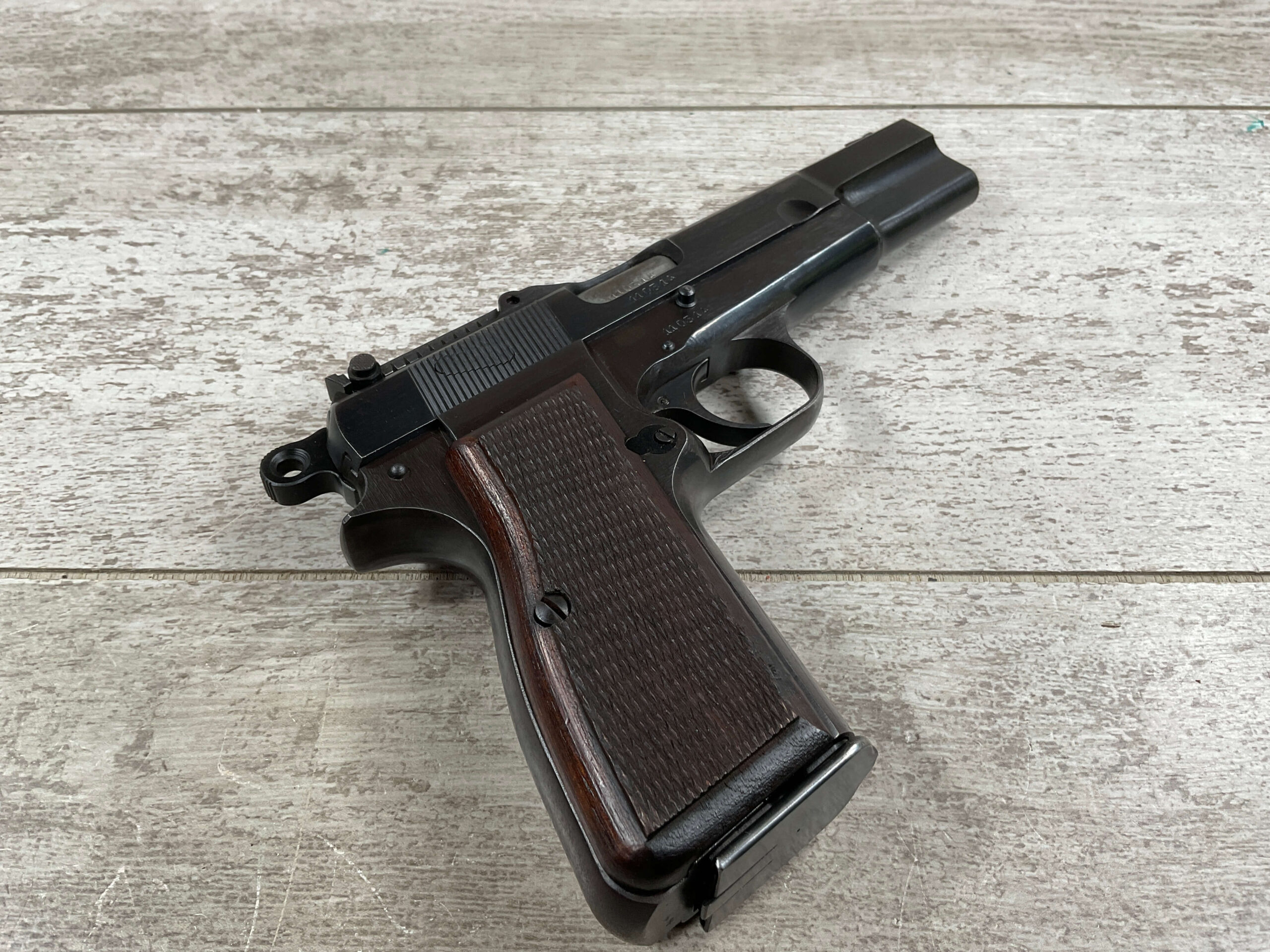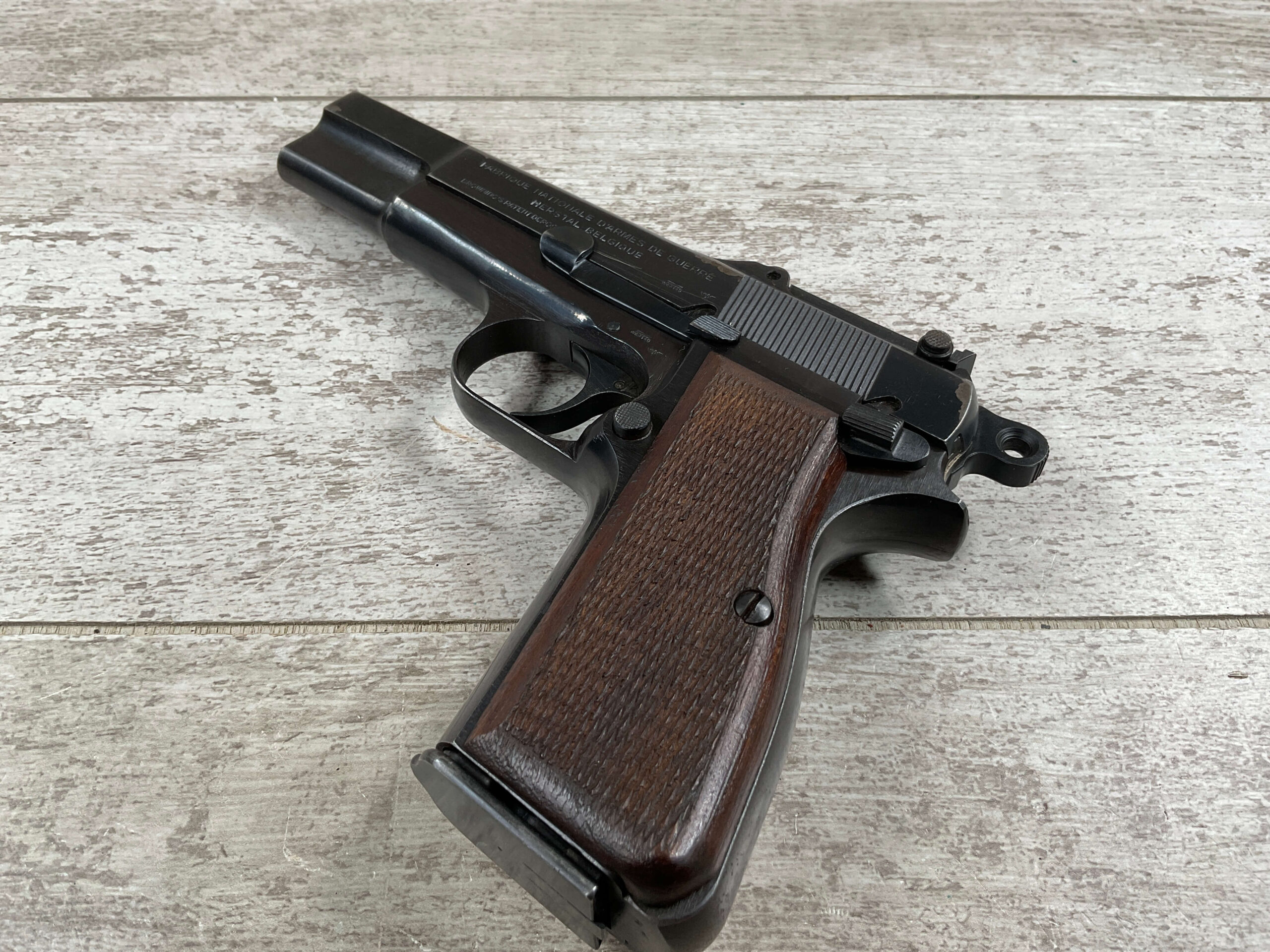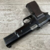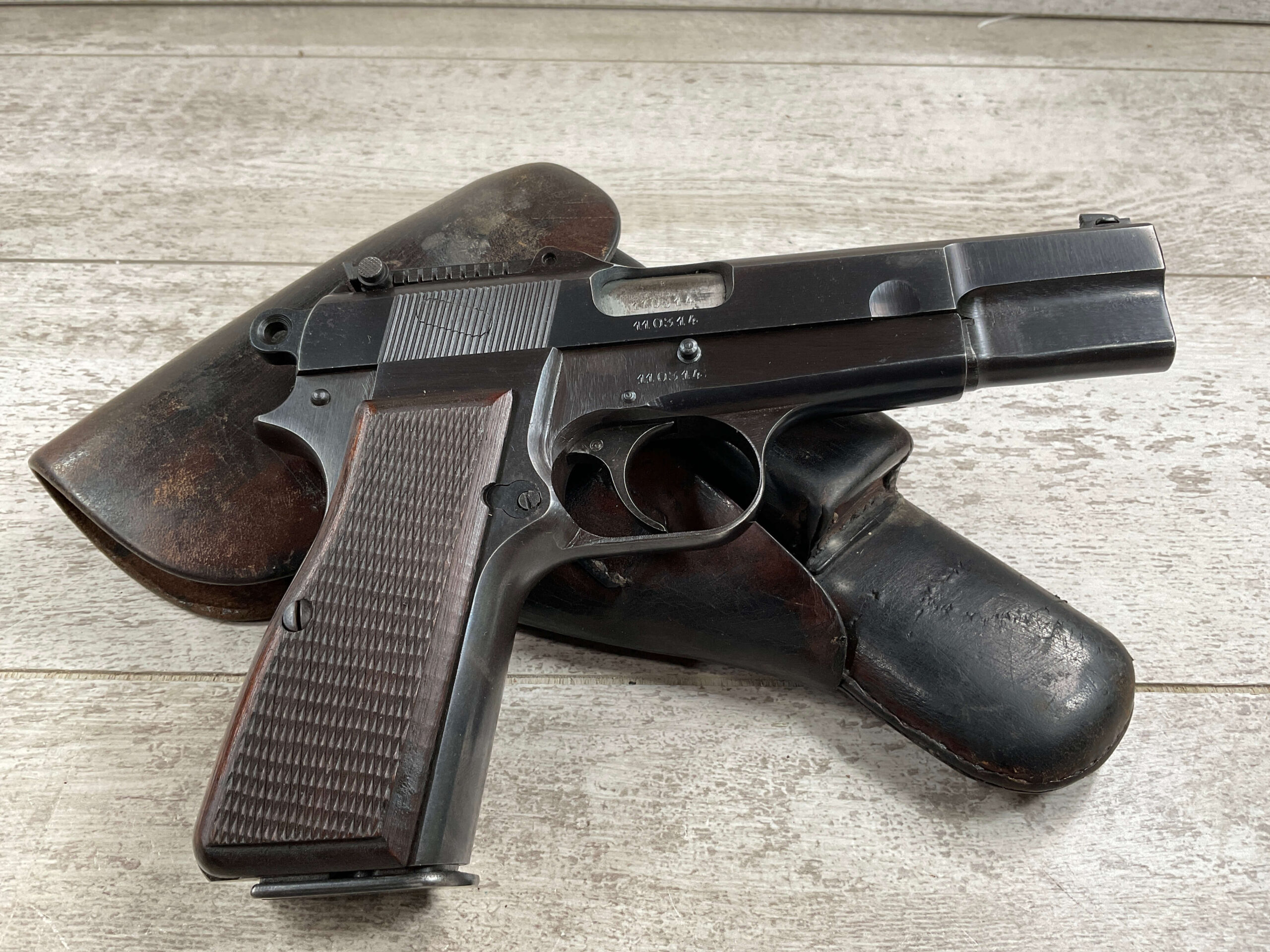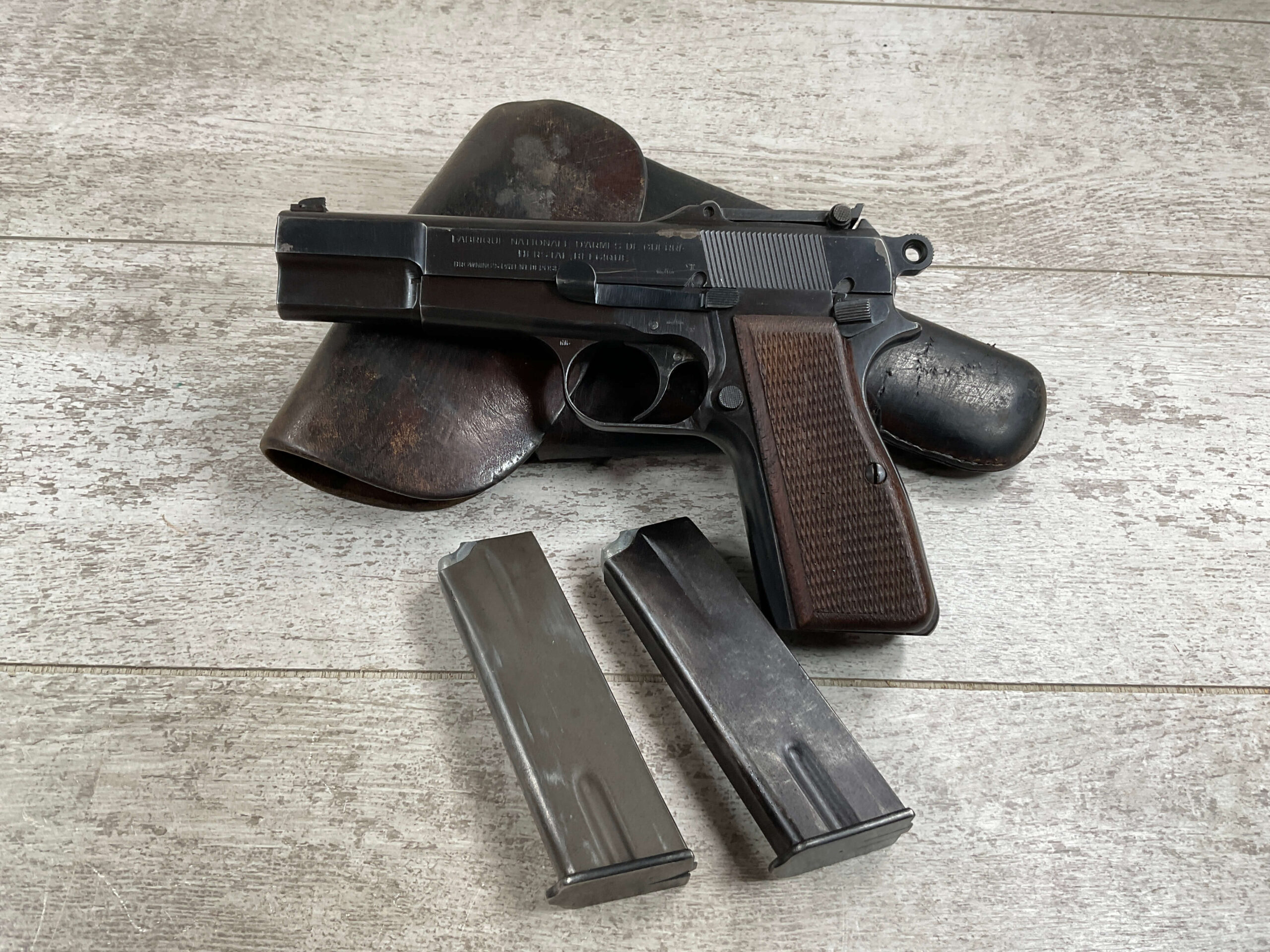 FN BROWNING HI POWER 9MM NAZI MARKED PISTOL RIG #110314, 9MM, 97+% BLUE W/ HIGH EDGE WEAR & SCRATCHES ON SLIDE FROM SLIDE RELEASE ALONG WITH 2 SPOTS OF LIGHT OXIDATION ON THE SLIDE, EXC CHECKERED WOODEN GRIPS, 4 5/8″ BARREL, TANGENT REAR SIGHT, WaA140 PROOF MARKED SLIDE/FRAME & BARREL (BBL ALSO HAS WaA140 & WaA103), ALL MATCHING, VG BRIGHT BORE W/GOOD RIFLING W/SCATTERED LIGHT FROSTING IN GROOVES, 2 WaA MARKED SPLIT TAIL MAGAZINES ONE WITH WaA140 THE OTHER WaA613, MAGAZINE SAFETY, EXC DARK BROWN HOLSTER “CGN/43” & “EAGLE GLOBE/WaA920” UNDER FRONT CLOSURE FLAP, STITCHING IS VG, EXC OVERALL 95+%
