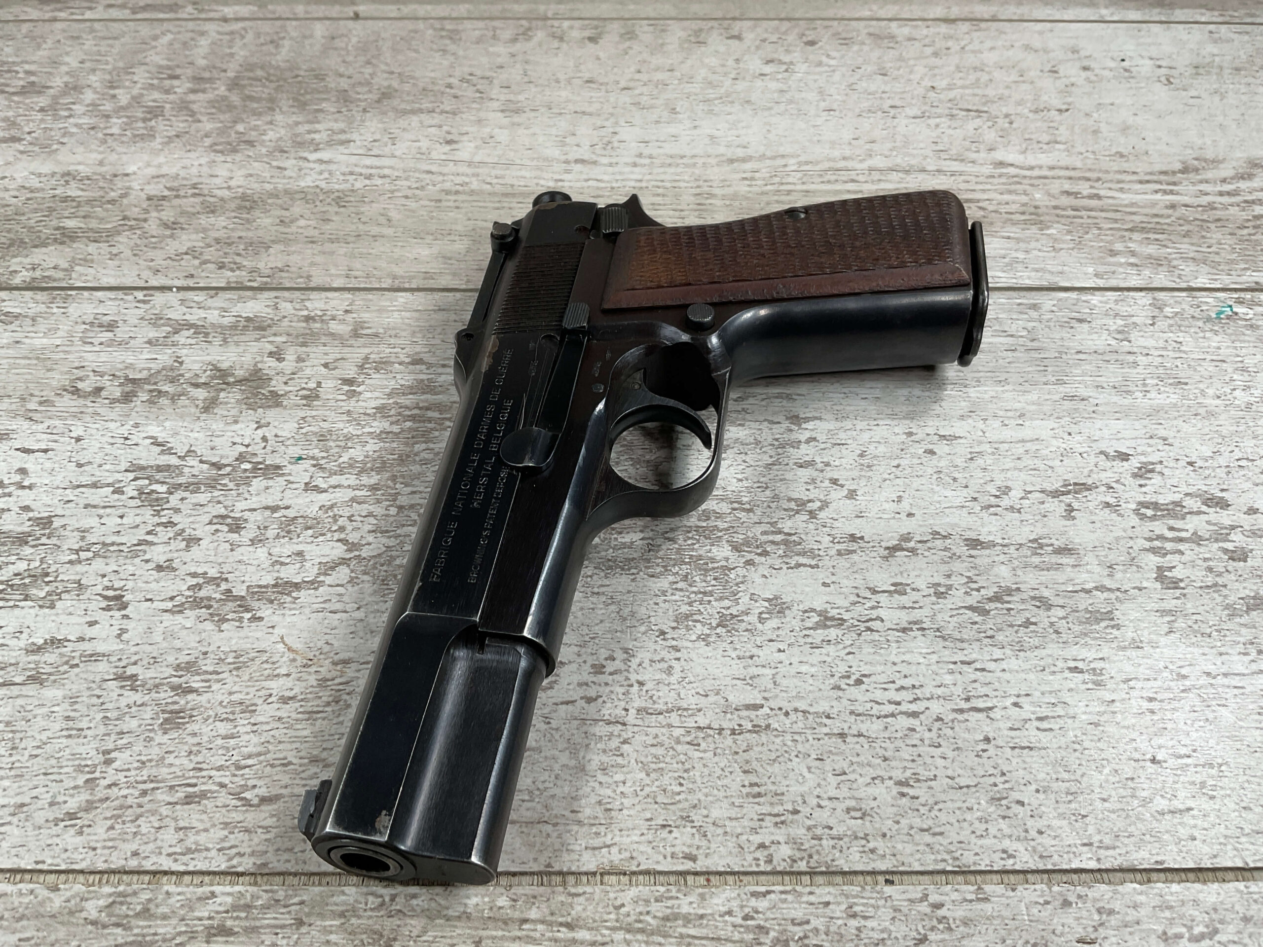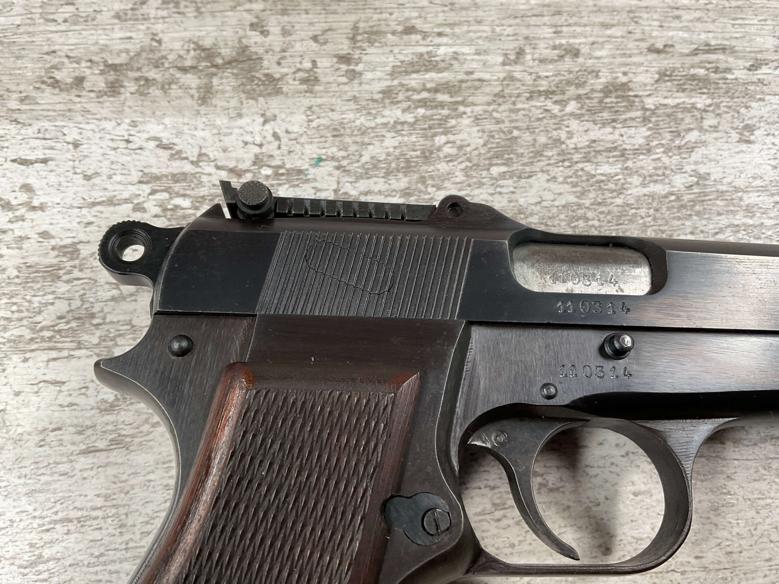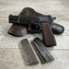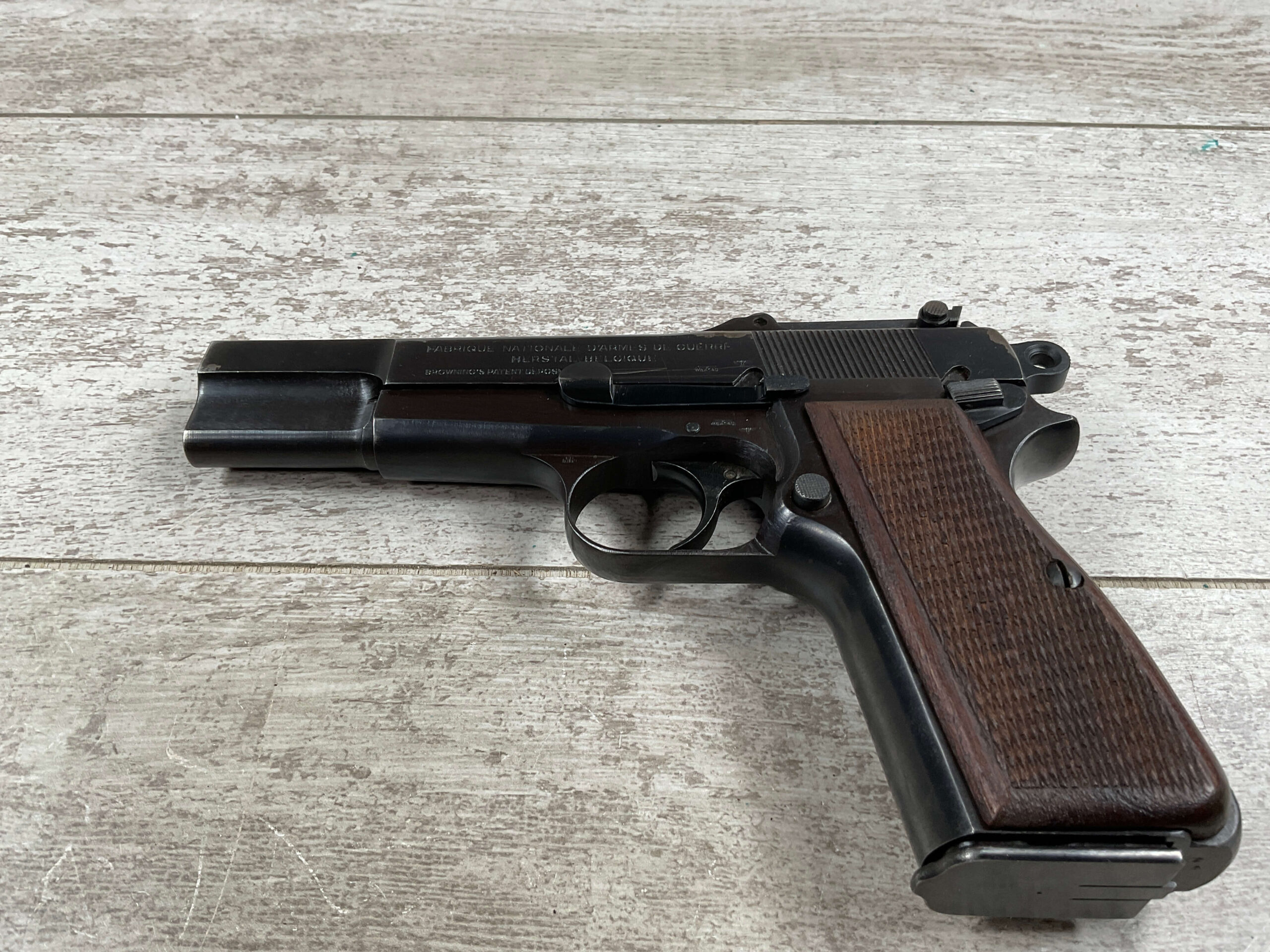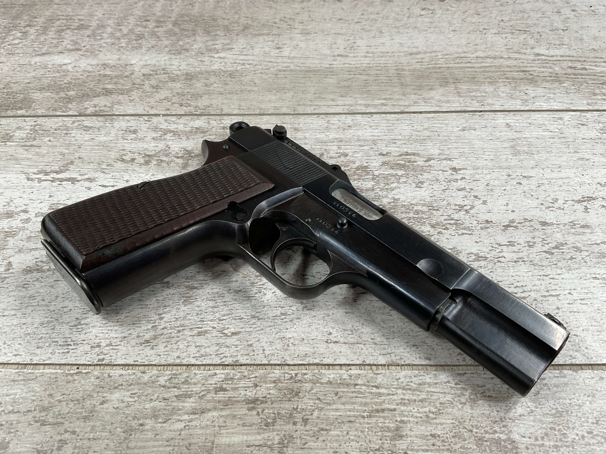 FN BROWNING HI POWER 9MM NAZI MARKED PISTOL RIG #110314, 9MM, 97+% BLUE W/ HIGH EDGE WEAR & SCRATCHES ON SLIDE FROM SLIDE RELEASE ALONG WITH 2 SPOTS OF LIGHT OXIDATION ON THE SLIDE, EXC CHECKERED WOODEN GRIPS, 4 5/8″ BARREL, TANGENT REAR SIGHT, WaA140 PROOF MARKED SLIDE/FRAME & BARREL (BBL ALSO HAS WaA140 & WaA103), ALL MATCHING, VG BRIGHT BORE W/GOOD RIFLING W/SCATTERED LIGHT FROSTING IN GROOVES, 2 WaA MARKED SPLIT TAIL MAGAZINES ONE WITH WaA140 THE OTHER WaA613, MAGAZINE SAFETY, EXC DARK BROWN HOLSTER “CGN/43” & “EAGLE GLOBE/WaA920” UNDER FRONT CLOSURE FLAP, STITCHING IS VG, EXC OVERALL 95+%