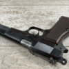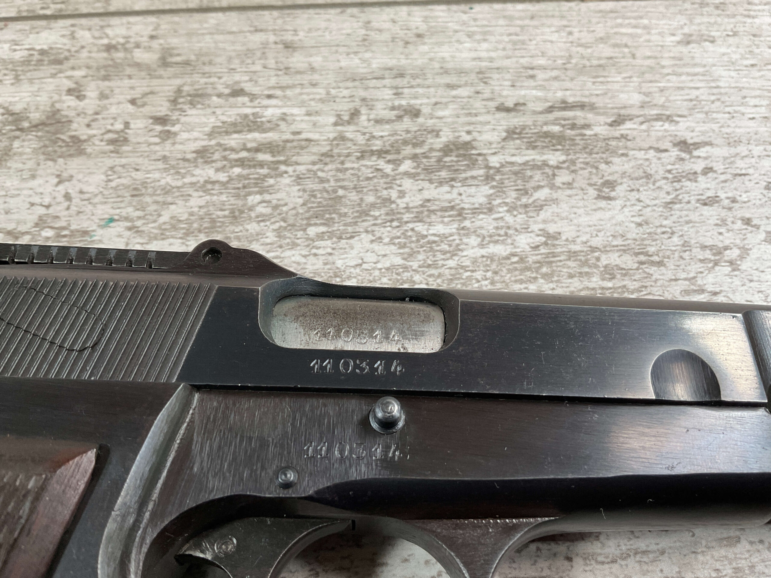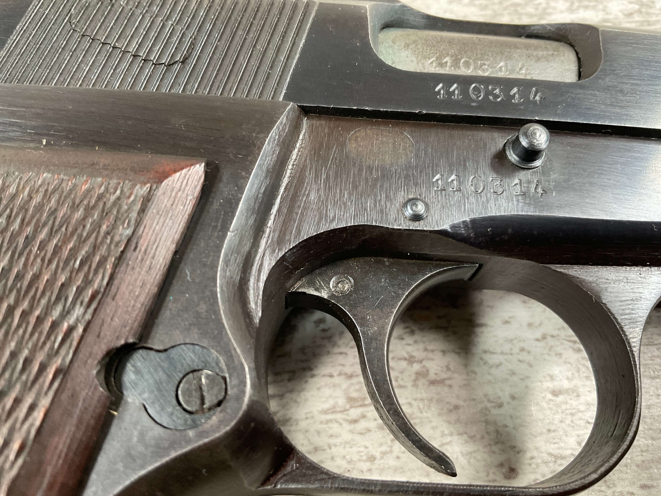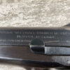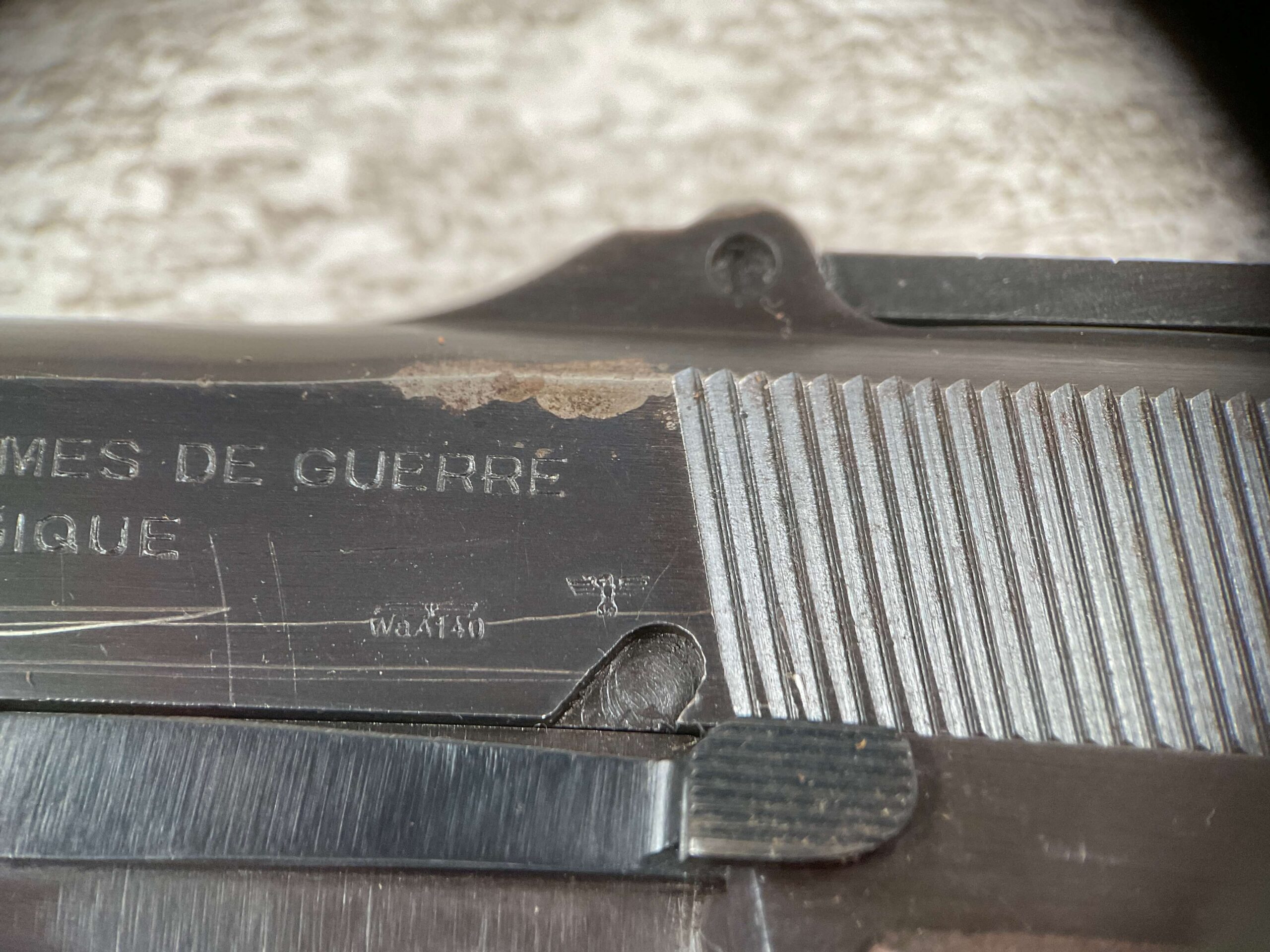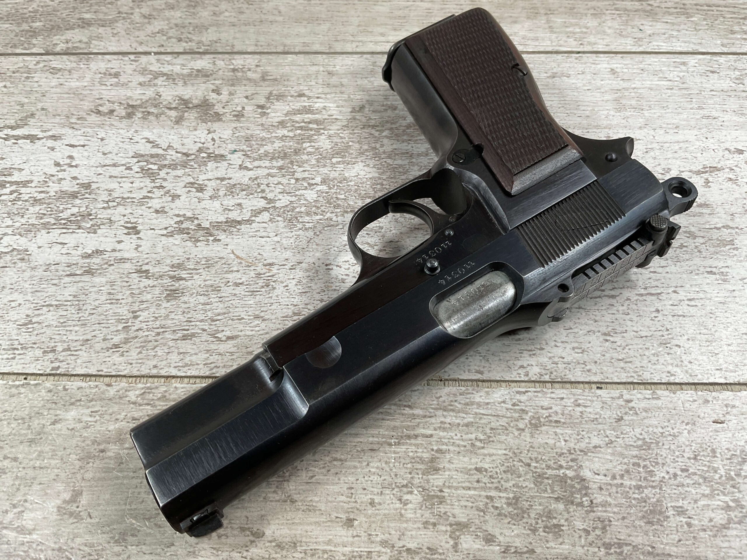 FN BROWNING HI POWER 9MM NAZI MARKED PISTOL RIG #110314, 9MM, 97+% BLUE W/ HIGH EDGE WEAR & SCRATCHES ON SLIDE FROM SLIDE RELEASE ALONG WITH 2 SPOTS OF LIGHT OXIDATION ON THE SLIDE, EXC CHECKERED WOODEN GRIPS, 4 5/8″ BARREL, TANGENT REAR SIGHT, WaA140 PROOF MARKED SLIDE/FRAME & BARREL (BBL ALSO HAS WaA140 & WaA103), ALL MATCHING, VG BRIGHT BORE W/GOOD RIFLING W/SCATTERED LIGHT FROSTING IN GROOVES, 2 WaA MARKED SPLIT TAIL MAGAZINES ONE WITH WaA140 THE OTHER WaA613, MAGAZINE SAFETY, EXC DARK BROWN HOLSTER “CGN/43” & “EAGLE GLOBE/WaA920” UNDER FRONT CLOSURE FLAP, STITCHING IS VG, EXC OVERALL 95+%