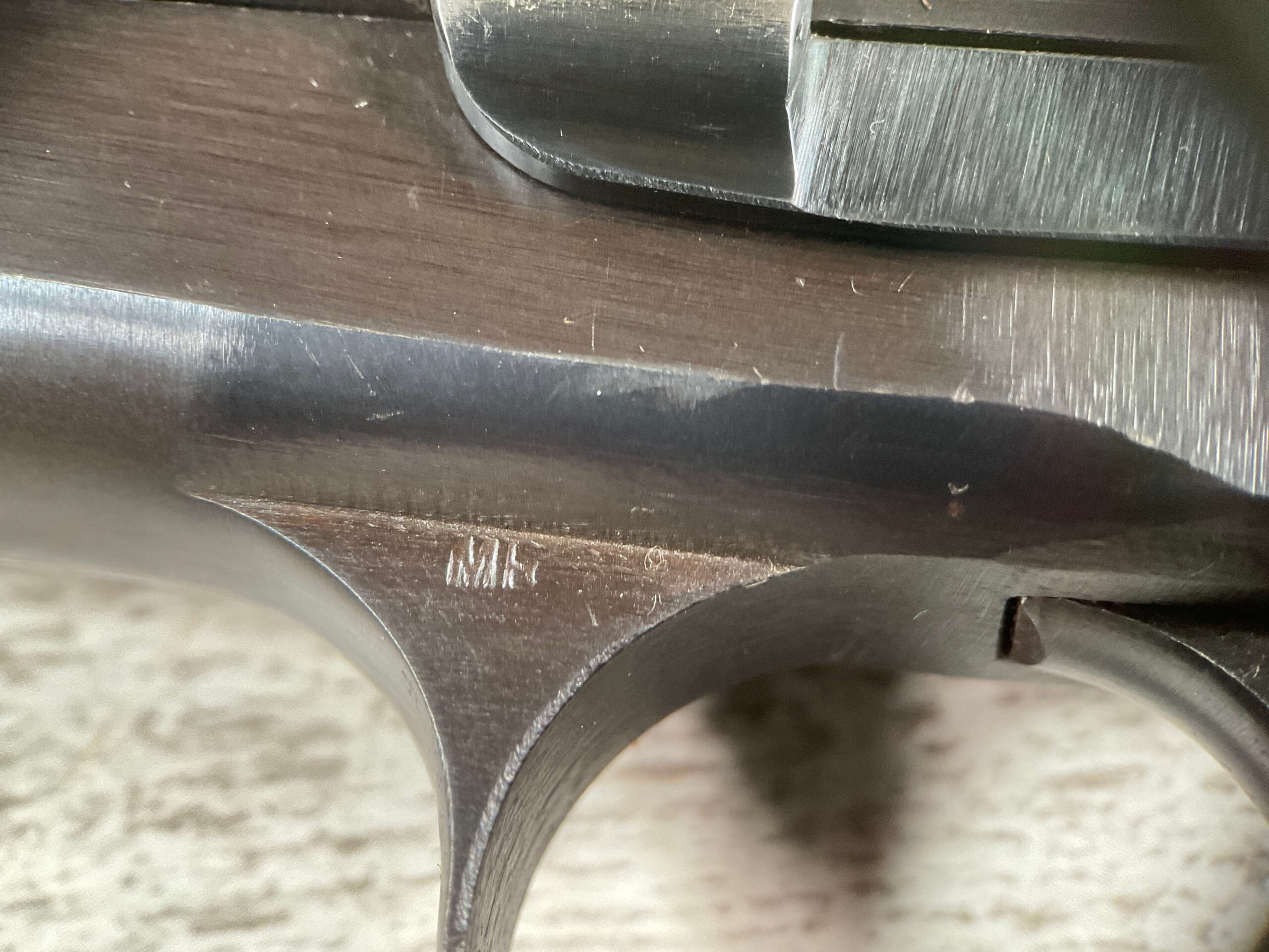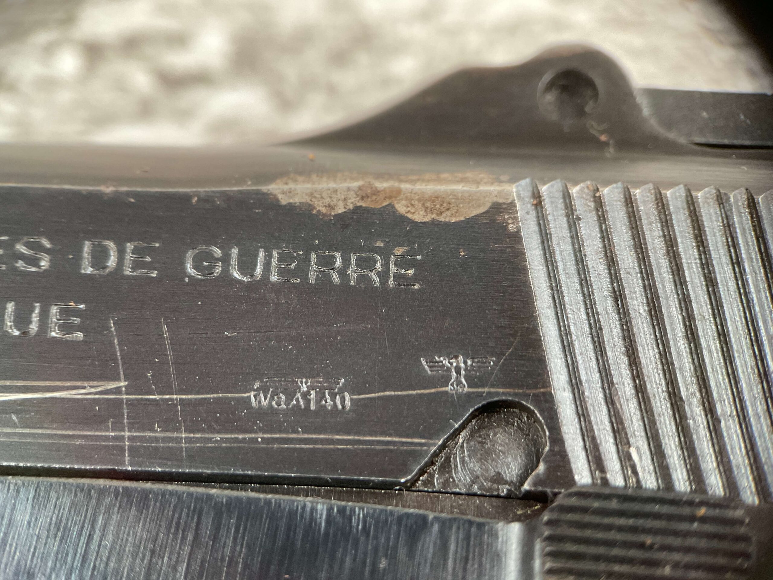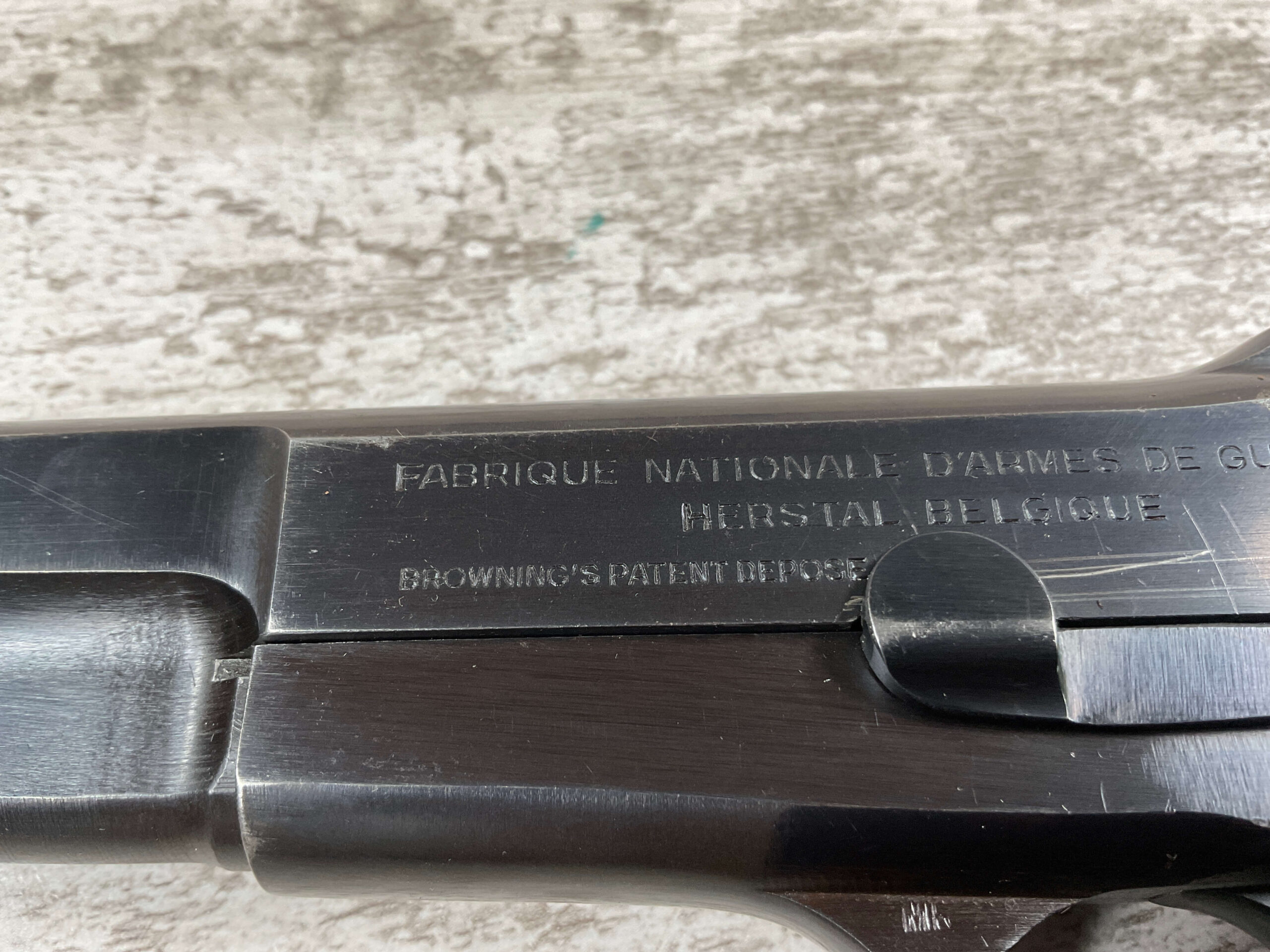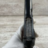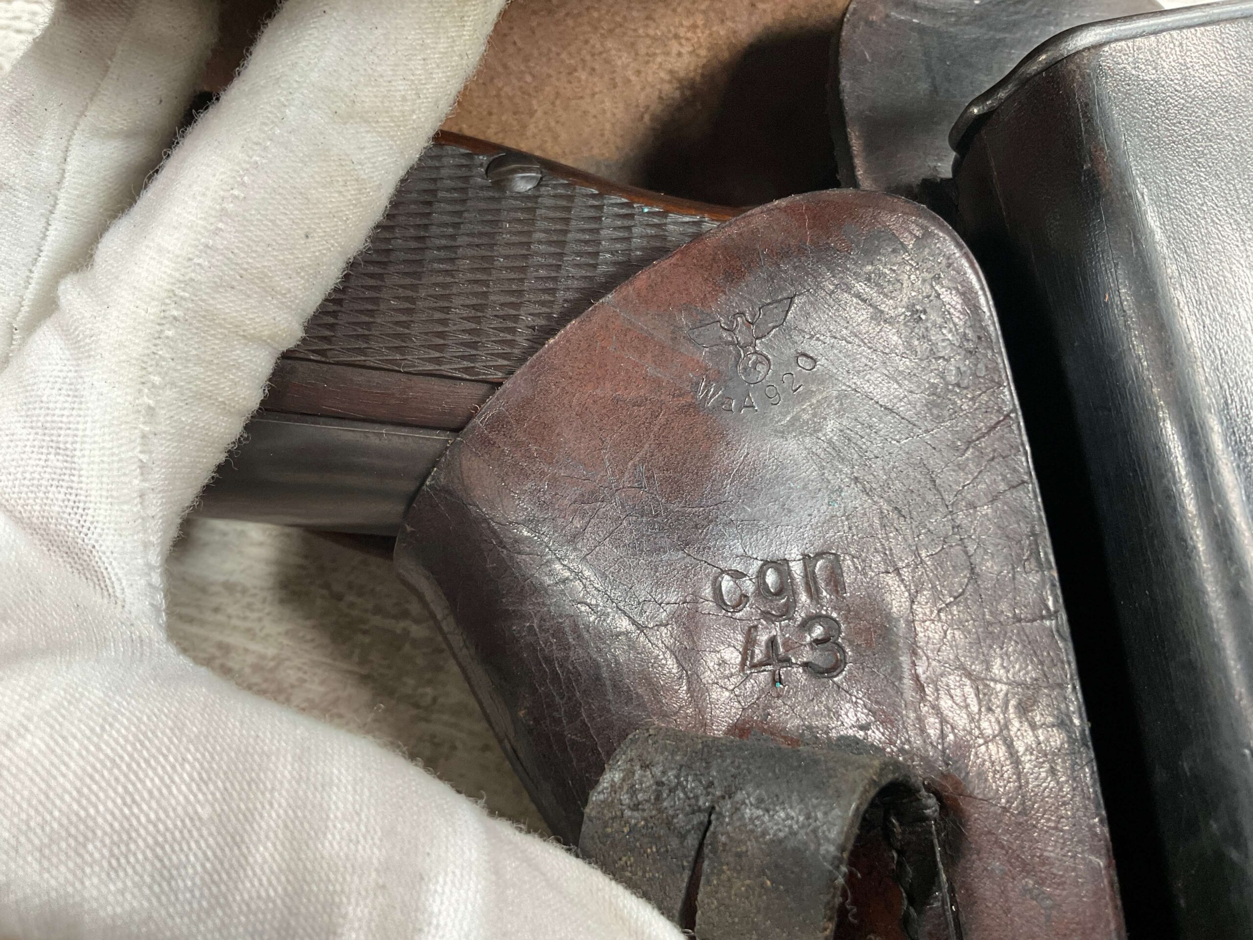 FN BROWNING HI POWER 9MM NAZI MARKED PISTOL RIG #110314, 9MM, 97+% BLUE W/ HIGH EDGE WEAR & SCRATCHES ON SLIDE FROM SLIDE RELEASE ALONG WITH 2 SPOTS OF LIGHT OXIDATION ON THE SLIDE, EXC CHECKERED WOODEN GRIPS, 4 5/8″ BARREL, TANGENT REAR SIGHT, WaA140 PROOF MARKED SLIDE/FRAME & BARREL (BBL ALSO HAS WaA140 & WaA103), ALL MATCHING, VG BRIGHT BORE W/GOOD RIFLING W/SCATTERED LIGHT FROSTING IN GROOVES, 2 WaA MARKED SPLIT TAIL MAGAZINES ONE WITH WaA140 THE OTHER WaA613, MAGAZINE SAFETY, EXC DARK BROWN HOLSTER “CGN/43” & “EAGLE GLOBE/WaA920” UNDER FRONT CLOSURE FLAP, STITCHING IS VG, EXC OVERALL 95+%