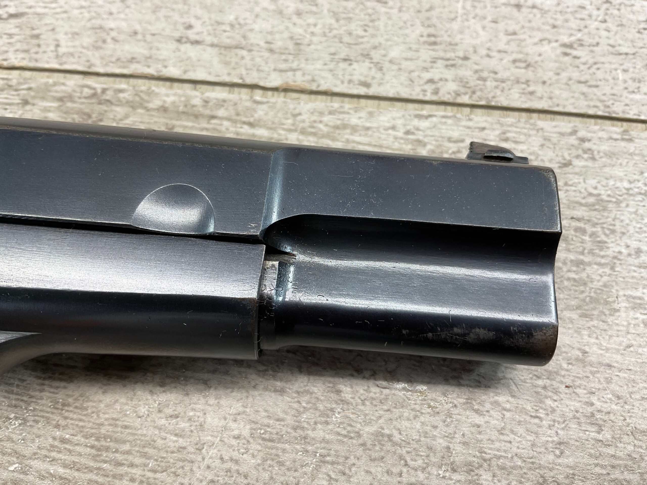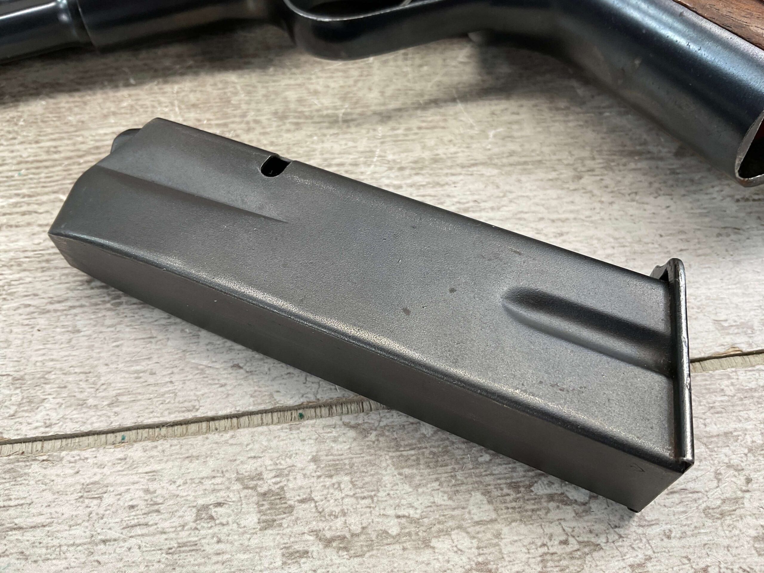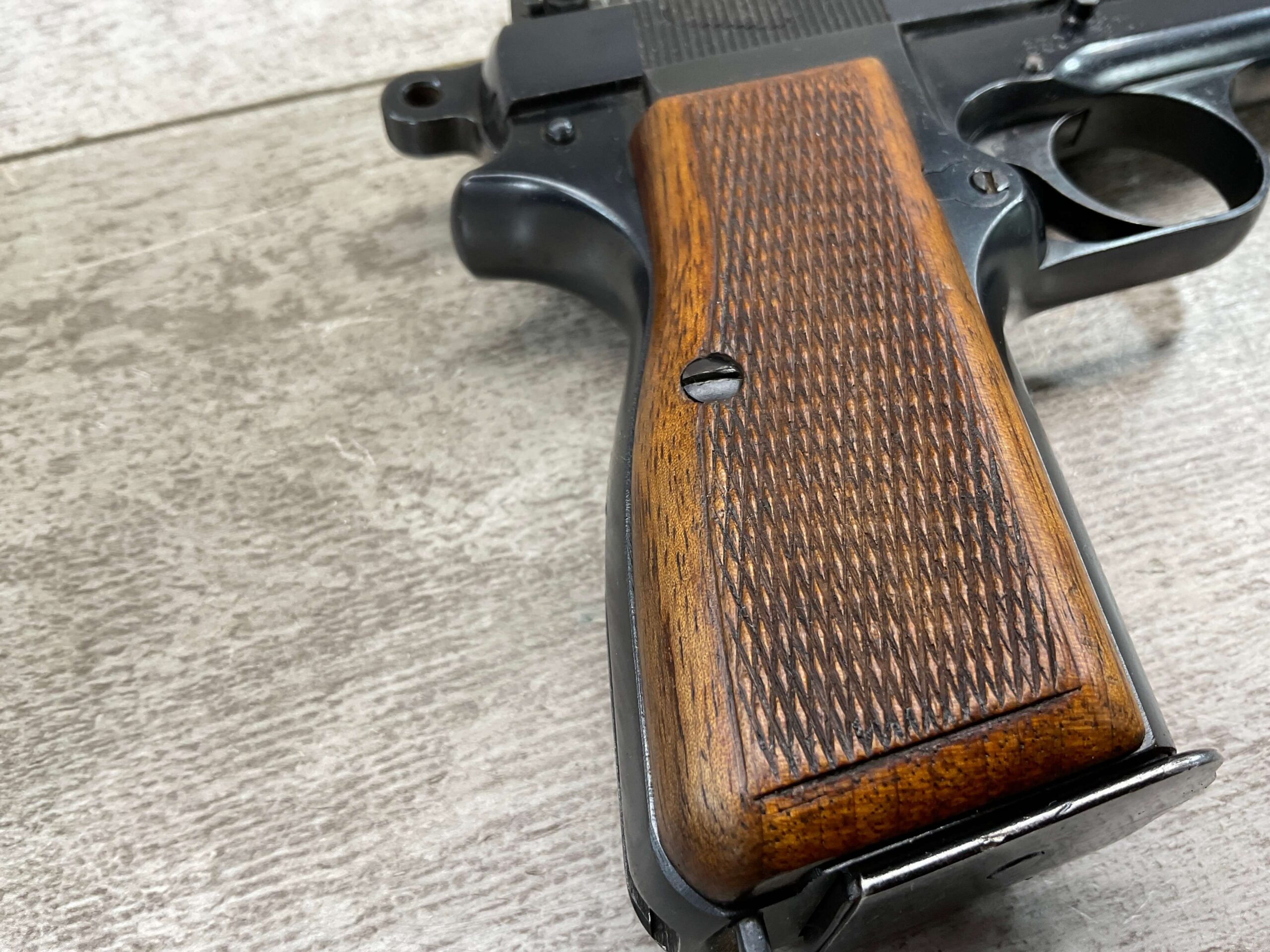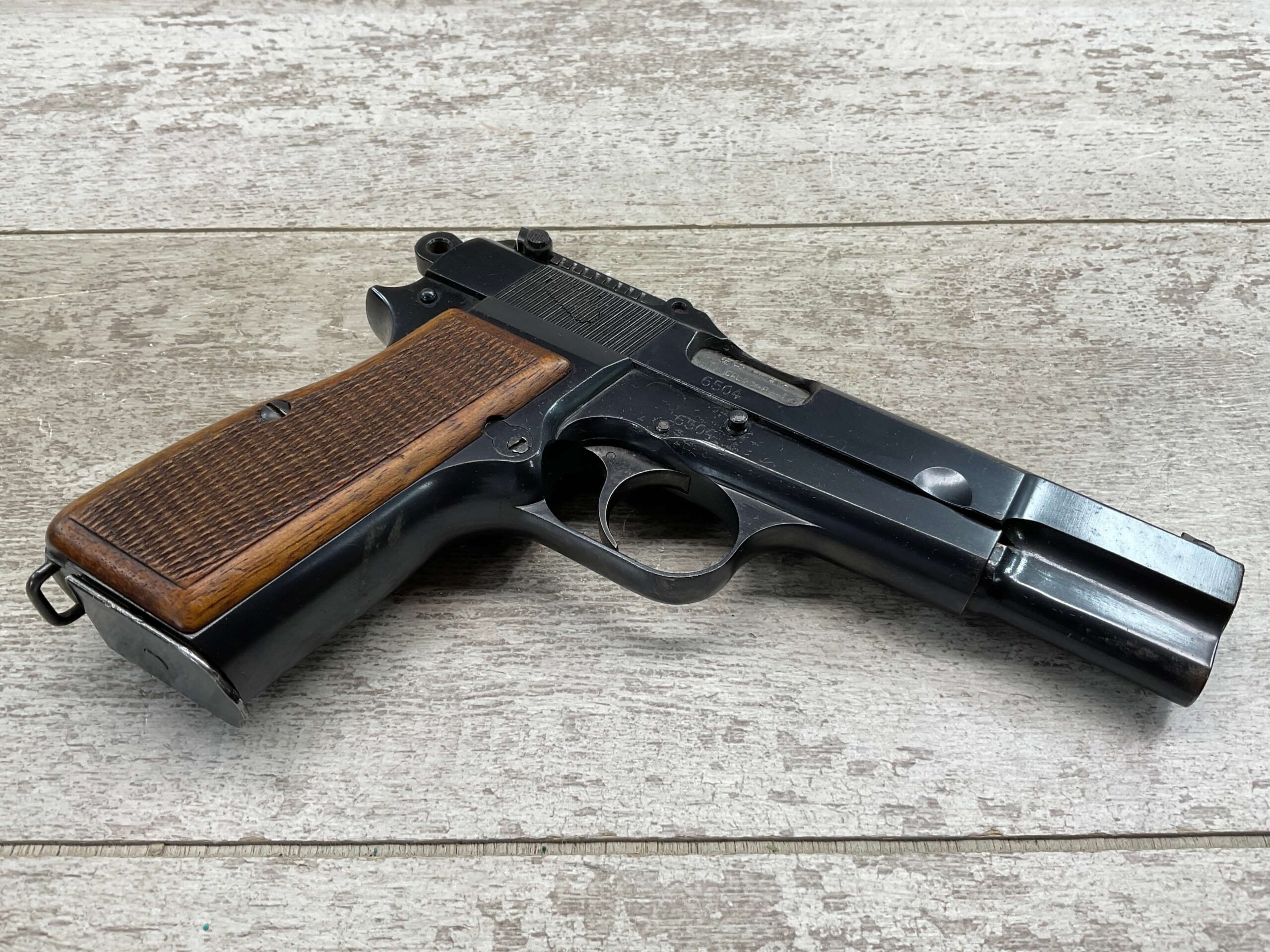 FN BROWNING HI POWER LITHUANIAN 9MM SEMI AUTO PISTOL #6504, 9MM, 98%+ BLUE W/ ONE AREA ON FRONT GRIP STRAP OF FINISH LOSS, EXC CHECKERED WOODEN GRIPS, 4 5/8″ BARREL, TANGENT REAR SIGHT, TOP OF SLIDE BEARS THE LITHUANIAN “PILLARS OF GEDIMINAS” CREST, ALL MATCHING, GOOD BORE W/GOOD RIFLING W/SCATTERED LIGHT FROSTING/OXIDATION PRESENT, ONE ORIGINAL MAGAZINE, MAGAZINE SAFETY, SLOTTED BACKSTRAP, EXC OVERALL 95%+