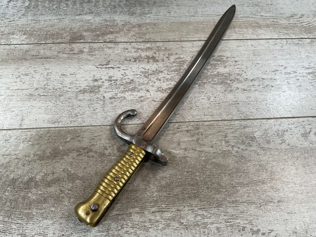 FRENCH M1866 CHASSEPOT SWORD BAYONET, NO SCABBARD, BRASS TANG AND GRIP, METAL SPRING BLADE RELEASE, NO RICASSO MARKINGS, OR REMOVED, SINGLE-EDGE BLADE, FULLERED ON BOTH SIDES, RE-CURVED OR YATAGHAN SHAPE, 14 ¾” BLADE LENGTH, OVERALL 19 ¾”, CROSS GUARD W/ SCREW-TYPE MUZZLE-RING TIGHTENING, STAMPED “X” “37360” HAND GUARD STAMPED WITH “STAR SHAPE” OVER “O”, REVERSE CROSS GUARD “H” “155”, VERY GOOD/GOOD CONDITION