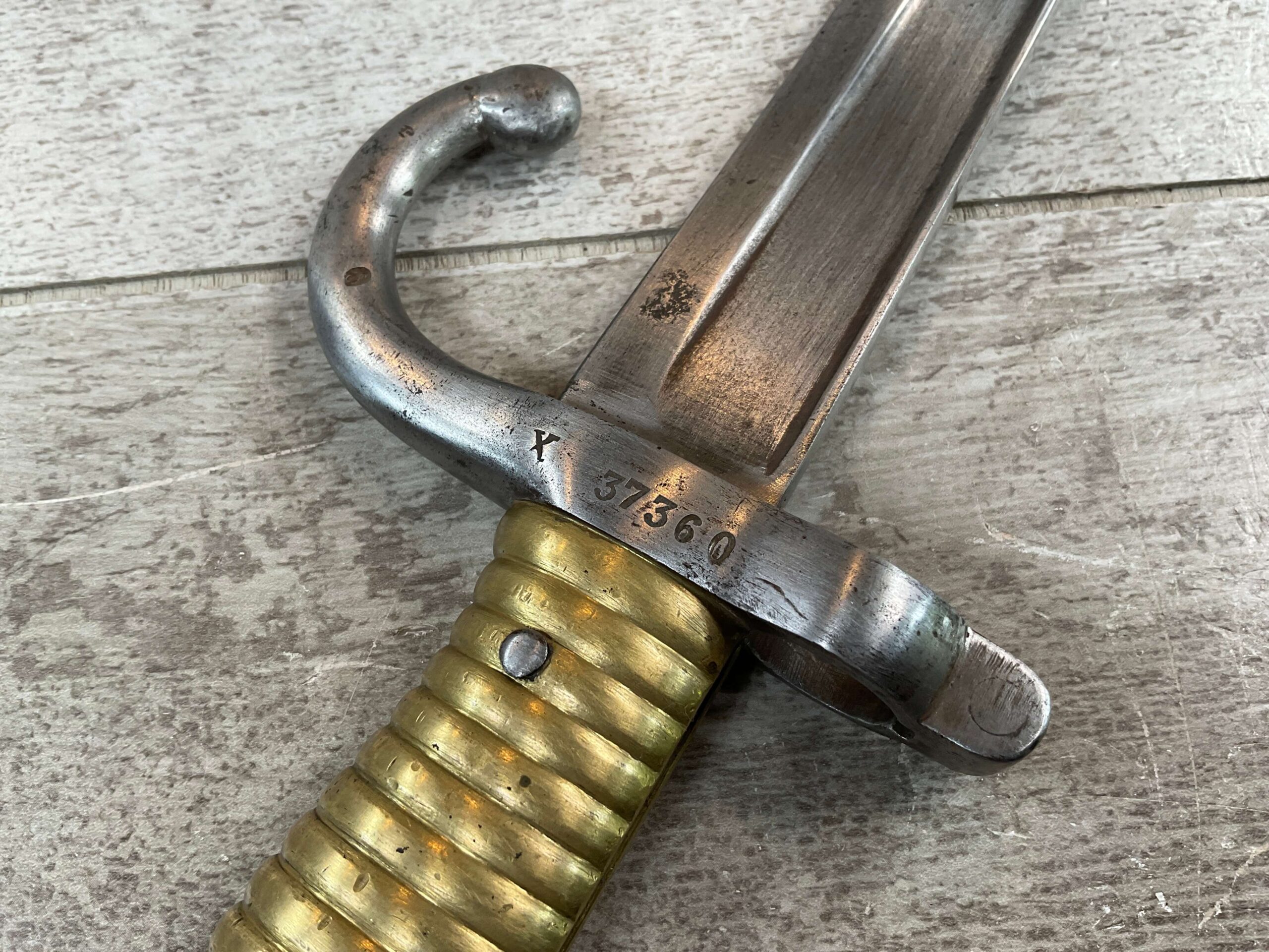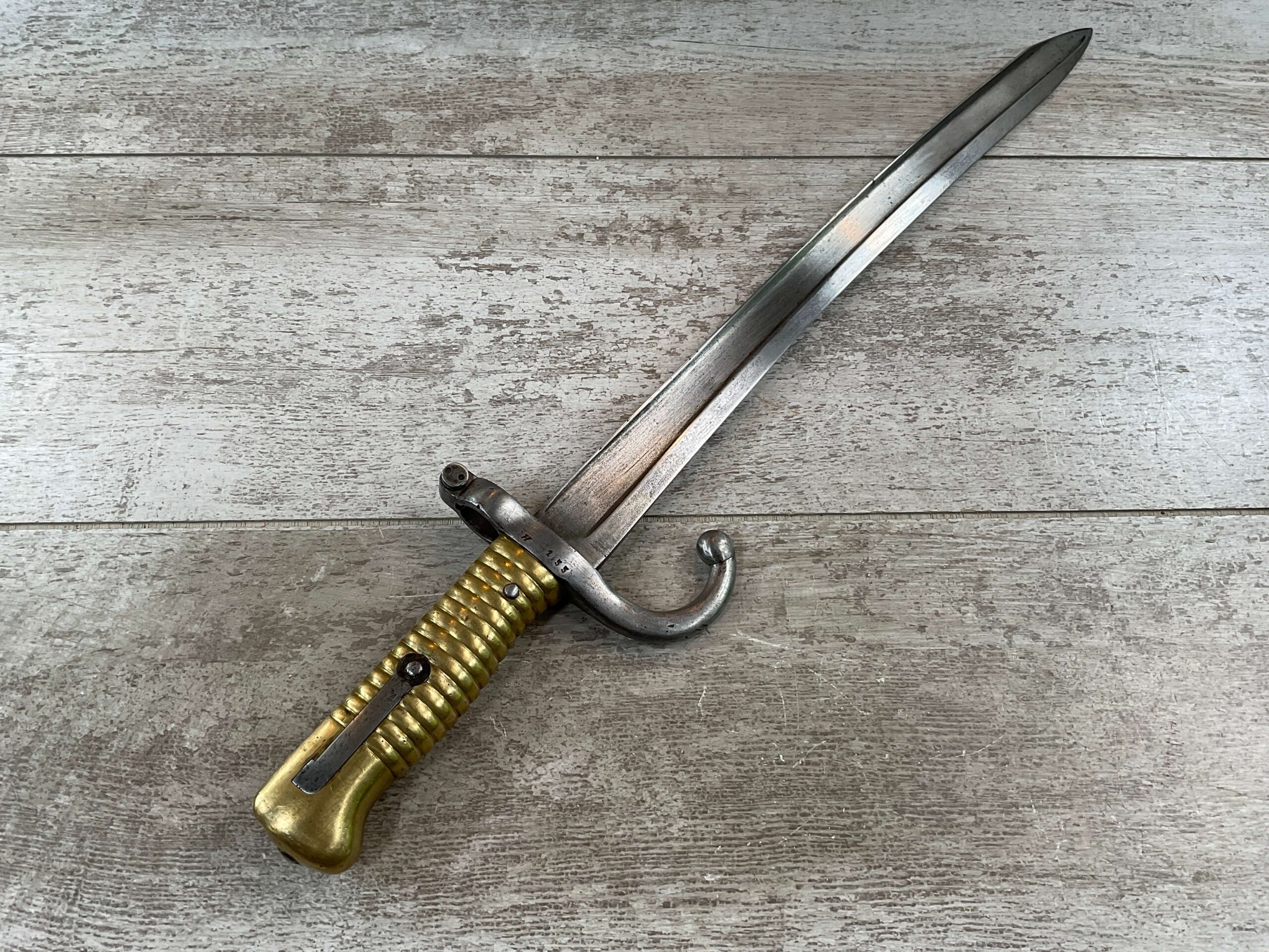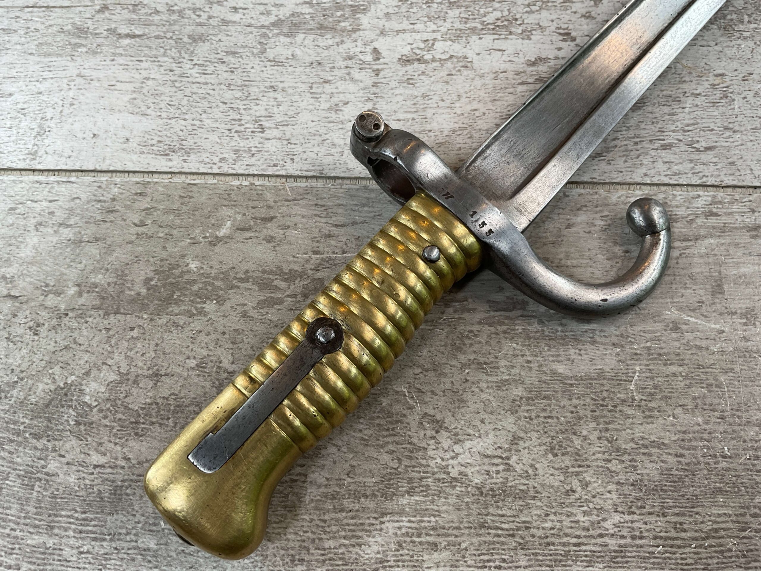 FRENCH M1866 CHASSEPOT SWORD BAYONET, NO SCABBARD, BRASS TANG AND GRIP, METAL SPRING BLADE RELEASE, NO RICASSO MARKINGS, OR REMOVED, SINGLE-EDGE BLADE, FULLERED ON BOTH SIDES, RE-CURVED OR YATAGHAN SHAPE, 14 ¾” BLADE LENGTH, OVERALL 19 ¾”, CROSS GUARD W/ SCREW-TYPE MUZZLE-RING TIGHTENING, STAMPED “X” “37360” HAND GUARD STAMPED WITH “STAR SHAPE” OVER “O”, REVERSE CROSS GUARD “H” “155”, VERY GOOD/GOOD CONDITION