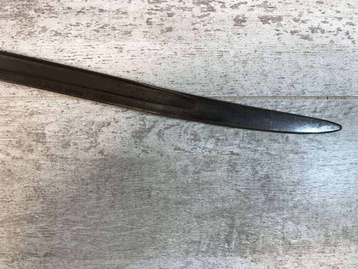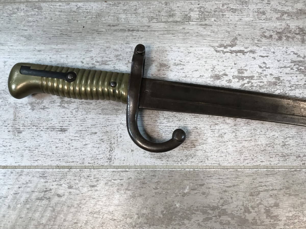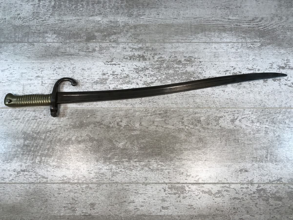 SKU#826 FRENCH MODEL 1866 CHASSEPOT YATAGHAN SWORD BAYONET, NO SCABBARD, FOR THE M1866 CHASSEPOT NEEDLE-FIRE RIFLE, BRASS-HILTED, SPRING STEEL LATCH, DOUBLE CURVE SHAPE, 27 3/16″ OVERALL, 22 3/8″ BLADE, VG OVERALL CONDITION