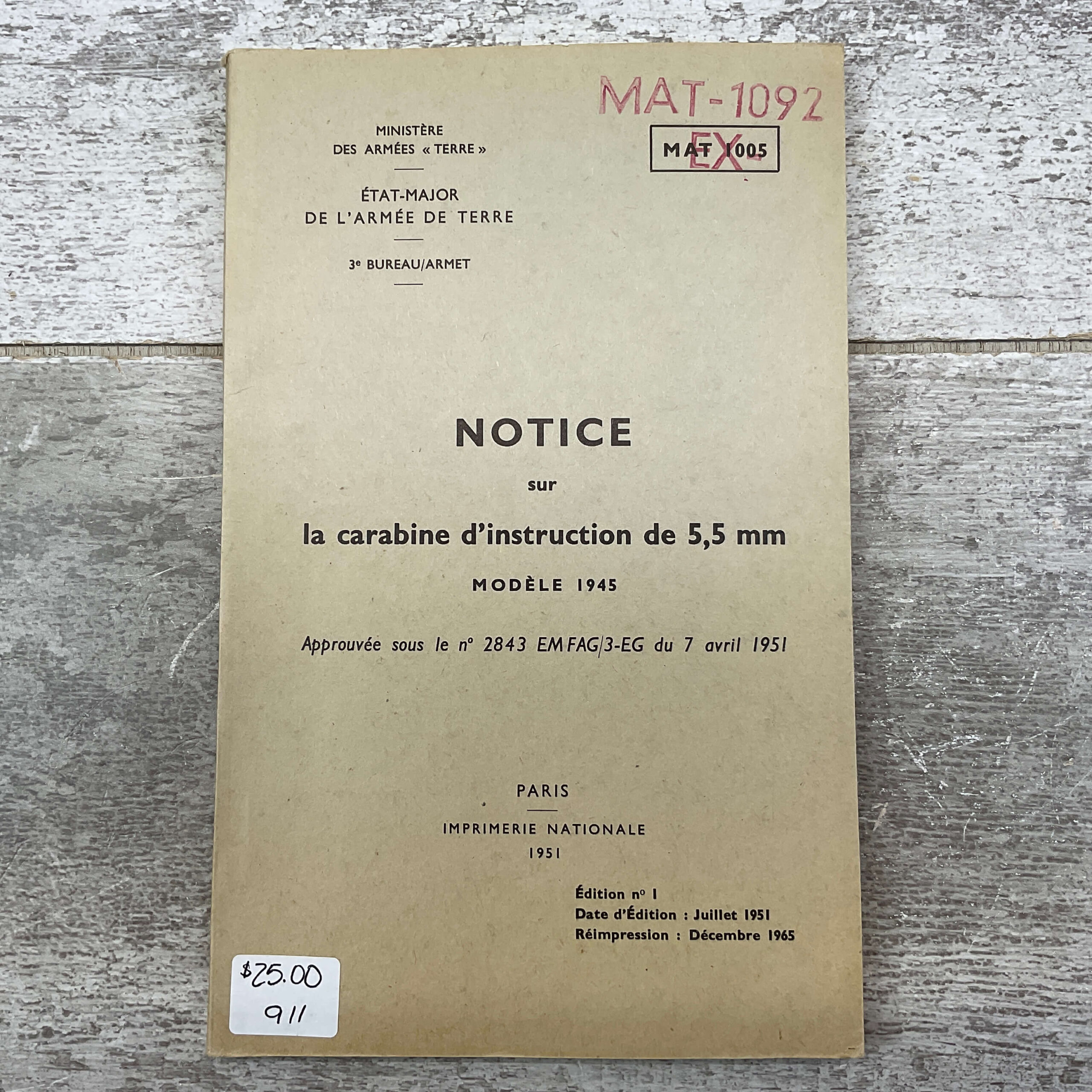 FRENCH MODELE 1945 .22 TRAINER ORIGINAL MANUAL #911-PF