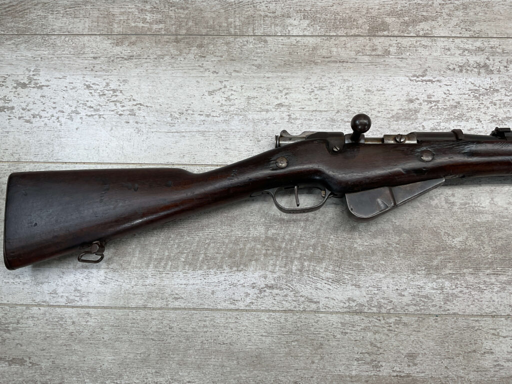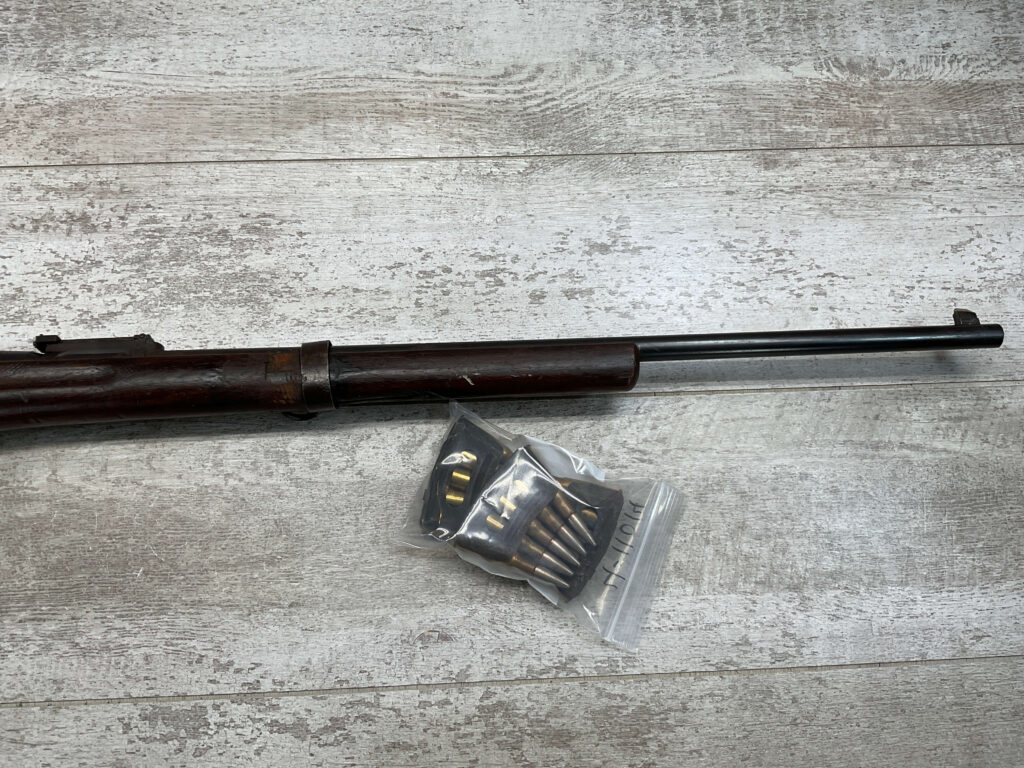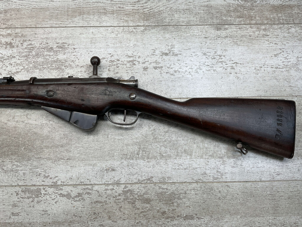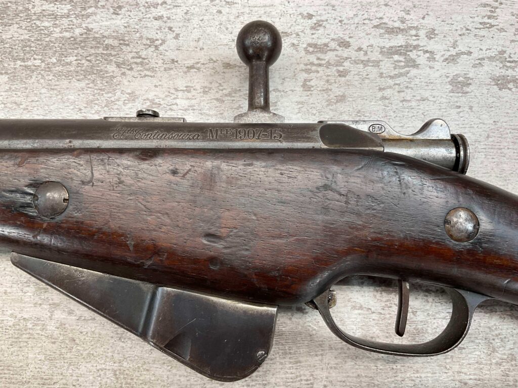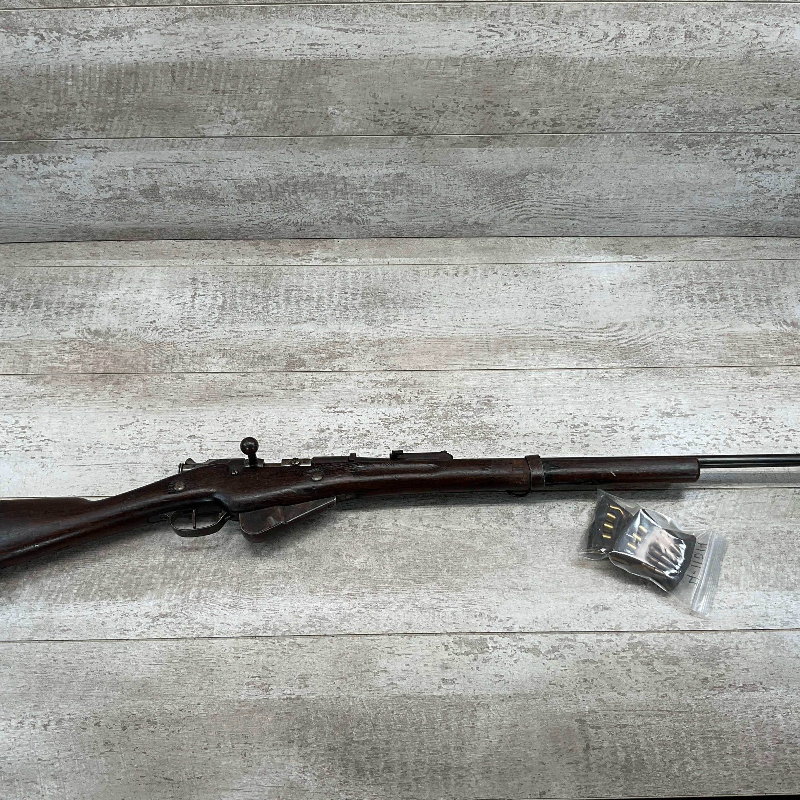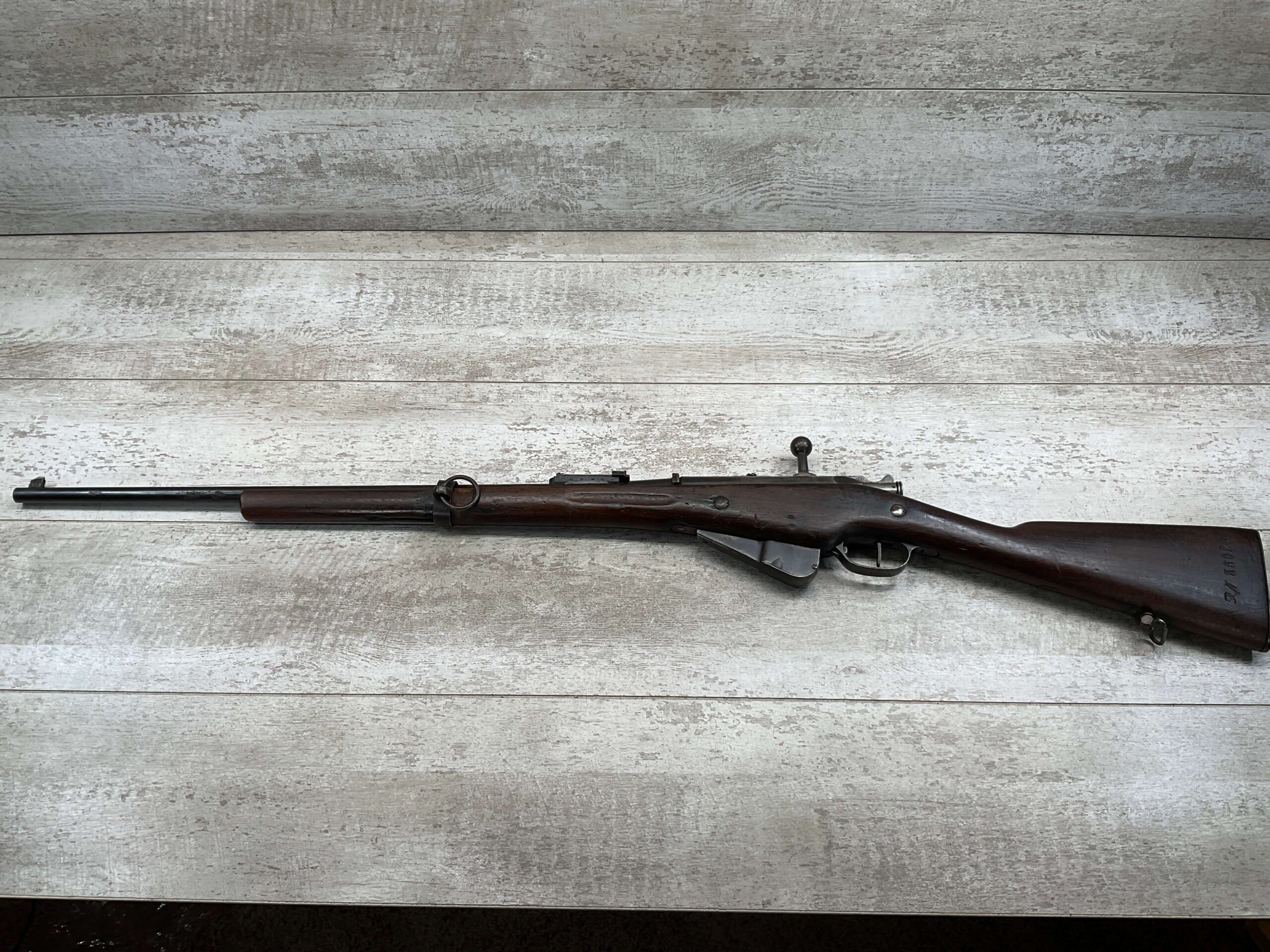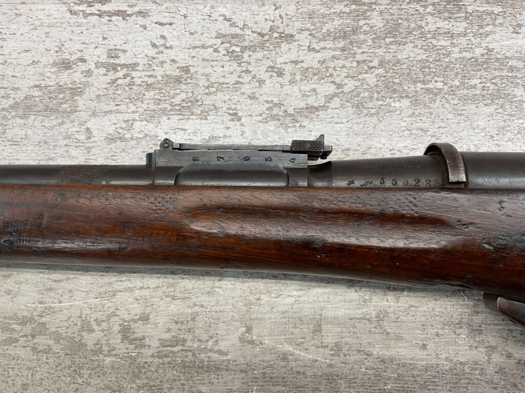 FRENCH/TURKISH M1907/15 8MM LEBEL BOLT ACTION RIFLE #35028 “ST. ETIENNE MLE-1907-15†MARKED ON THE LEFT SIDE OF THE RECEIVER, ALL SERIAL NUMBER MATCH EXCEPT FOR THE REAR SIGHT, NO VISIBLE IMPORT MARK, DARK BORE & FAIR RIFLING, SPORTERIZED STOCK W/NICKS & DINGS, EXC MECHANICALLY, 3 CLIPS W/AMMO INCLUDED, GREY PETINA FINISH W/DEEP PITTING ON BARREL, GOOD OVERALL