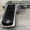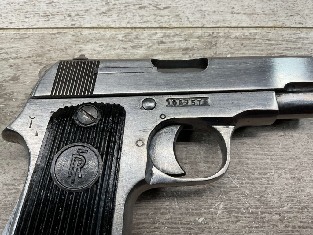 FRENCH UNIQUE Rr51 7.65mm (.32ACP) SEMI AUTO PISTOL #108757, MILLED SERIAL NUMBER, 3 3/16″ BARREL, SEEMS TO HAVE BEEN POLISHED (ALMOST ALL BLUE REMOVED), EXC VERTICAL SERRATION BLACK BAKELITE GRIPS W/ “FR” (REPUBLIC OF FRANCE) IN A CIRCLE AT THE TOP, “CRESENT MOON ON POLE” (PALM TREE), ON RIGHT SIDE FRAME ABOVE TANG, 9RD MAGAZINE, EXC BRIGHT BORE W/STRONG RIFLING