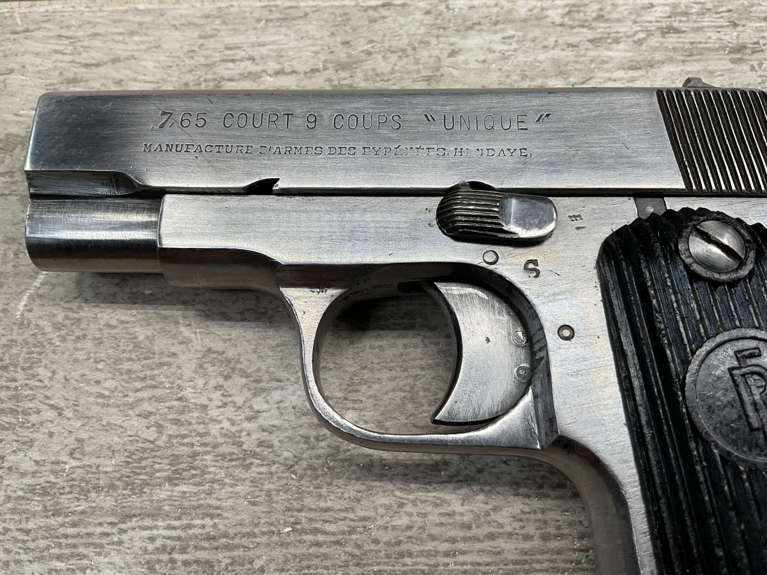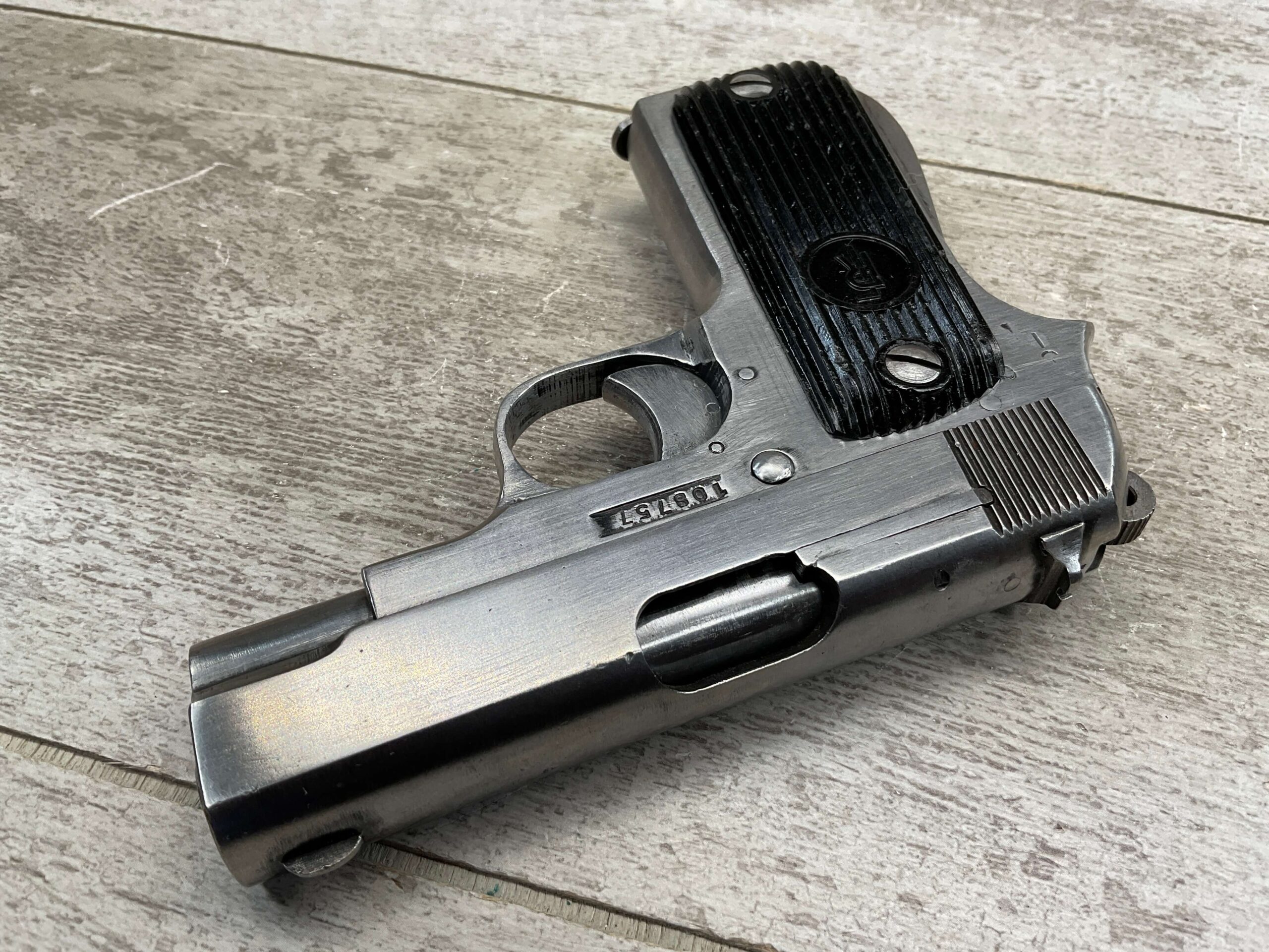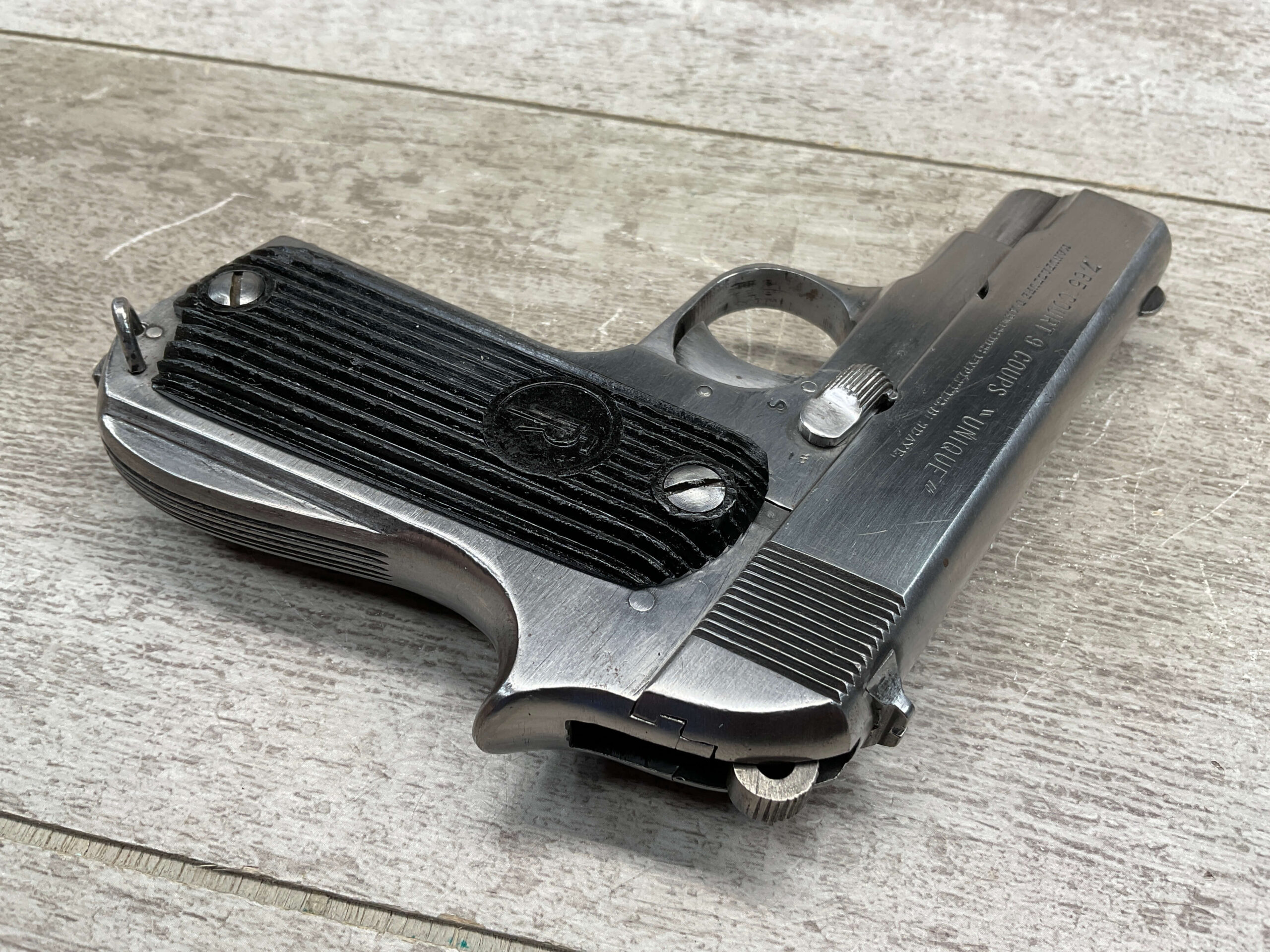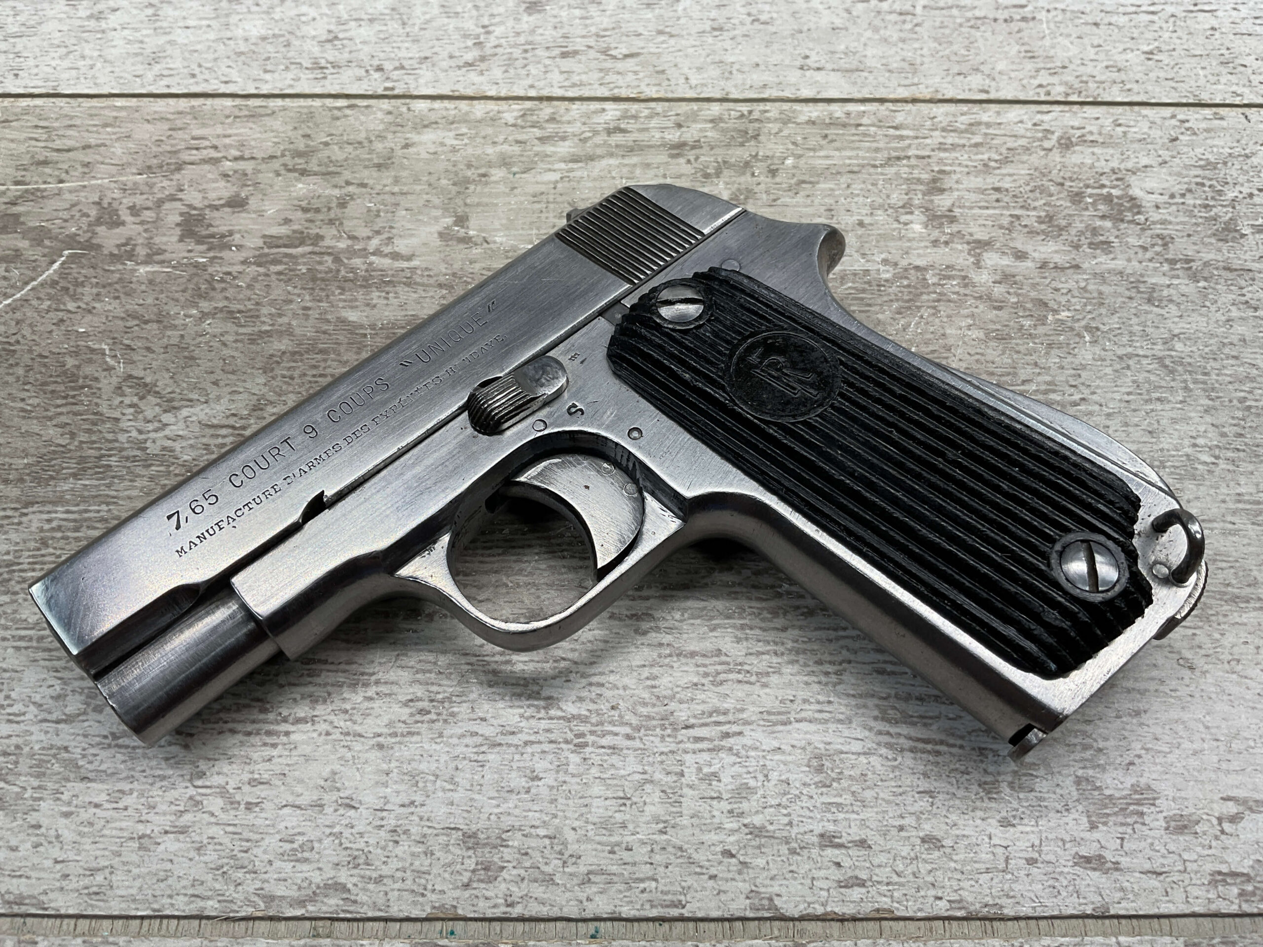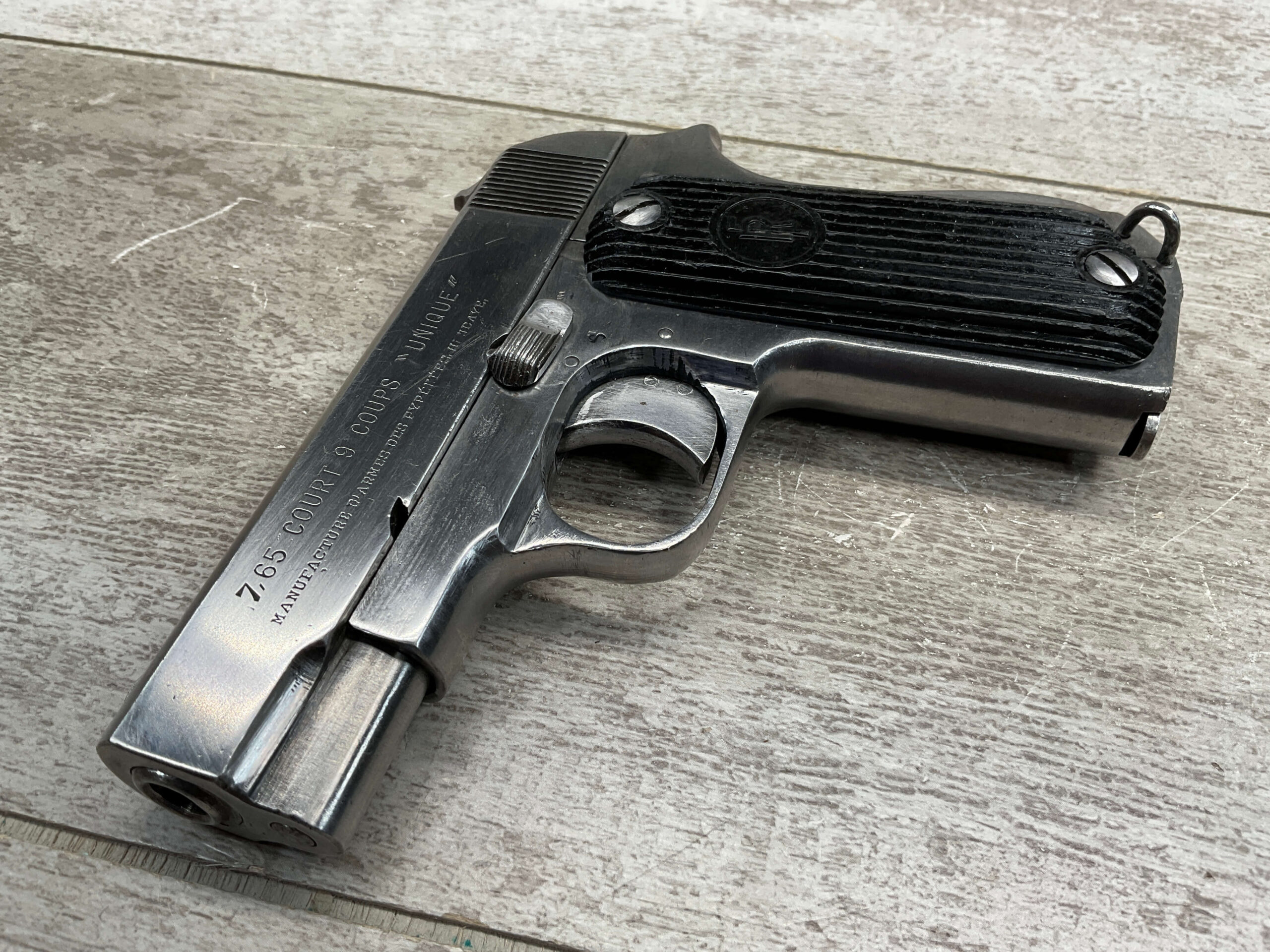 FRENCH UNIQUE Rr51 7.65mm (.32ACP) SEMI AUTO PISTOL #108757, MILLED SERIAL NUMBER, 3 3/16″ BARREL, SEEMS TO HAVE BEEN POLISHED (ALMOST ALL BLUE REMOVED), EXC VERTICAL SERRATION BLACK BAKELITE GRIPS W/ “FR” (REPUBLIC OF FRANCE) IN A CIRCLE AT THE TOP, “CRESENT MOON ON POLE” (PALM TREE), ON RIGHT SIDE FRAME ABOVE TANG, 9RD MAGAZINE, EXC BRIGHT BORE W/STRONG RIFLING