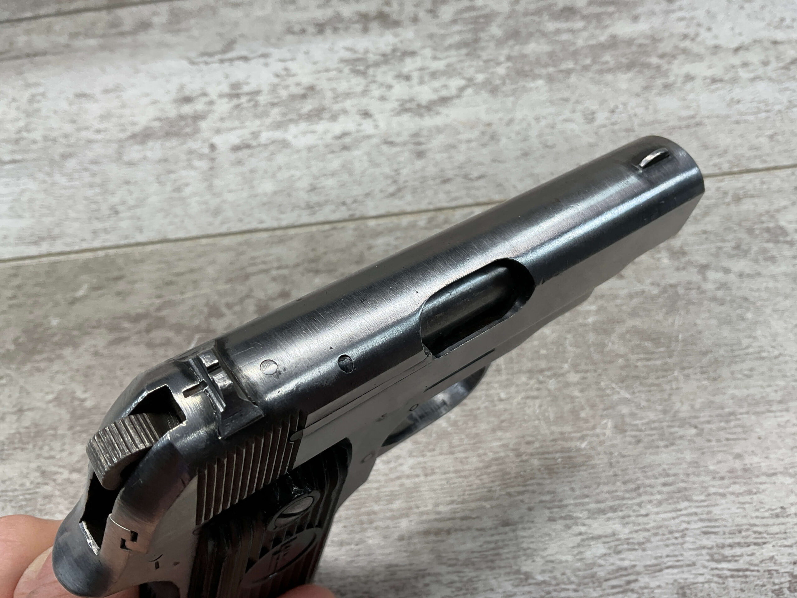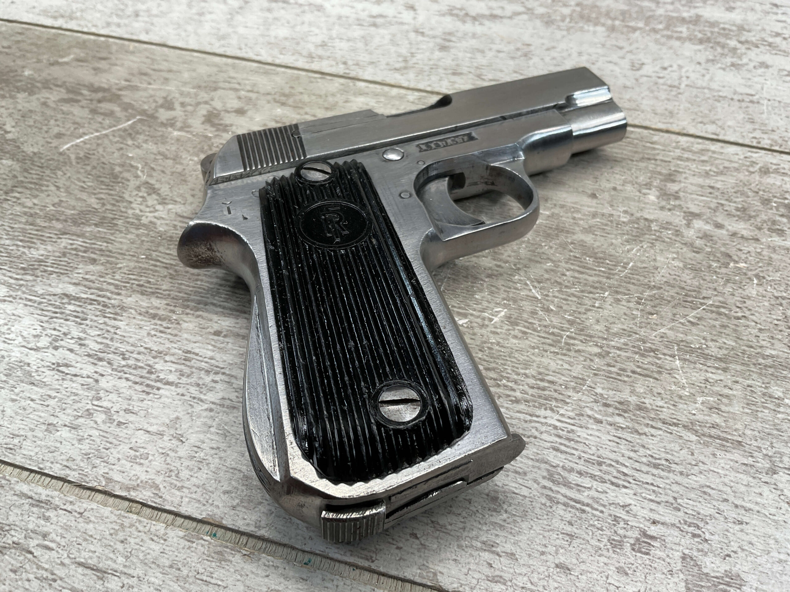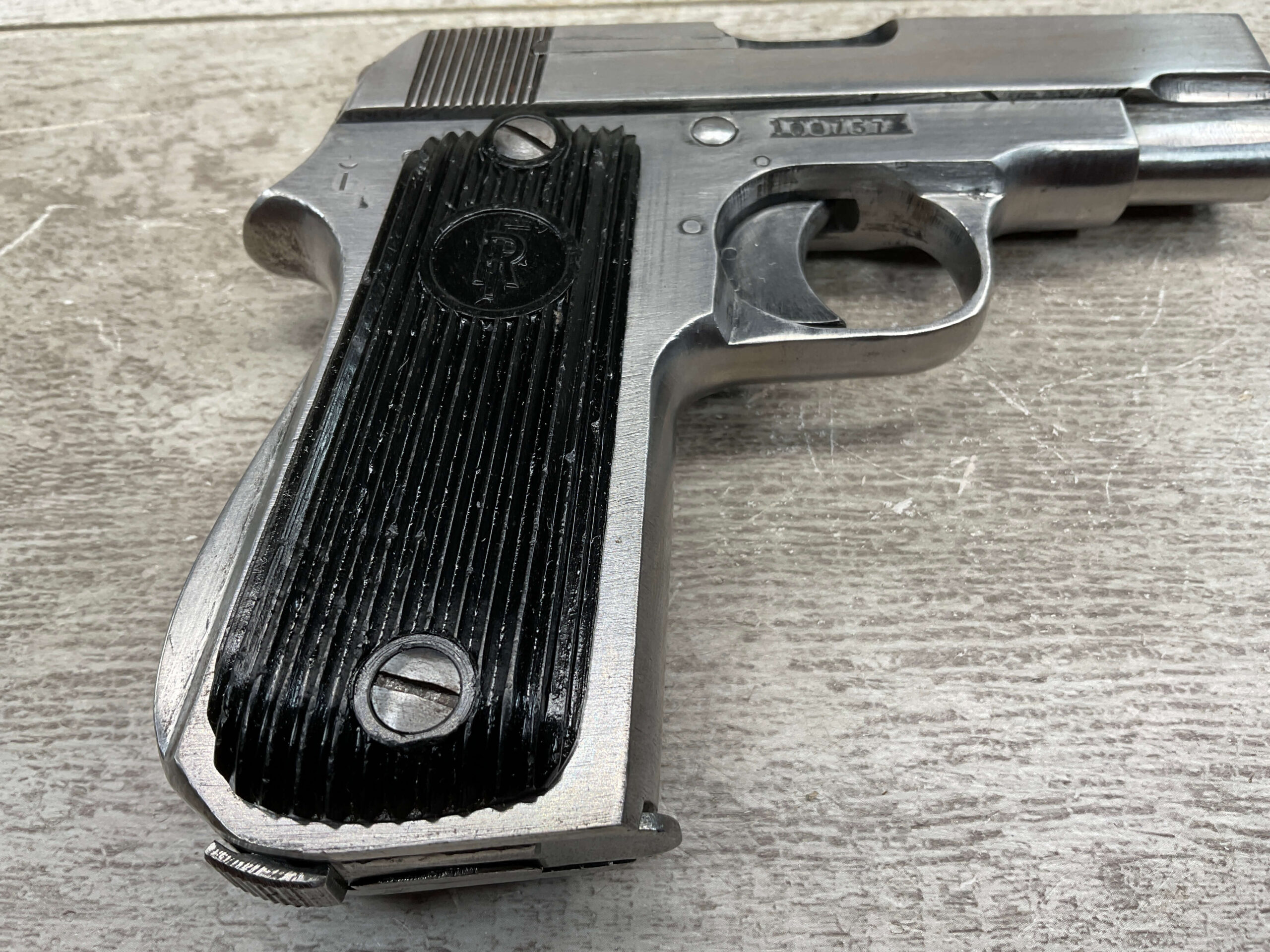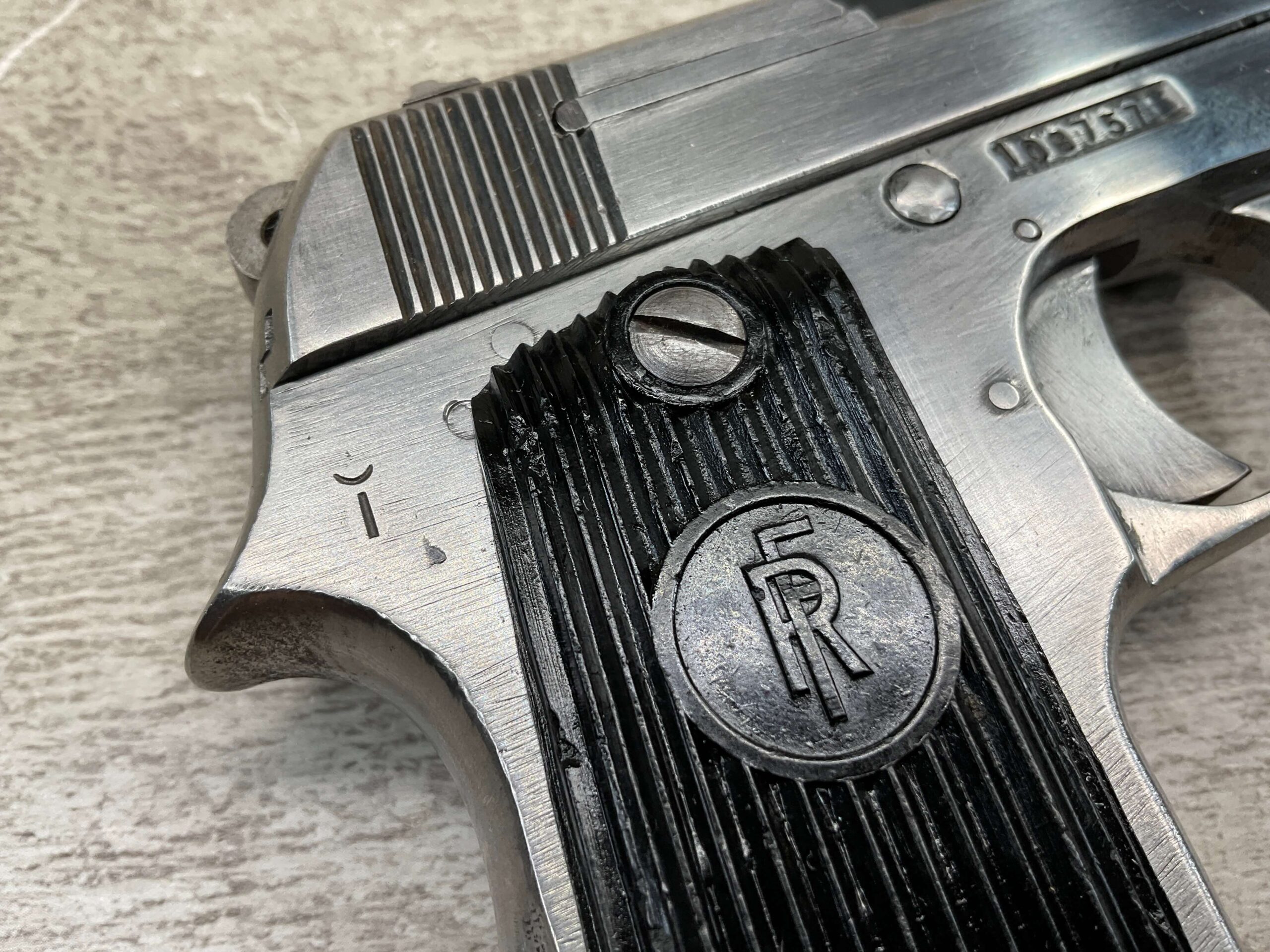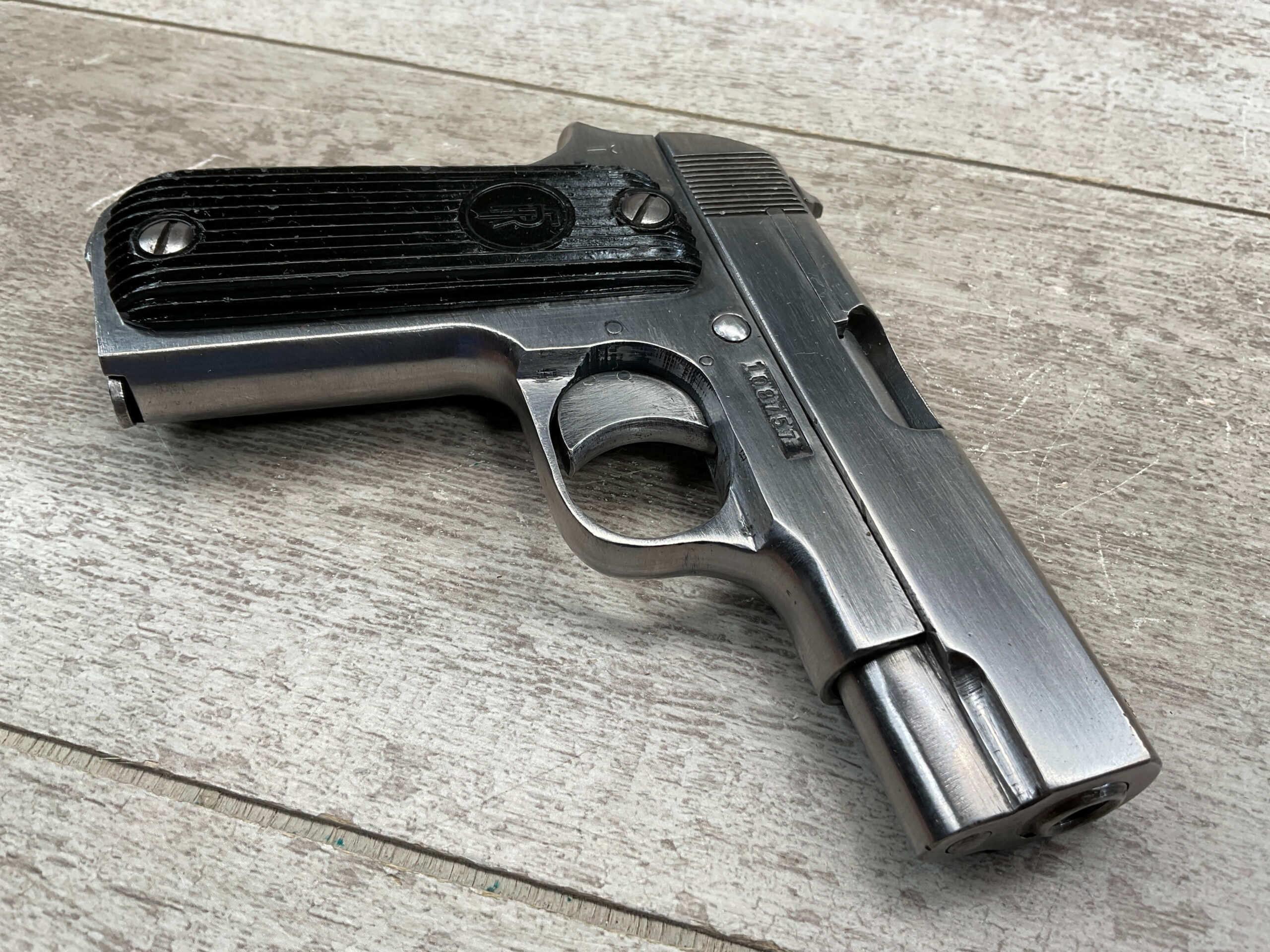 FRENCH UNIQUE Rr51 7.65mm (.32ACP) SEMI AUTO PISTOL #108757, MILLED SERIAL NUMBER, 3 3/16″ BARREL, SEEMS TO HAVE BEEN POLISHED (ALMOST ALL BLUE REMOVED), EXC VERTICAL SERRATION BLACK BAKELITE GRIPS W/ “FR” (REPUBLIC OF FRANCE) IN A CIRCLE AT THE TOP, “CRESENT MOON ON POLE” (PALM TREE), ON RIGHT SIDE FRAME ABOVE TANG, 9RD MAGAZINE, EXC BRIGHT BORE W/STRONG RIFLING