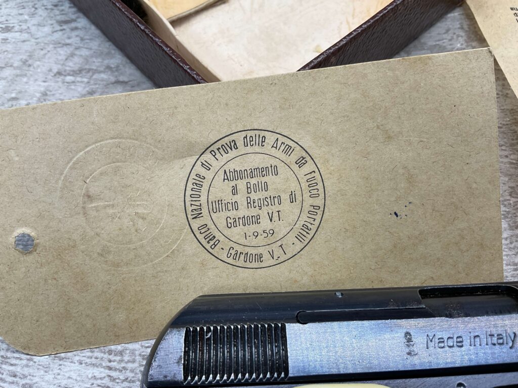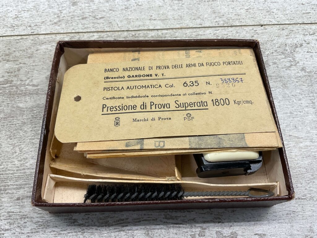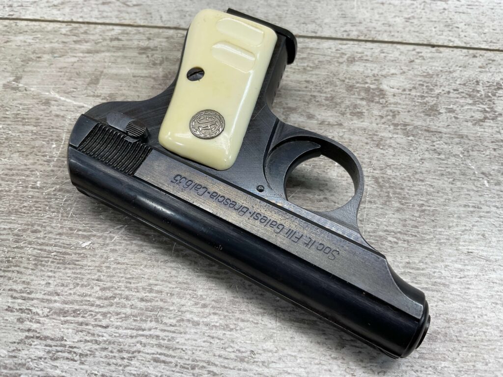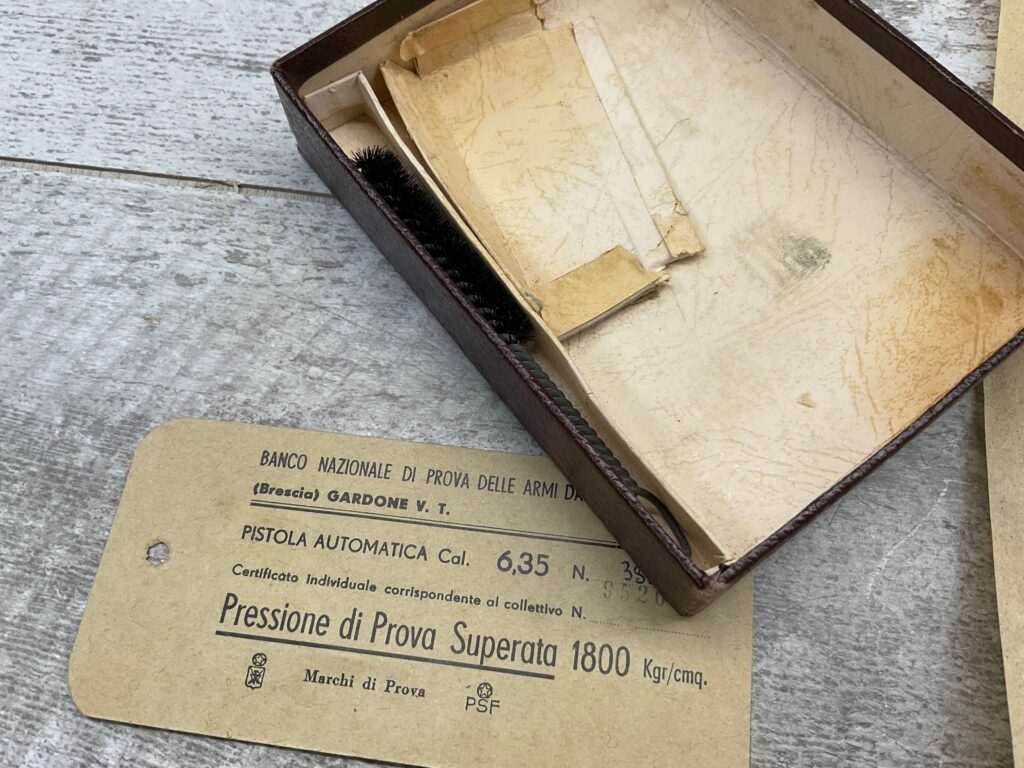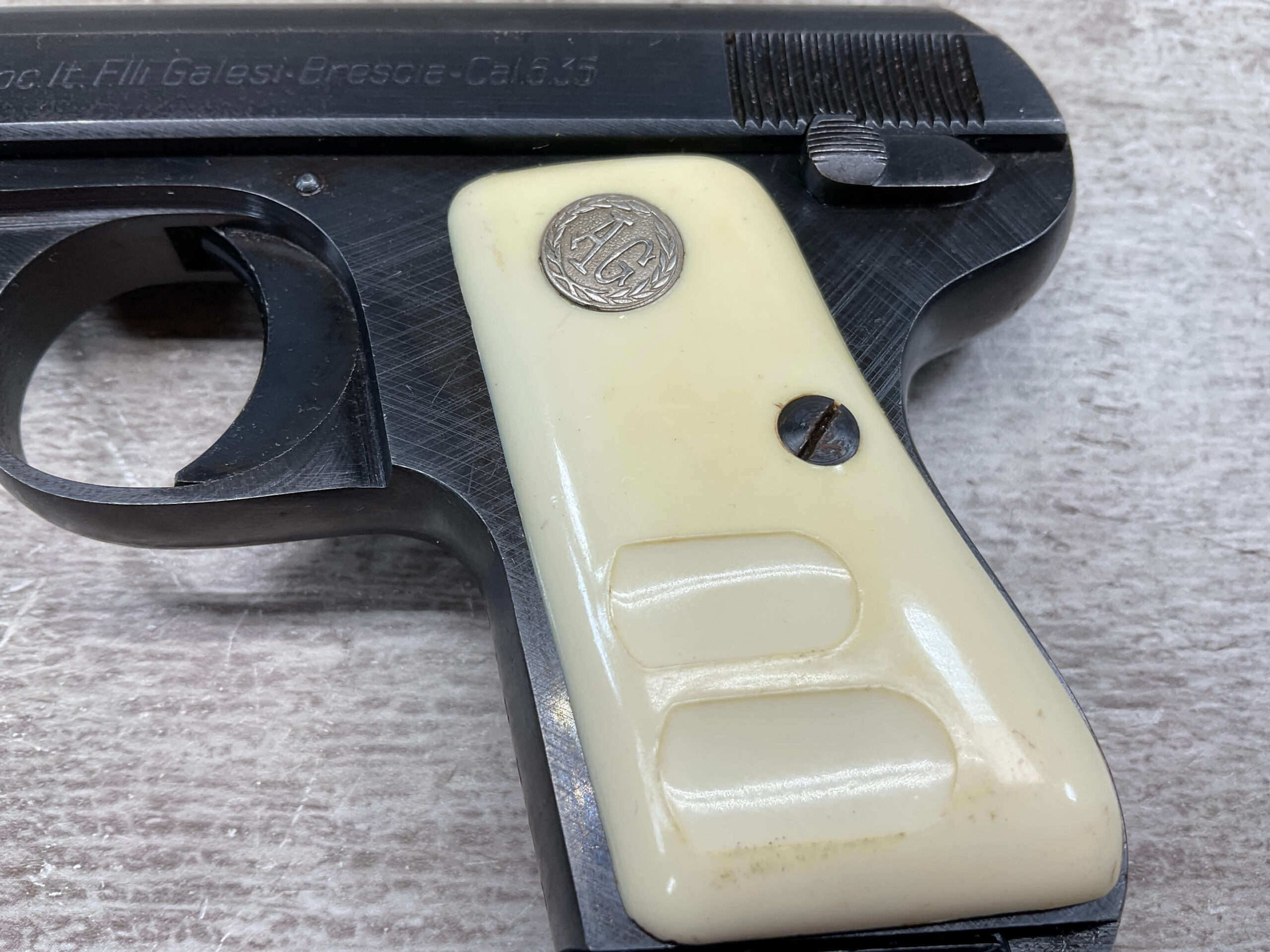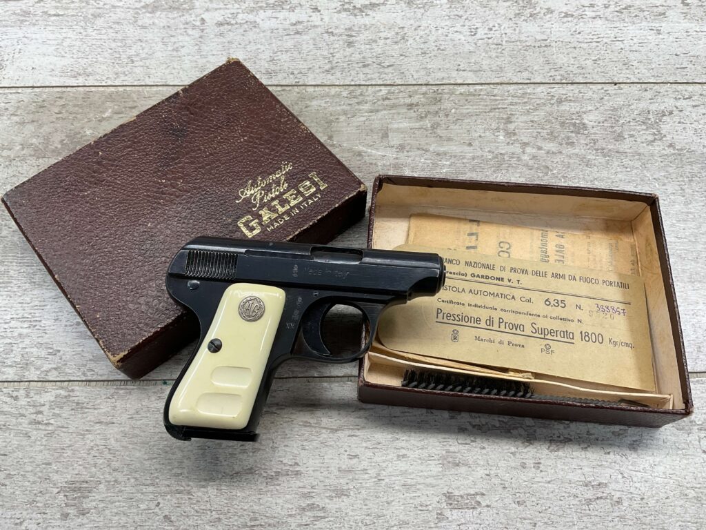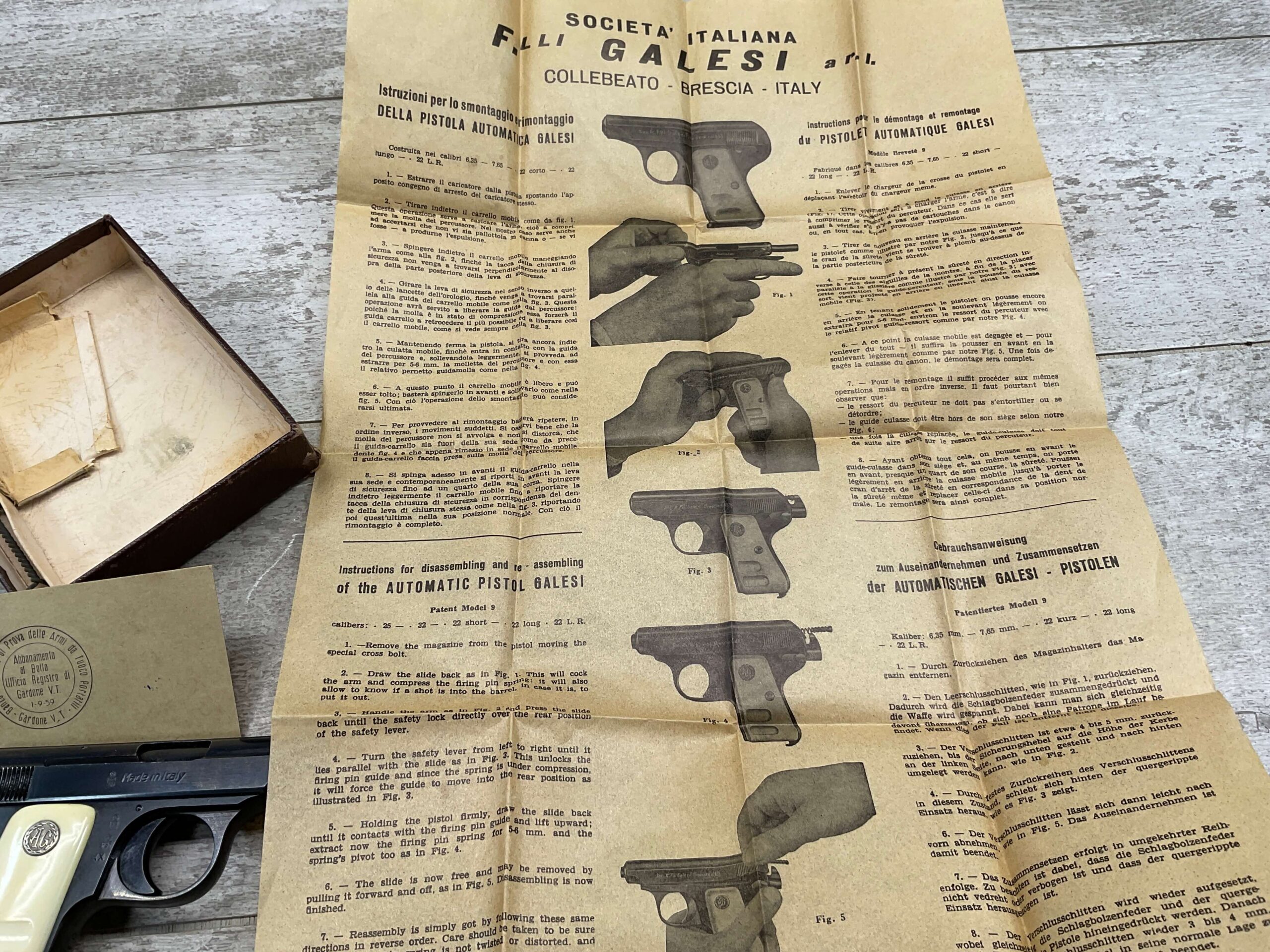 GALESI-BRESCIA 6.35MM SEMI AUTO PISTOL IN BOX, 1959 MFR #388810, 2″ BARREL, EXC BRIGHT BORE & RIFLING, ORIGINAL BOX / CLEANING TOOL & PAPERWORK INCLUDED, VG-EXC ORIGINAL BLUE (LIGHT SPECKLING IN AREAS), EXC SMOOTH PLASTIC GRIPS, 6 ROUND MAGAZINE, 90%+ OVERALL
